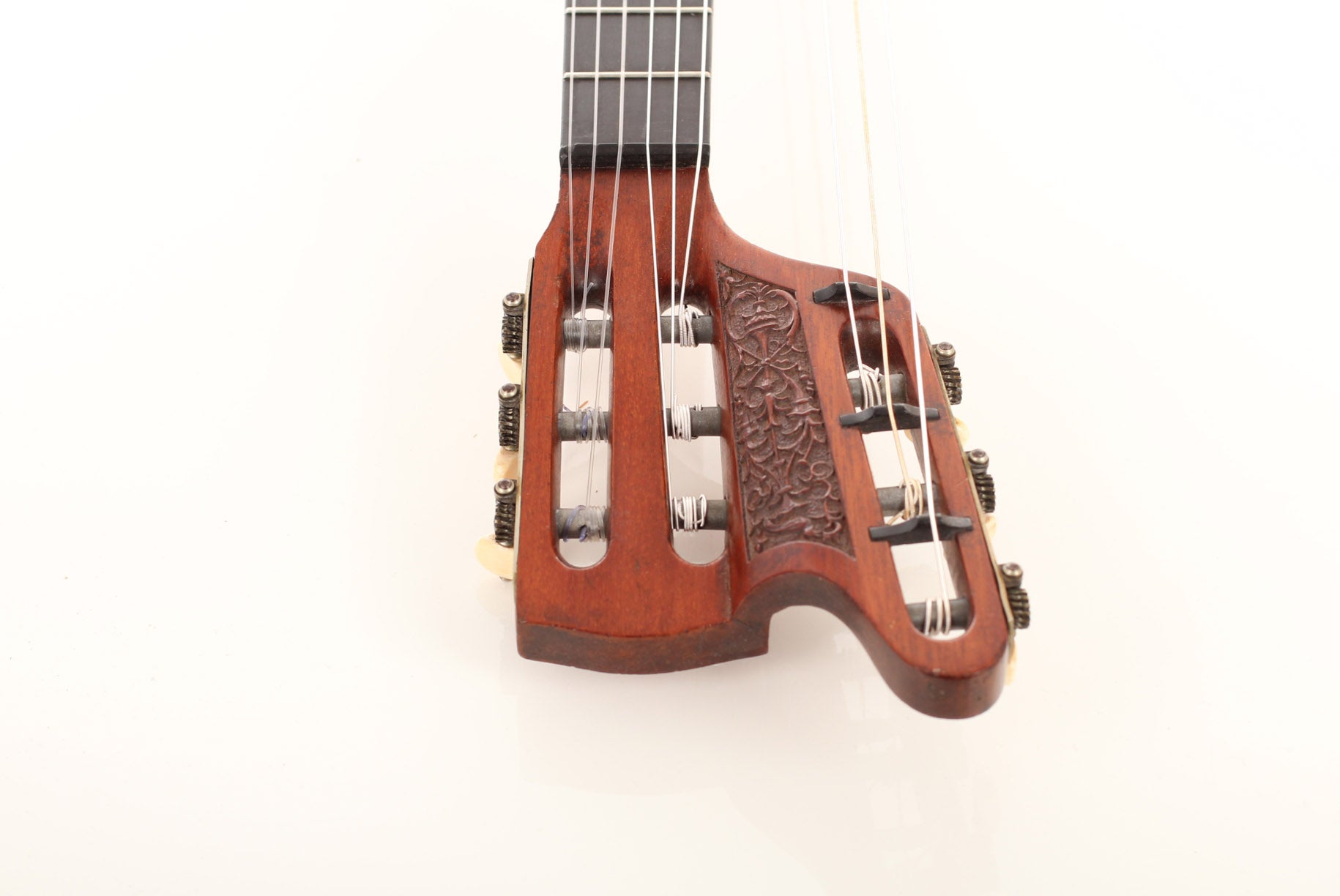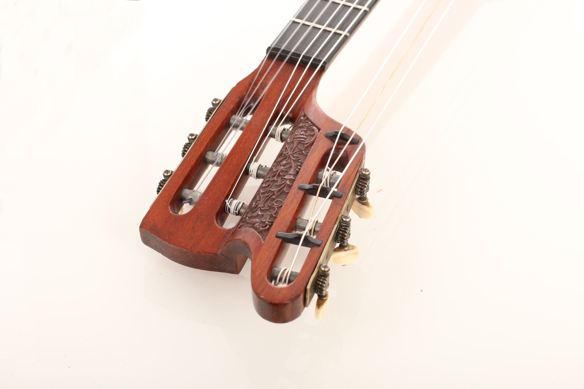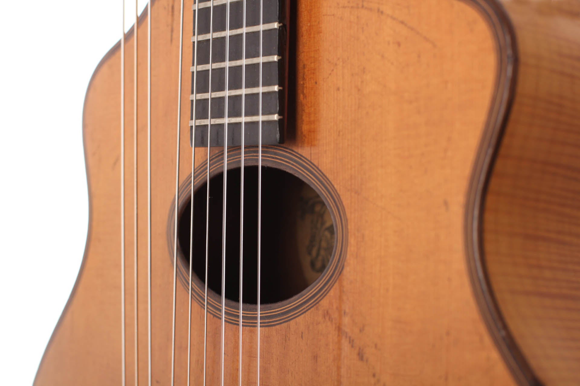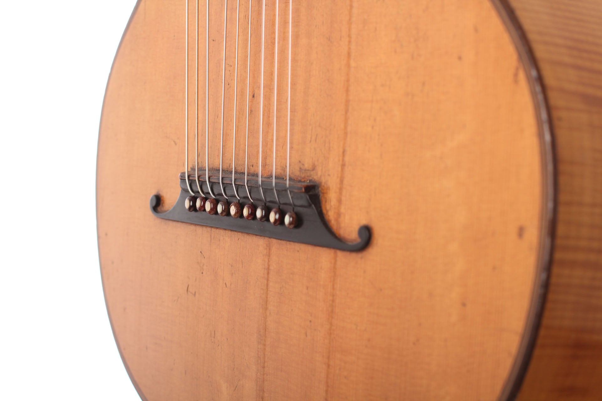 "Wappenguitar" by Franz Halbmeier, built ca. 1915. Back and sides are made of maple – the top is made of spruce. The guitar has six melody strings and two freerunning bass strings. Good shape – little repairs.