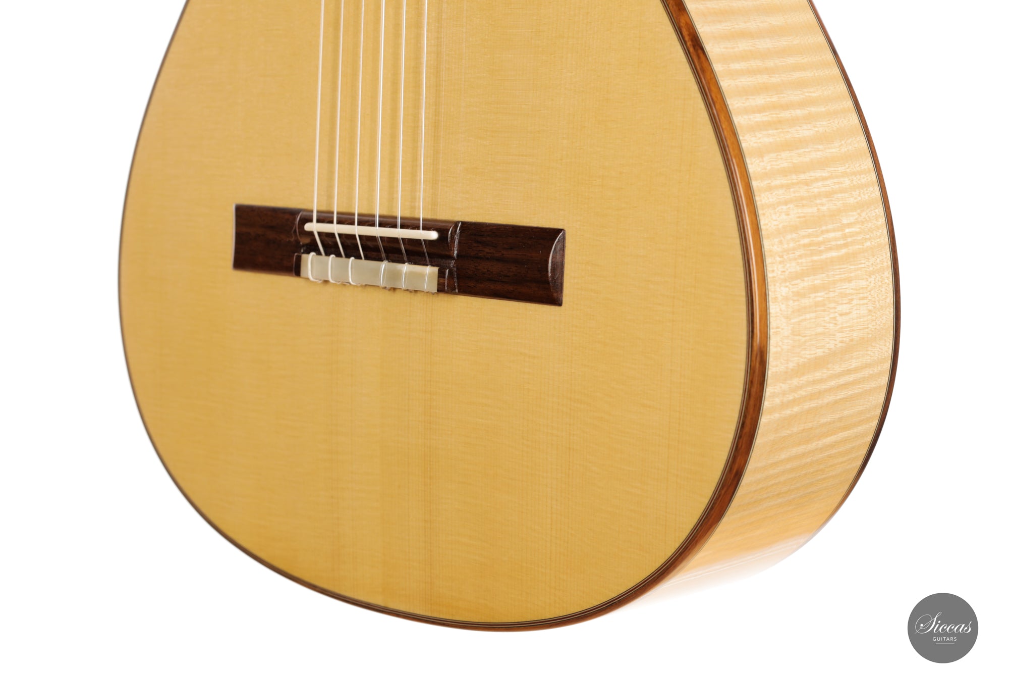 Crafted with precision, its spruce soundboard has been judiciously handpicked, pairing harmoniously with the visually arresting flammed maple that graces the guitar's back and sides. While its foundation is steeped in tradition, boasting seven fan bracings reminiscent of classical builds, it doesn't shy away from embracing the contemporary. The elevated fingerboard, a nod to modern guitarists' preferences, seamlessly blends the past with the present.