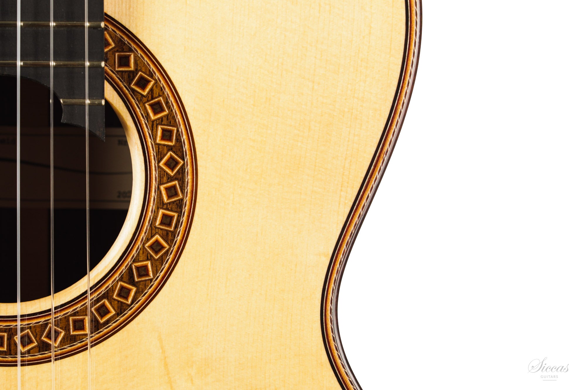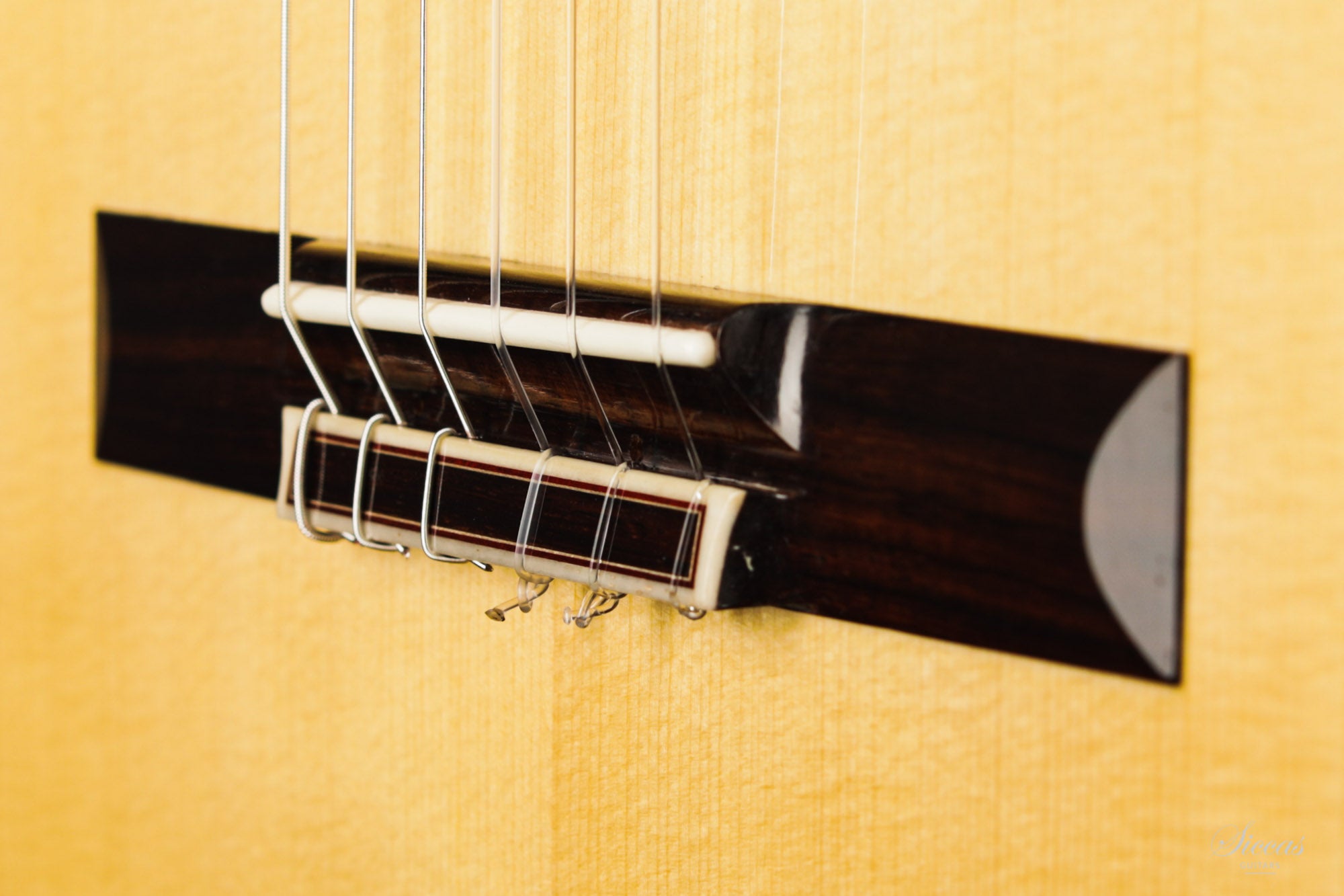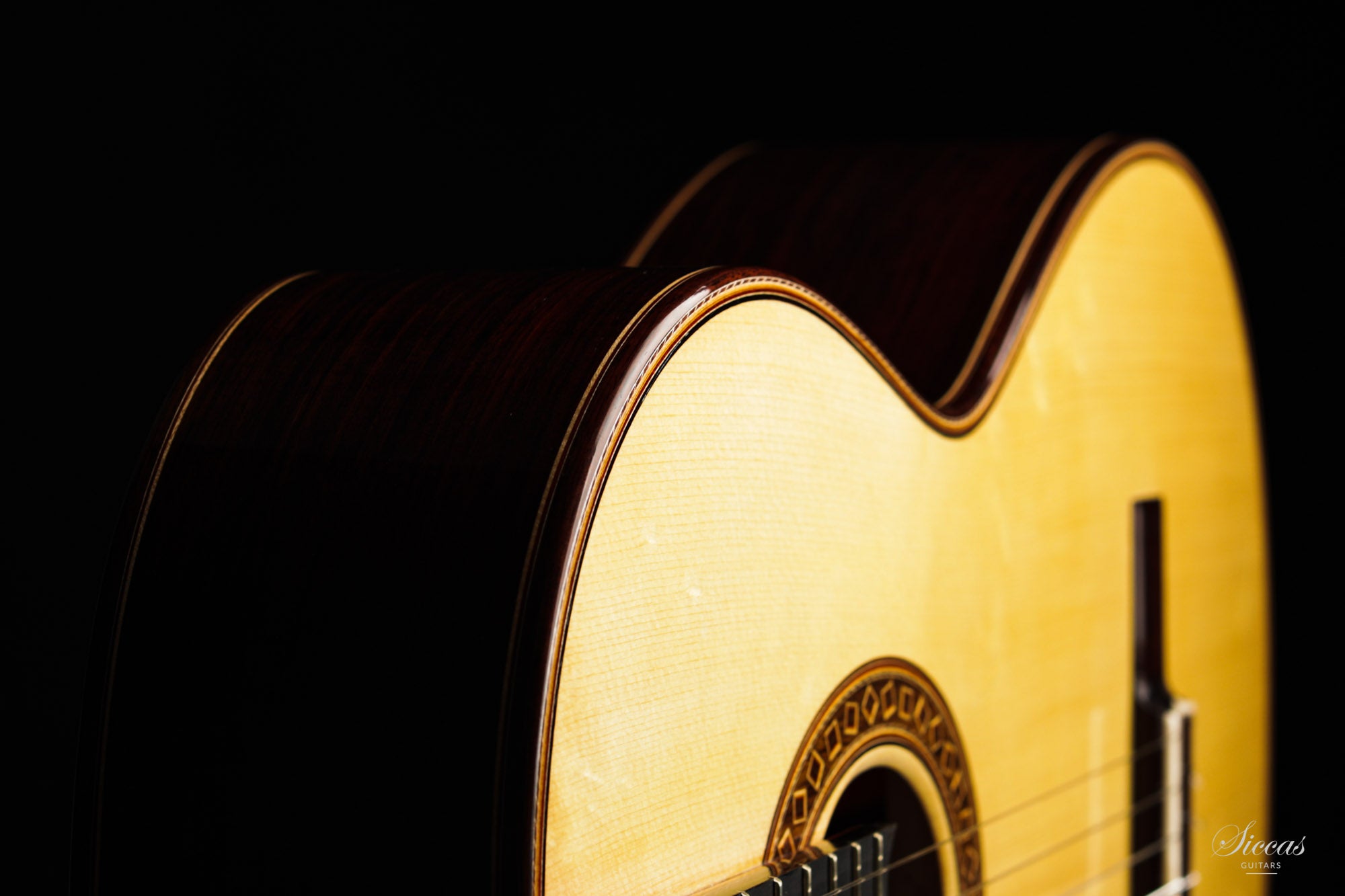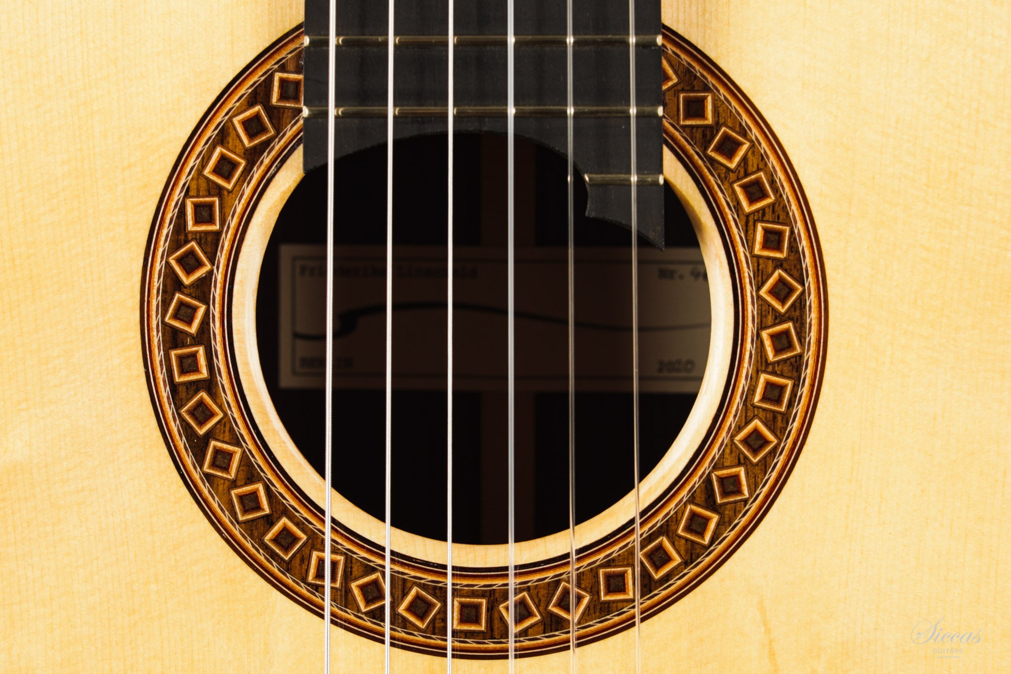 Die Deckenbebalkung folgt dem Konzept von Robert Bouchet mit einer filigranen Kontrolle der Holzstärken. Dezente strukturelle und optische Details gehen über den konventionellen Rahmen hinaus. Beispielsweise fällt die Decke oberhalb des Schalllochs von der Diskantseite ab, wodurch die Höhe des Griffbretts vergrößert und damit die Bespielbarkeit und Klangprojektion im hohen Diskant verbessert wird. Es handelt sich also um eine Gitarre, die kraftvoll genug ist, um auf die Bühne zu gehen, mit einer sehr komfortablen Bespielbarkeit und allem, was ein professioneller Gitarrist suchen würde.