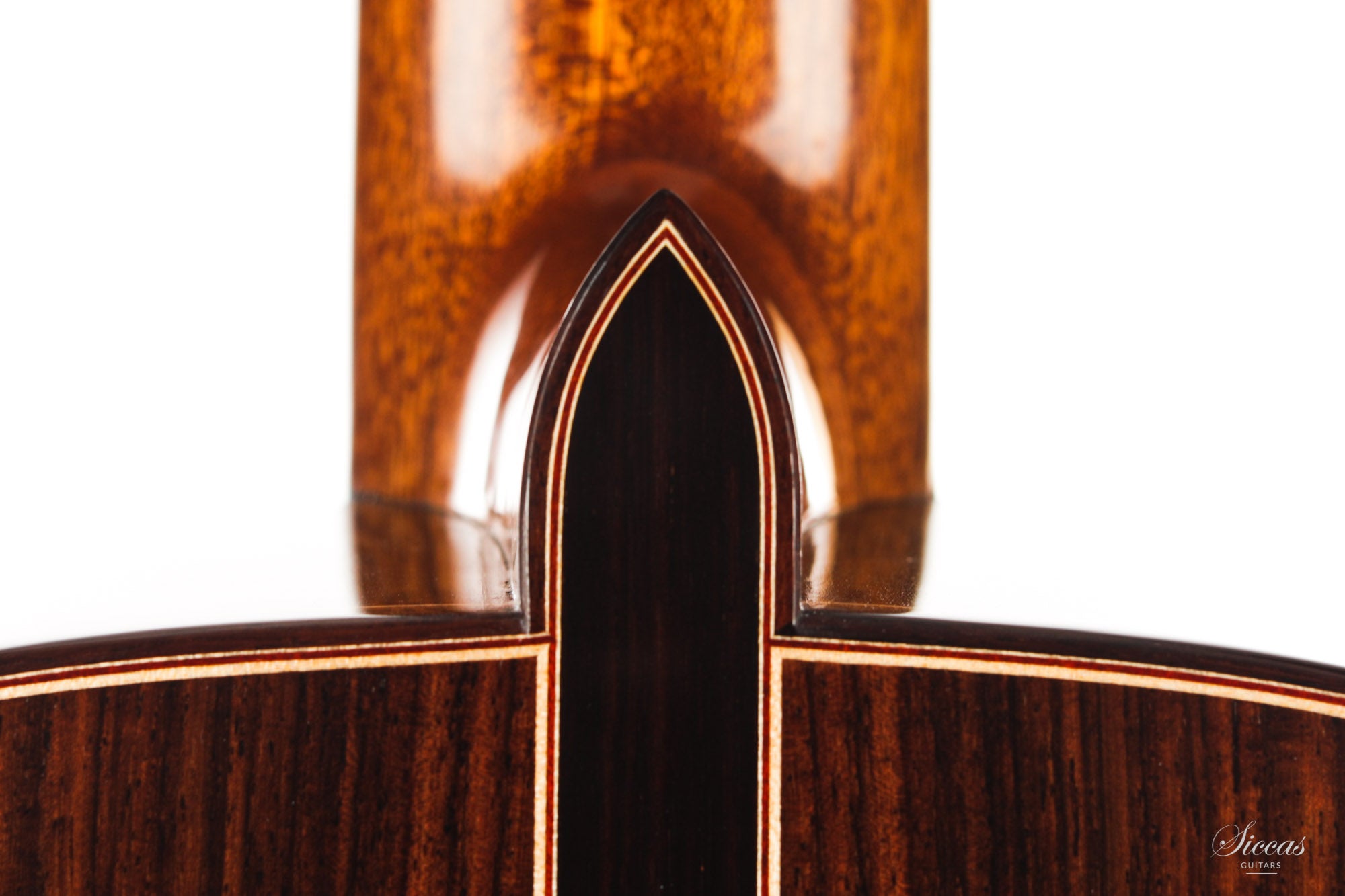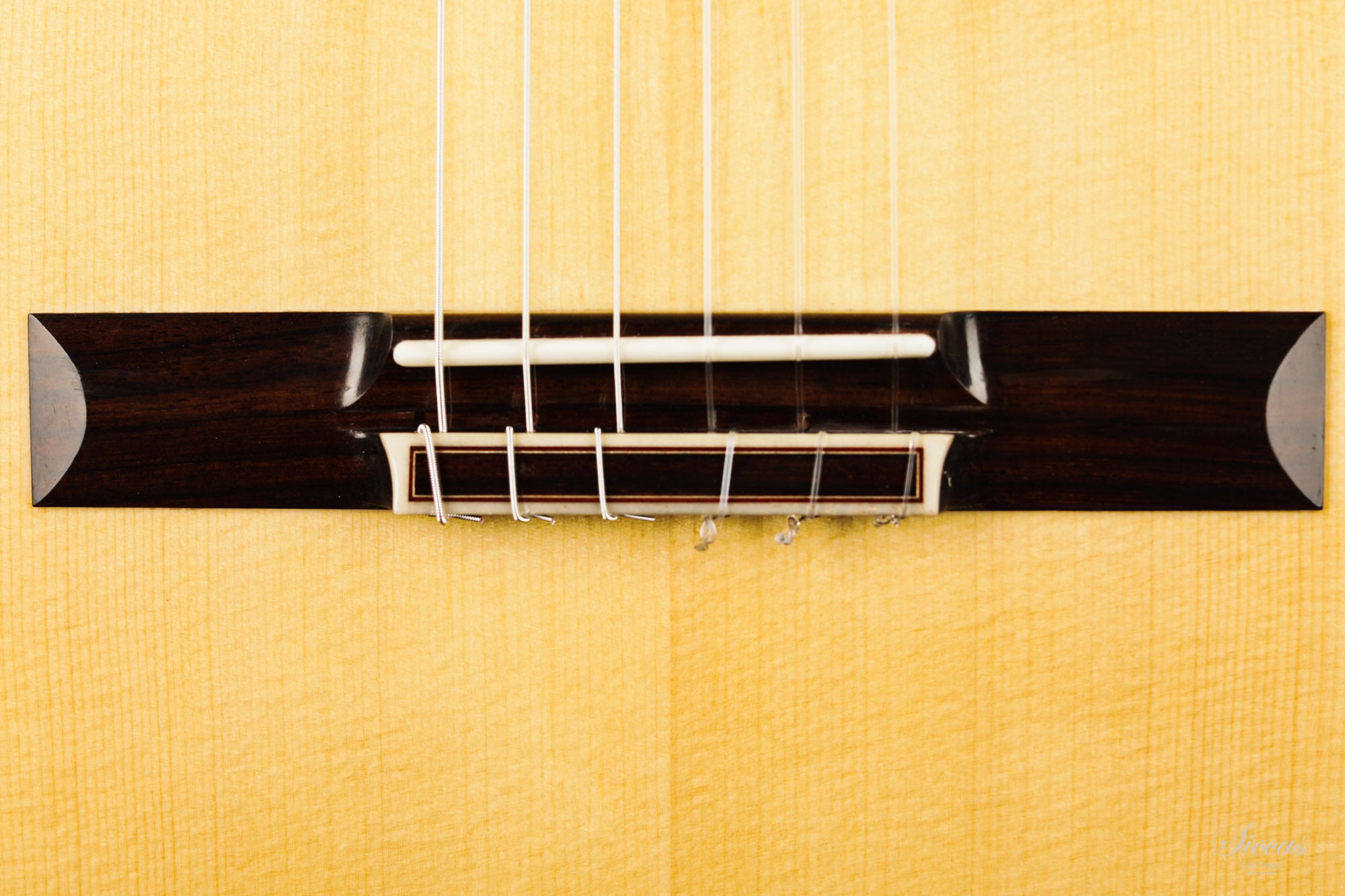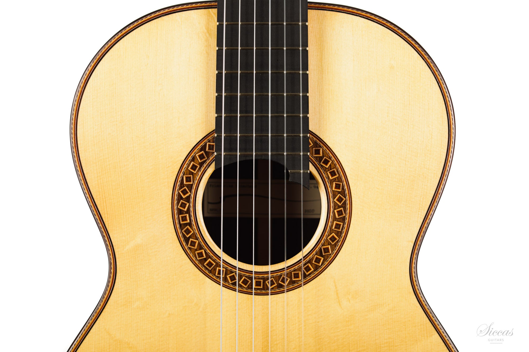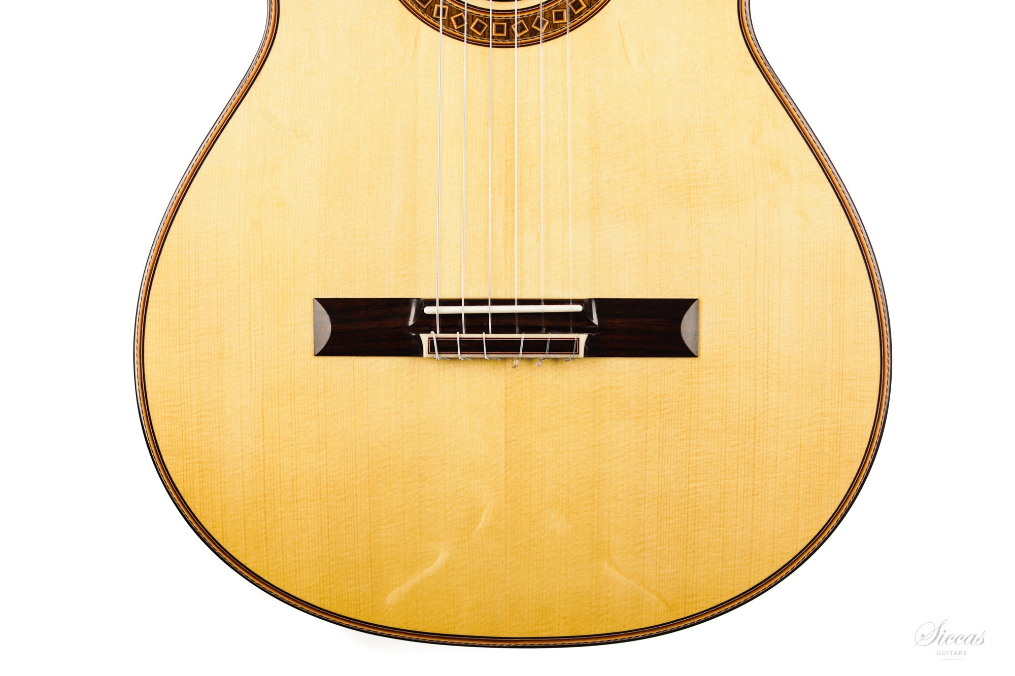 Die Deckenbebalkung folgt dem Konzept von Robert Bouchet mit einer filigranen Kontrolle der Holzstärken. Dezente strukturelle und optische Details gehen über den konventionellen Rahmen hinaus. Beispielsweise fällt die Decke oberhalb des Schalllochs von der Diskantseite ab, wodurch die Höhe des Griffbretts vergrößert und damit die Bespielbarkeit und Klangprojektion im hohen Diskant verbessert wird. Es handelt sich also um eine Gitarre, die kraftvoll genug ist, um auf die Bühne zu gehen, mit einer sehr komfortablen Bespielbarkeit und allem, was ein professioneller Gitarrist suchen würde.