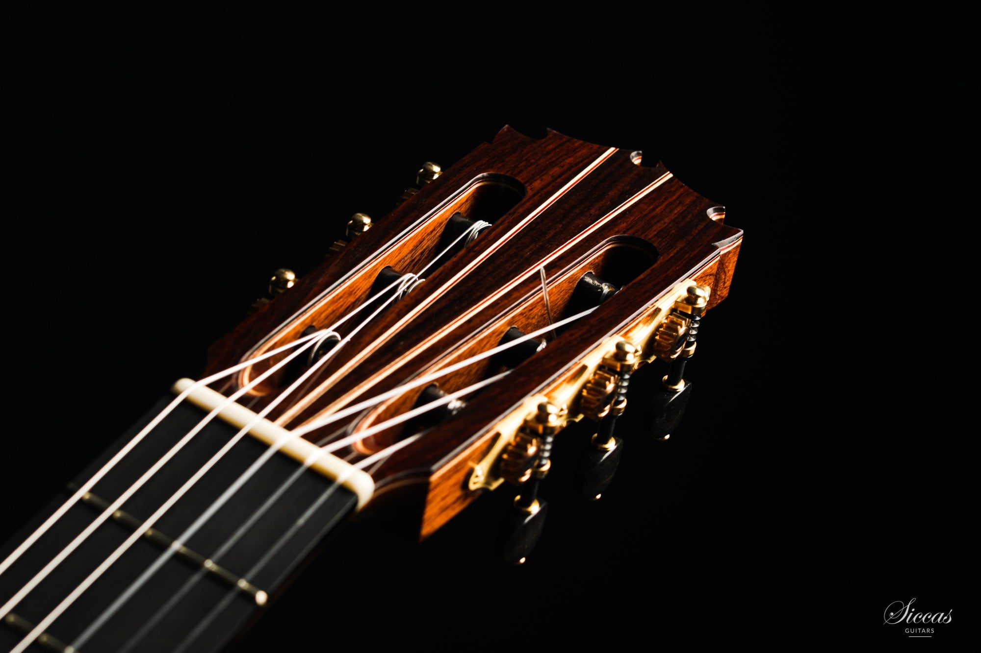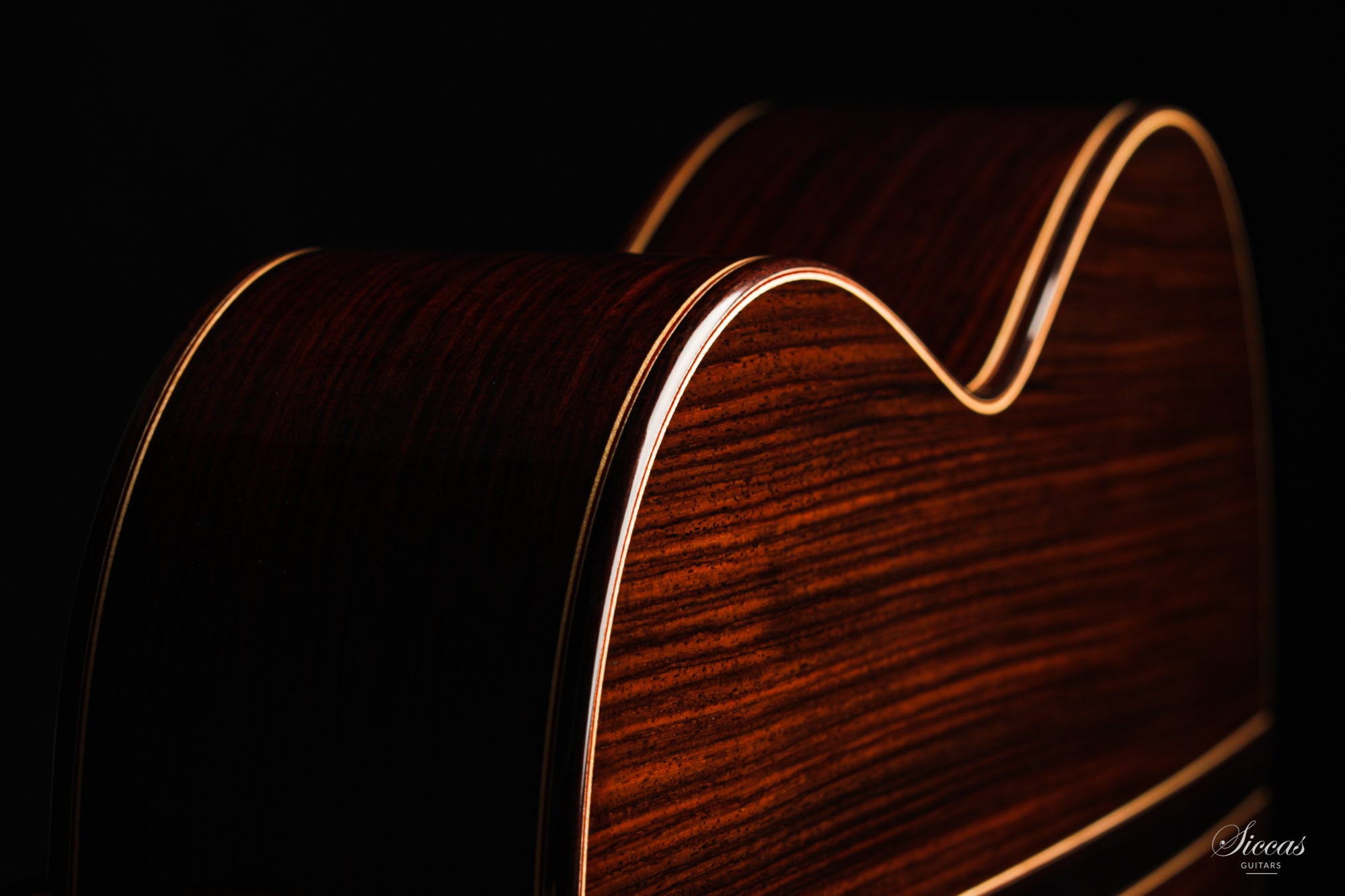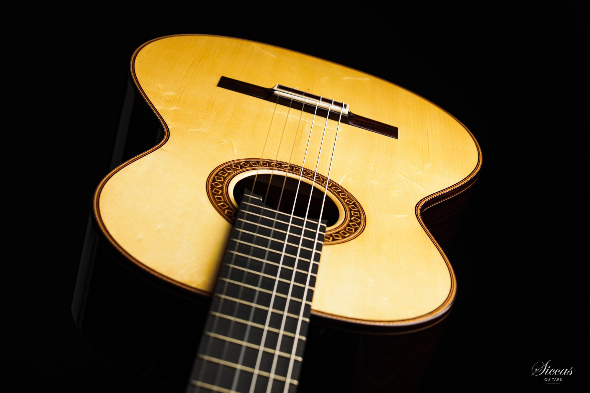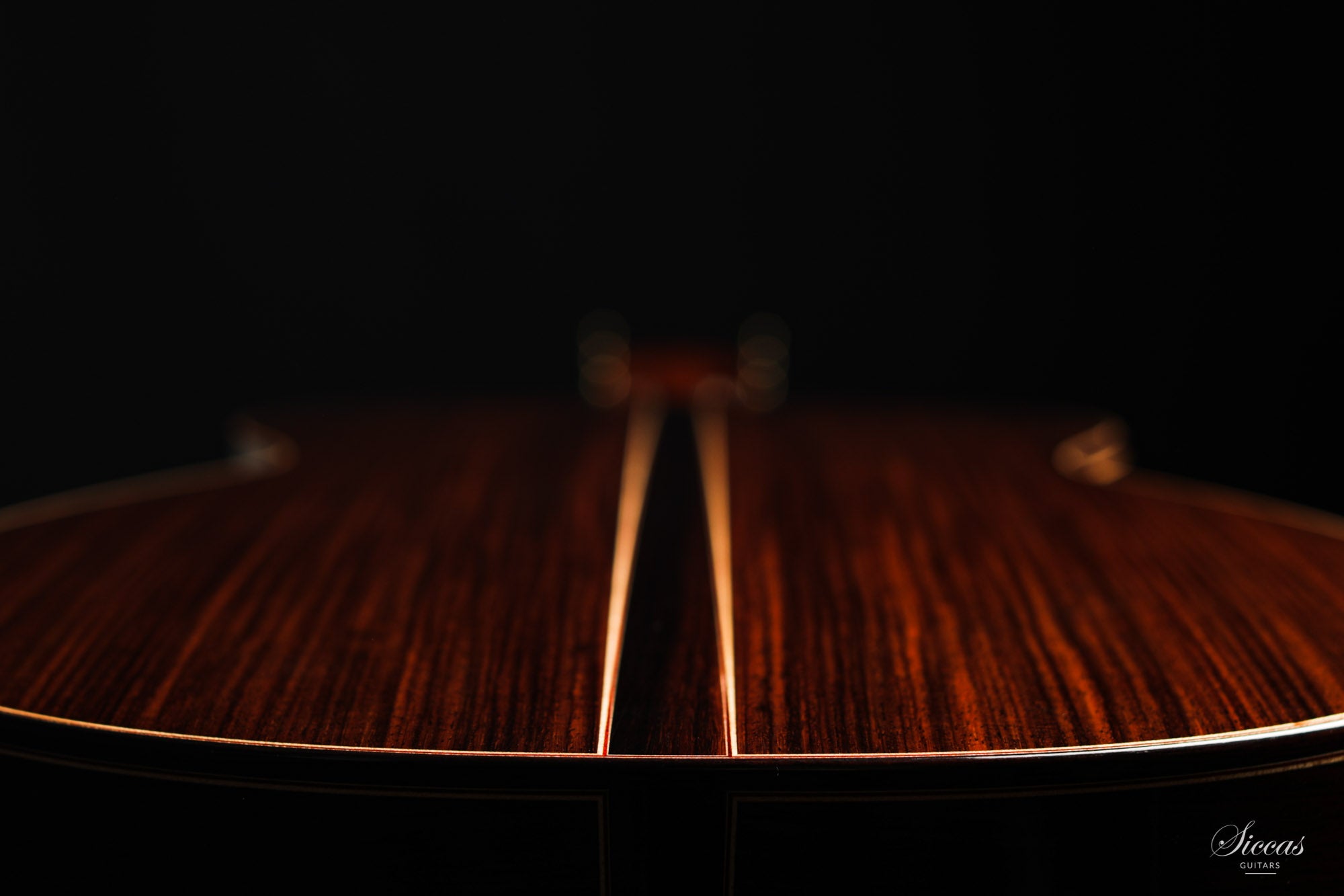 Die Deckenbebalkung folgt dem Konzept von Robert Bouchet mit einer filigranen Kontrolle der Holzstärken. Dezente strukturelle und optische Details gehen über den konventionellen Rahmen hinaus. Beispielsweise fällt die Decke oberhalb des Schalllochs von der Diskantseite ab, wodurch die Höhe des Griffbretts vergrößert und damit die Bespielbarkeit und Klangprojektion im hohen Diskant verbessert wird. Es handelt sich also um eine Gitarre, die kraftvoll genug ist, um auf die Bühne zu gehen, mit einer sehr komfortablen Bespielbarkeit und allem, was ein professioneller Gitarrist suchen würde.