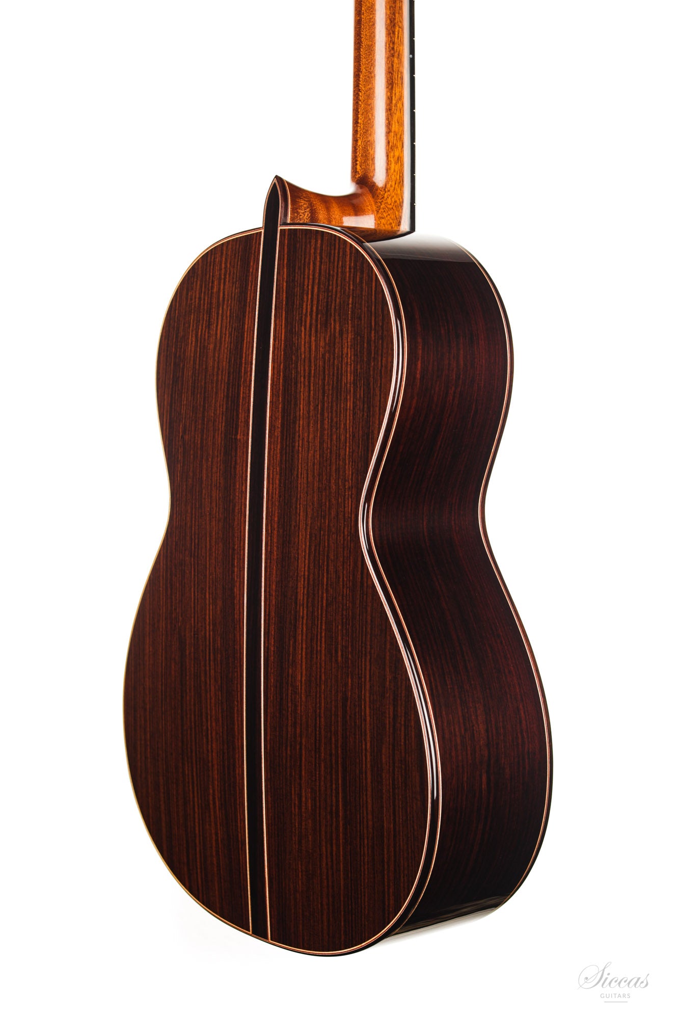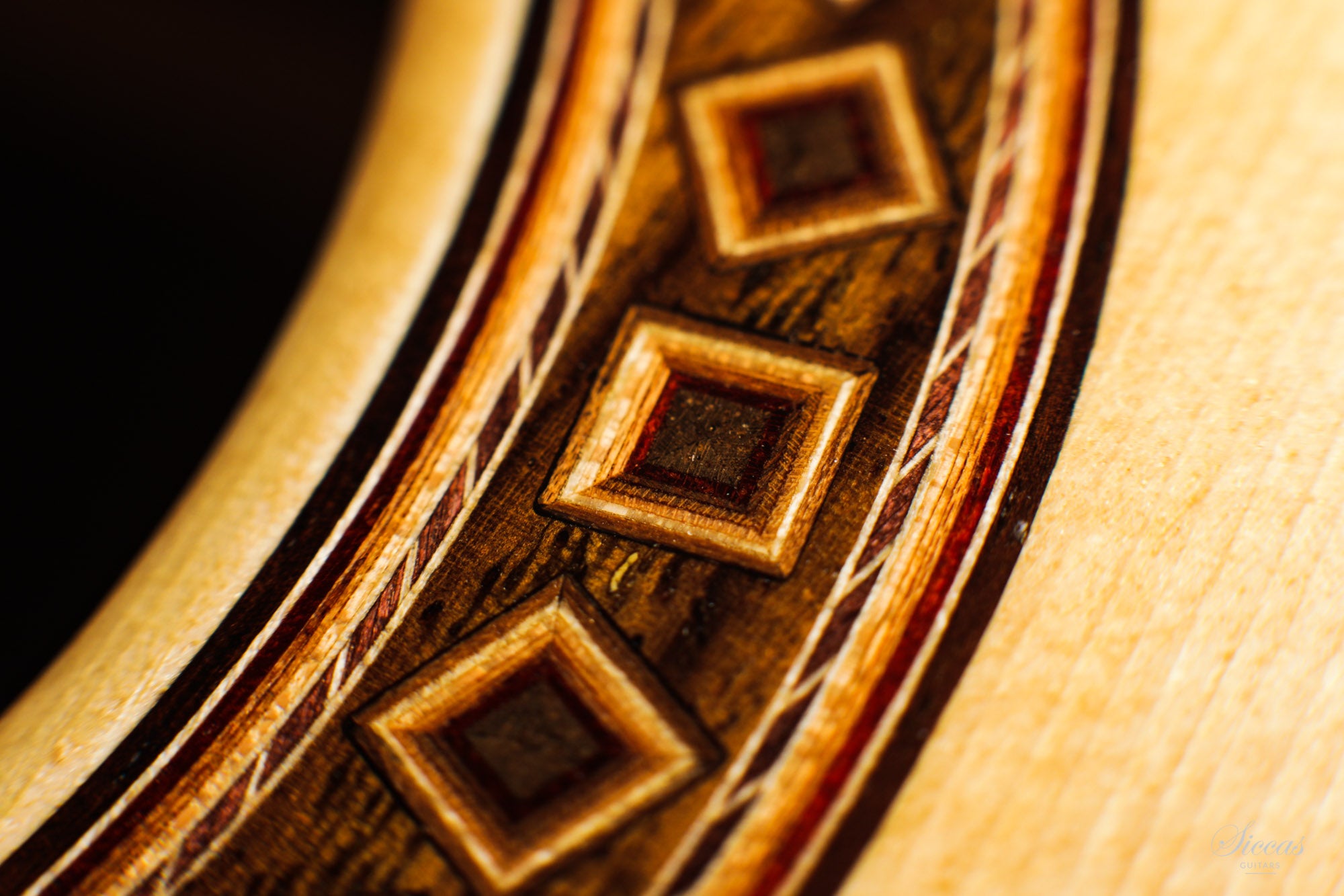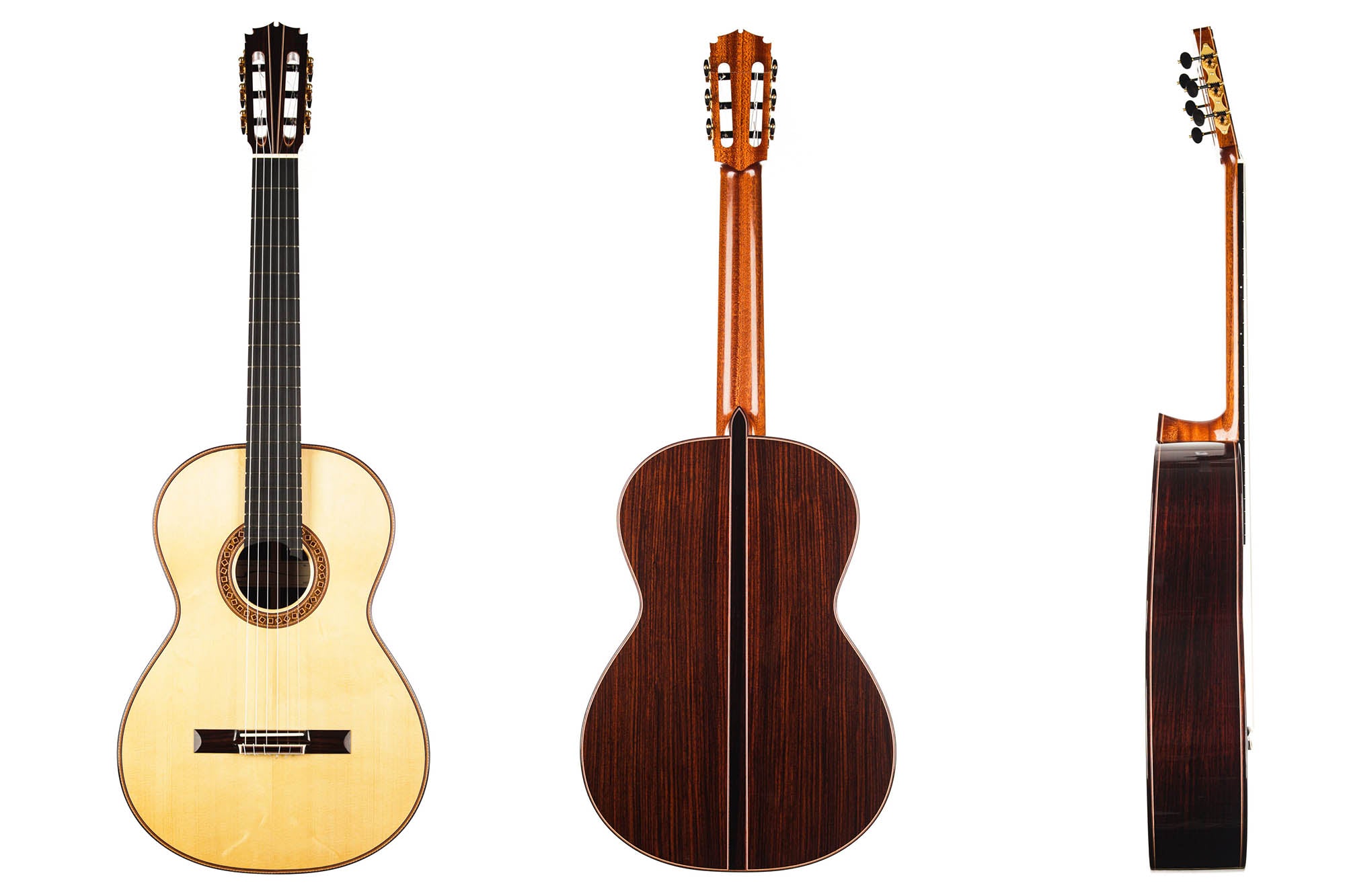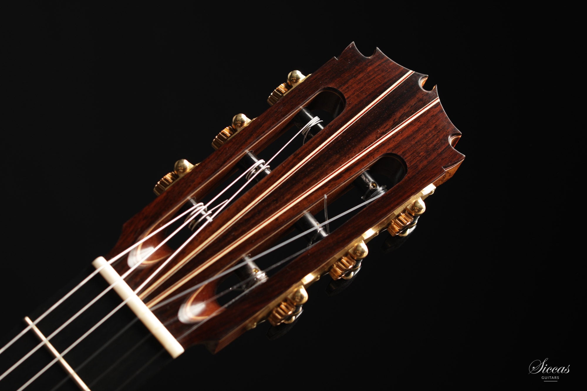 Die Deckenbebalkung folgt dem Konzept von Robert Bouchet mit einer filigranen Kontrolle der Holzstärken. Dezente strukturelle und optische Details gehen über den konventionellen Rahmen hinaus. Beispielsweise fällt die Decke oberhalb des Schalllochs von der Diskantseite ab, wodurch die Höhe des Griffbretts vergrößert und damit die Bespielbarkeit und Klangprojektion im hohen Diskant verbessert wird. Es handelt sich also um eine Gitarre, die kraftvoll genug ist, um auf die Bühne zu gehen, mit einer sehr komfortablen Bespielbarkeit und allem, was ein professioneller Gitarrist suchen würde.