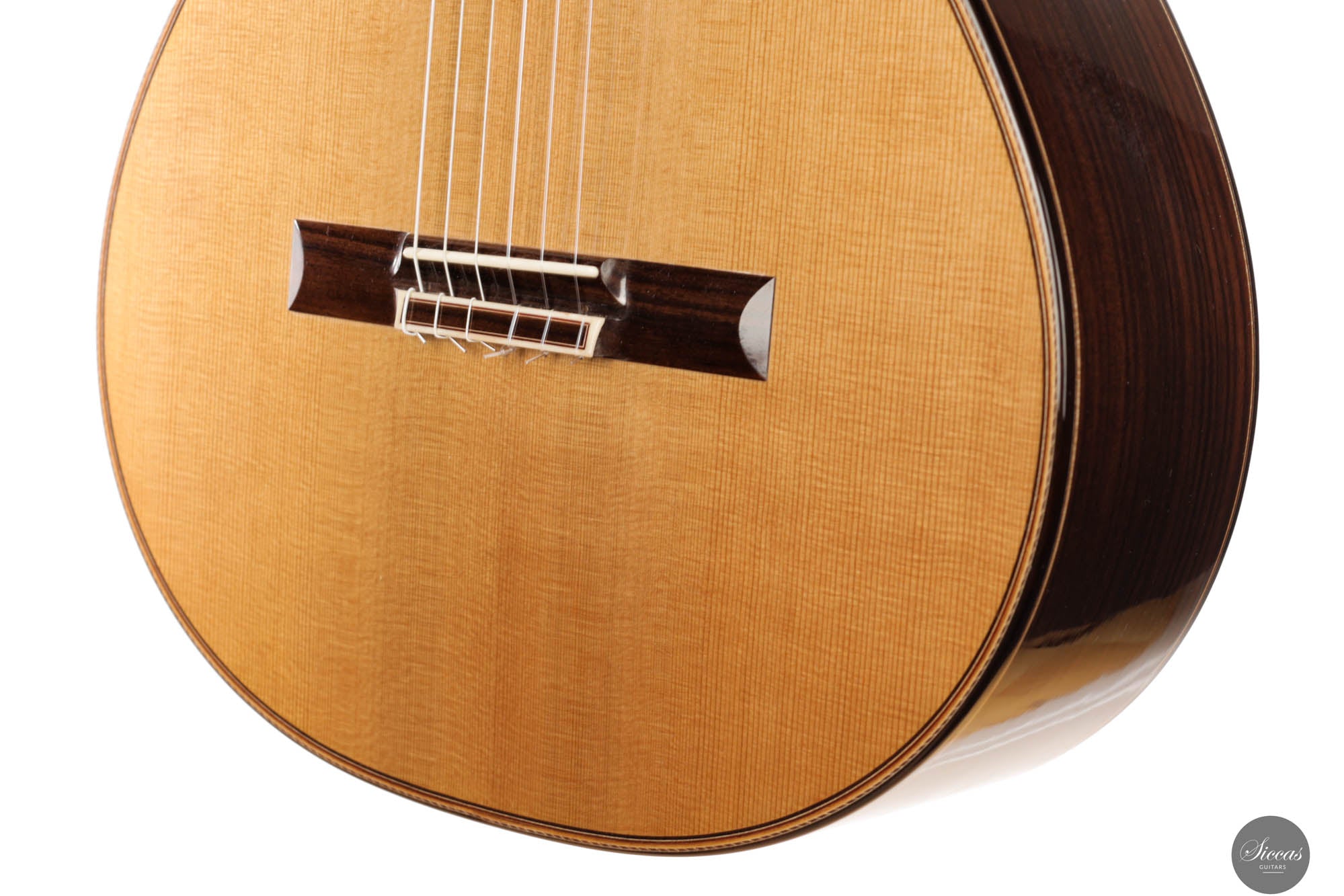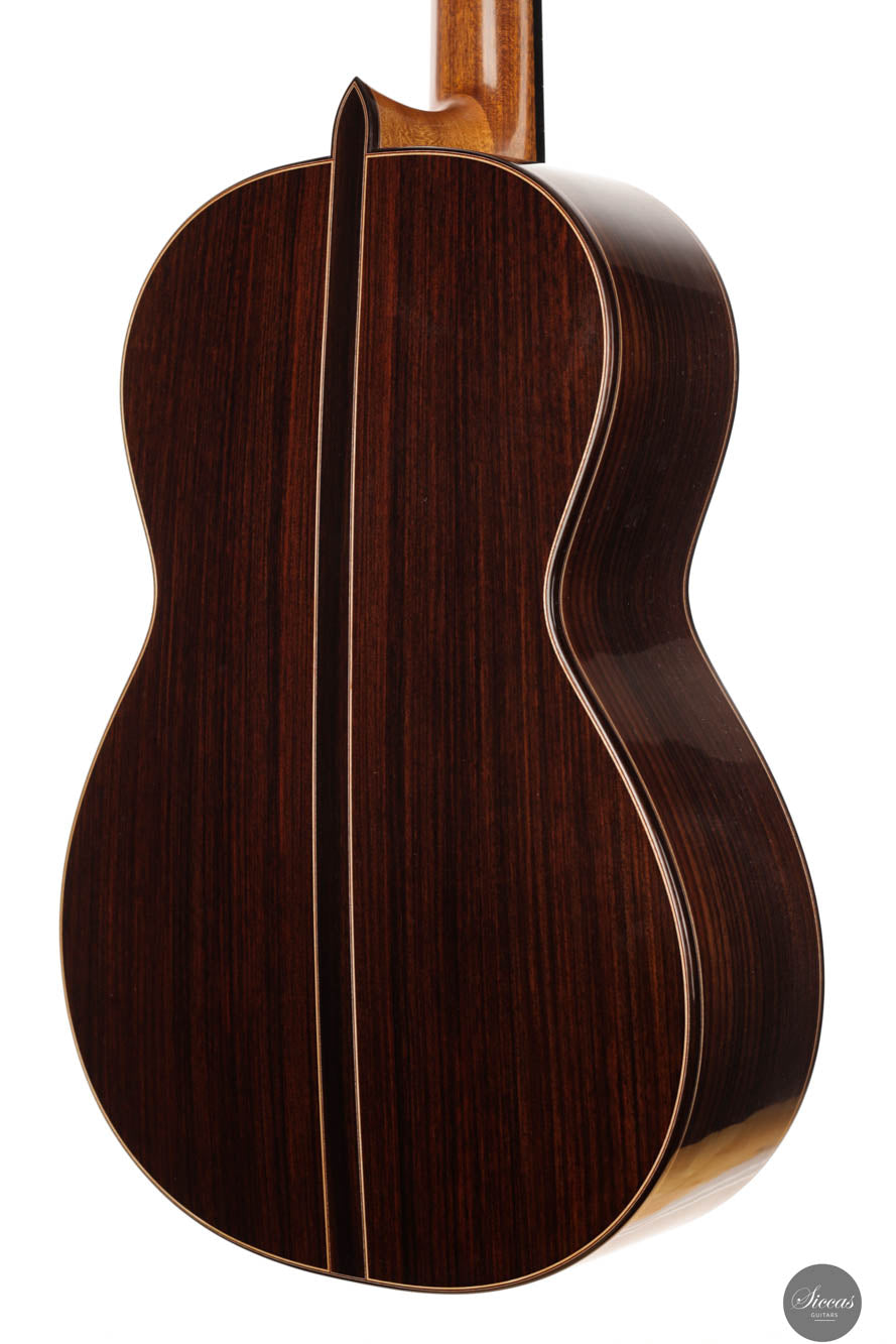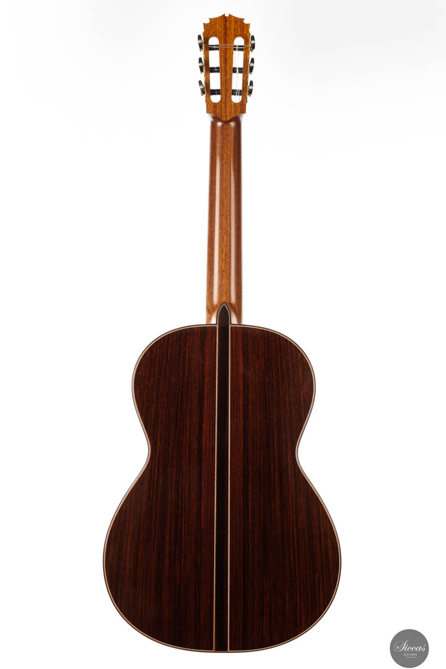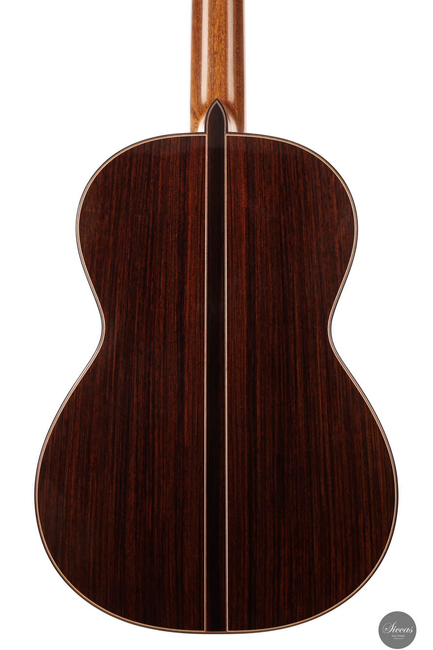 Die Gitarre Nummer 51 von Friederike Linscheid tritt aus ihrer Werkstatt hervor als ein traditionell konstruiertes Wunderwerk, das darauf ausgerichtet ist, unvergleichlichen musikalischen Ausdruck zu liefern. Die Wahl einer Zederndecke, ergänzt durch von Robert Bouchet inspirierte Fichtenspäne, verleiht diesem Instrument einen reichen, vollen und warmen Klang, der es im Bereich der klassischen Gitarren auszeichnet. Die Einbeziehung von indischen Palisanderseiten, laminiert mit Mahagoni in einer Weise, die an das Handwerk von Daniel Friederich erinnert, und verstärkt mit von Dominique Field stilisierten Spänen, trägt zum robusten Charakter der Gitarre bei. Diese sorgfältige Konstruktion führt zu einer Gitarre, die nicht nur einen ausdrucksvollen Klang erzeugt, sondern auch ein breites Spektrum an Klangfarben präsentiert, was sie zu einem Schatz an musikalischen Möglichkeiten macht. Als gebrauchtes Instrument ist diese Gitarre in ausgezeichnetem Zustand mit oberflächlichen Spielspuren.