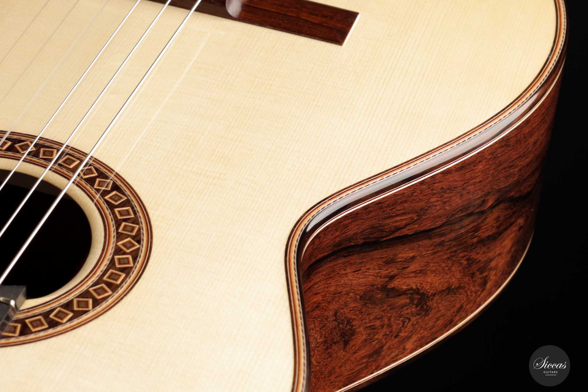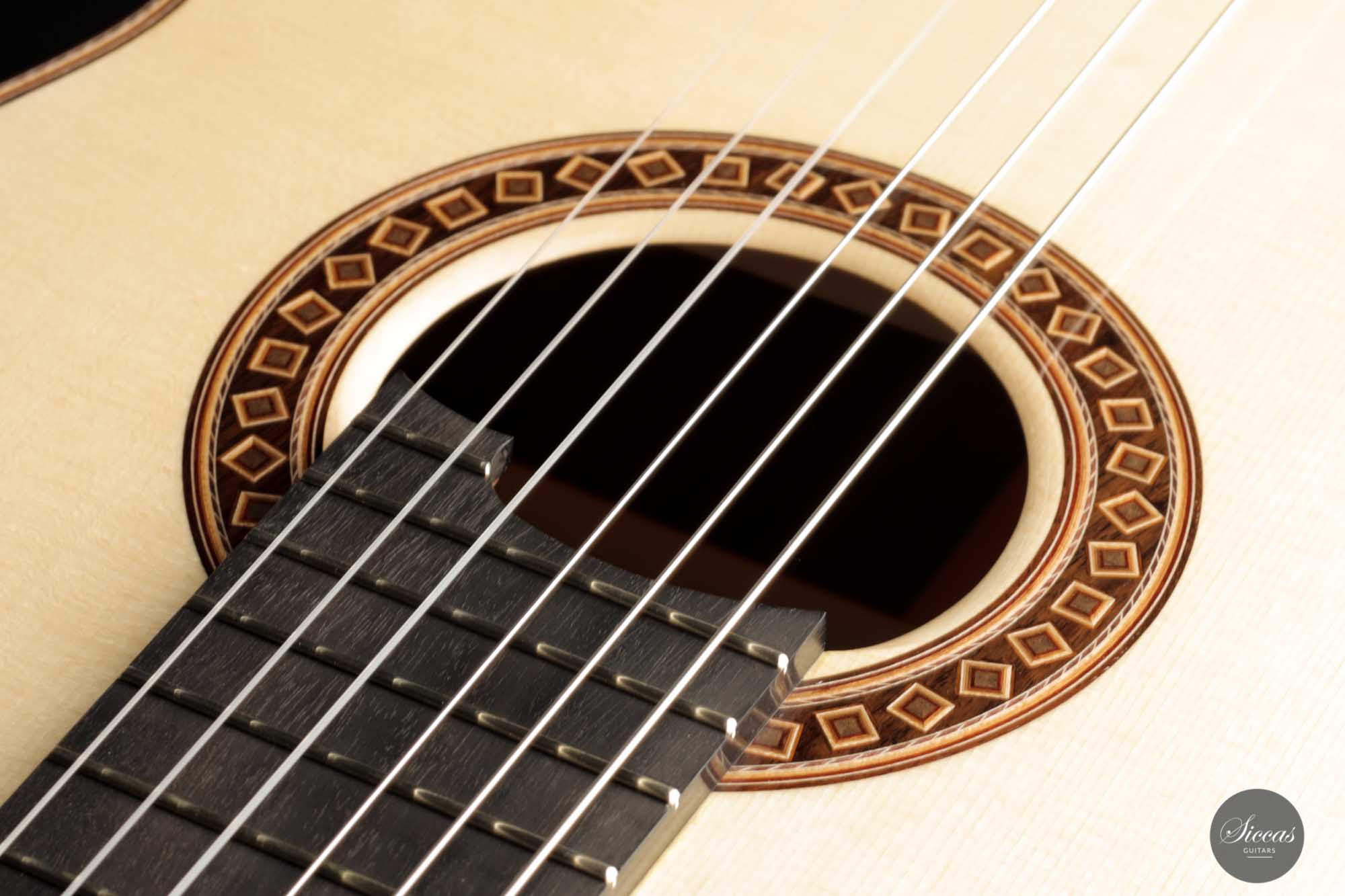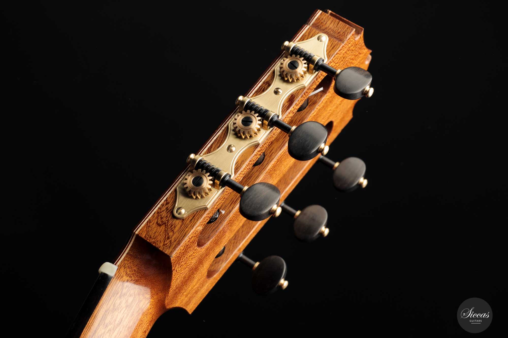 Diese Gitarre, Nummer 55, kommt direkt aus der Werkstatt von Friederike Linscheid und ist ein traditionell gebautes Konzertinstrument. Die Offenheit, die Kraft und der Reichtum des Klangs sind unglaublich. Wir kennen das Geheimnis von Friederike nicht, aber ihre letzten Gitarren sind einfach phänomenal. Mit ihrer 64-cm-Mensur lässt sie sich so leicht spielen, und die Klangoffenheit dieses Neugeborenen übertrifft alle Erwartungen. In gewisser Weise verschiebt Friederike wirklich die Grenzen dessen, was eine traditionell gebaute Gitarre in Bezug auf die Projektion tun kann, und behält dennoch eine meisterhafte Klangqualität bei.