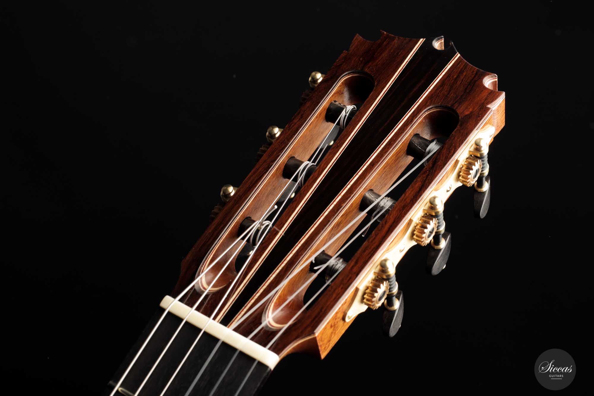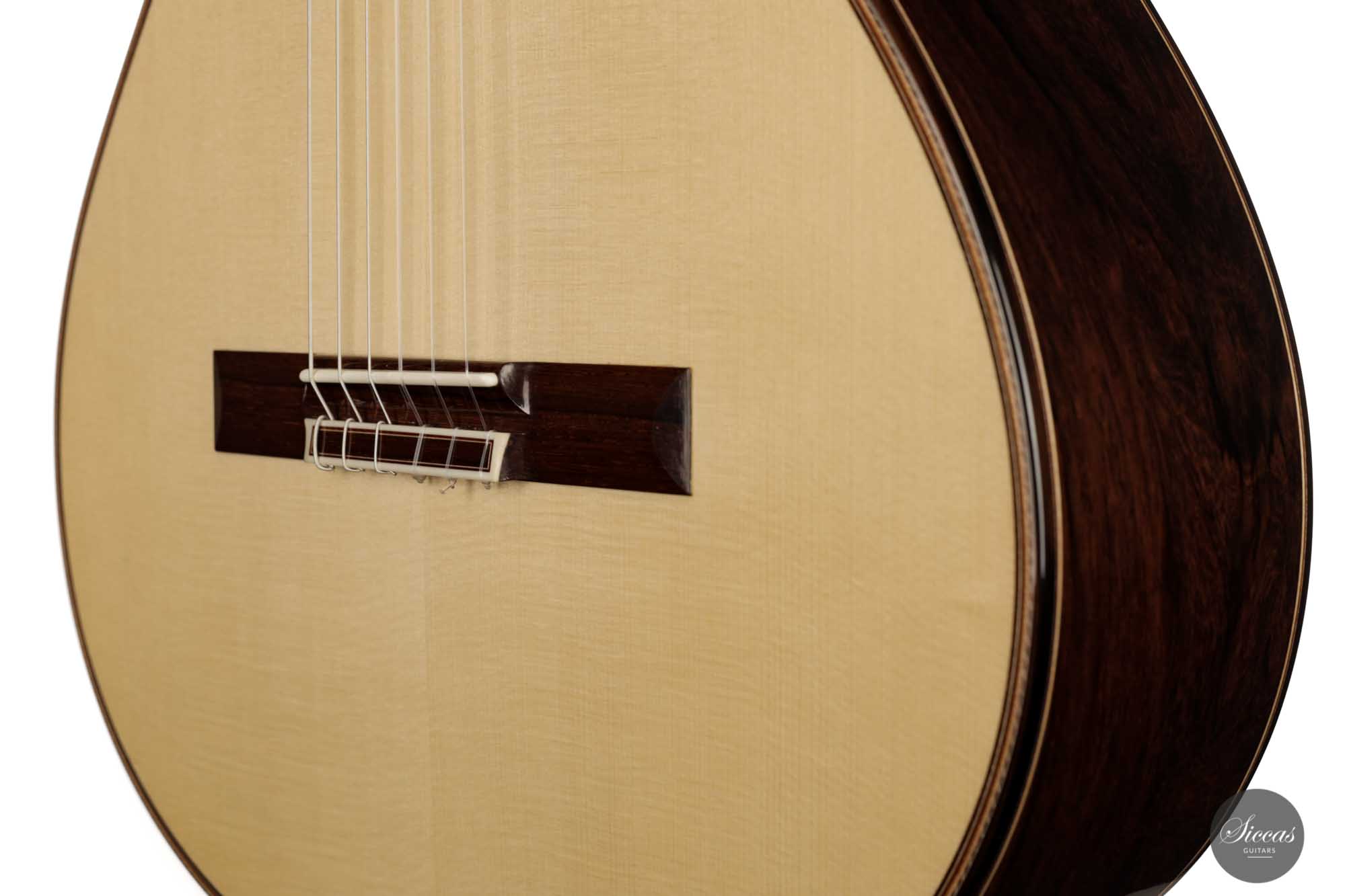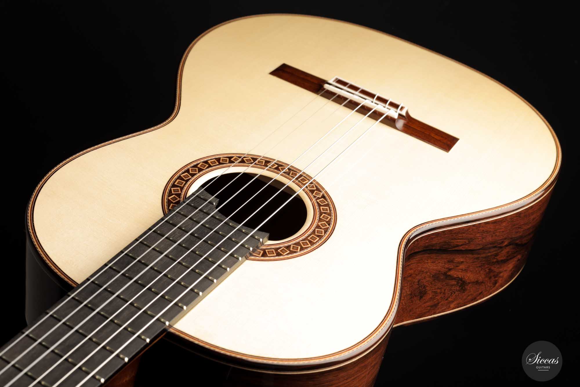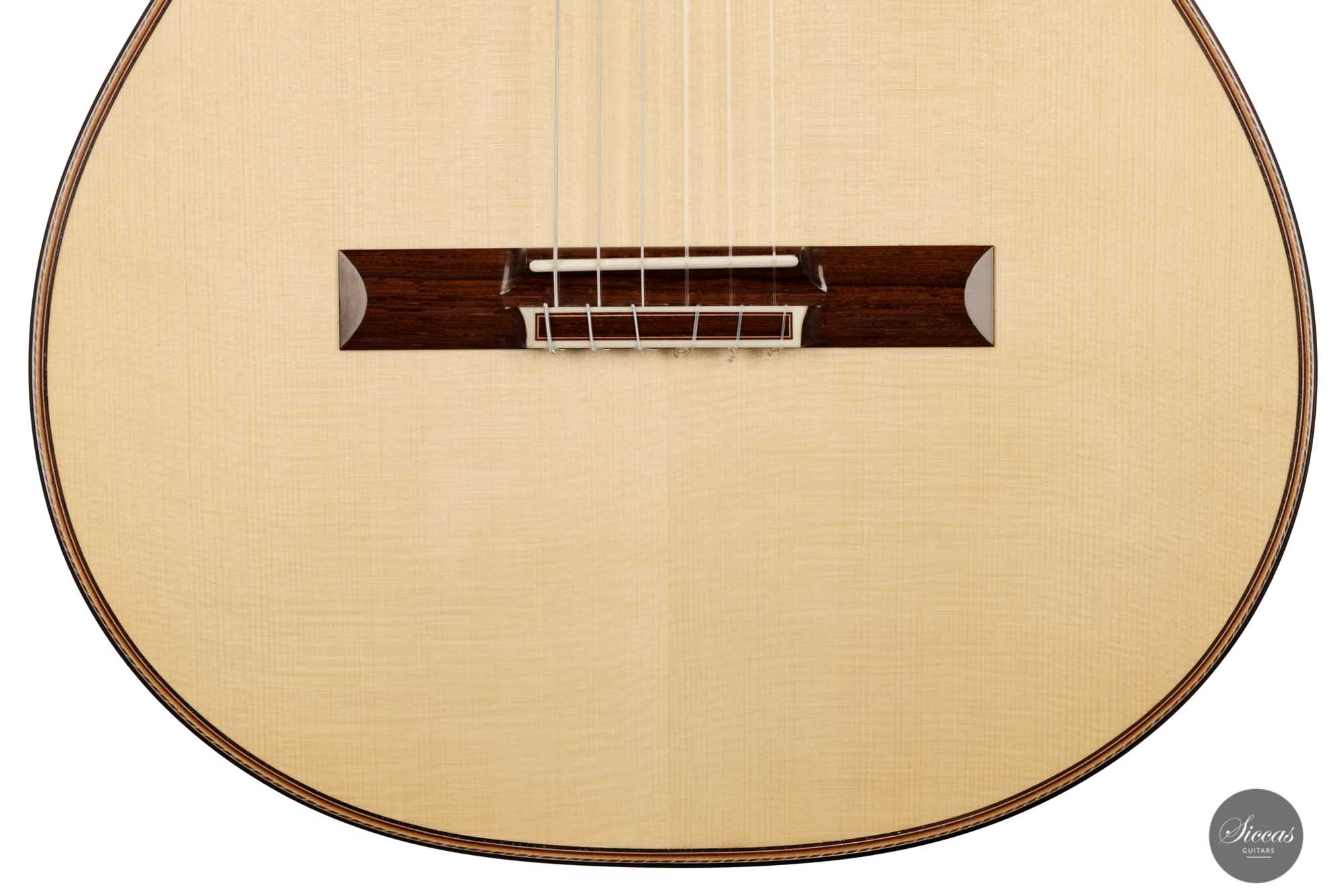 Diese Gitarre, Nummer 55, kommt direkt aus der Werkstatt von Friederike Linscheid und ist ein traditionell gebautes Konzertinstrument. Die Offenheit, die Kraft und der Reichtum des Klangs sind unglaublich. Wir kennen das Geheimnis von Friederike nicht, aber ihre letzten Gitarren sind einfach phänomenal. Mit ihrer 64-cm-Mensur lässt sie sich so leicht spielen, und die Klangoffenheit dieses Neugeborenen übertrifft alle Erwartungen. In gewisser Weise verschiebt Friederike wirklich die Grenzen dessen, was eine traditionell gebaute Gitarre in Bezug auf die Projektion tun kann, und behält dennoch eine meisterhafte Klangqualität bei.