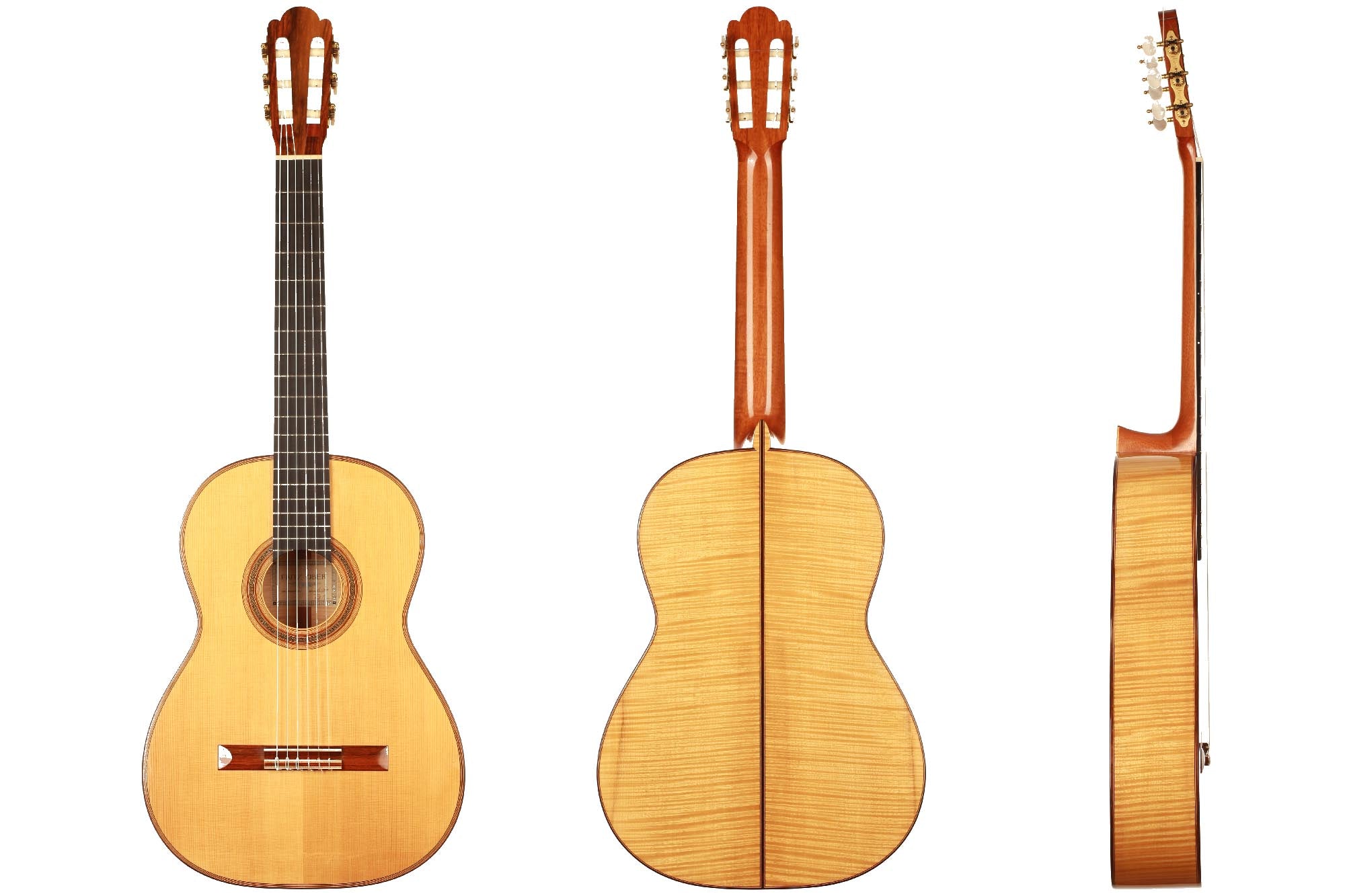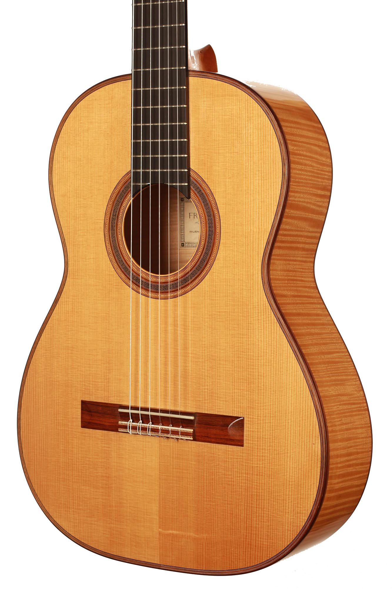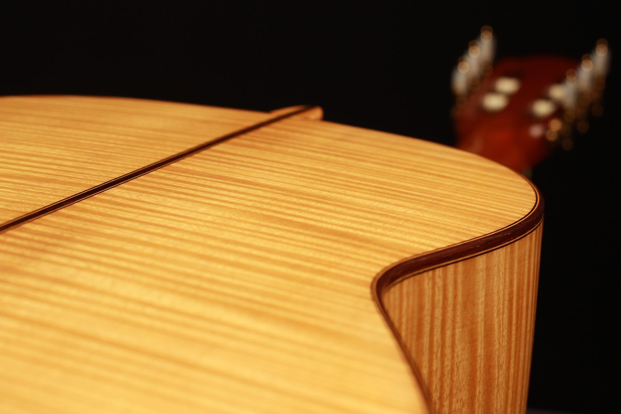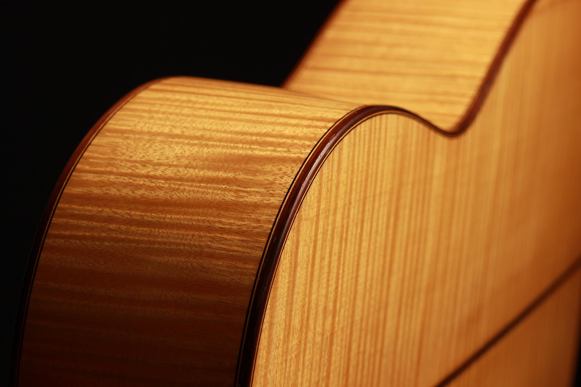 Dieses Instrument von 2003 ist ein wunderbares Beispiel, für eine in sich bestens ausgewogene Gitarre. Die Auswahl des Riegel-Ahorns für Boden und Zargen ist hervorragend und harmoniert wunderbar mit der Fichtendecke. Mit seinen 1347 Gramm ist das Instrument schön leicht und hat eine sehr gute und direkte Ansprache. Der Klang ist harmonisch und farbenreich und entwickelt sich sowohl bei leisem als auch bei lautem Spiel optimal. Die Gitarre ist in einem sehr guten Zustand und hat lediglich Spielspuren auf der Decke und dem Boden.
