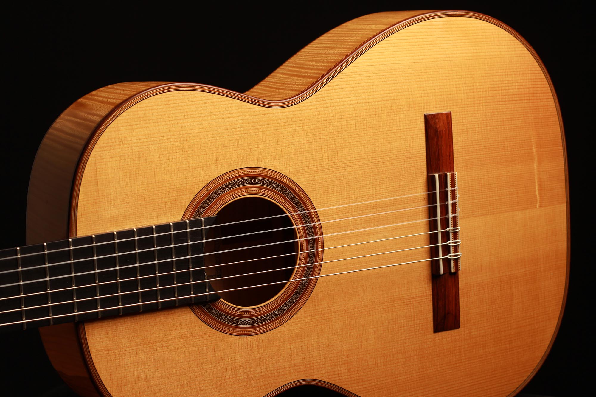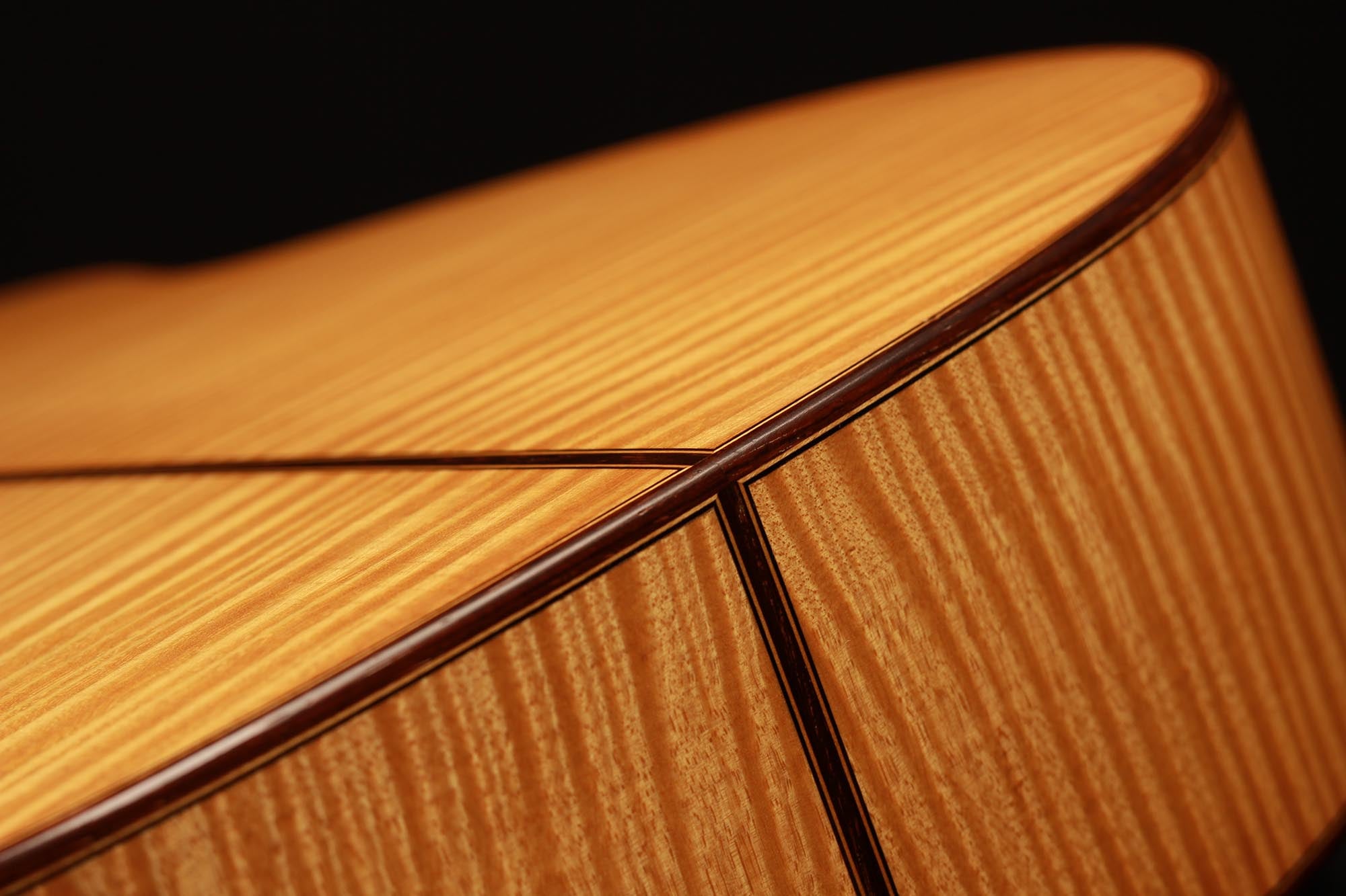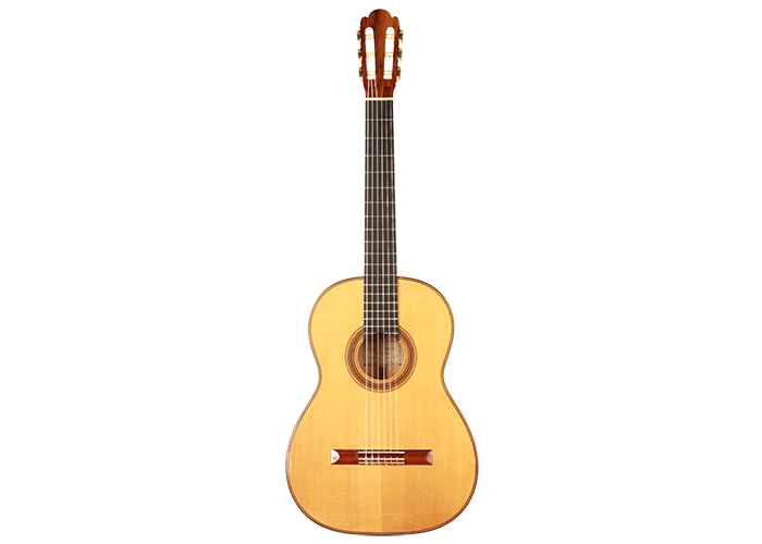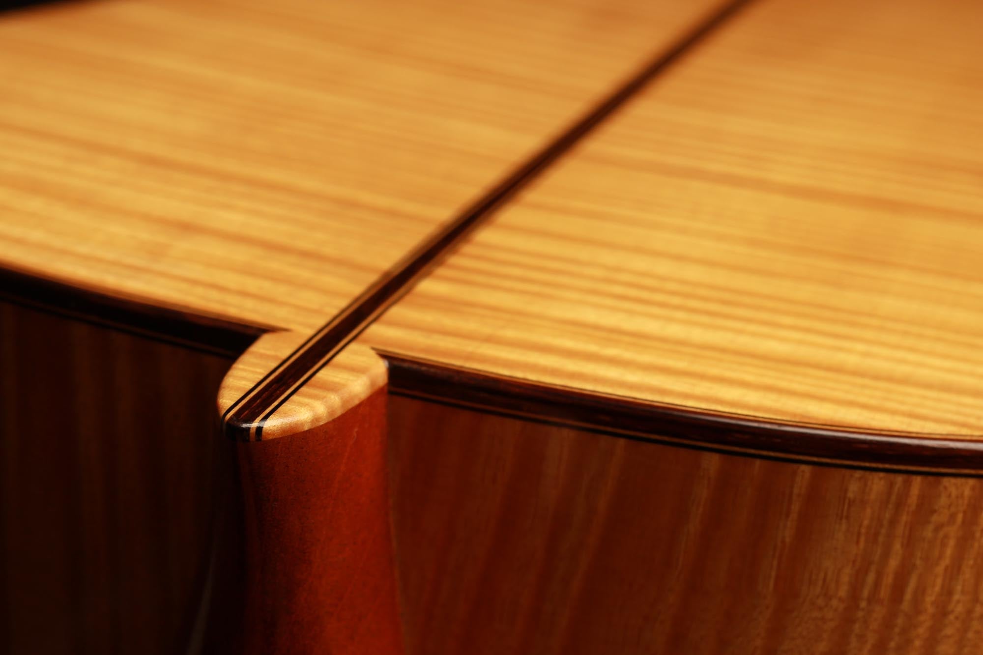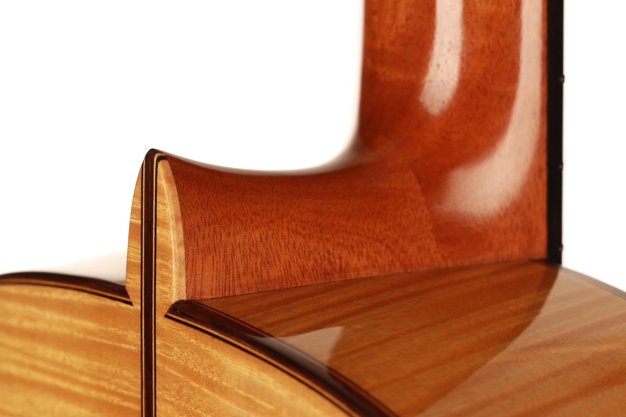 Dieses Instrument von 2003 ist ein wunderbares Beispiel, für eine in sich bestens ausgewogene Gitarre. Die Auswahl des Riegel-Ahorns für Boden und Zargen ist hervorragend und harmoniert wunderbar mit der Fichtendecke. Mit seinen 1347 Gramm ist das Instrument schön leicht und hat eine sehr gute und direkte Ansprache. Der Klang ist harmonisch und farbenreich und entwickelt sich sowohl bei leisem als auch bei lautem Spiel optimal. Die Gitarre ist in einem sehr guten Zustand und hat lediglich Spielspuren auf der Decke und dem Boden.