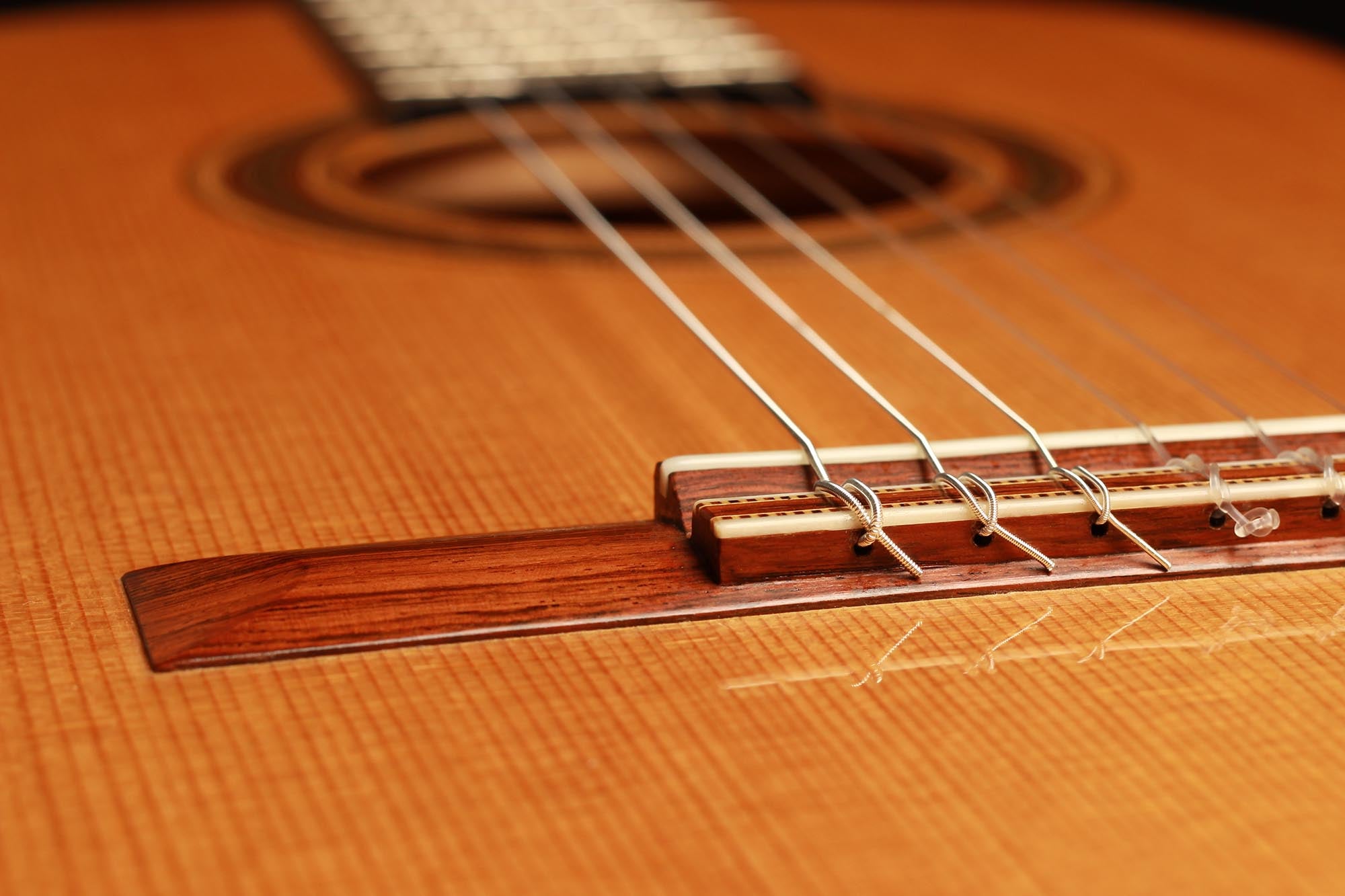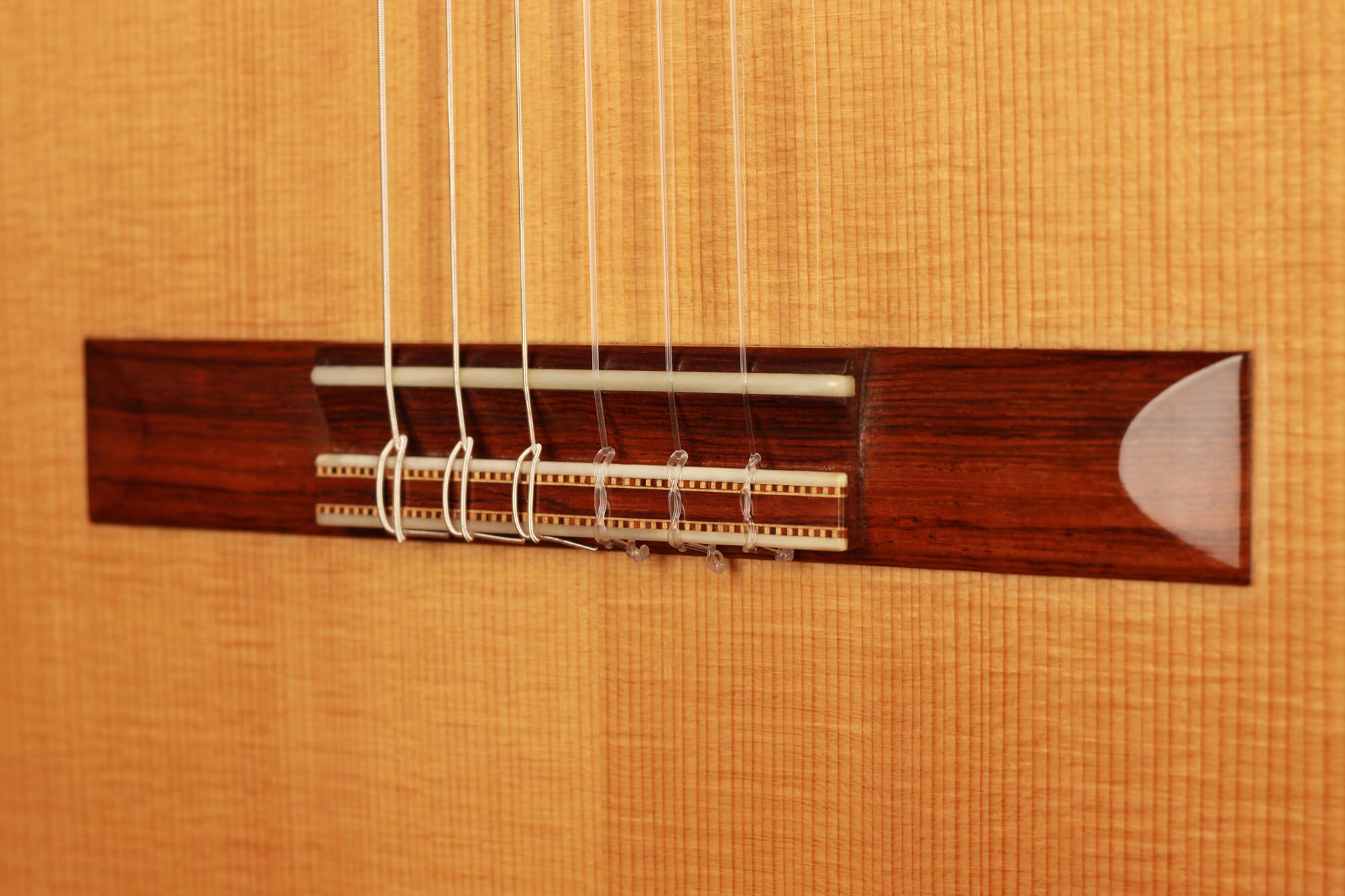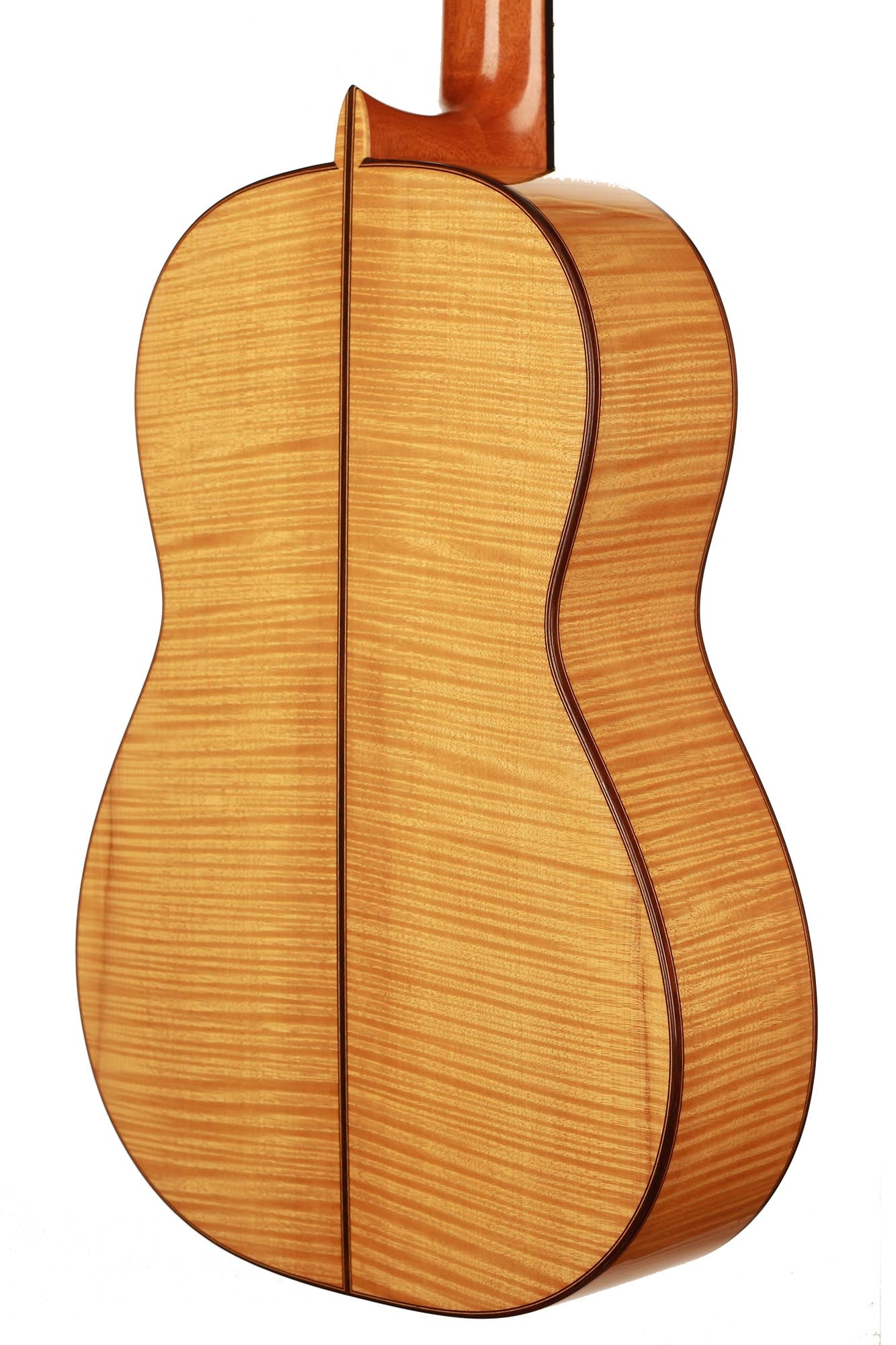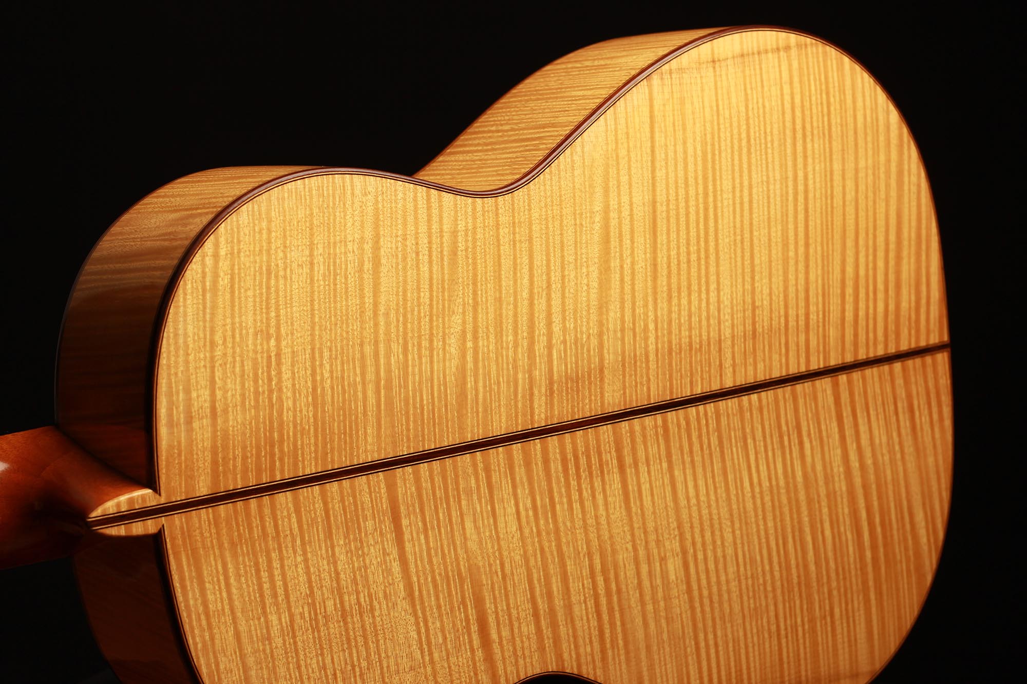 Dieses Instrument von 2003 ist ein wunderbares Beispiel, für eine in sich bestens ausgewogene Gitarre. Die Auswahl des Riegel-Ahorns für Boden und Zargen ist hervorragend und harmoniert wunderbar mit der Fichtendecke. Mit seinen 1347 Gramm ist das Instrument schön leicht und hat eine sehr gute und direkte Ansprache. Der Klang ist harmonisch und farbenreich und entwickelt sich sowohl bei leisem als auch bei lautem Spiel optimal. Die Gitarre ist in einem sehr guten Zustand und hat lediglich Spielspuren auf der Decke und dem Boden.