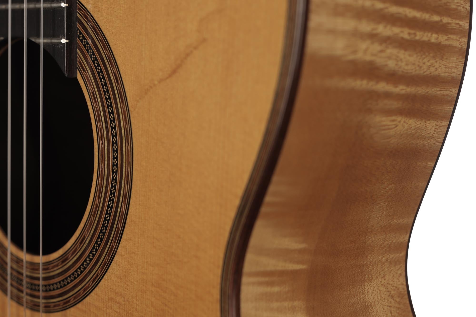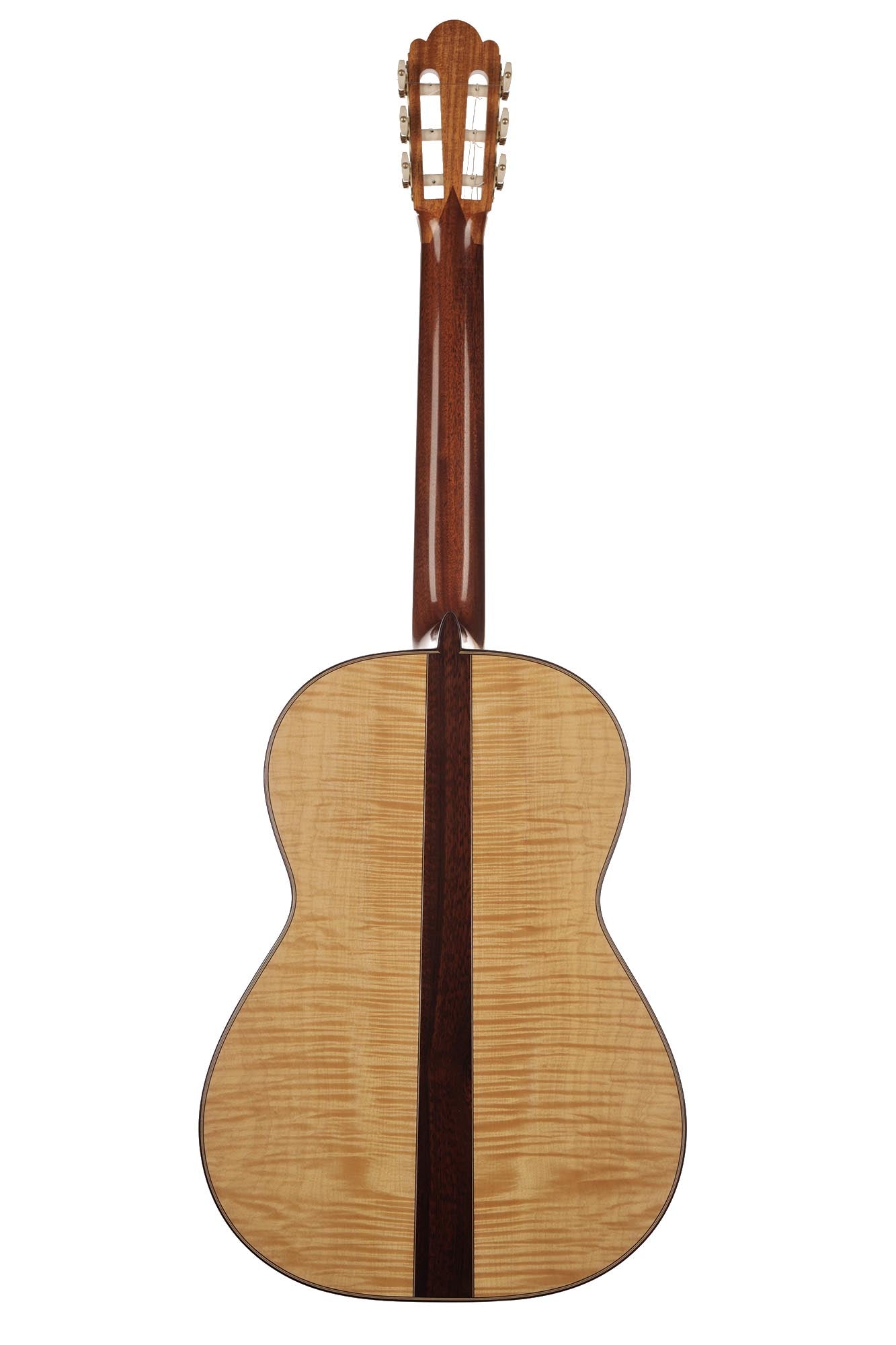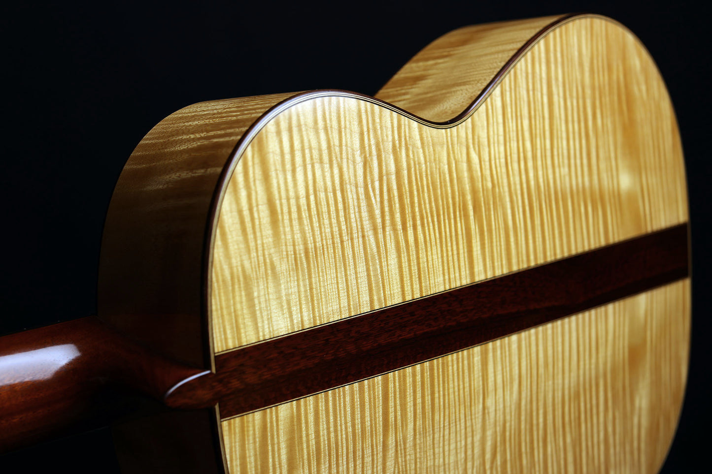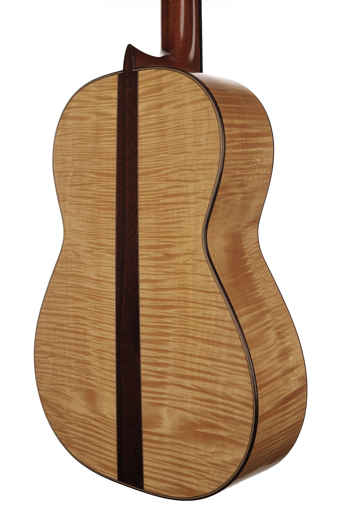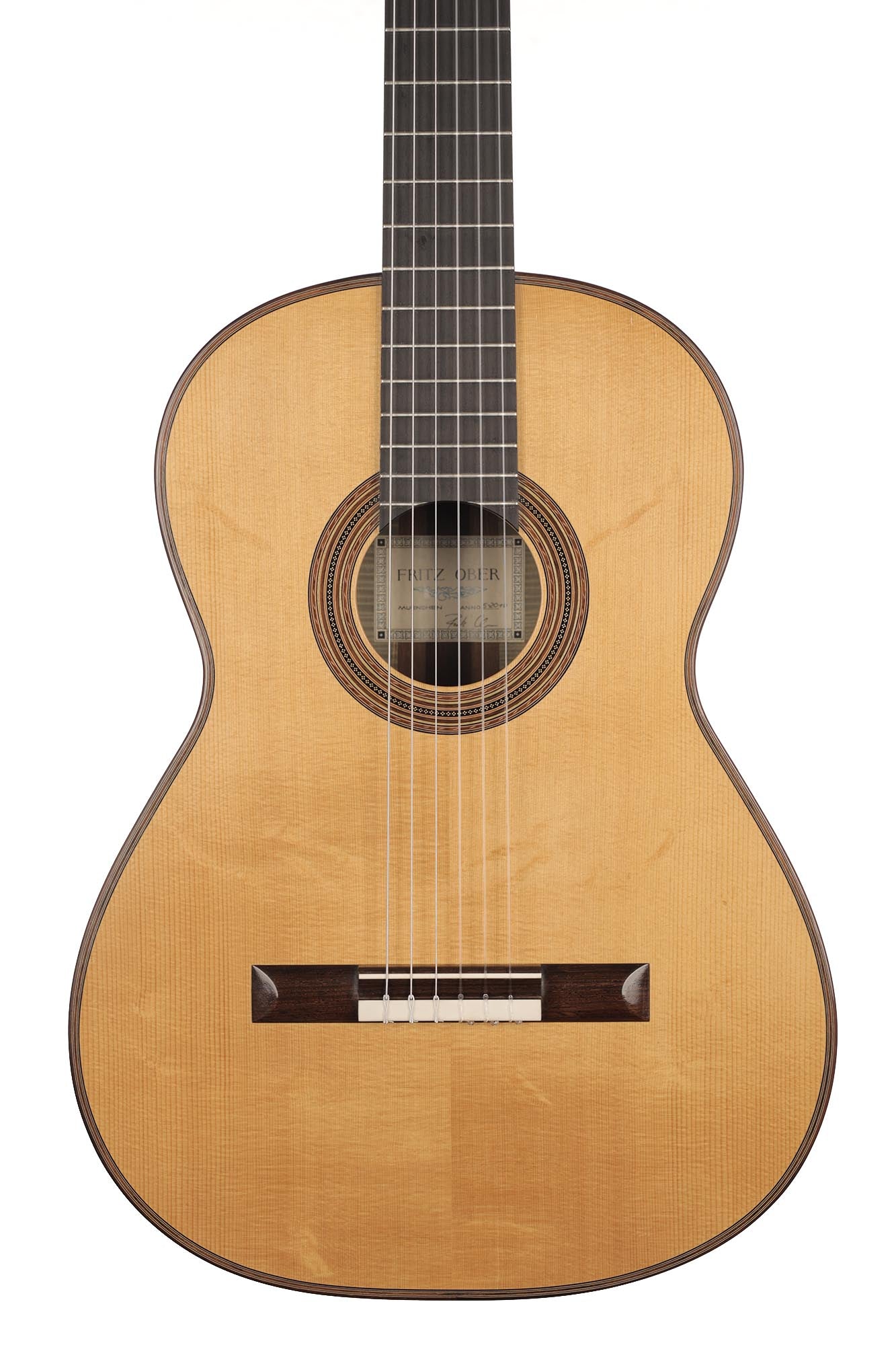 The beauty of this instrument is reflected in the elegance of its timbre. It is very light and has a spontaneous tone which shows the characteristic sound-colour of the maple used for the back and sides. The top made of German spruce responds very well, and the last ten years of playing have given this guitar a powerful and colourful voice. It really combines everything you would expect from a traditional guitar in the style of Antonio de Torres, and is one of the most beautiful Fritz Ober guitars we have experienced in recent years.