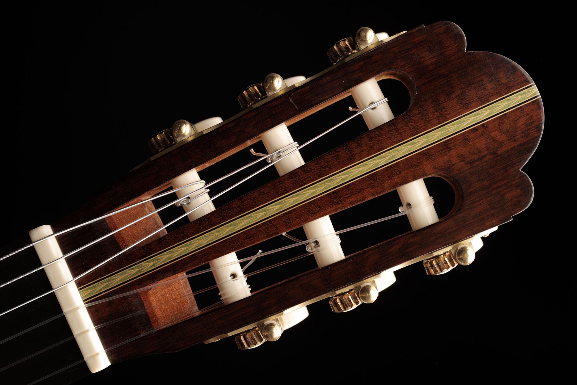 This guitar is in very good condition, without cracks and has only few traces of playing. A mother-of-pearl inlay has been inserted at the lower end of the sides, where an end pin was previously located. The tuners are handmade by the Italian manufacturer Nicoló Alessi.