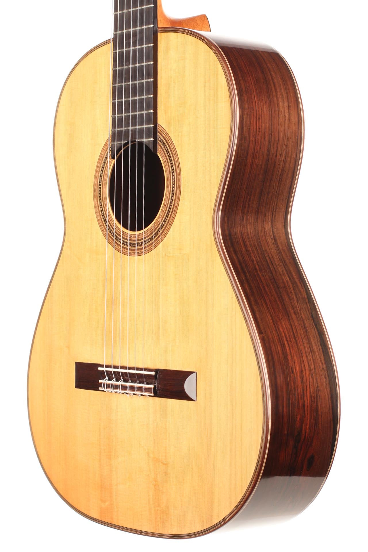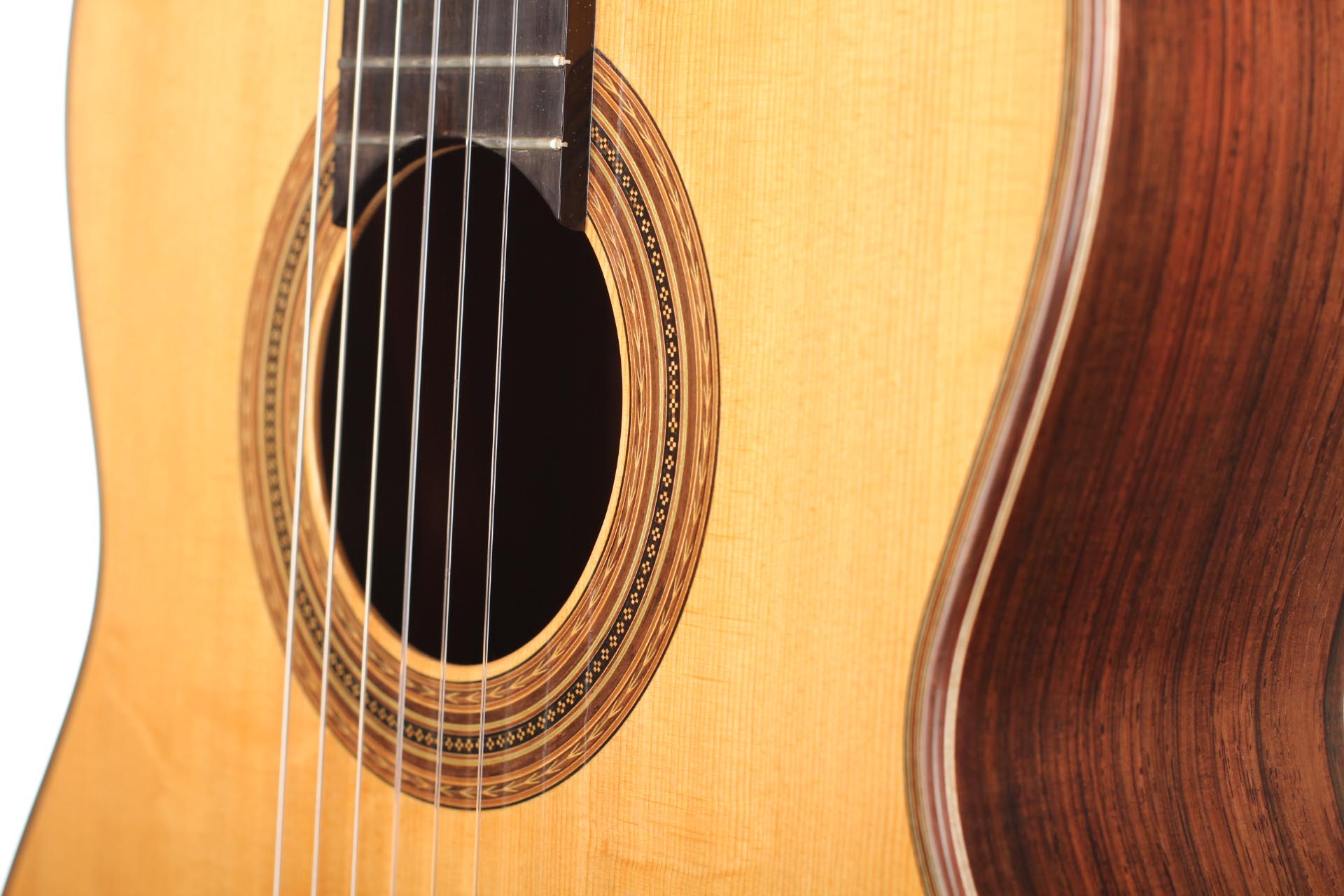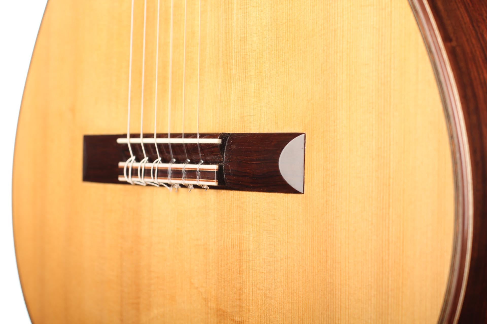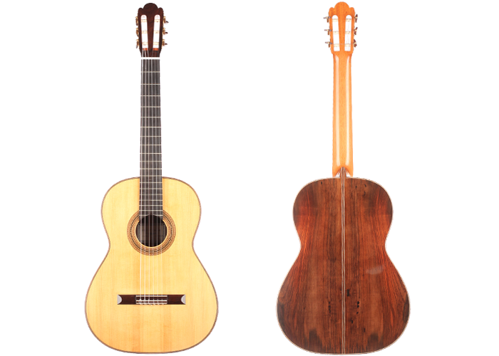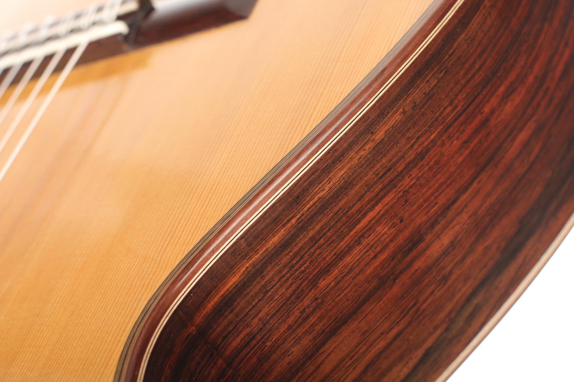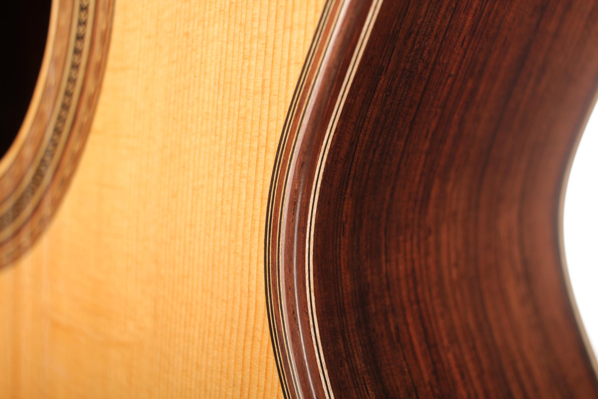 This guitar from 2015 is a real masterpiece of traditional construction. All the woods are distinguished and perfectly harmonious. The spruce top with its beautiful, clear grain contrasts splendidly with the excitingly flamed rosewood back and sides. In particular, the color shading on the back is very diversified. Furthermore, the woods used for the neck, bridge and headstock are consciously selected, carefully processed and put on display. The instrument is wonderfully light and has an unbelievably terrific and direct response. The sound is harmonic and colorful and develops magnificently in the room, both when strongly and softly played. The guitar is in a very good condition and only shows some minor signs of playing on top and back. This is craftsmanship on a world-class level. The tuners are made by Klaus Scheller. A hard-shell case is included.