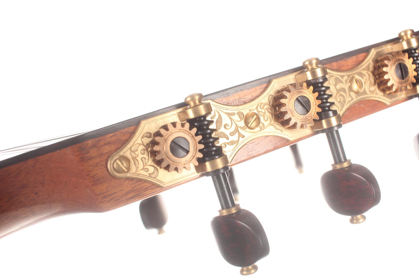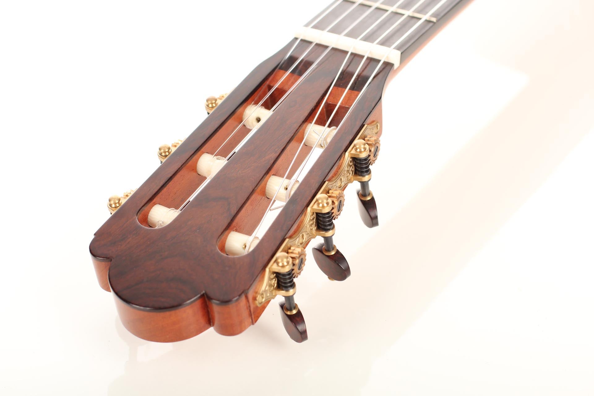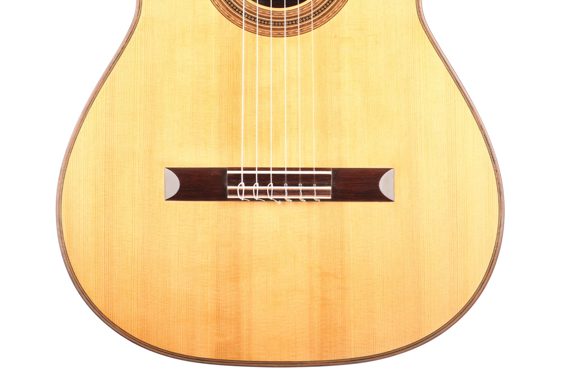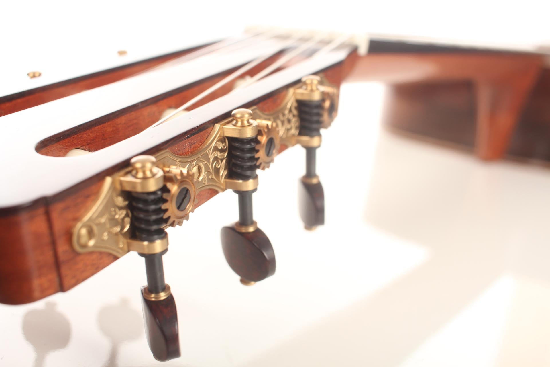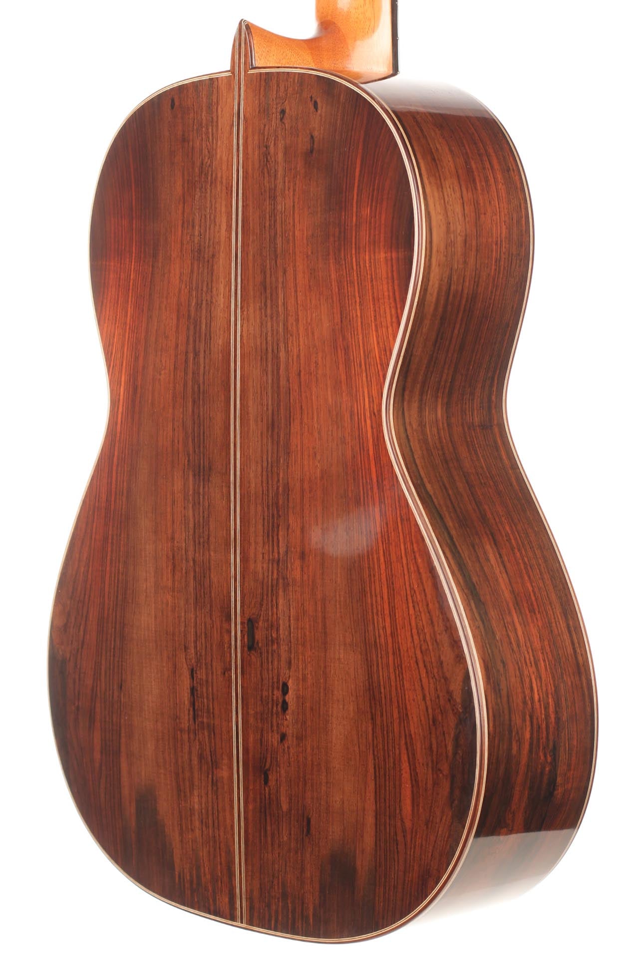 This guitar from 2015 is a real masterpiece of traditional construction. All the woods are distinguished and perfectly harmonious. The spruce top with its beautiful, clear grain contrasts splendidly with the excitingly flamed rosewood back and sides. In particular, the color shading on the back is very diversified. Furthermore, the woods used for the neck, bridge and headstock are consciously selected, carefully processed and put on display. The instrument is wonderfully light and has an unbelievably terrific and direct response. The sound is harmonic and colorful and develops magnificently in the room, both when strongly and softly played. The guitar is in a very good condition and only shows some minor signs of playing on top and back. This is craftsmanship on a world-class level. The tuners are made by Klaus Scheller. A hard-shell case is included.