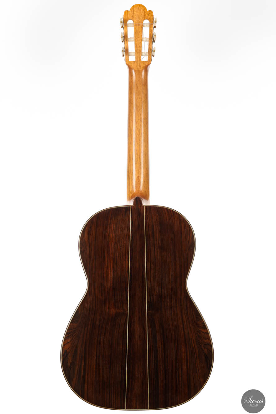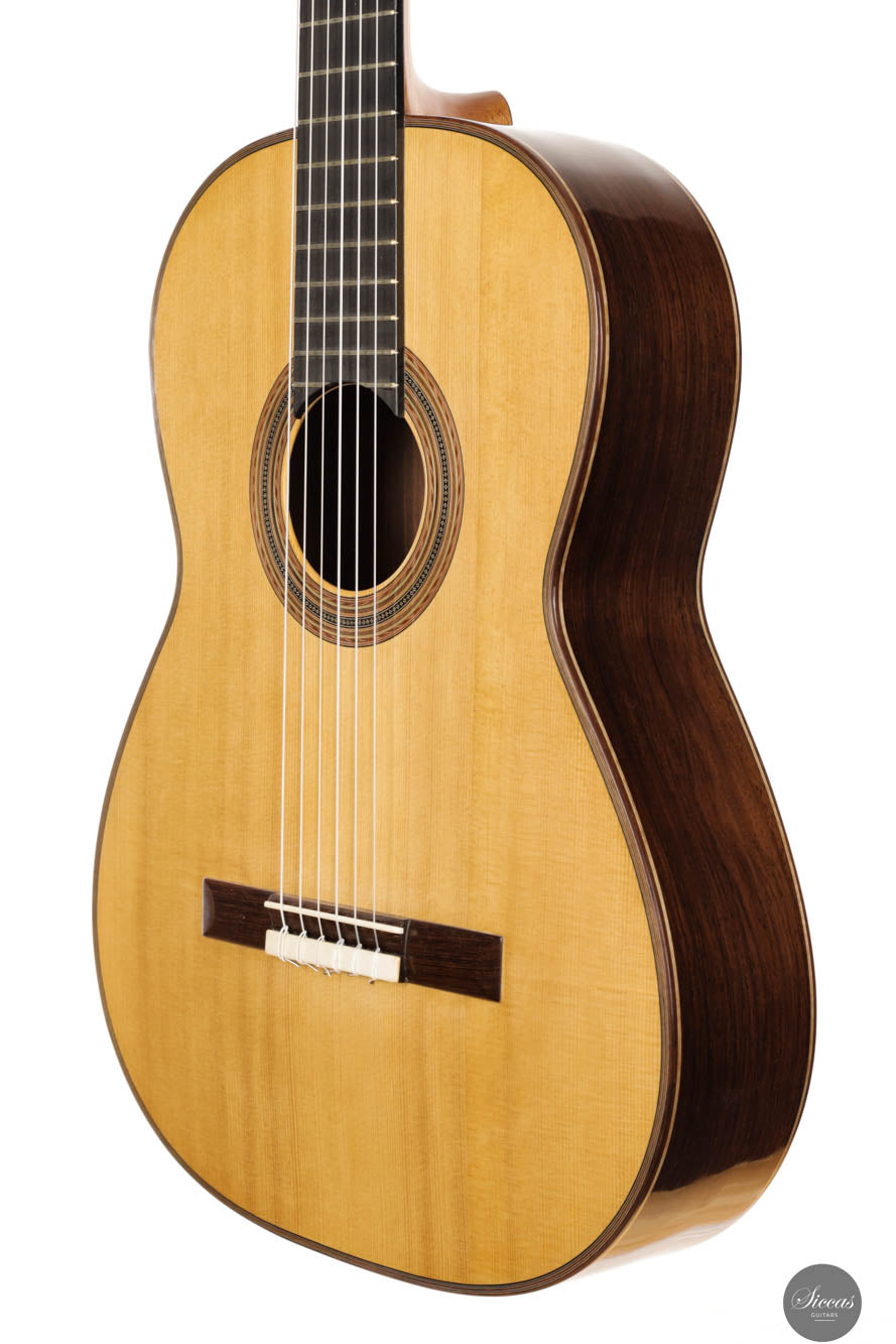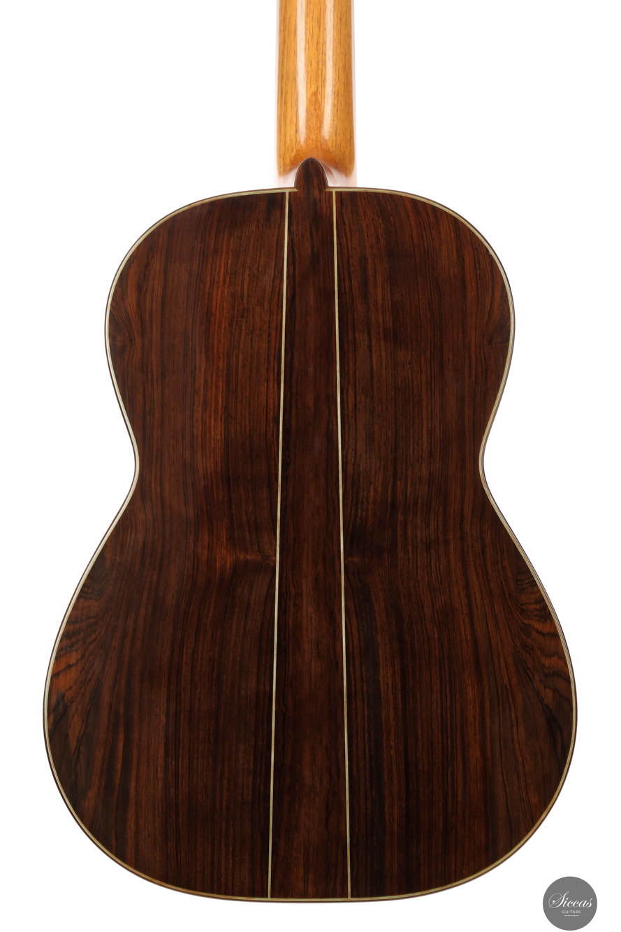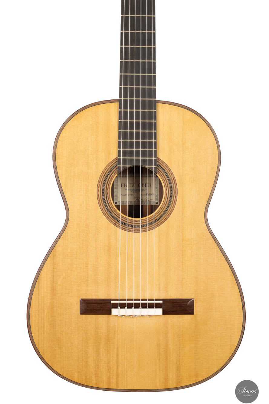Die Gitarre von Fritz Ober aus dem Jahr 2017 repräsentiert den Zenit des Gitarrenbaus, ein Meisterwerk in makellosem Zustand, das das unübertroffene Können und die Aufmerksamkeit für Details des Luthiers hervorhebt. Ihr Rücken, gefertigt aus CITES-zertifiziertem brasilianischem Rosenholz, steigert nicht nur die visuelle Anziehungskraft der Gitarre, sondern trägt auch wesentlich zu ihrer klanglichen Tiefe bei und bietet eine tonale Reichhaltigkeit, die sowohl selten als auch fesselnd ist. Die tiefe D-Luftresonanz der Gitarre, ein Ergebnis ihres sorgfältig gefertigten traditionellen Fächerbeleistungs, inszeniert eine Symphonie von Klängen. Von den tiefen und eleganten Bässen bis zu den Trebles, die mit süßer Klarheit singen, lädt dieses Instrument Spieler ein, eine breite Palette musikalischer Ausdrucksformen zu erkunden und durch Klanglandschaften zu navigieren, die nur wenige Gitarren wirklich bieten können.