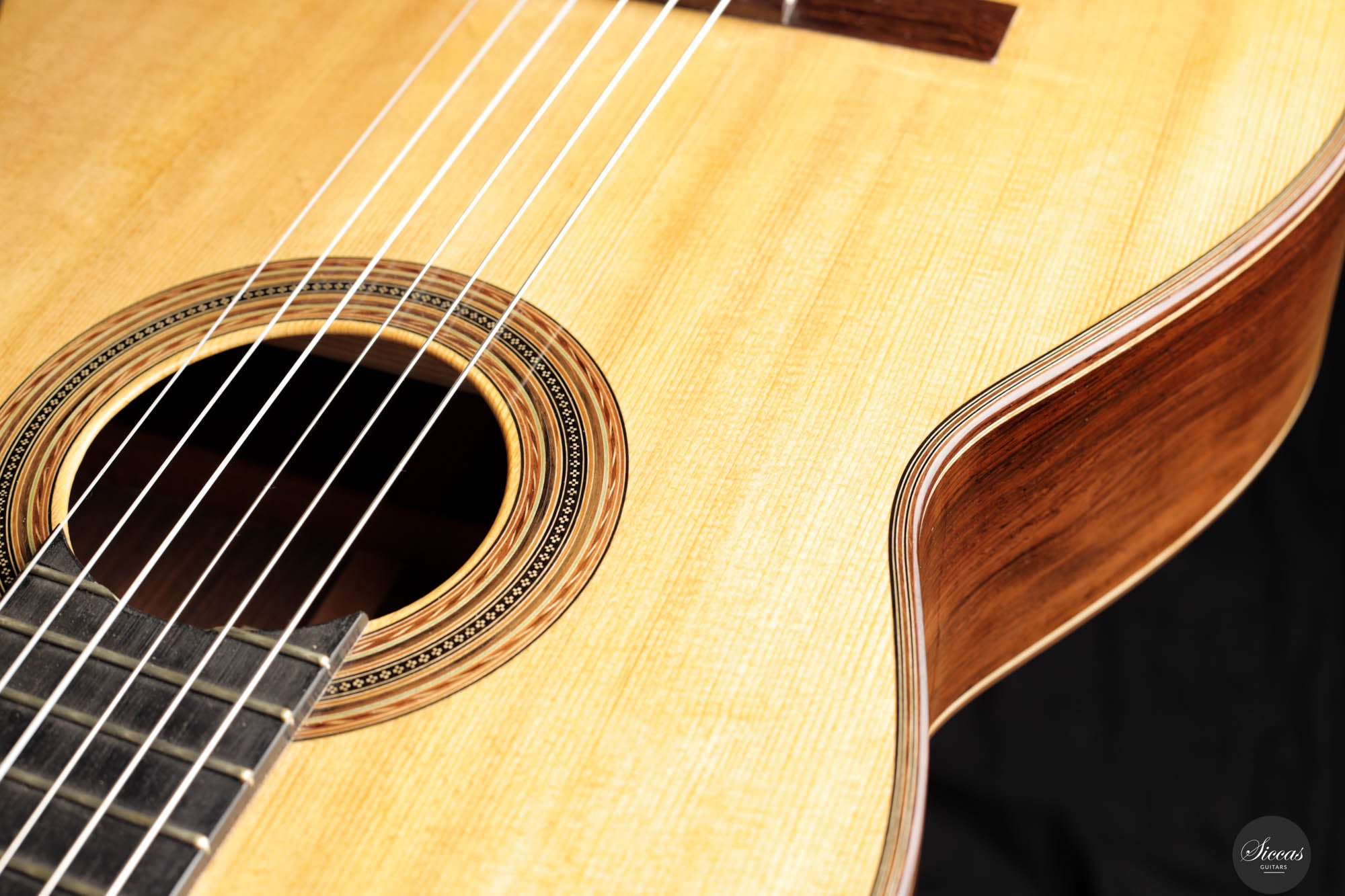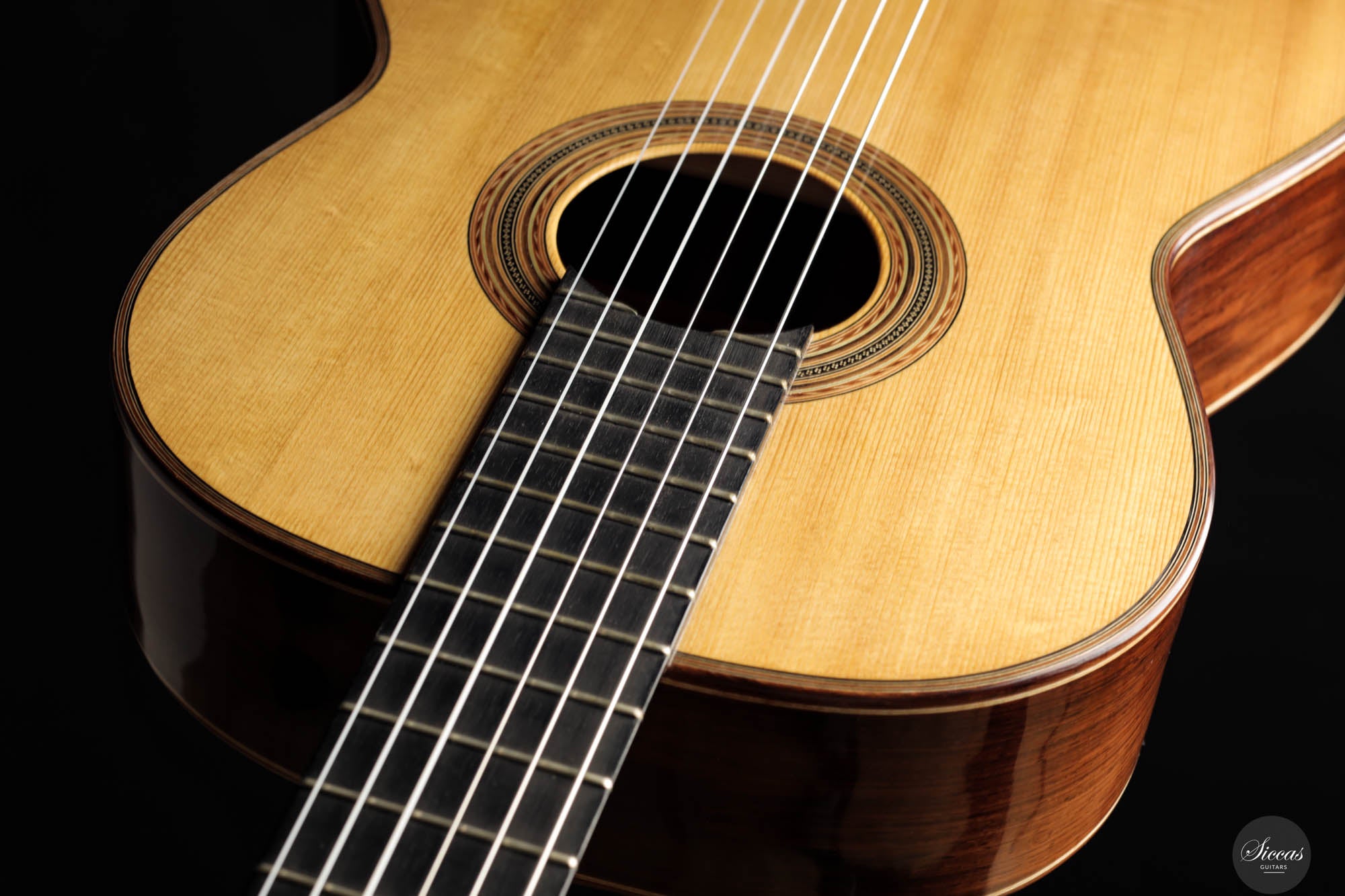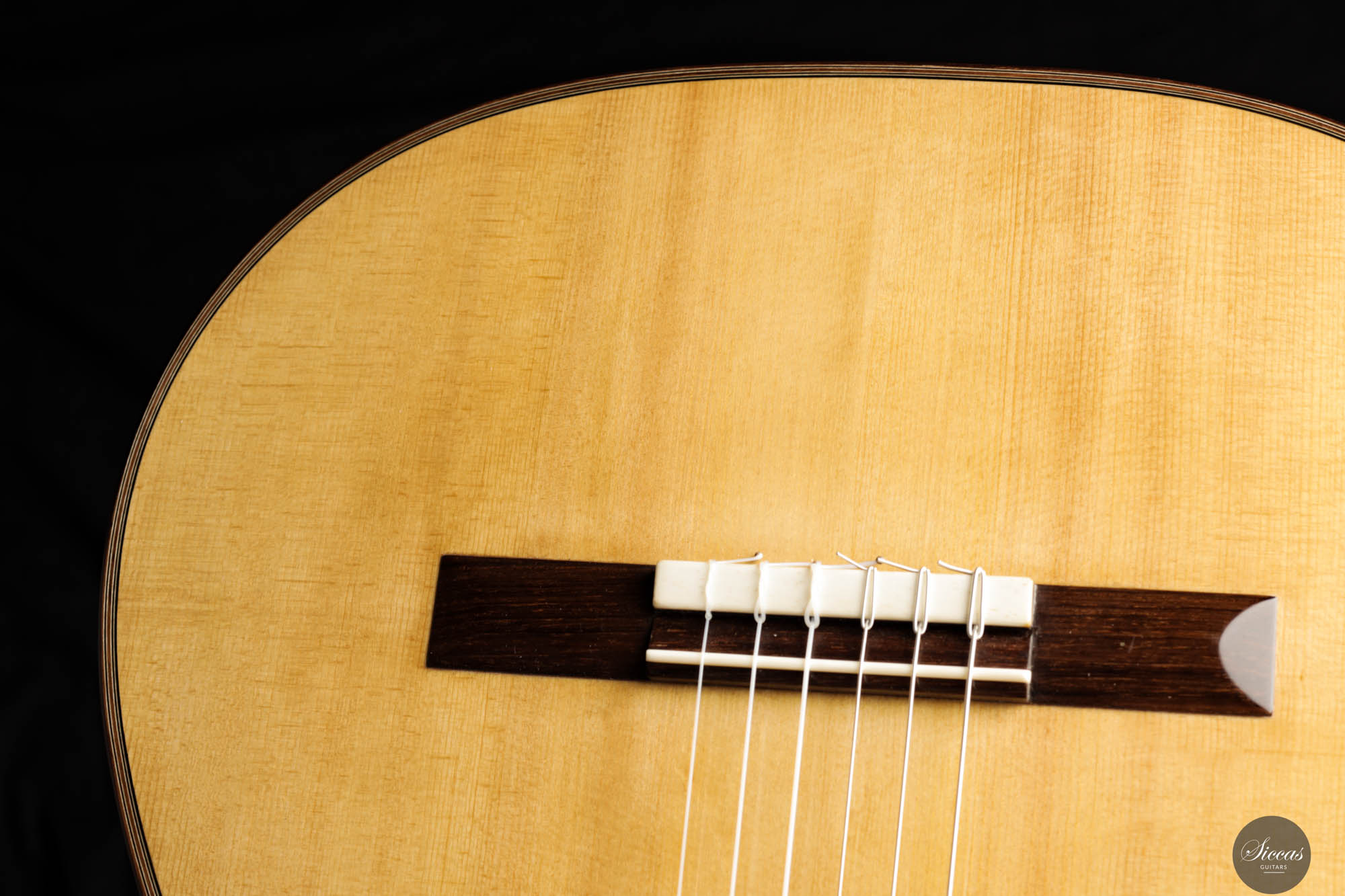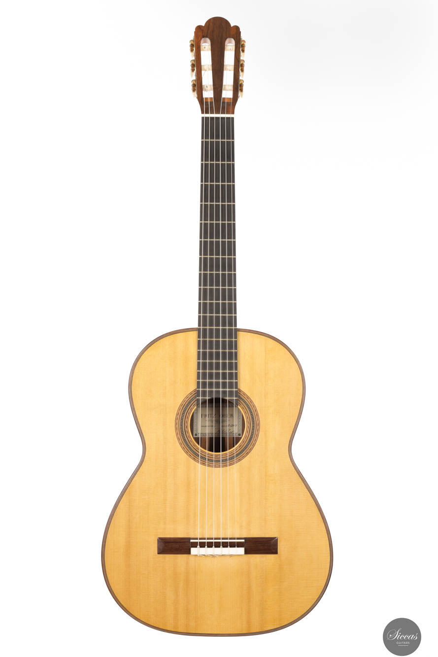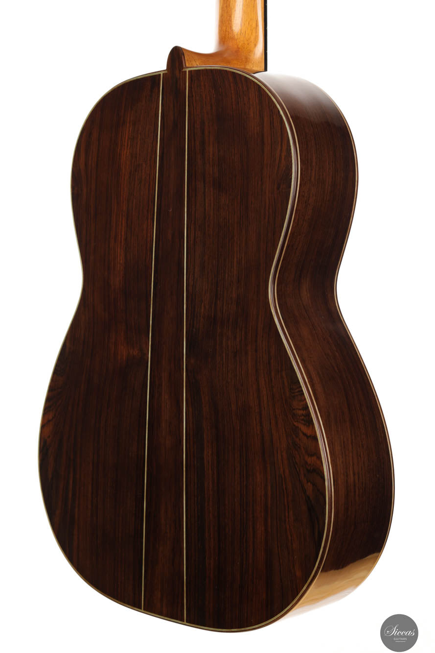 Die Gitarre von Fritz Ober aus dem Jahr 2017 repräsentiert den Zenit des Gitarrenbaus, ein Meisterwerk in makellosem Zustand, das das unübertroffene Können und die Aufmerksamkeit für Details des Luthiers hervorhebt. Ihr Rücken, gefertigt aus CITES-zertifiziertem brasilianischem Rosenholz, steigert nicht nur die visuelle Anziehungskraft der Gitarre, sondern trägt auch wesentlich zu ihrer klanglichen Tiefe bei und bietet eine tonale Reichhaltigkeit, die sowohl selten als auch fesselnd ist. Die tiefe D-Luftresonanz der Gitarre, ein Ergebnis ihres sorgfältig gefertigten traditionellen Fächerbeleistungs, inszeniert eine Symphonie von Klängen. Von den tiefen und eleganten Bässen bis zu den Trebles, die mit süßer Klarheit singen, lädt dieses Instrument Spieler ein, eine breite Palette musikalischer Ausdrucksformen zu erkunden und durch Klanglandschaften zu navigieren, die nur wenige Gitarren wirklich bieten können.