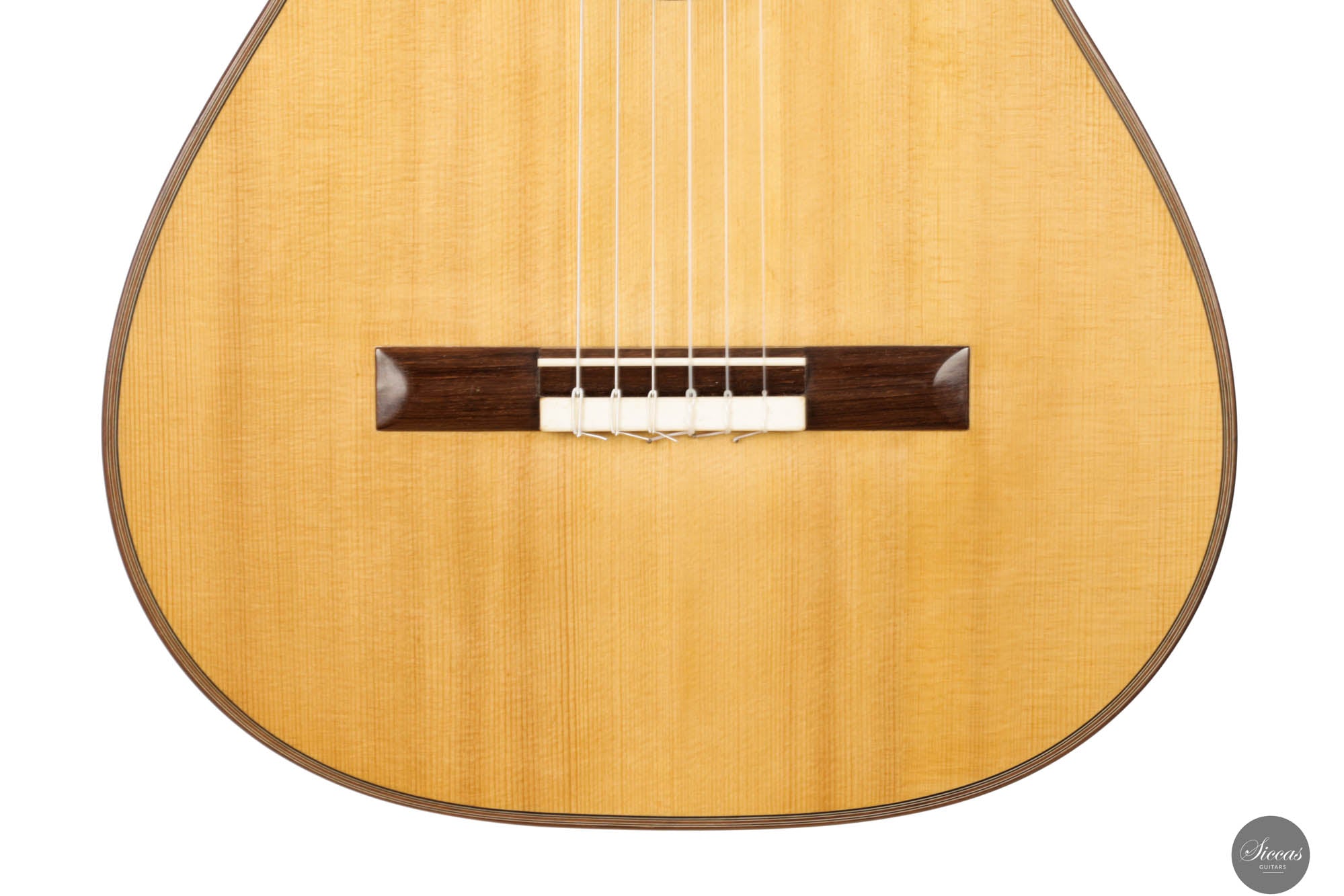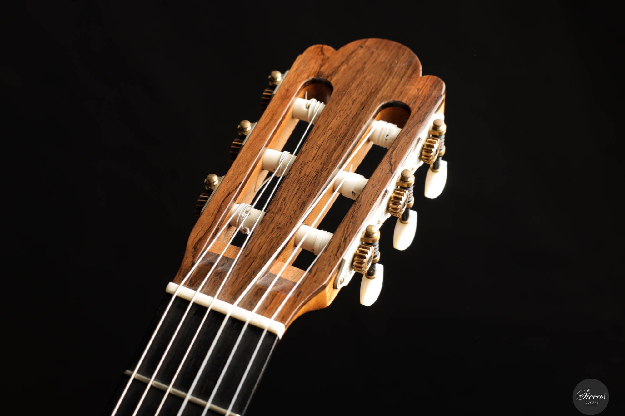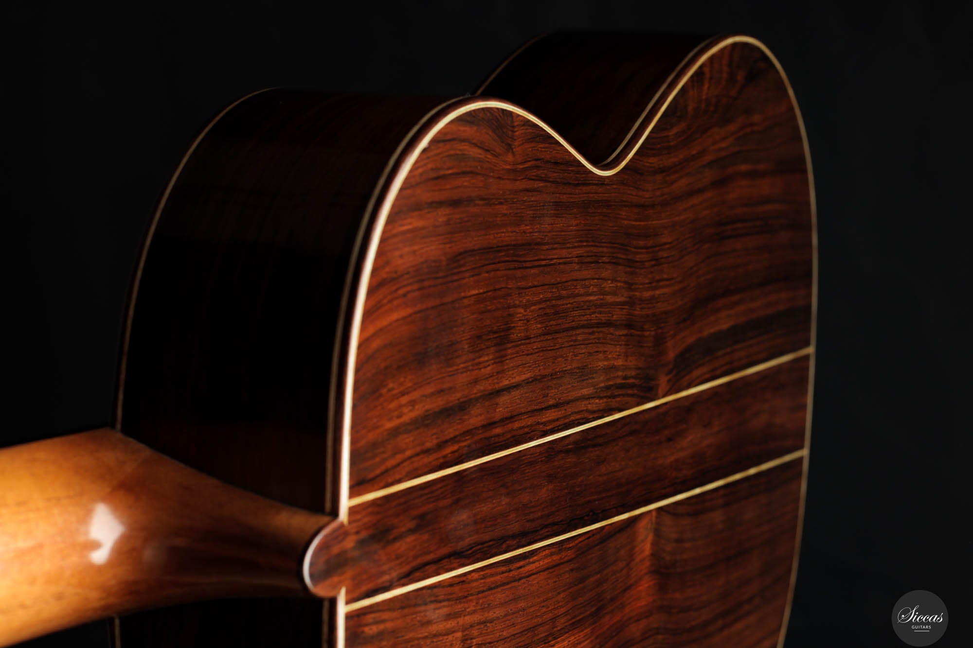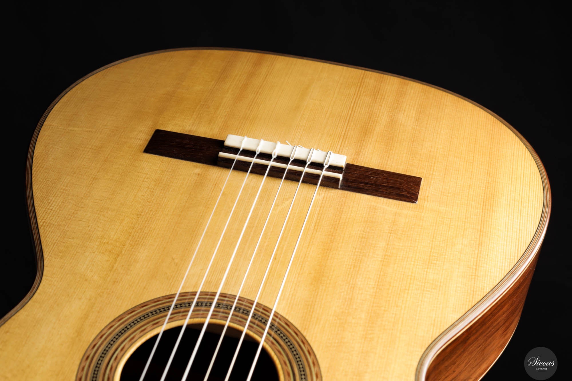 Die Gitarre von Fritz Ober aus dem Jahr 2017 repräsentiert den Zenit des Gitarrenbaus, ein Meisterwerk in makellosem Zustand, das das unübertroffene Können und die Aufmerksamkeit für Details des Luthiers hervorhebt. Ihr Rücken, gefertigt aus CITES-zertifiziertem brasilianischem Rosenholz, steigert nicht nur die visuelle Anziehungskraft der Gitarre, sondern trägt auch wesentlich zu ihrer klanglichen Tiefe bei und bietet eine tonale Reichhaltigkeit, die sowohl selten als auch fesselnd ist. Die tiefe D-Luftresonanz der Gitarre, ein Ergebnis ihres sorgfältig gefertigten traditionellen Fächerbeleistungs, inszeniert eine Symphonie von Klängen. Von den tiefen und eleganten Bässen bis zu den Trebles, die mit süßer Klarheit singen, lädt dieses Instrument Spieler ein, eine breite Palette musikalischer Ausdrucksformen zu erkunden und durch Klanglandschaften zu navigieren, die nur wenige Gitarren wirklich bieten können.