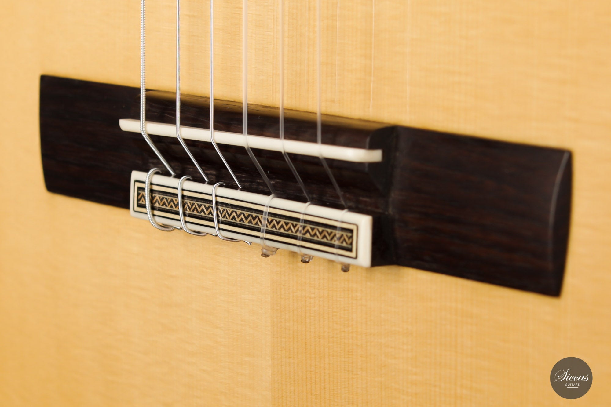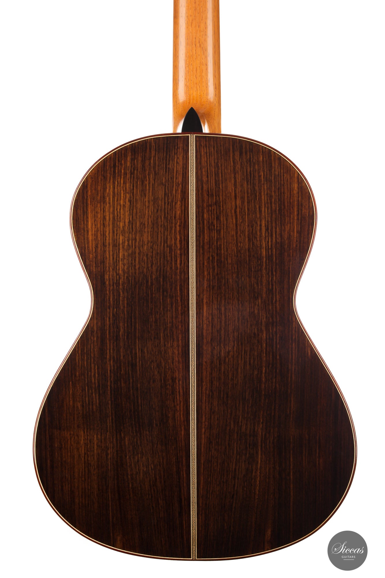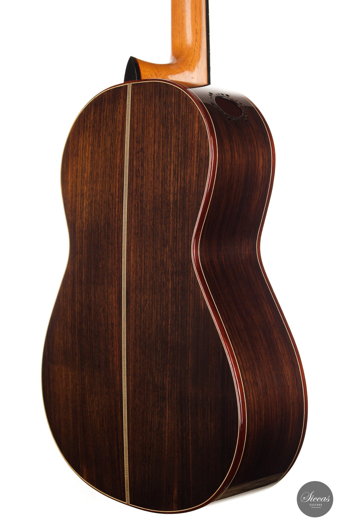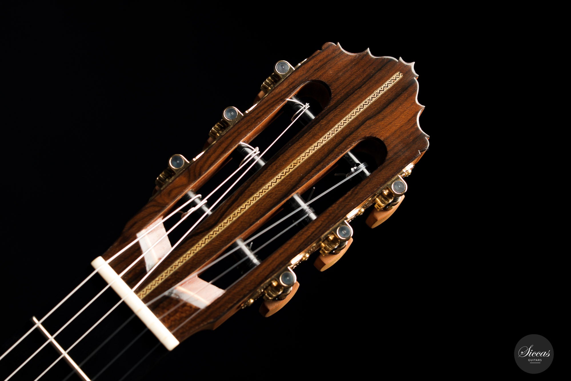 What an impressive volume for a traditionally built fan-braced guitar. The tone production feels similar to that of a grand piano, and each note develops with clarity, volume, and confidence. The voicing is very easy to define, and excellent tone separation combined with a reliable, well-balanced tone offers fantastic intelligibility in the polyphony. Finally, the future owner of this charming instrument will enjoy a top-notch left-hand comfort and refined chamber music playing experience thanks to the extra sound port on the side.