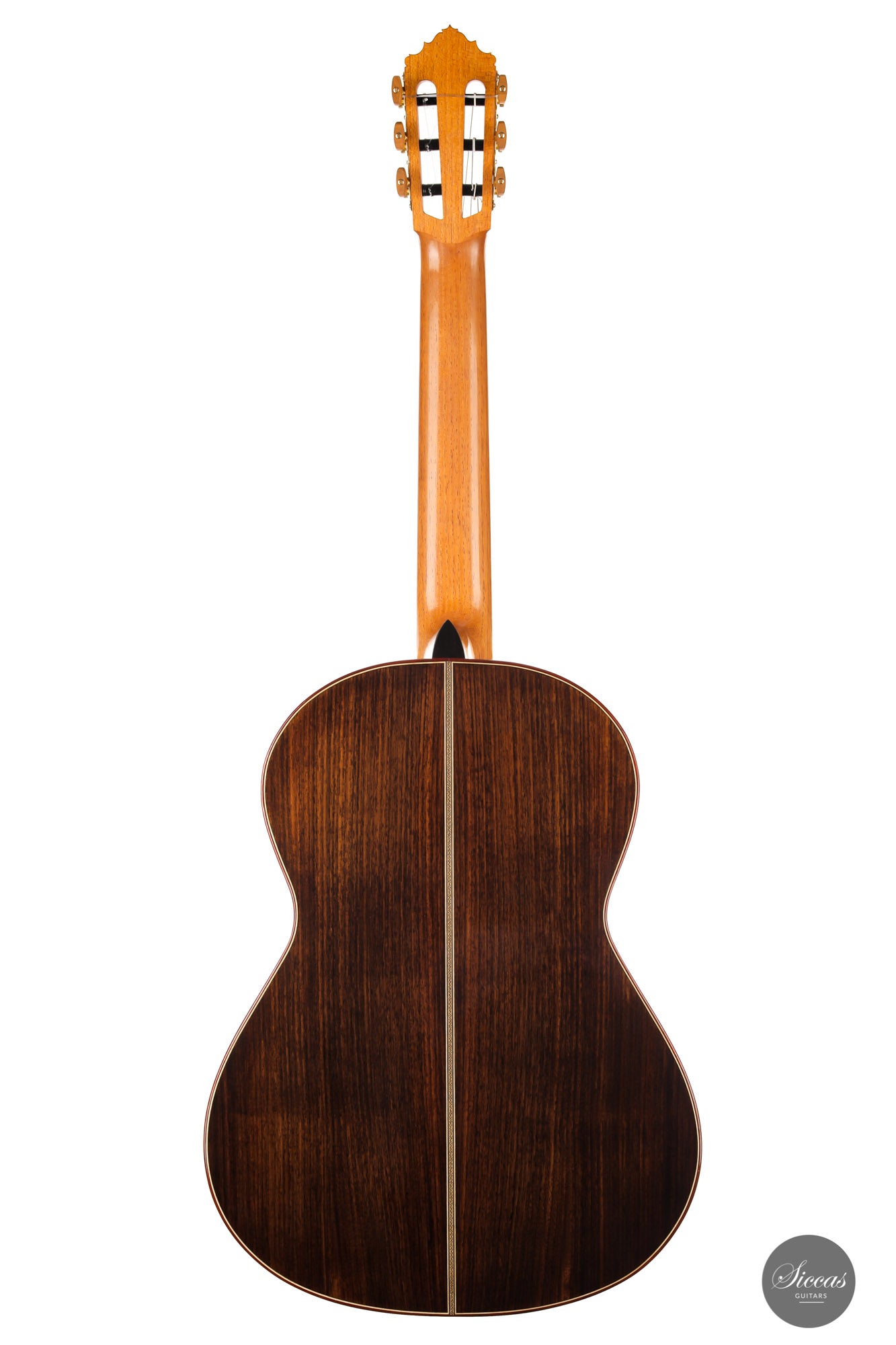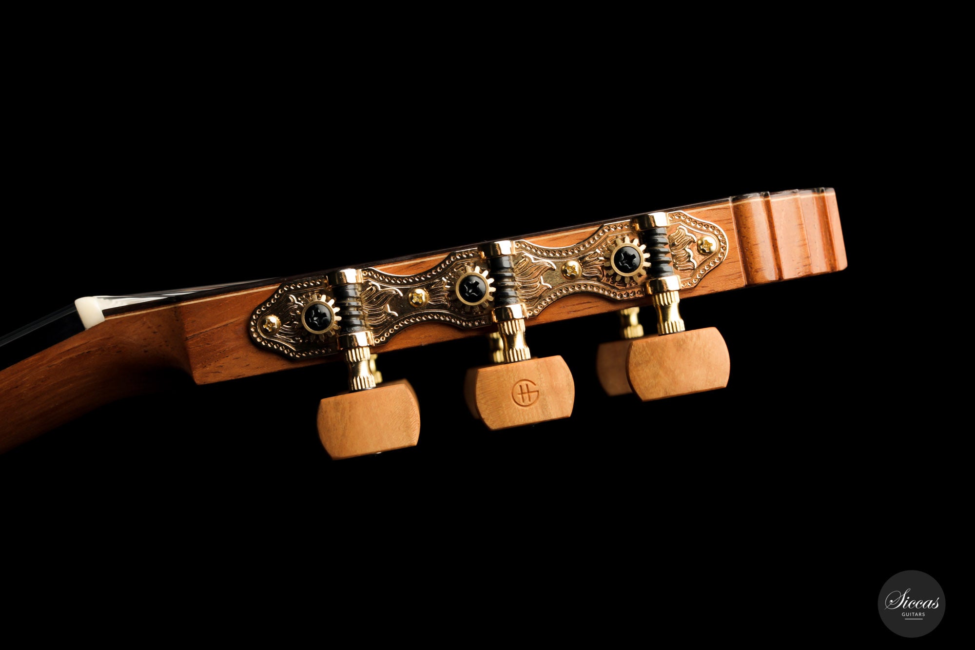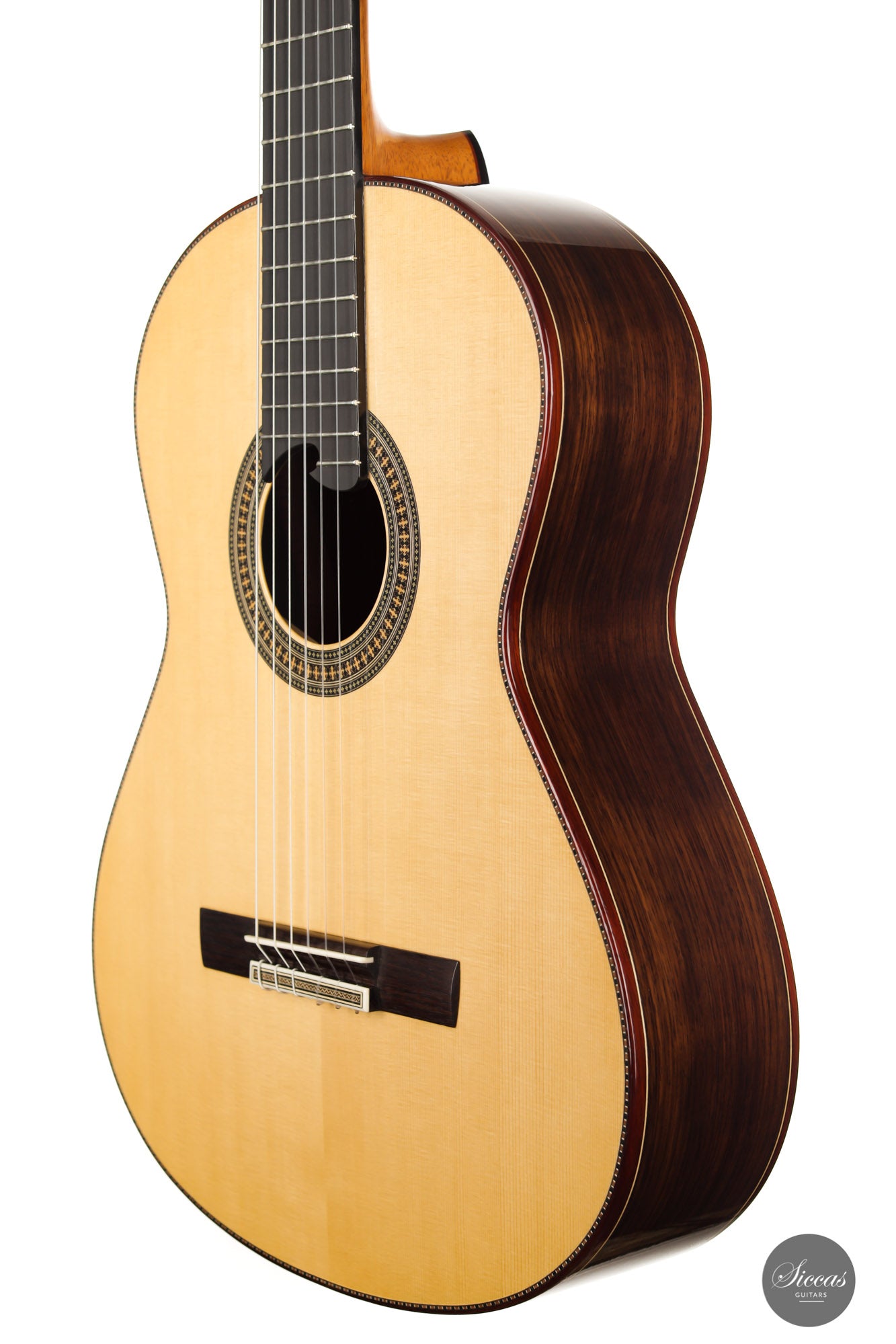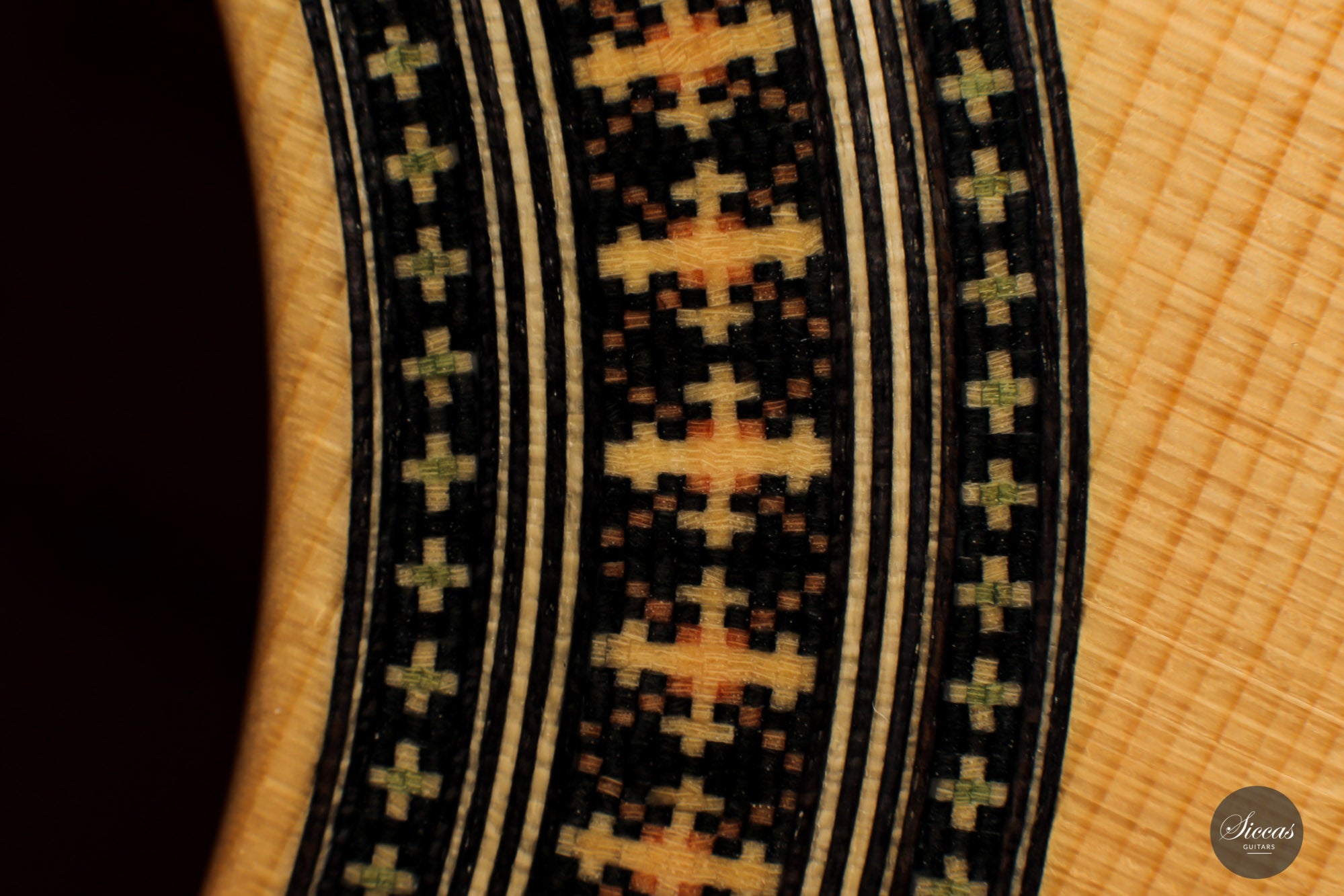 What an impressive volume for a traditionally built fan-braced guitar. The tone production feels similar to that of a grand piano, and each note develops with clarity, volume, and confidence. The voicing is very easy to define, and excellent tone separation combined with a reliable, well-balanced tone offers fantastic intelligibility in the polyphony. Finally, the future owner of this charming instrument will enjoy a top-notch left-hand comfort and refined chamber music playing experience thanks to the extra sound port on the side.