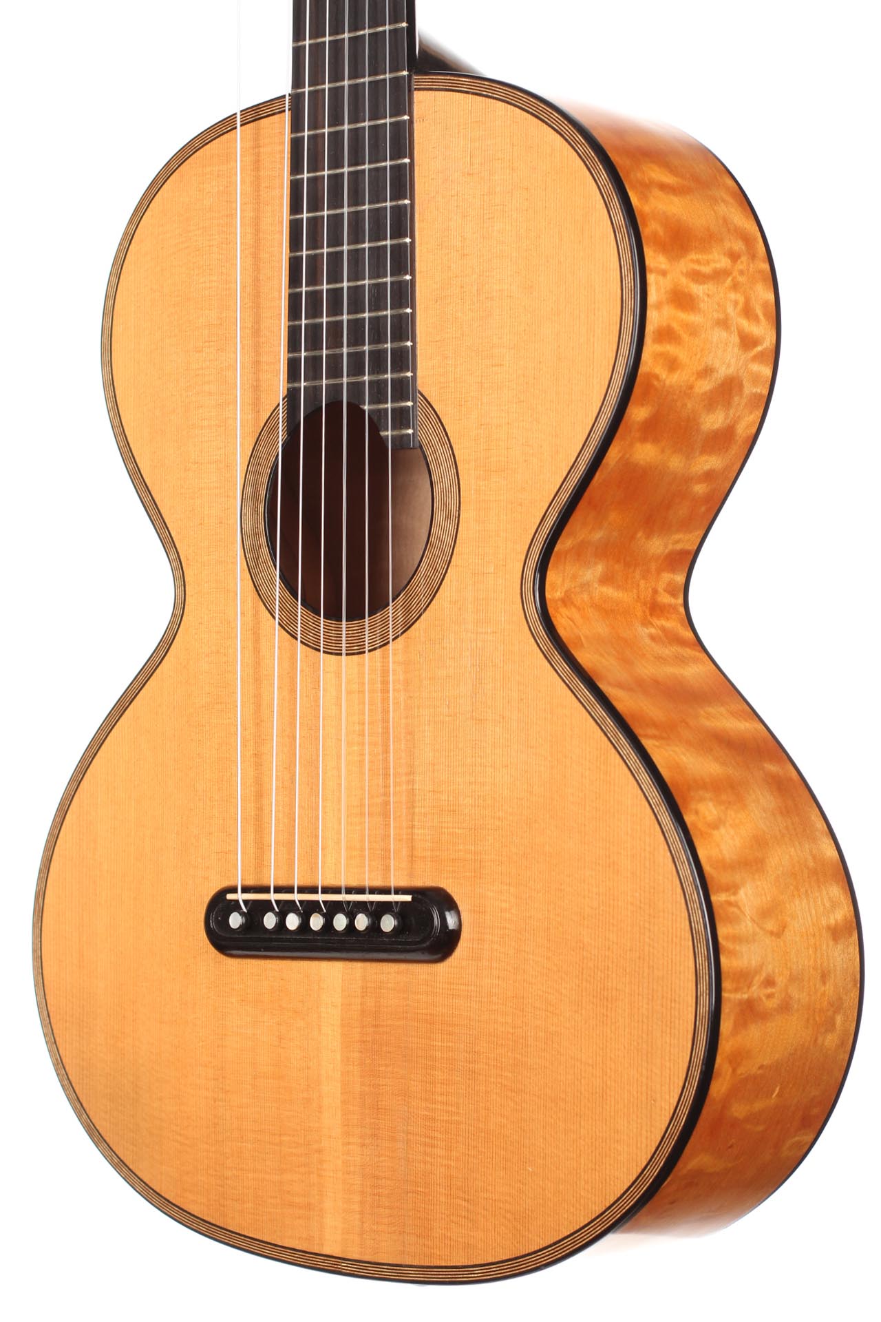 This 1988 guitar wearing the number 57 is based on a French 7-strings guitar. It has a beautiful spruce top and appealing flamed satinwood back and sides. The head is beautifully V joined and wears high quality Rodgers Baker style tuning machines. The top has a few perfectly fixed cracks - two below the bridge and one beside the fretboard. Sound wise, it is a great salon instrument. It is very balanced and the added seventh string not only extends the sound range, but also supports the mediums and trebles by sympathetically adding some more body and richness to the tone. A sublime instrument for seven strings romantic guitar aficionados.Included is the original case. This guitar is Cites free.