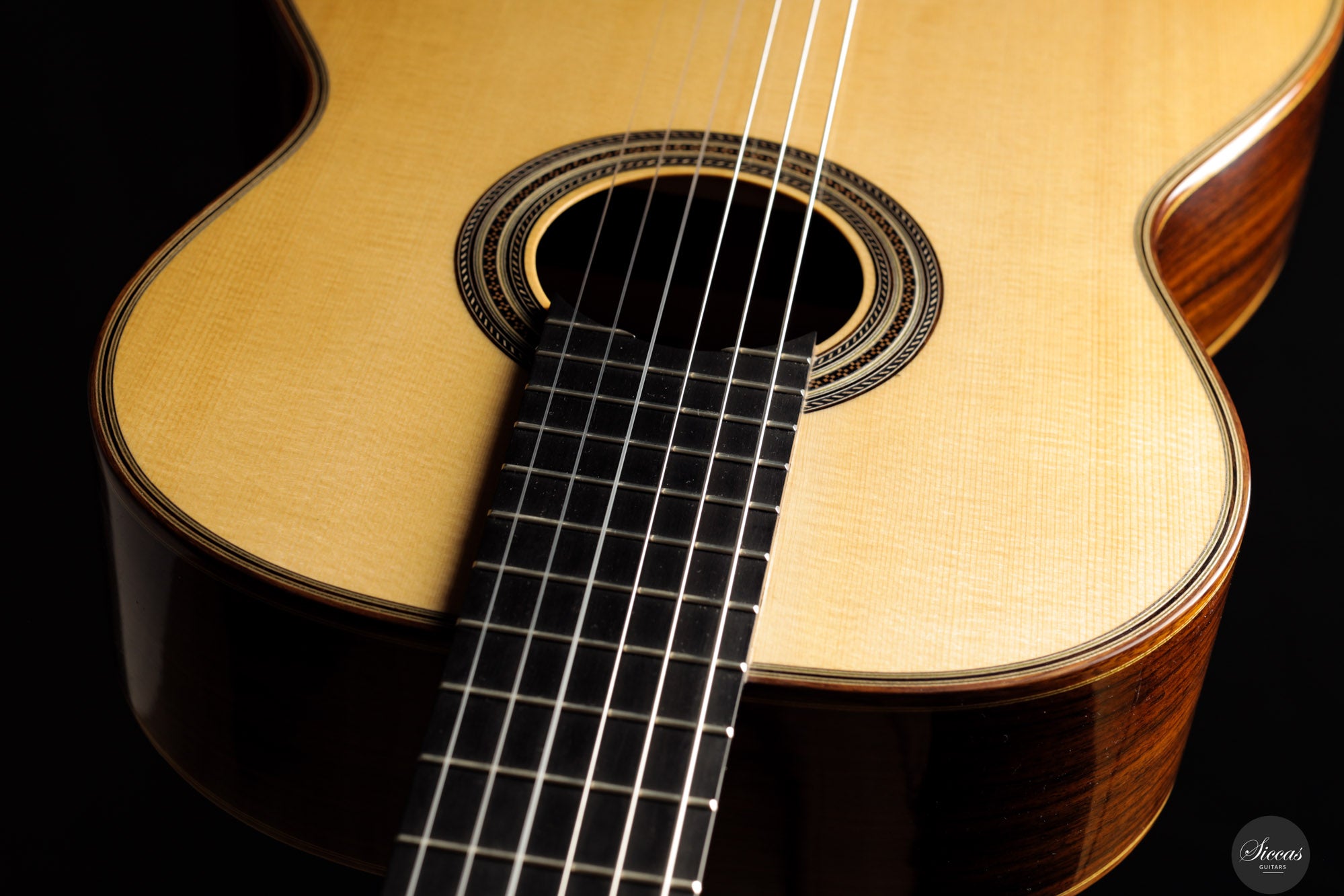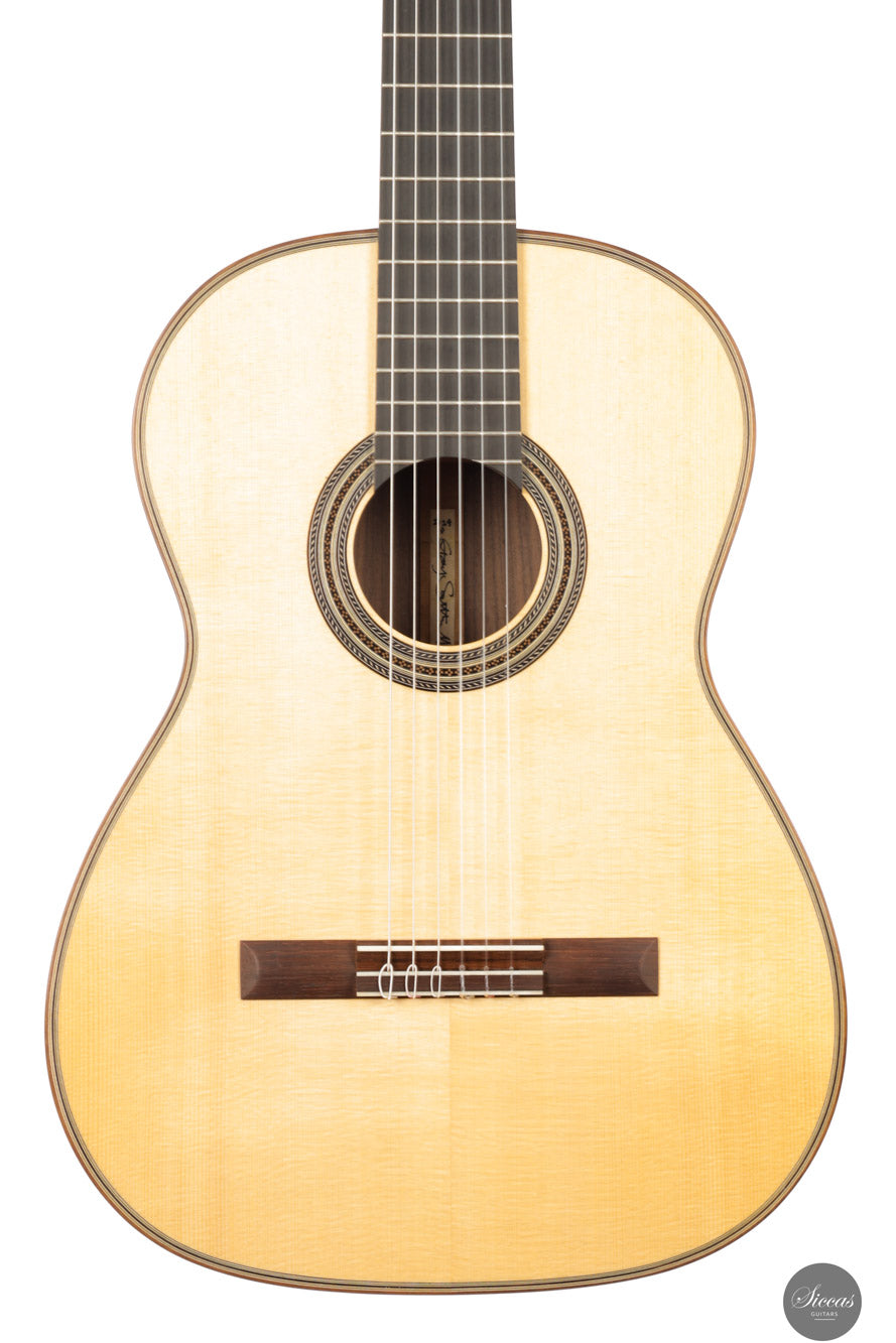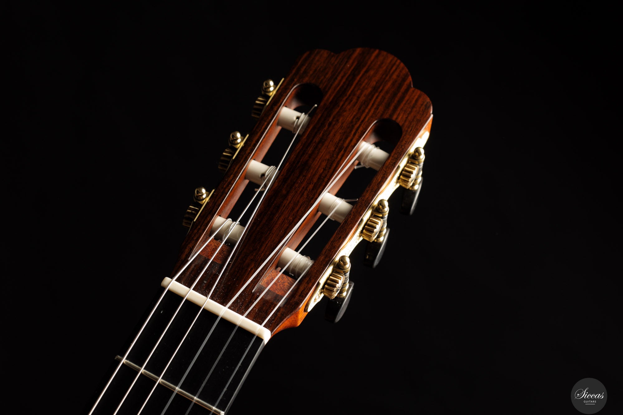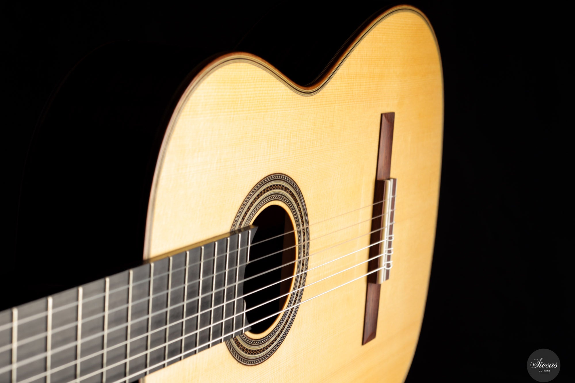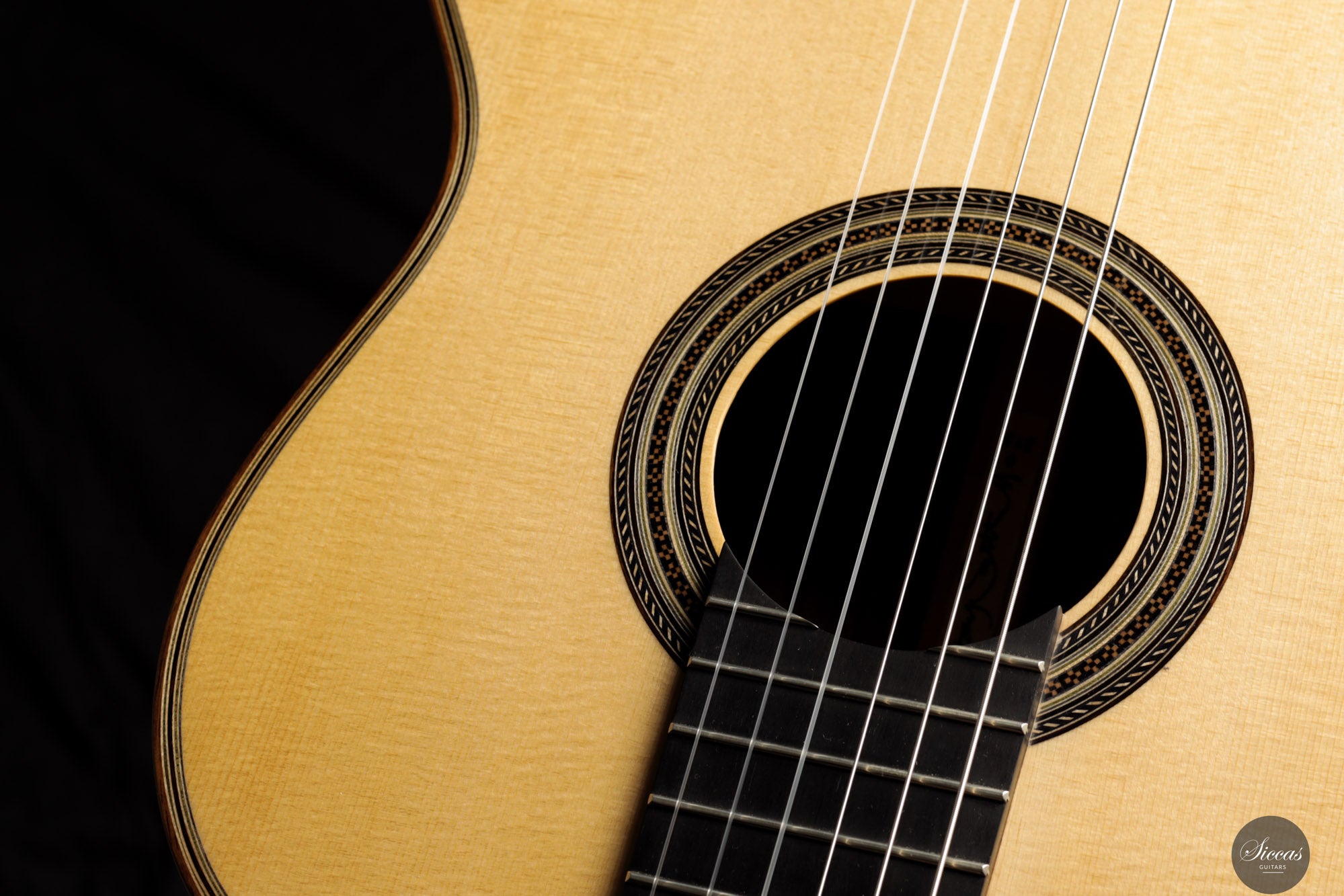Die Gitarre besticht durch ihre besonders leichte Bauweise, eine fein gearbeitete Fichtendecke sowie Boden und Zargen aus indischem Palisander. Dank der tiefen Korpusresonanz entfalten sich die Bässe mit bemerkenswerter Offenheit, ohne an Klarheit zu verlieren. Der Klang bleibt über das gesamte Griffbrett hinweg präzise und kontrolliert.