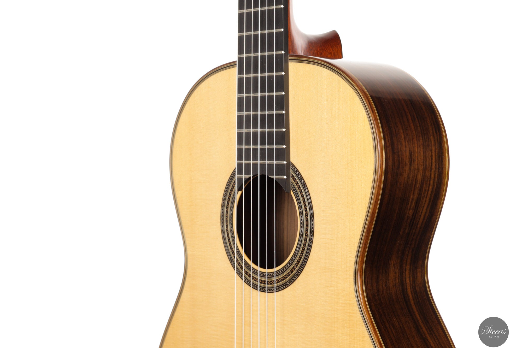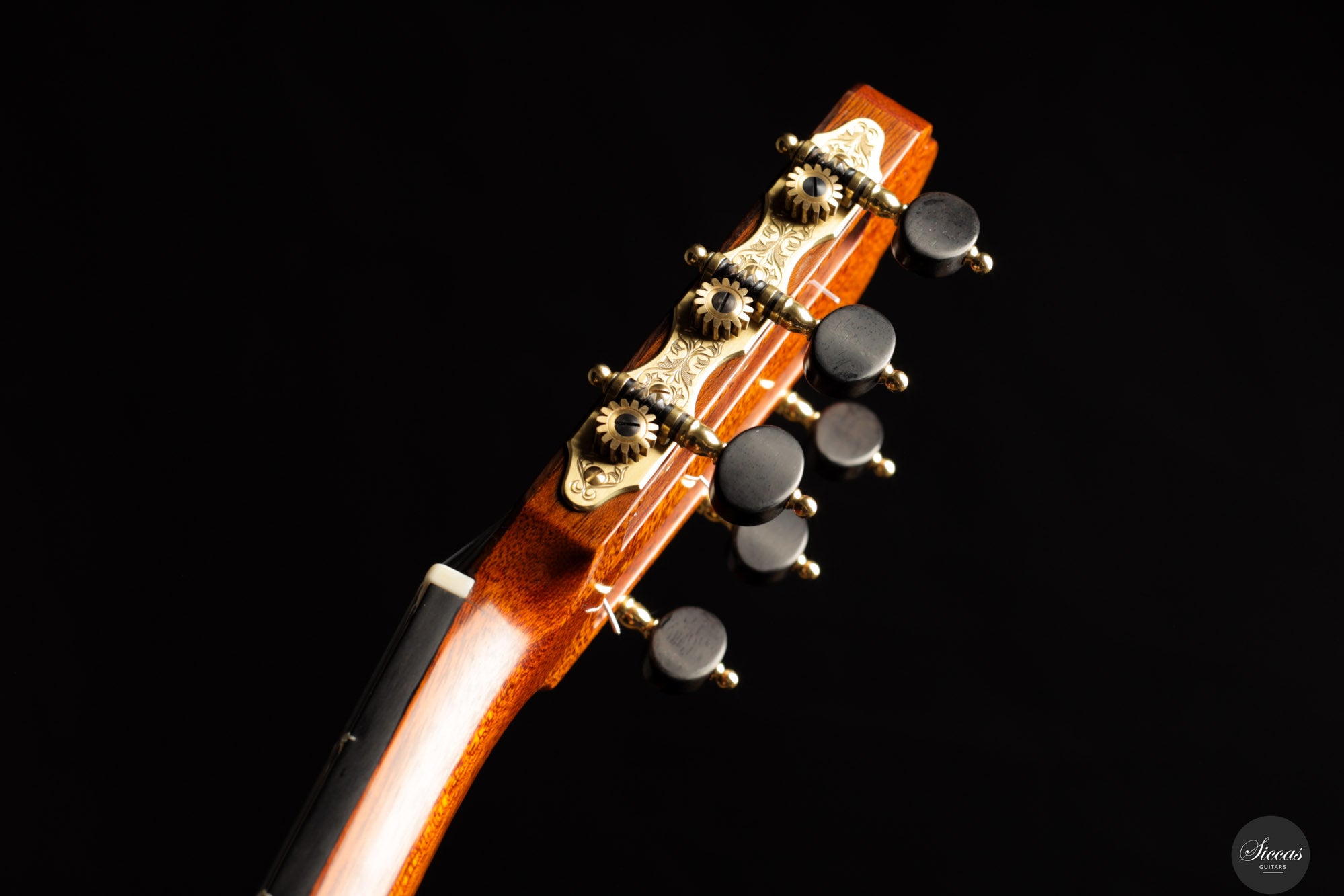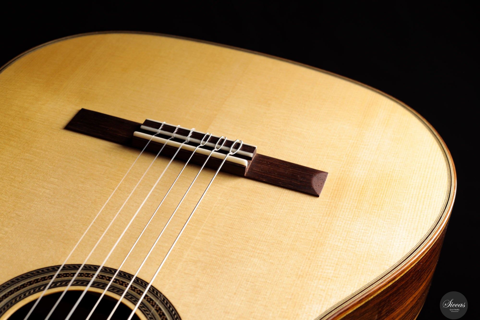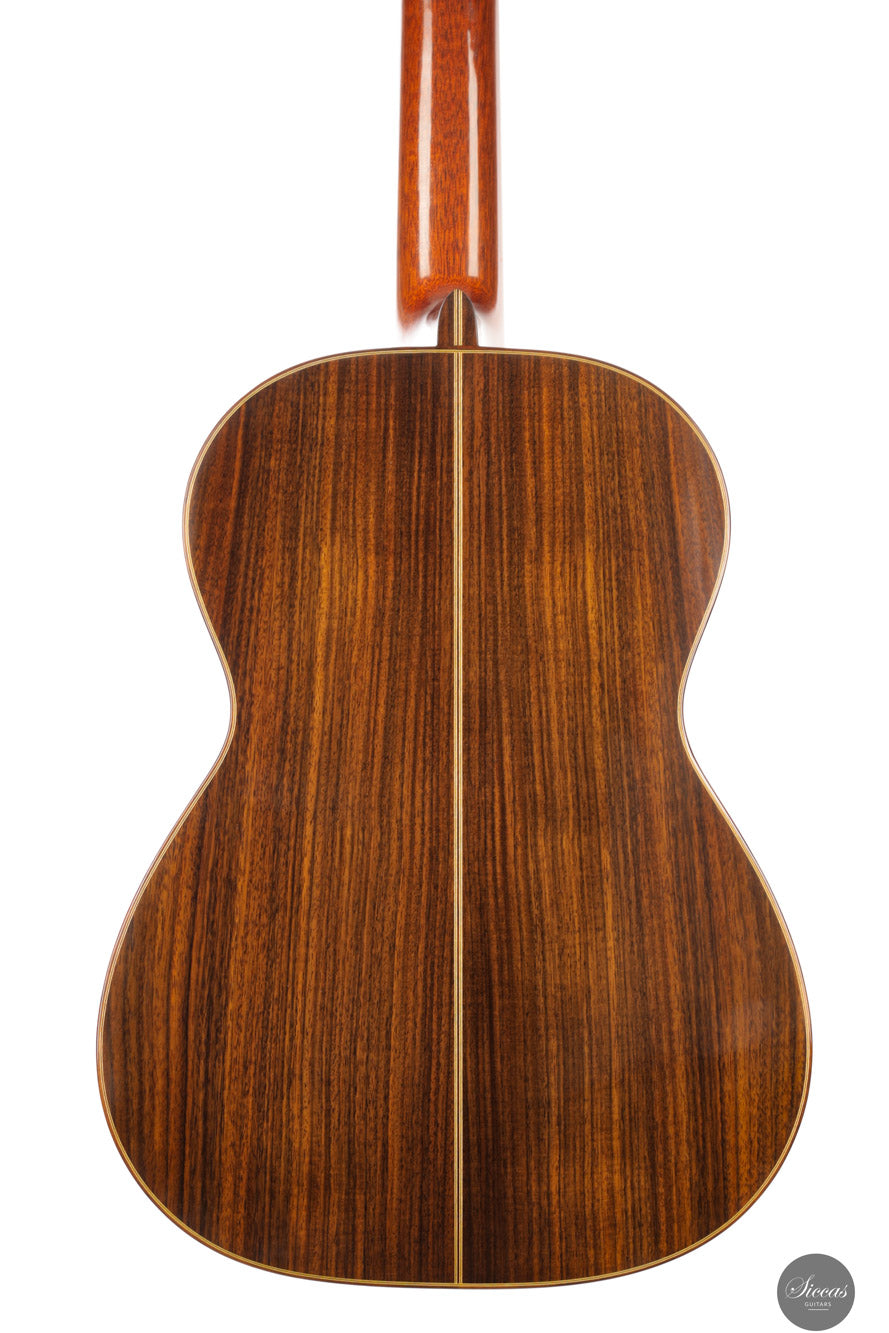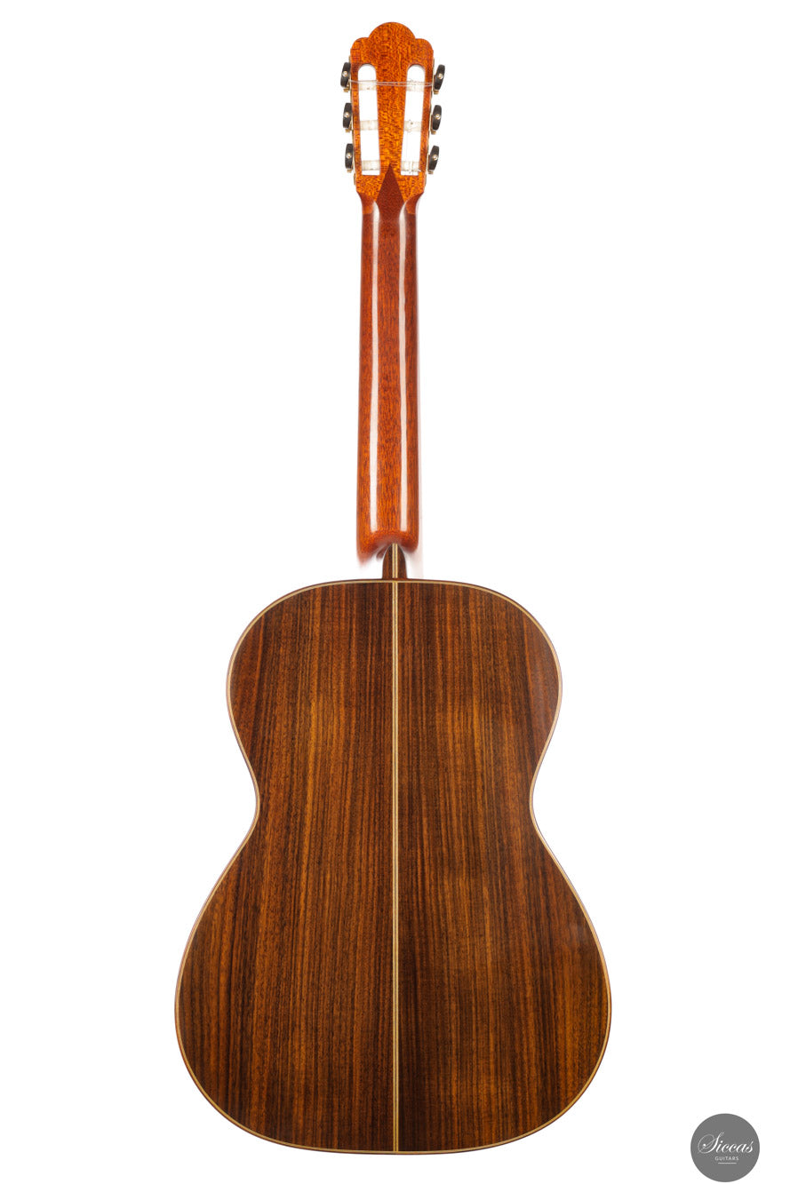 Die Gitarre besticht durch ihre besonders leichte Bauweise, eine fein gearbeitete Fichtendecke sowie Boden und Zargen aus indischem Palisander. Dank der tiefen Korpusresonanz entfalten sich die Bässe mit bemerkenswerter Offenheit, ohne an Klarheit zu verlieren. Der Klang bleibt über das gesamte Griffbrett hinweg präzise und kontrolliert.
