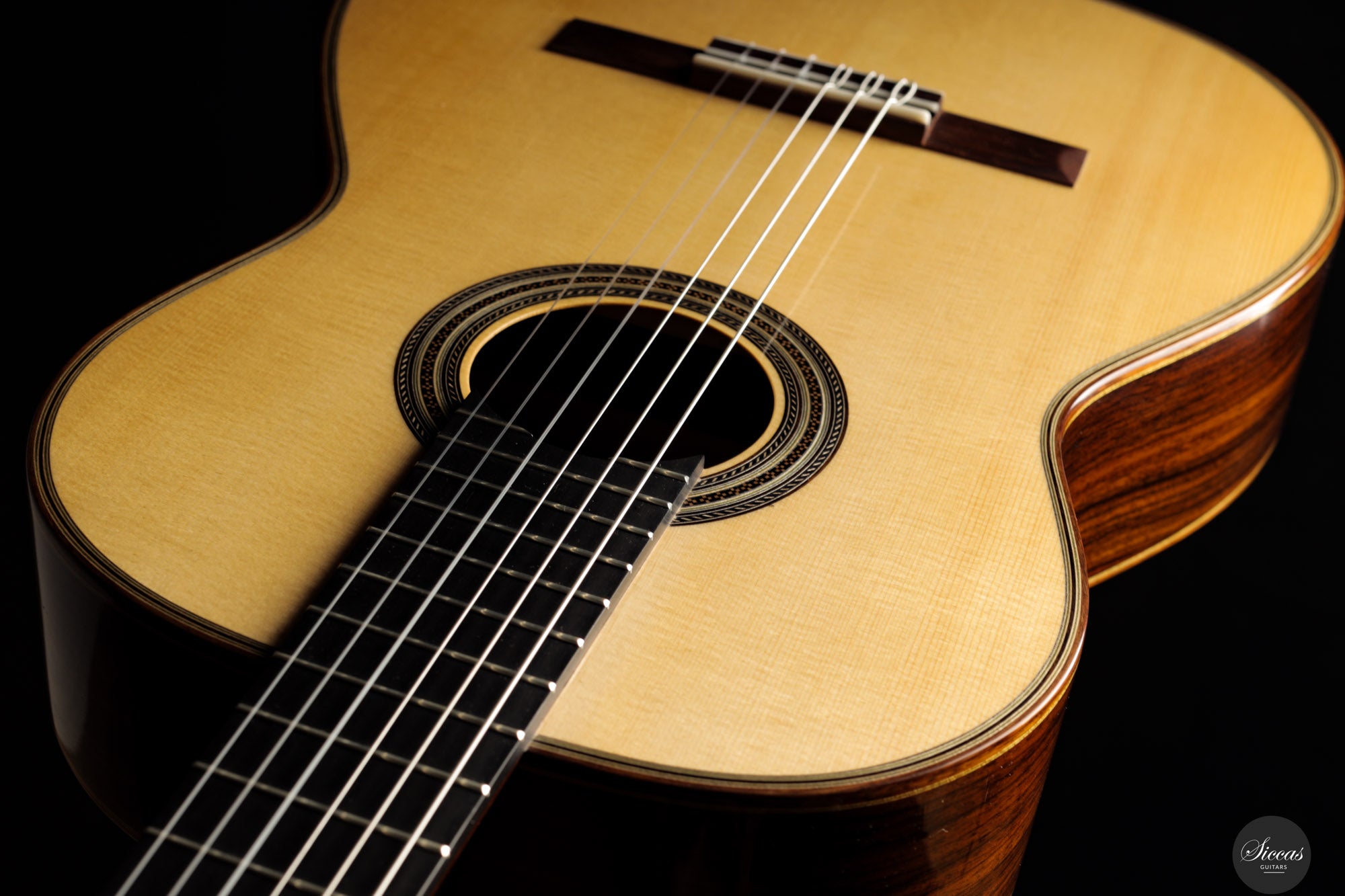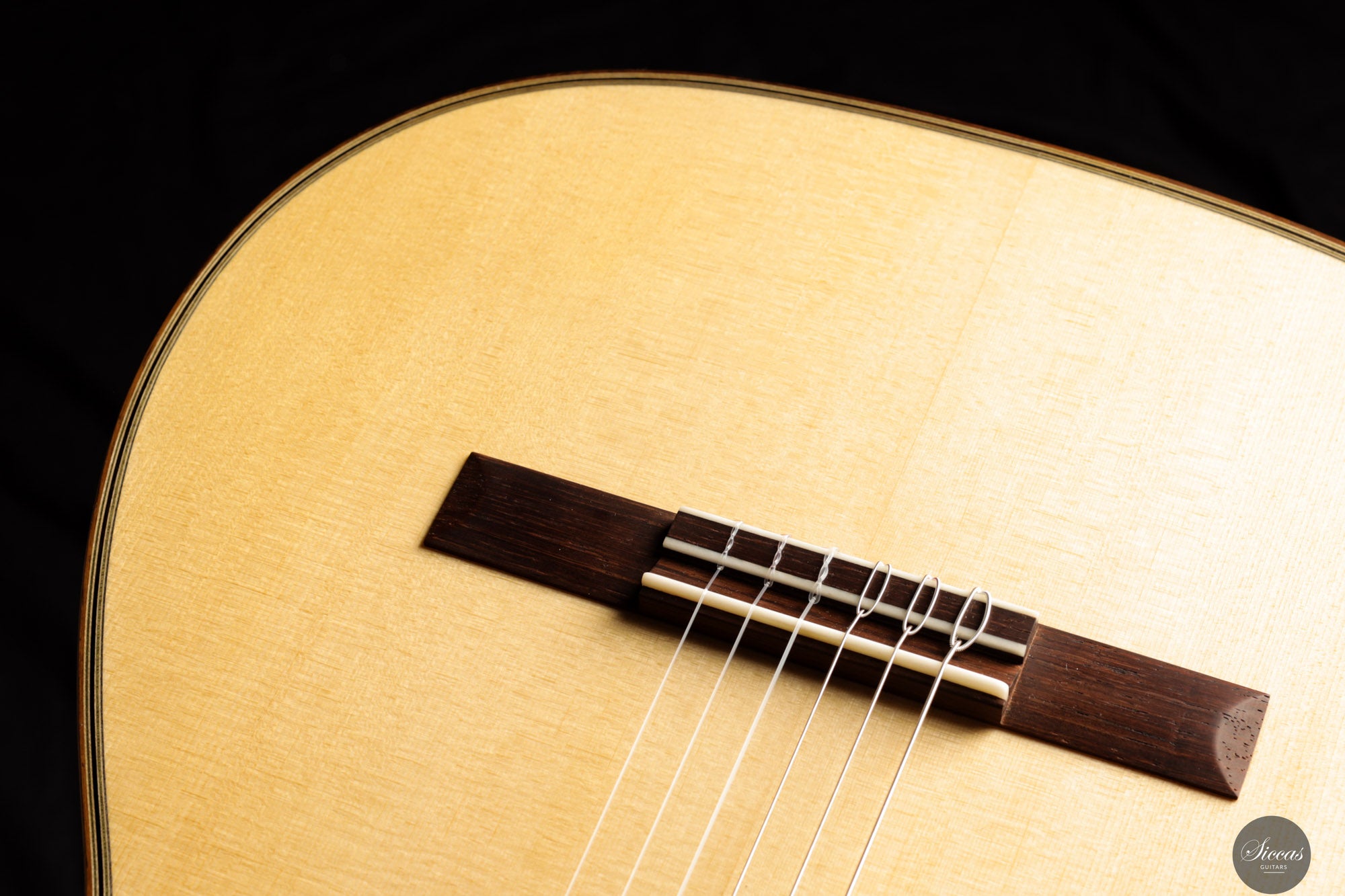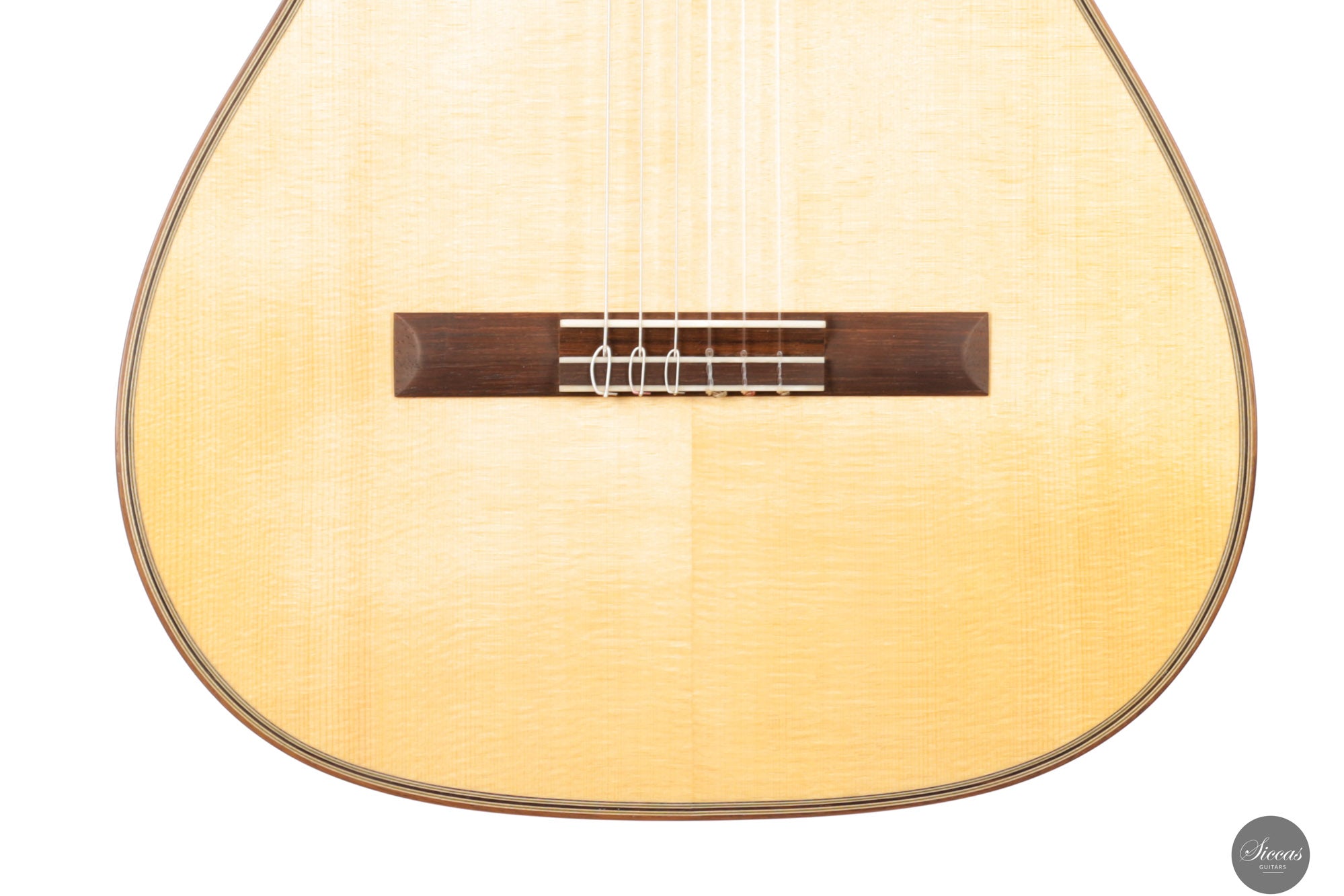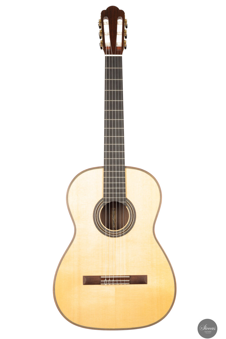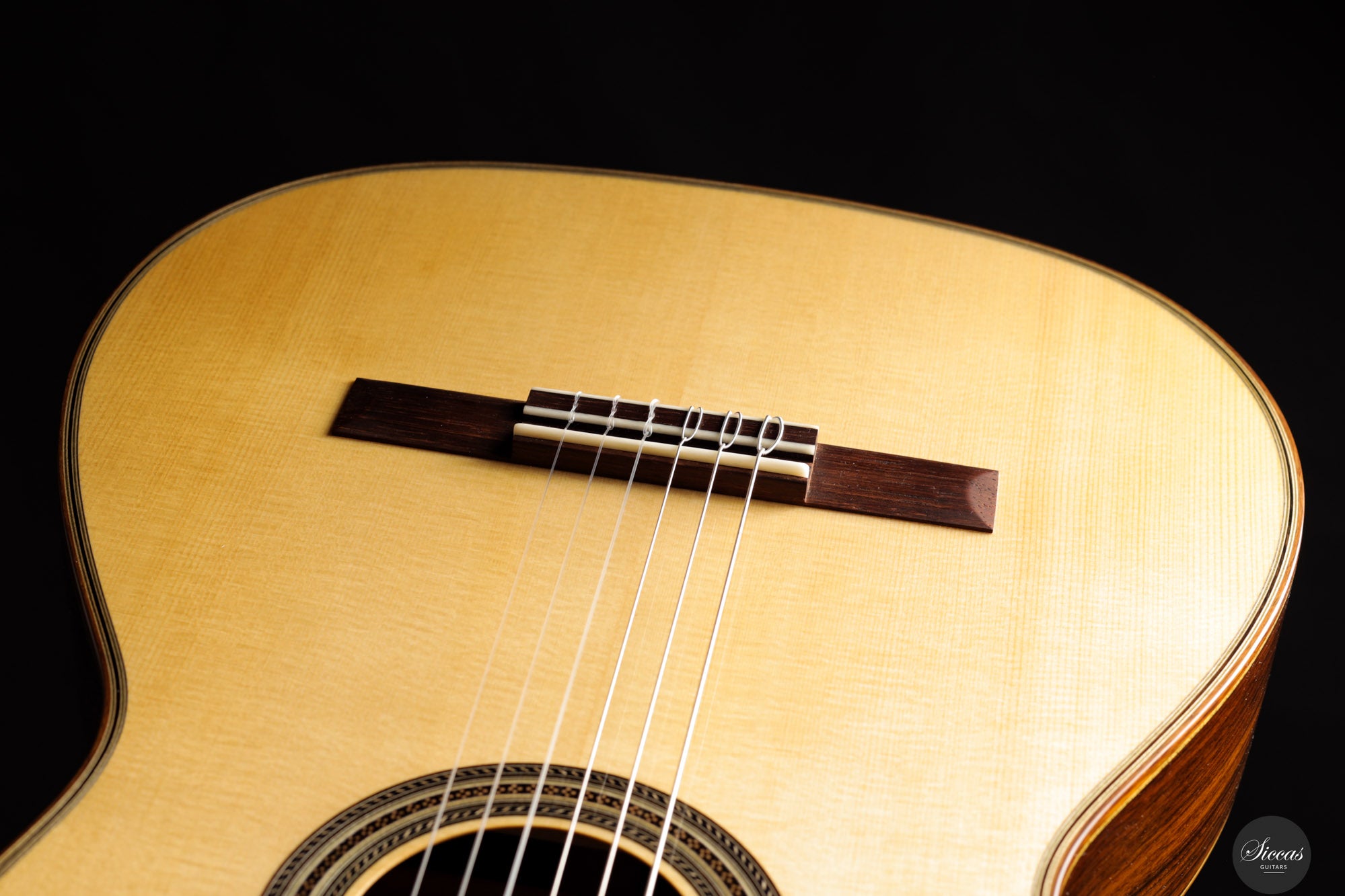 Die Gitarre besticht durch ihre besonders leichte Bauweise, eine fein gearbeitete Fichtendecke sowie Boden und Zargen aus indischem Palisander. Dank der tiefen Korpusresonanz entfalten sich die Bässe mit bemerkenswerter Offenheit, ohne an Klarheit zu verlieren. Der Klang bleibt über das gesamte Griffbrett hinweg präzise und kontrolliert.