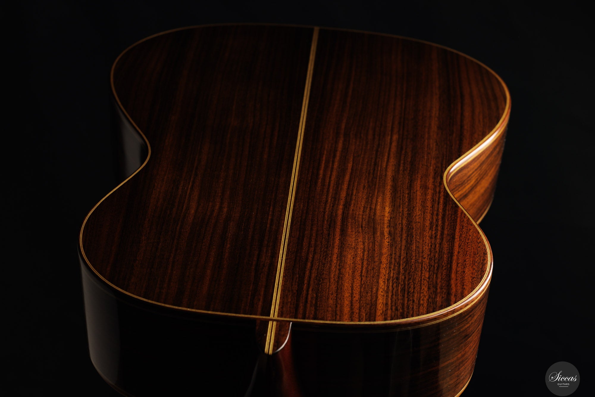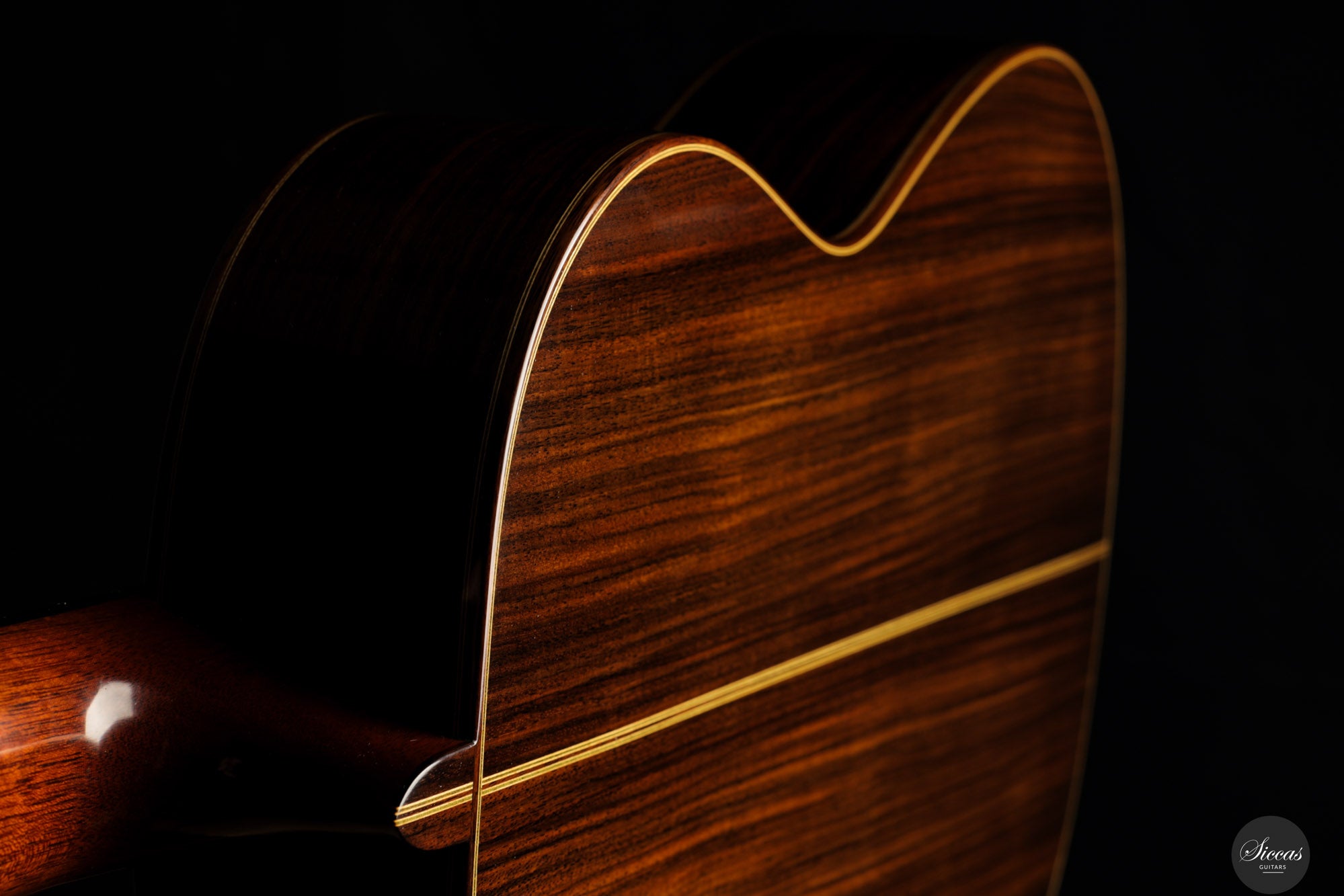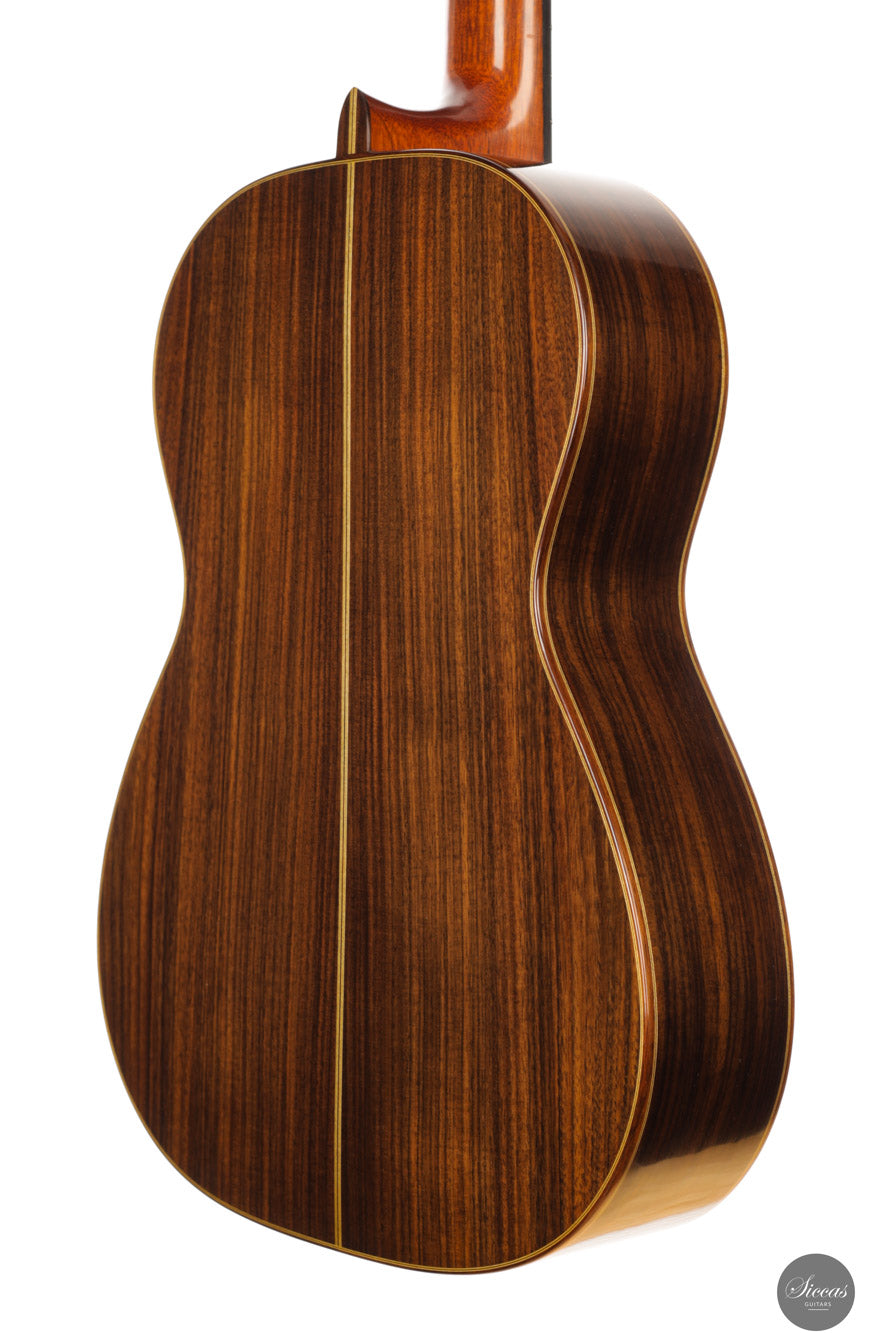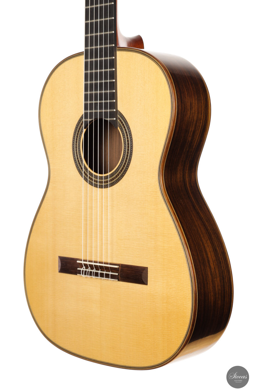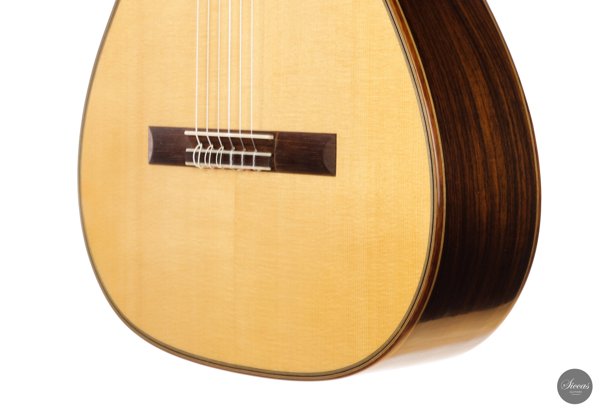 Die Gitarre besticht durch ihre besonders leichte Bauweise, eine fein gearbeitete Fichtendecke sowie Boden und Zargen aus indischem Palisander. Dank der tiefen Korpusresonanz entfalten sich die Bässe mit bemerkenswerter Offenheit, ohne an Klarheit zu verlieren. Der Klang bleibt über das gesamte Griffbrett hinweg präzise und kontrolliert.