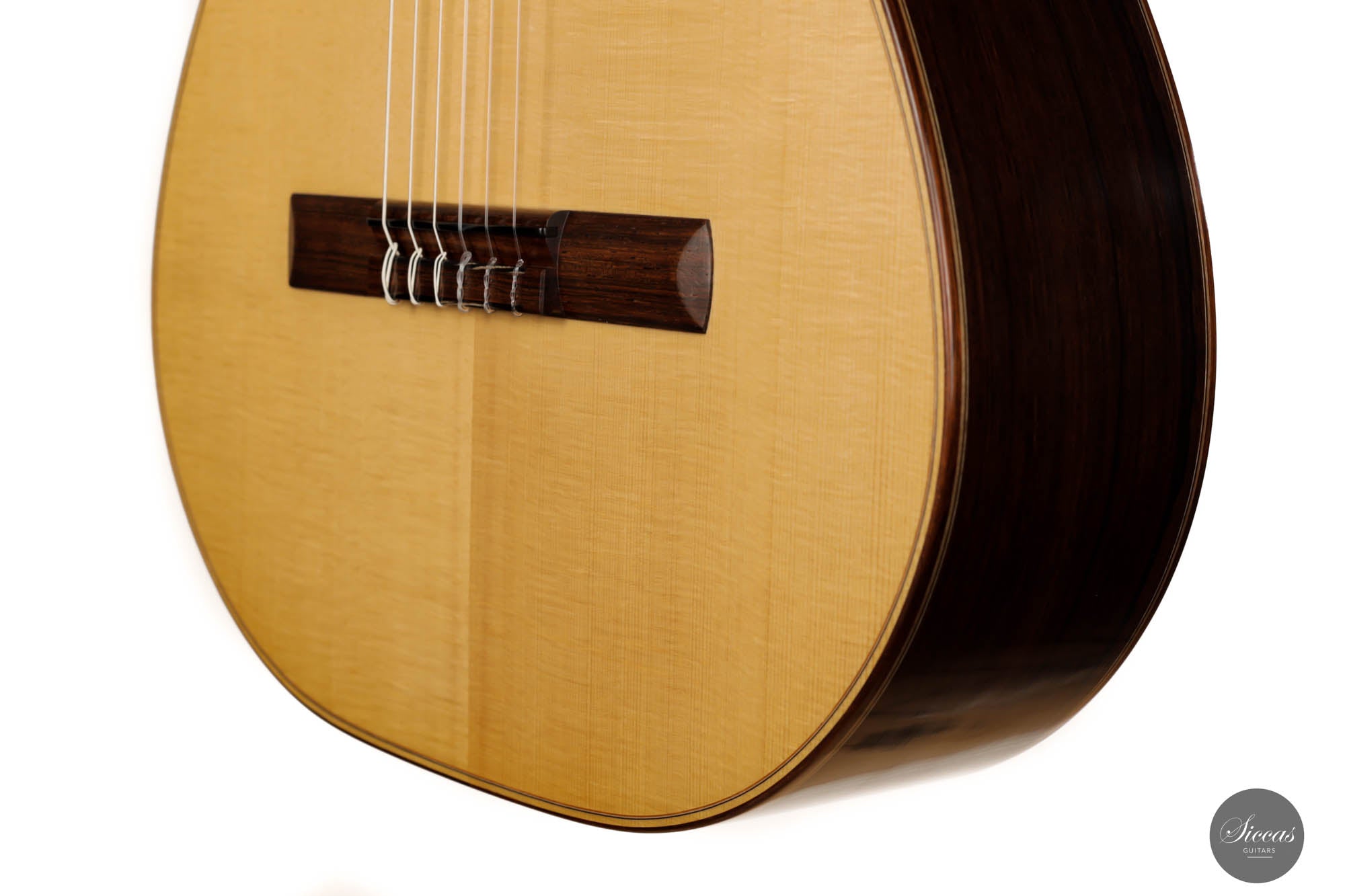 This beautiful brand-new guitar from a young and talented guitar maker has stunned us since the first time we opened the case. The amount of effort spent on making this guitar is just astonishing. Every little detail was done to the highest level of precision; for example, the carved rosette was done entirely by hand. It shows Genta's talent as a fantastic craftsman. The spruce soundboard has four fan bracing systems underneath and striking cocobolo back and sides. Furthermore, it was assembled using the traditional Spanish method. The crystal-clear trebles and lively basses reveal various views and expressions as the guitar is played.
