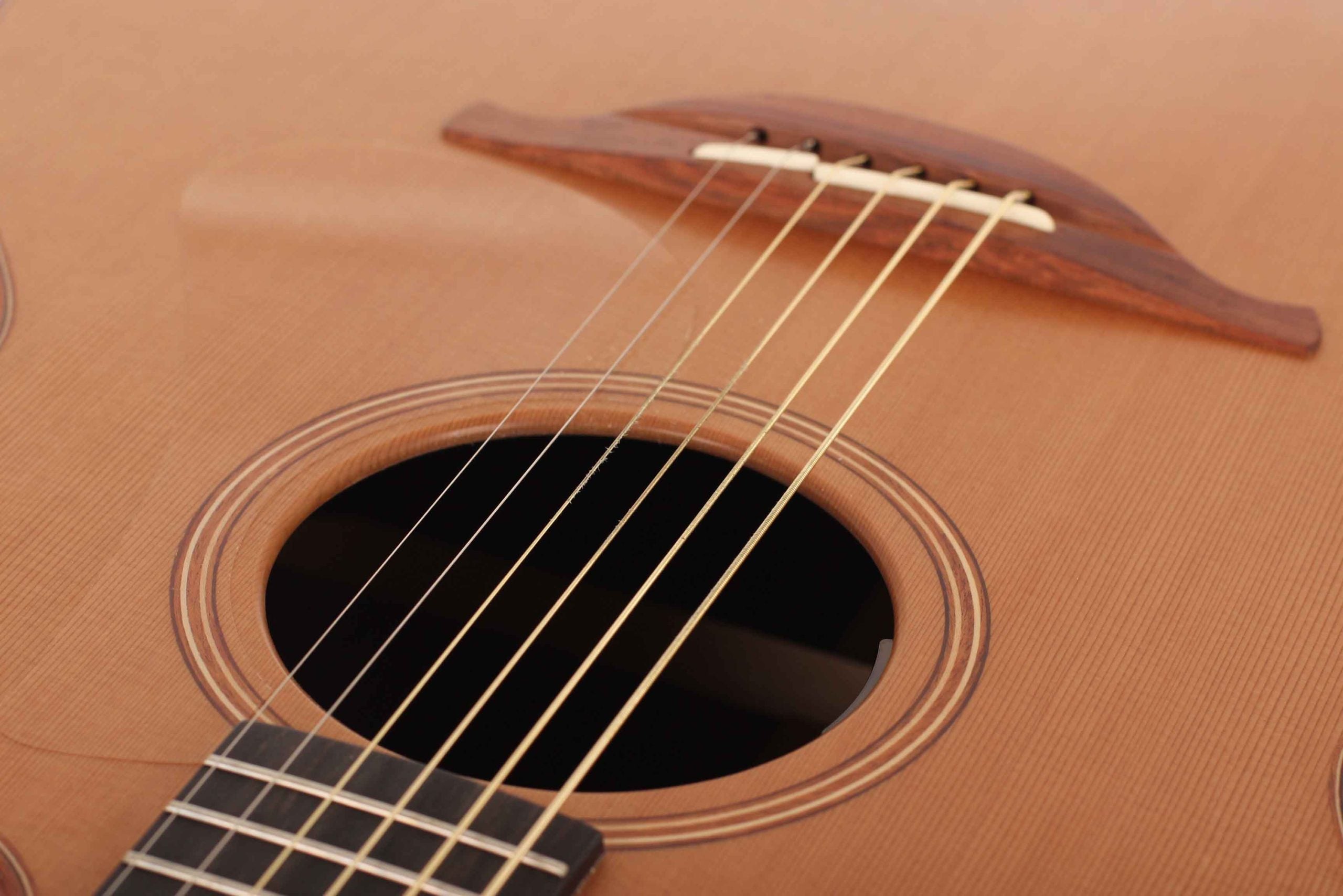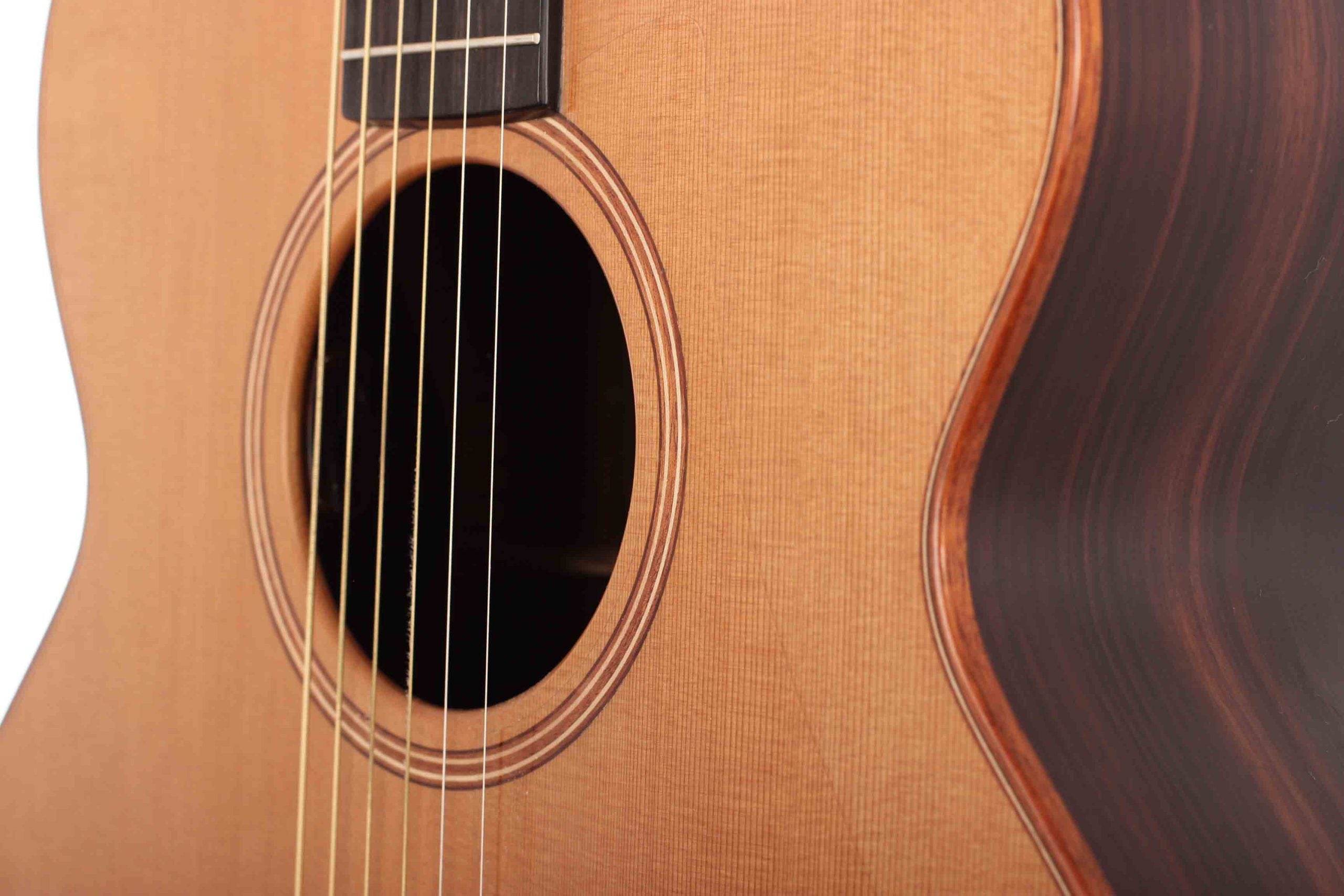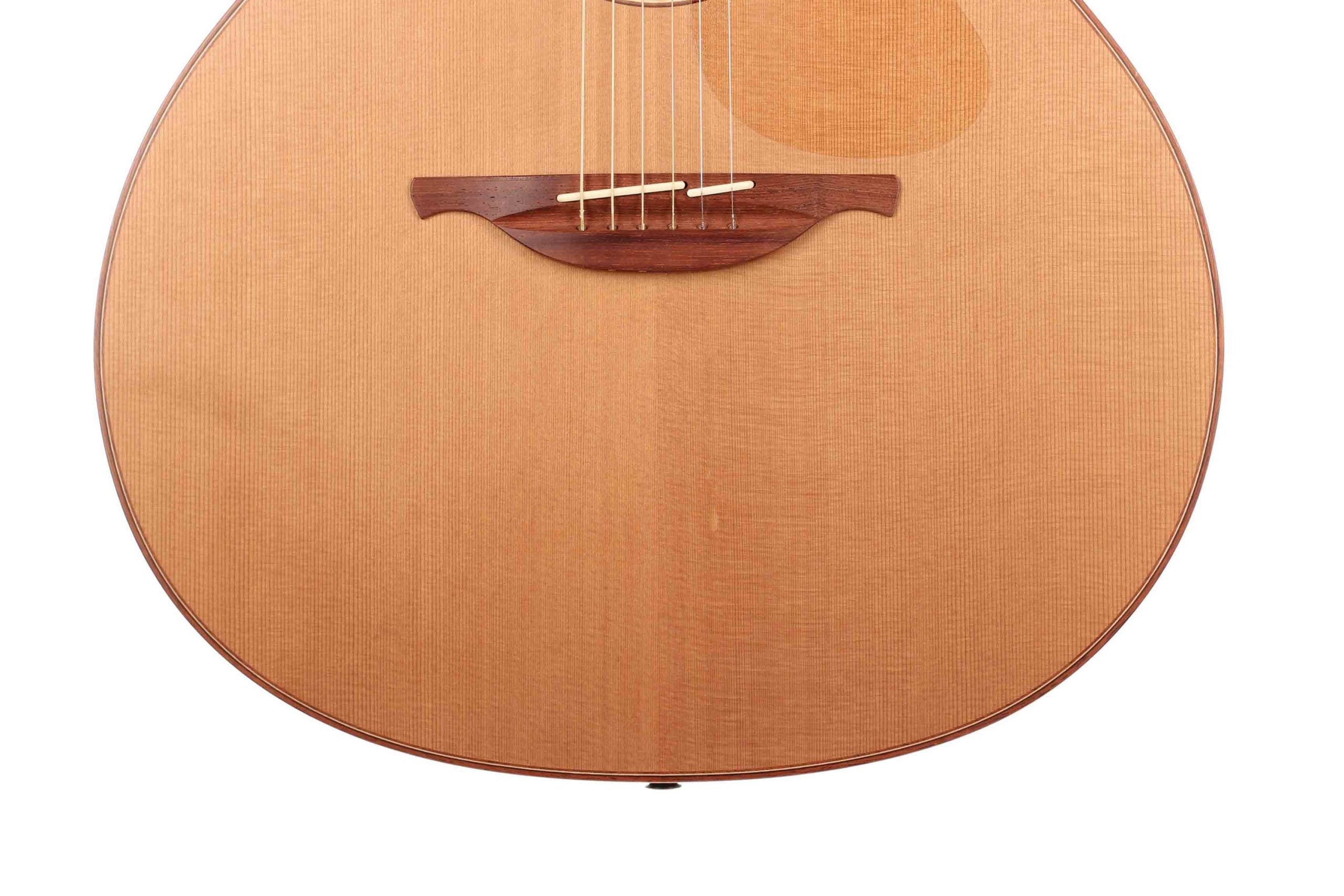 This model from 2013 is a real pleasure to play. It has a strong, taut, and brilliant sound which evolves like a carpet, being especially perfect for folk and country flat picking and strumming. The cutaway provides comfortable use of the higher frets. Beside a little ding on the top and minor signs of usage it is in excellent overall condition. It is equipped with an L. R. Baggs Lyrics pick up, which transports the guitar's actual voice to a live audience for a very realistic and inspiring sound. An original Hiscox case is included.