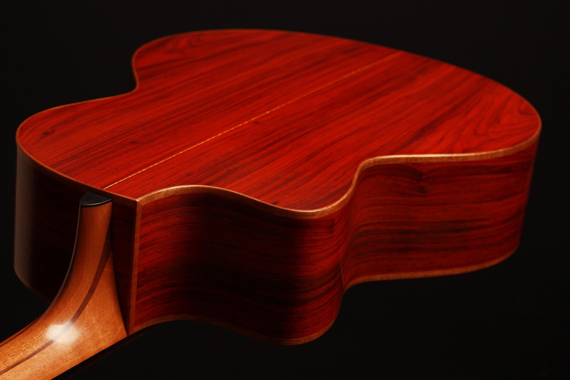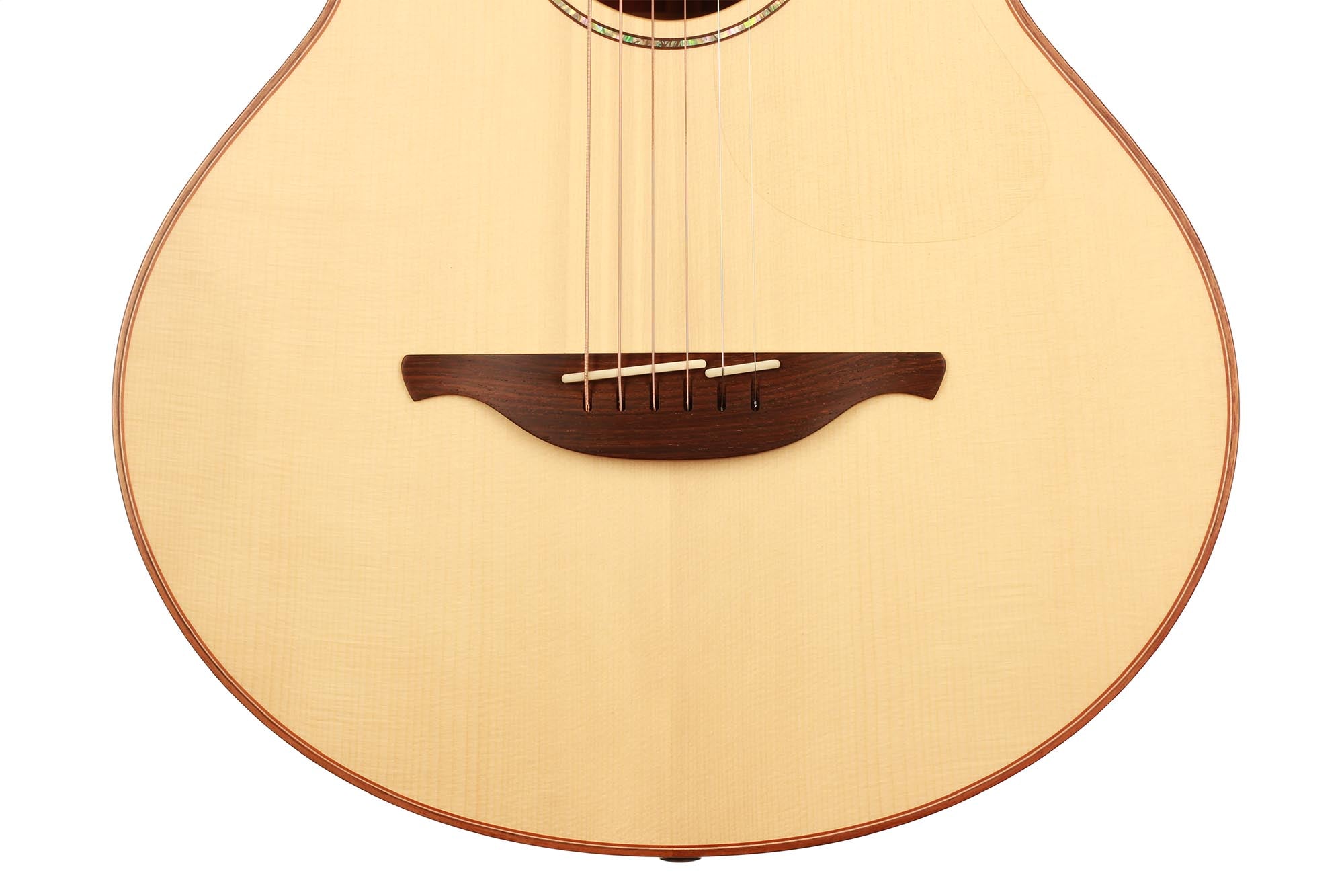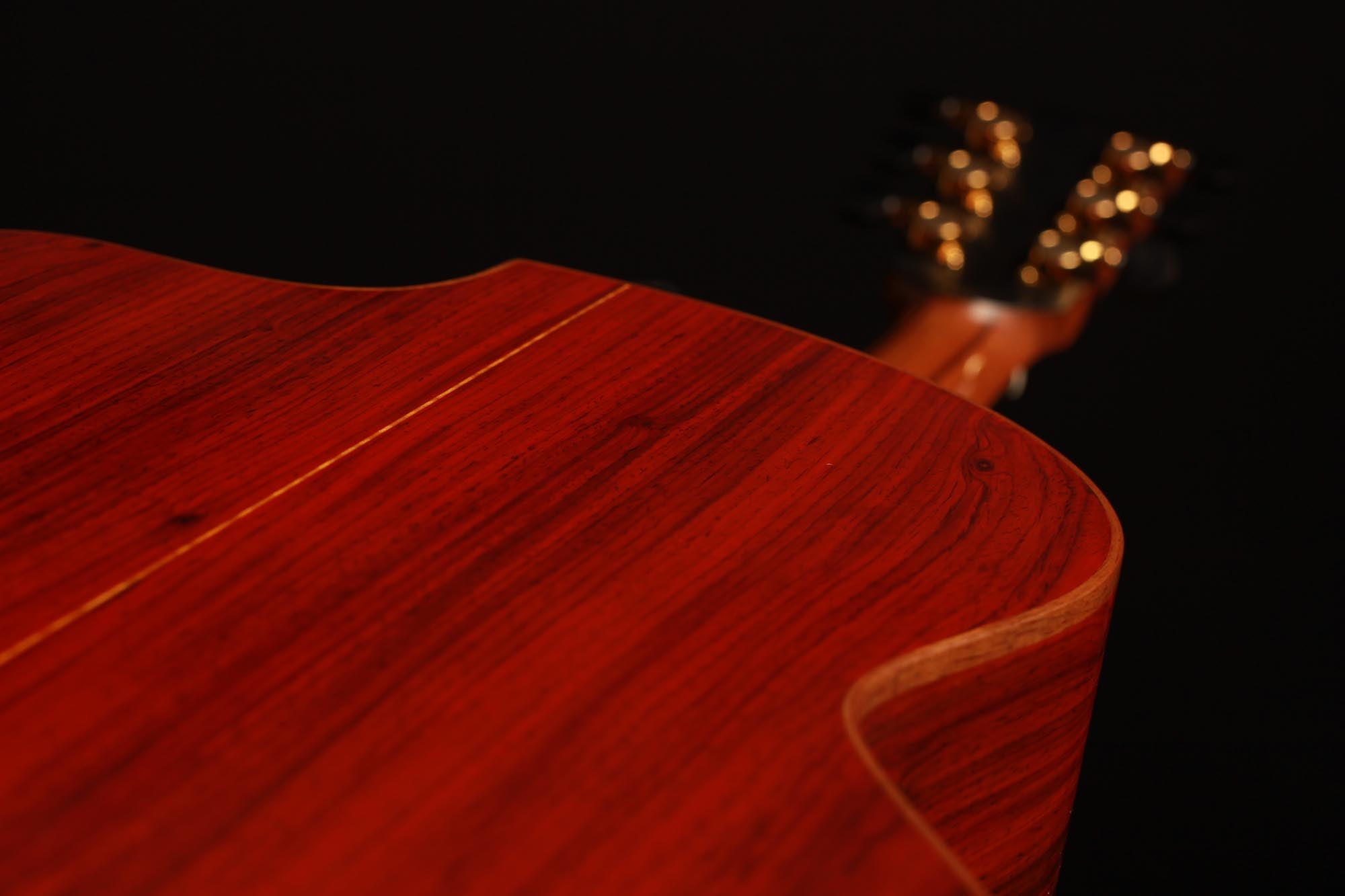 The 12 Fret model is based on the S size body. Whilst the scale length (630mm) remains the same as the regular 14 fret S model, the bridge has been relocated and the soundbox uniquely voiced to create a guitar that offers something different to anything else in the Lowden range. The location of the bridge on the soundboard increases the guitars midrange punch and despite its more compact feel, the 12 Fret offers projection and vibrancy more akin to a guitar with a much larger body.