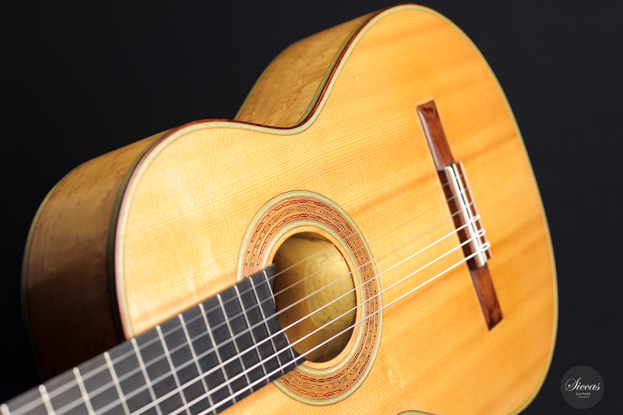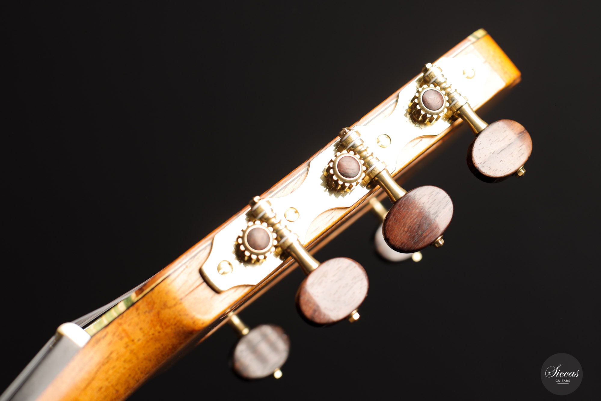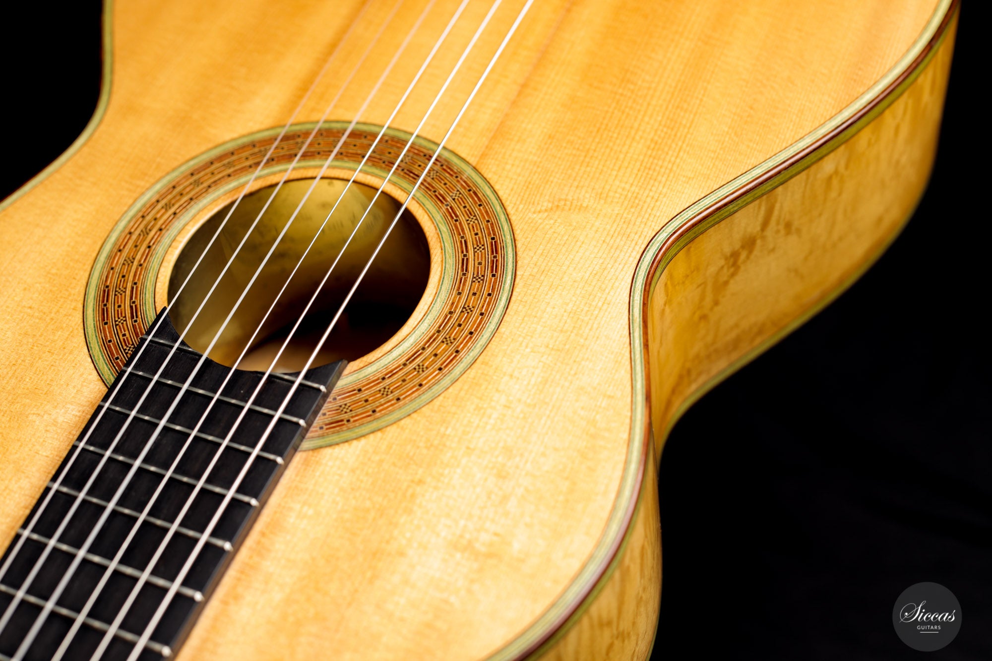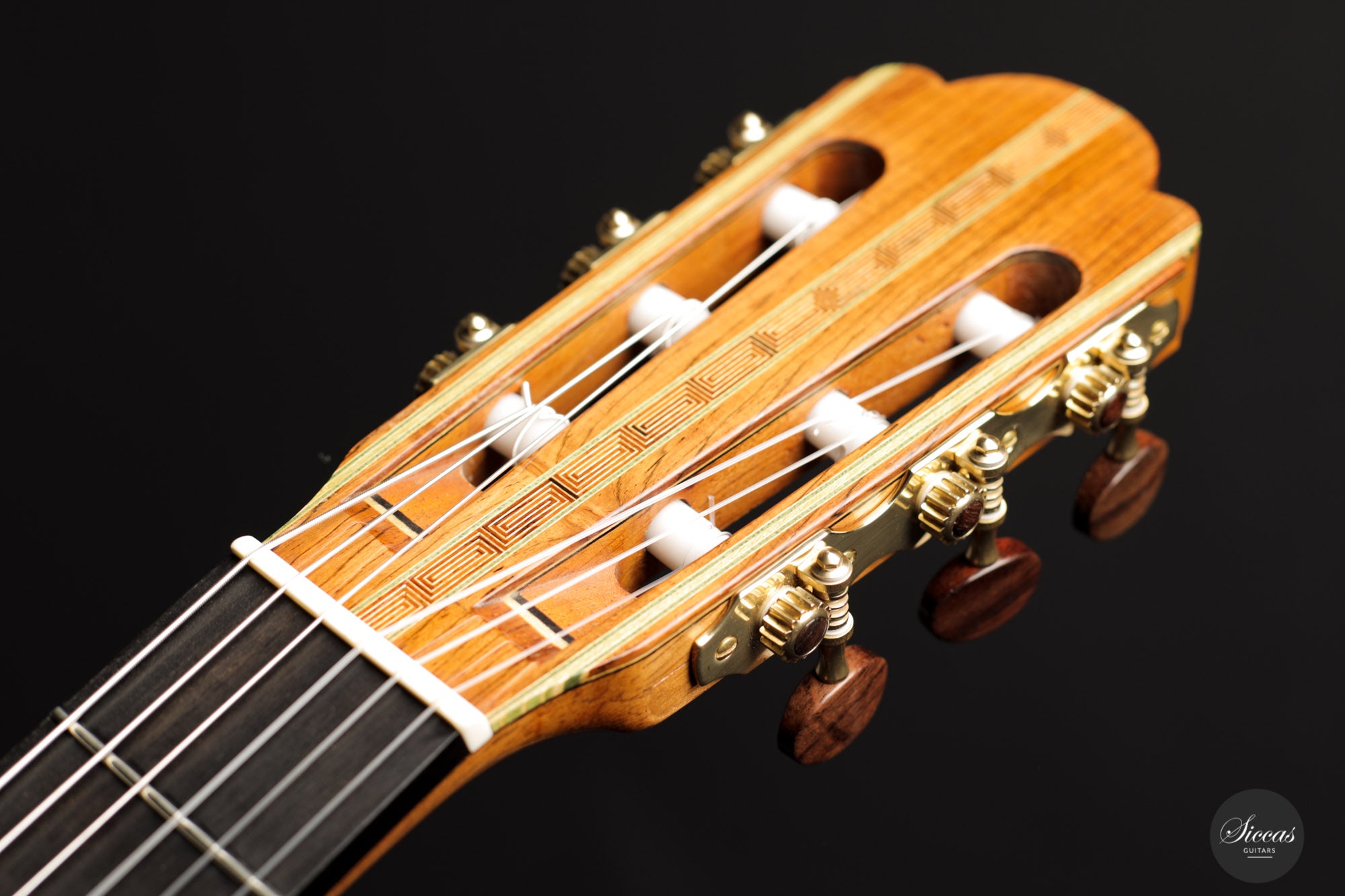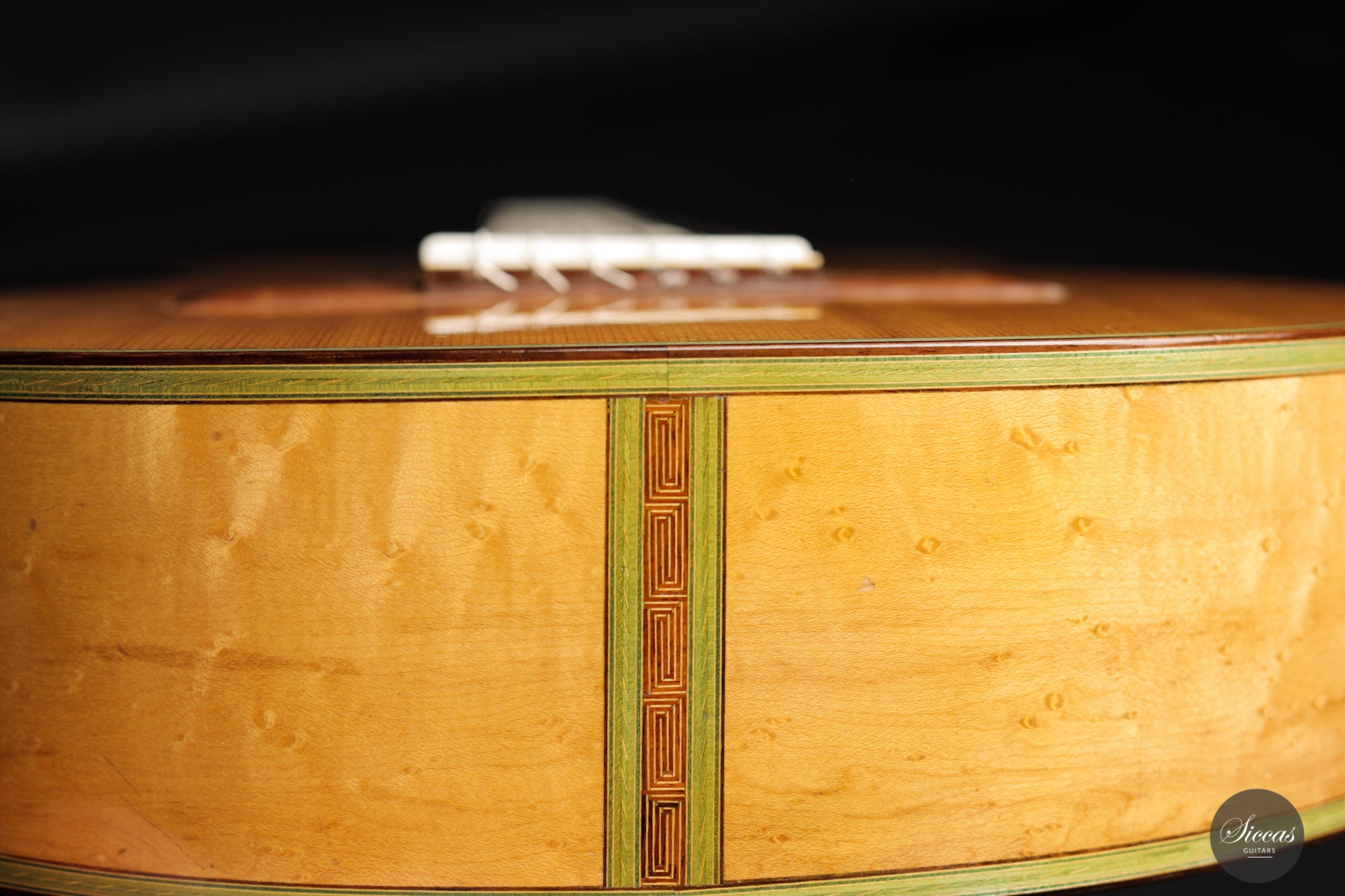Diese schöne Gitarre ist eine Nachbildung der ersten Antonio de Torres-Gitarre von Francisco Tarrega. Das Originalinstrument von 1864, das im Katalog von J. L. Romanillos als "FE17" bezeichnet wird, ist reich verziert und weist die meisten der von A. de Torres im Laufe seiner Karriere verwendeten dekorativen Motive auf. Man kann zum Beispiel den Mäander (ein griechisches orthogonales Ornament), zarte grüne und weiße Fischgräten, das Schachbrettmuster und die Raute erkennen. Dieses Instrument von Gerhard Oldiges aus dem Jahr 1997 befindet sich in einem ausgezeichneten Zustand, ohne Risse oder Reparaturen und fast ohne Spielspuren auf dem Schellack.