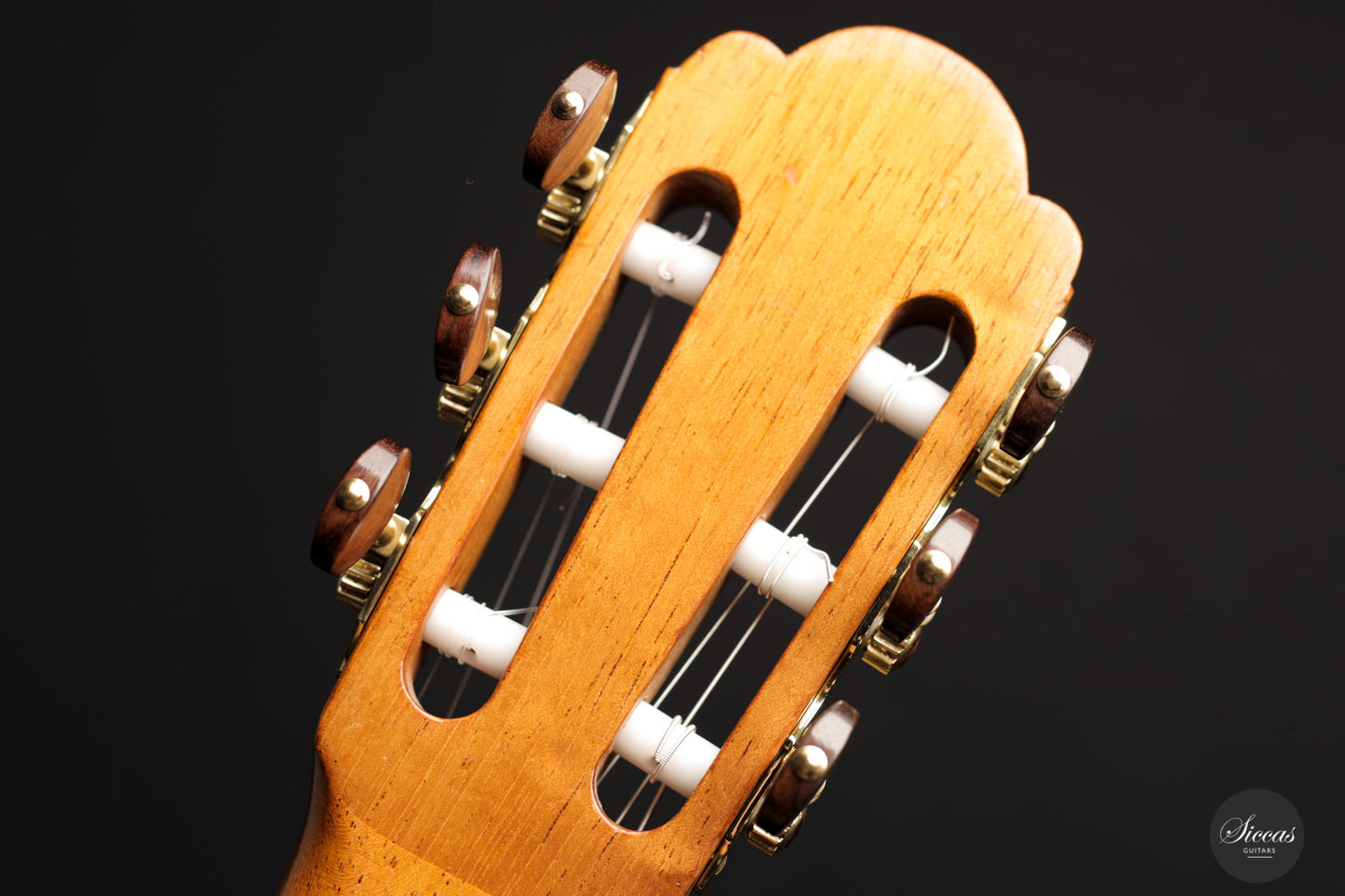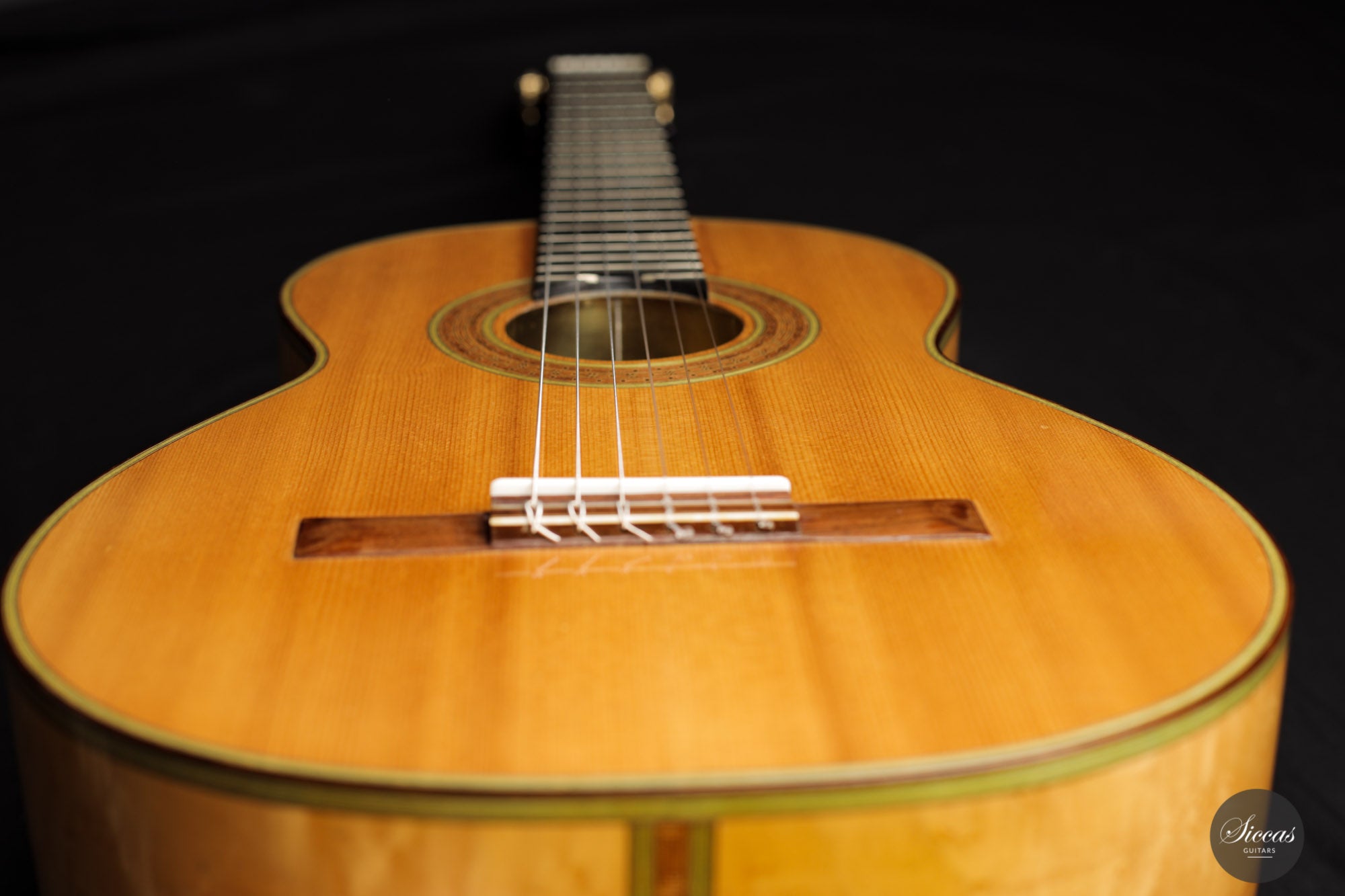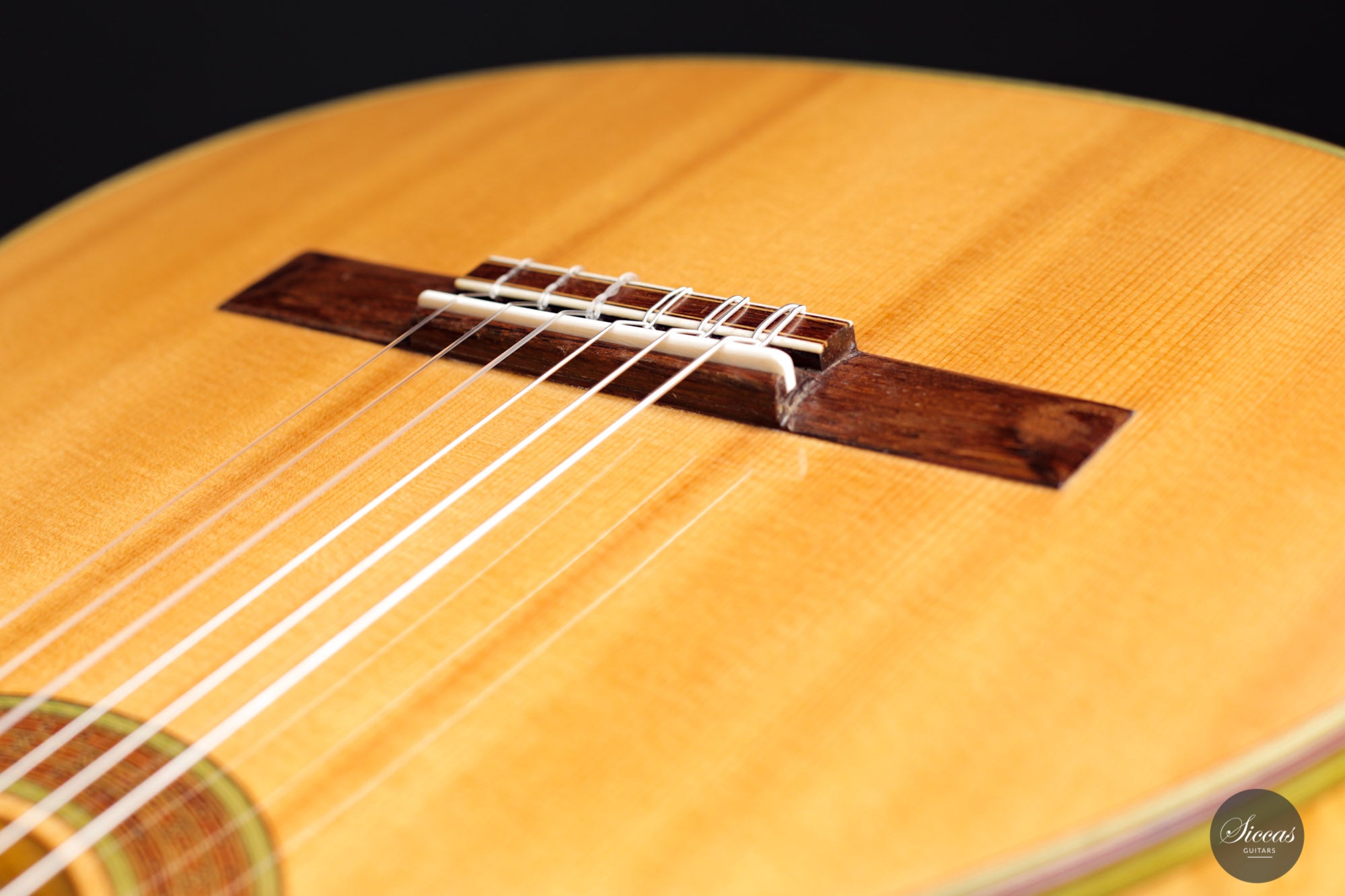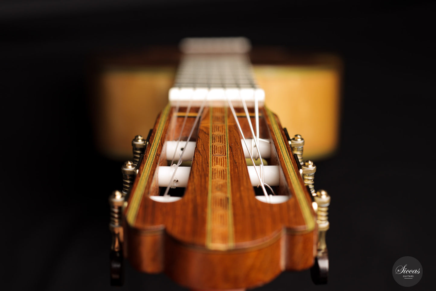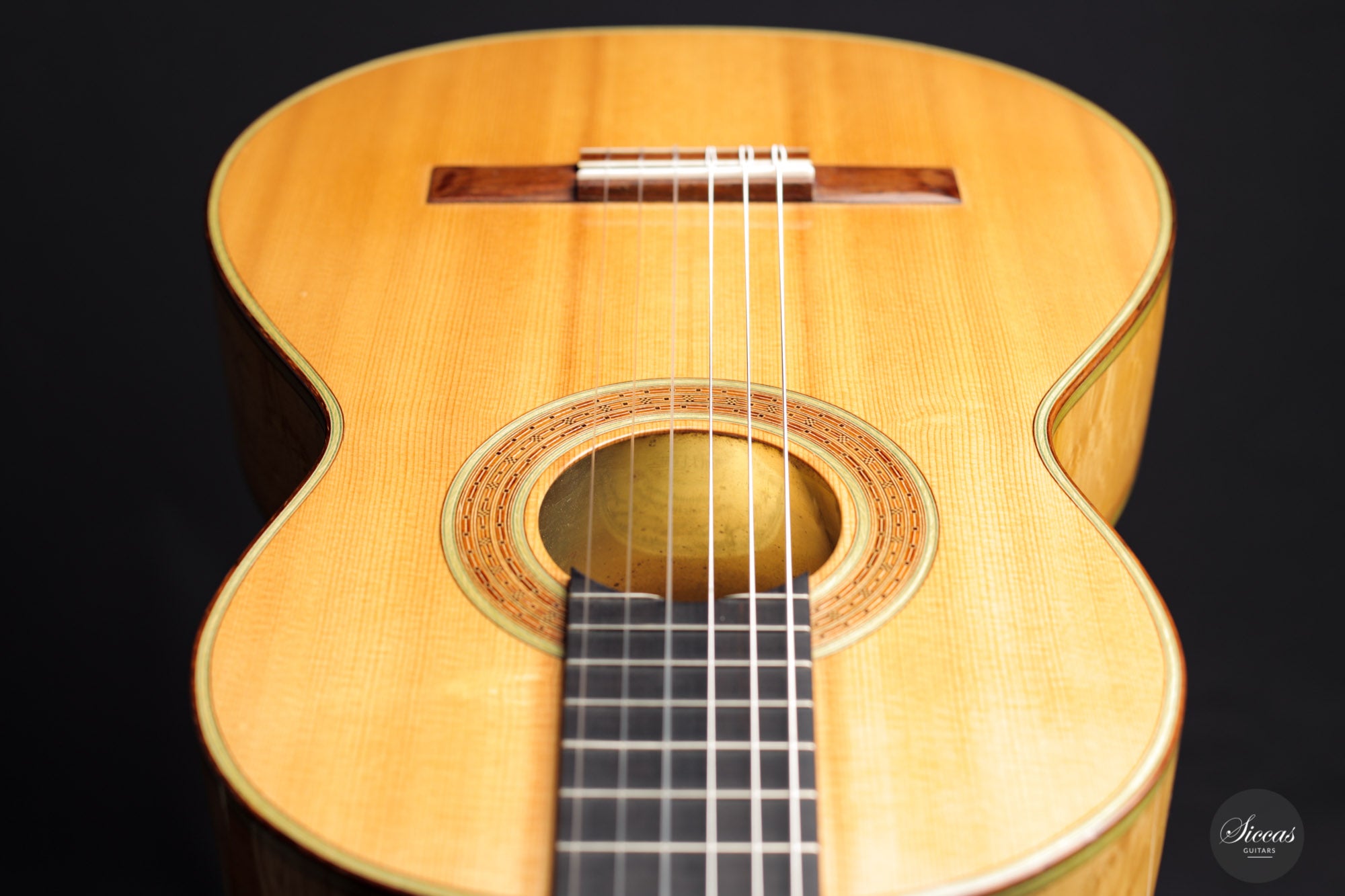 Diese schöne Gitarre ist eine Nachbildung der ersten Antonio de Torres-Gitarre von Francisco Tarrega. Das Originalinstrument von 1864, das im Katalog von J. L. Romanillos als "FE17" bezeichnet wird, ist reich verziert und weist die meisten der von A. de Torres im Laufe seiner Karriere verwendeten dekorativen Motive auf. Man kann zum Beispiel den Mäander (ein griechisches orthogonales Ornament), zarte grüne und weiße Fischgräten, das Schachbrettmuster und die Raute erkennen. Dieses Instrument von Gerhard Oldiges aus dem Jahr 1997 befindet sich in einem ausgezeichneten Zustand, ohne Risse oder Reparaturen und fast ohne Spielspuren auf dem Schellack.