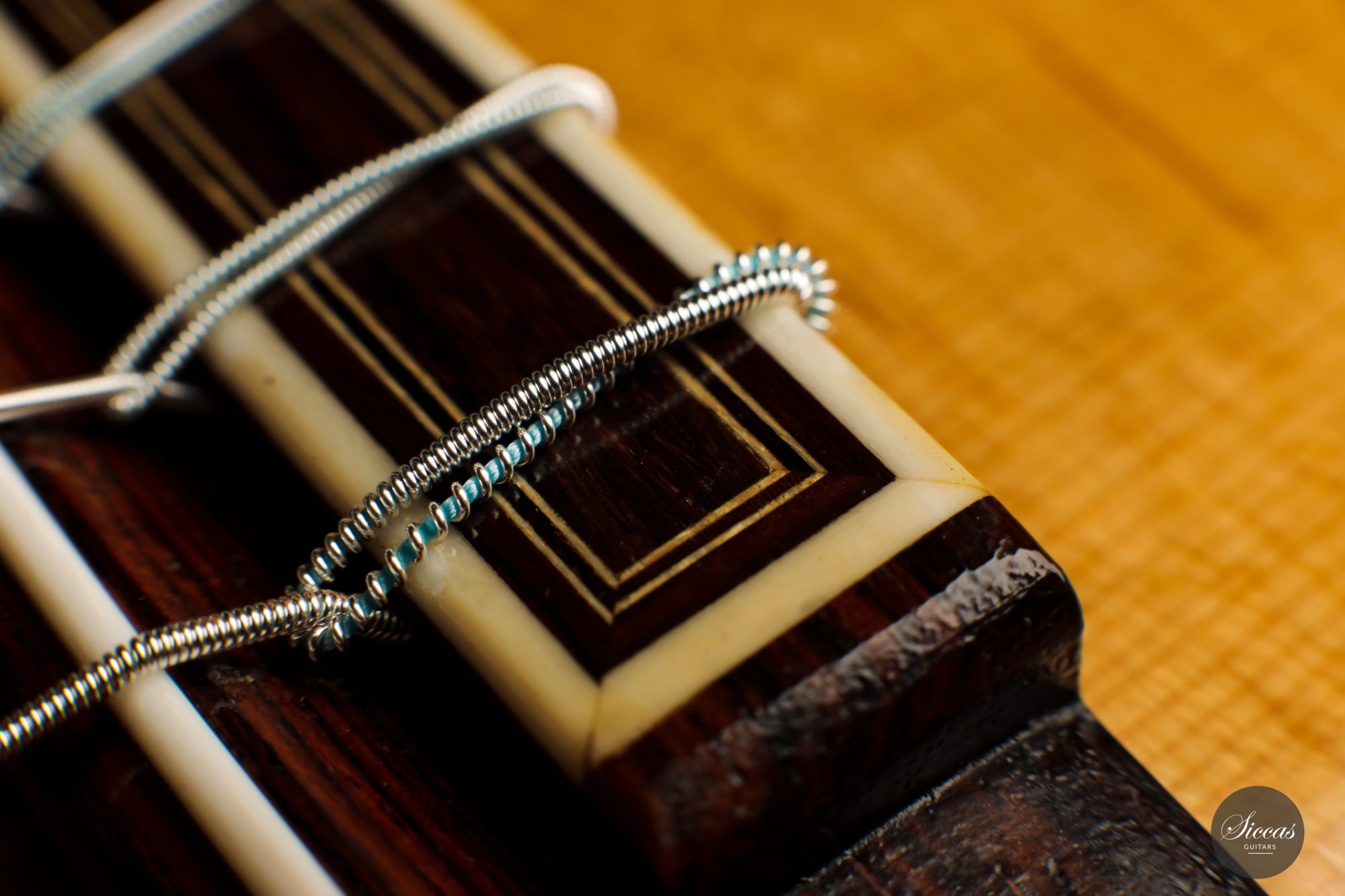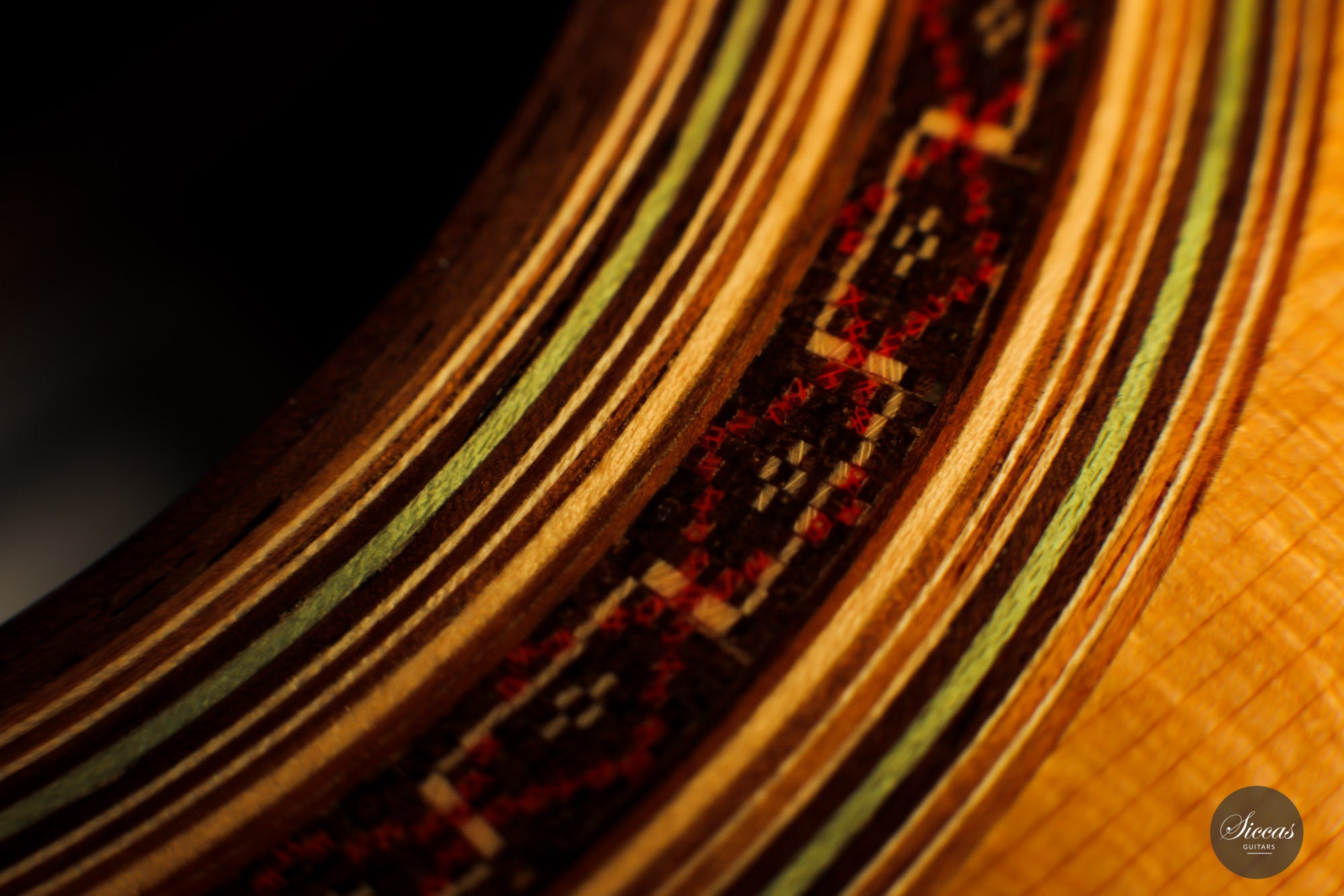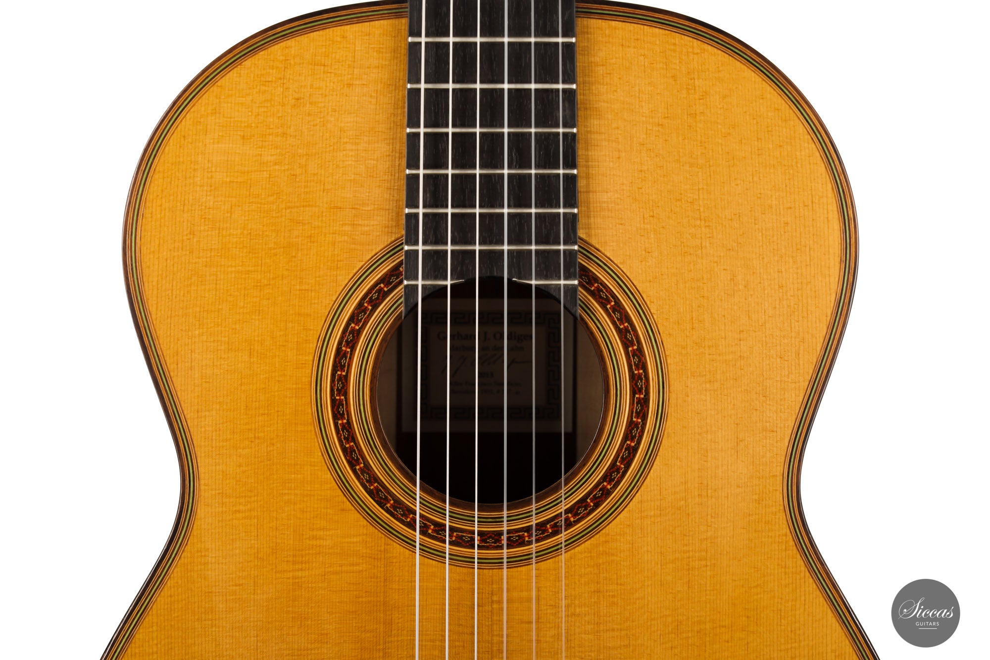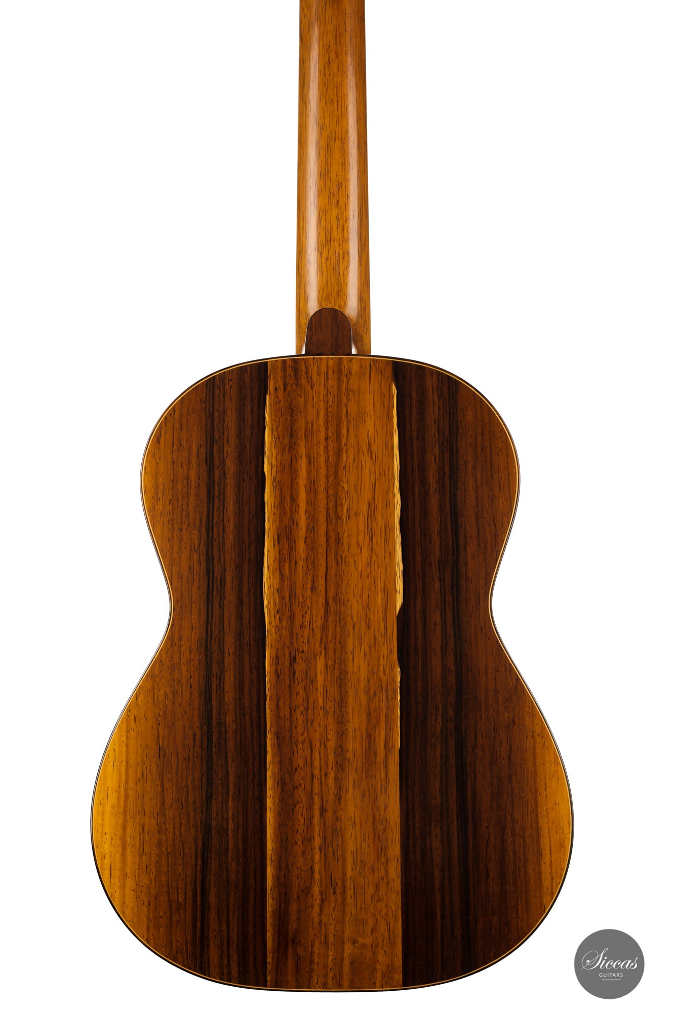 What a wonderful instrument inspired by one of the very last guitars made by the great luthier Francisco Simplicio (1874-1932) from Barcelona. Many details of the appearance and construction of the 1931 Francisco Simplicio guitar, bearing the number 327, have been faithfully reproduced, while Gérhard Oldiges also took the liberty of adding his own personal touch. The three-piece back made of the finest Brazilian rosewood is simply outstanding and presents an unmistakable color pattern. The soundboard, made of torrefied spruce, has furthermore developed a gorgeous honey color. Torrefaction reproduces the dryness and thus the response of a wood that has been dried for decades, offering a special response and excellent tone. Last but not least, this instrument is in perfect condition and is fitted with high-end Scheller tuning machines that have been intricately engraved by hand in Germany.