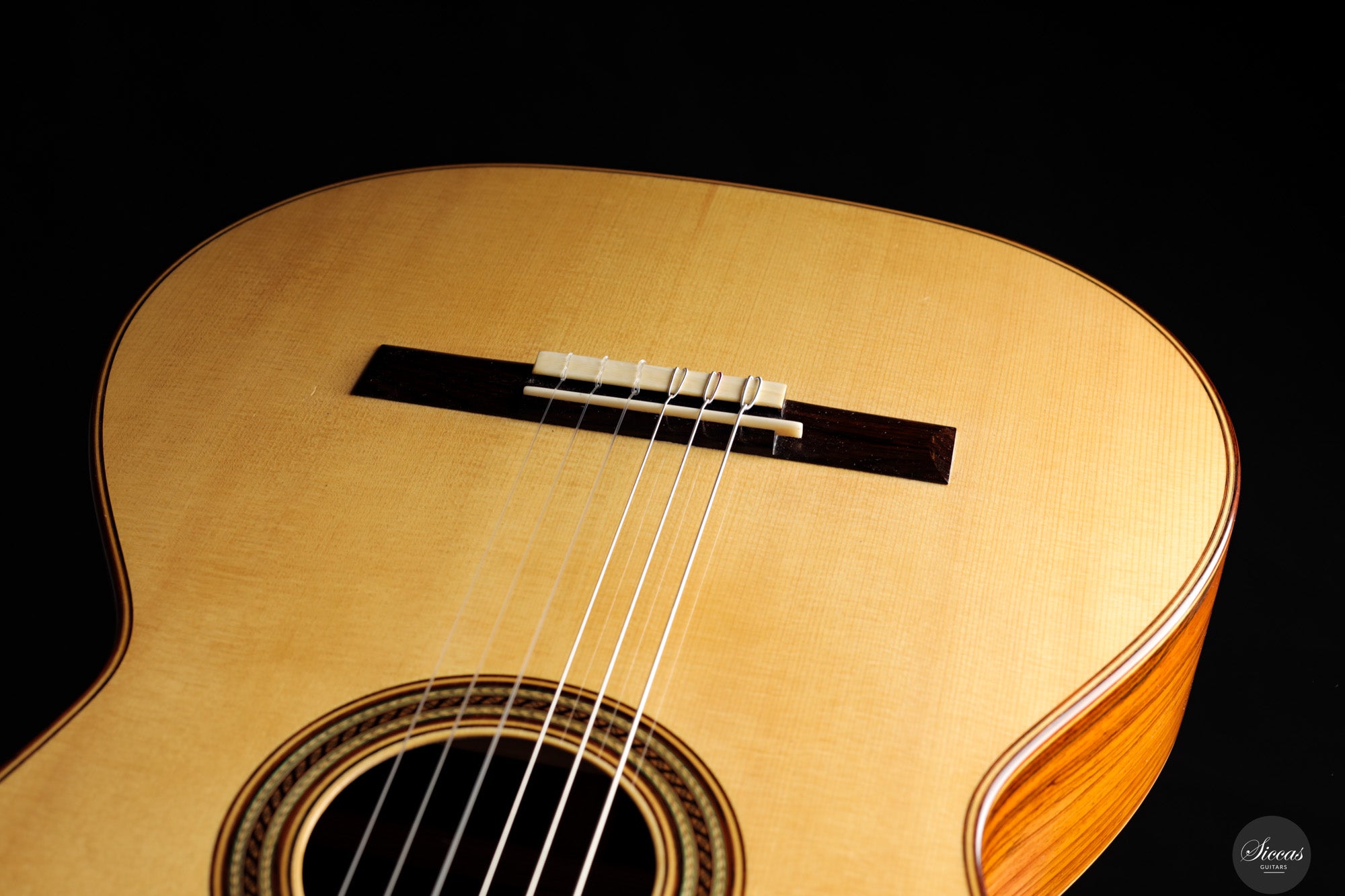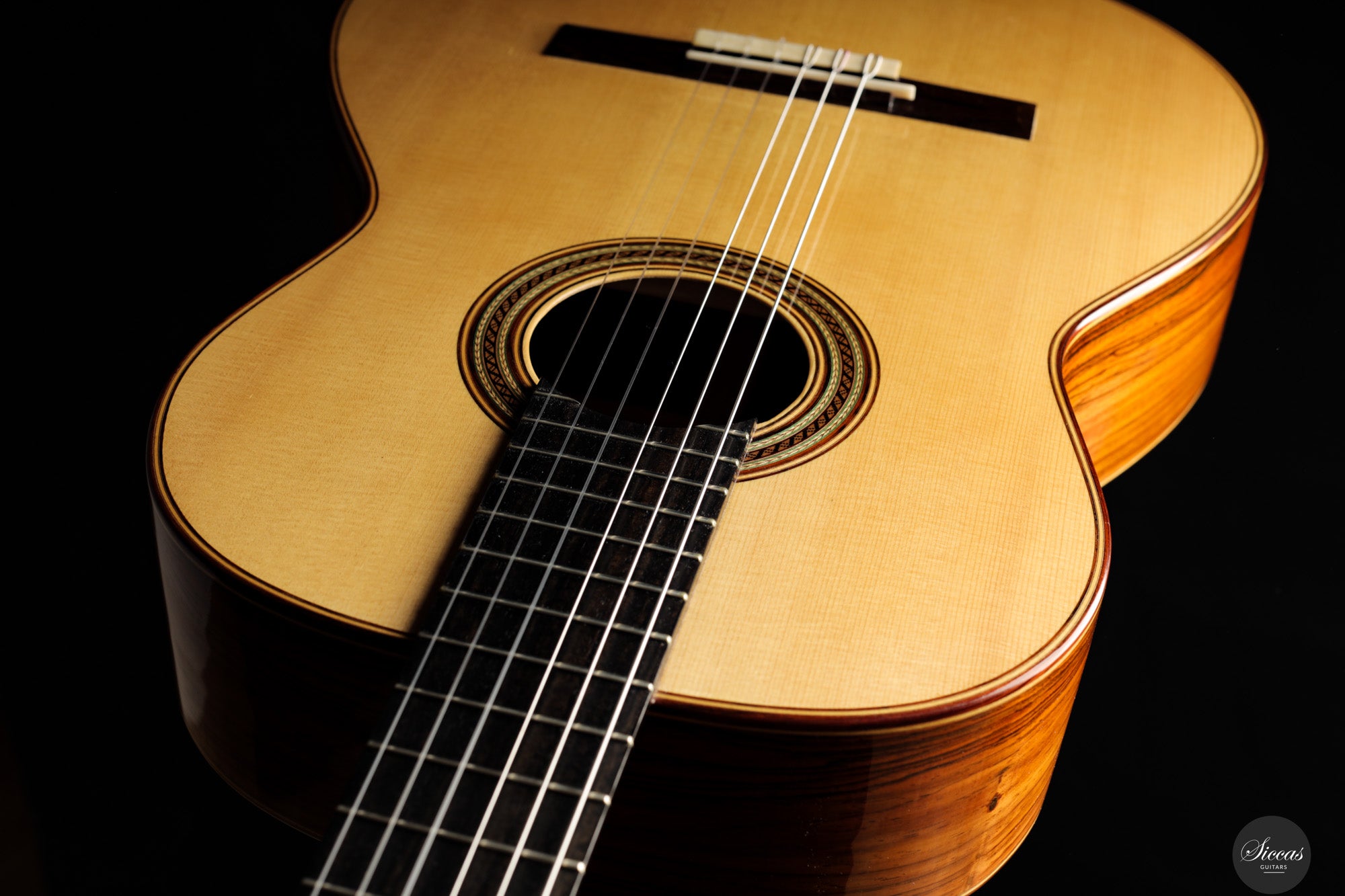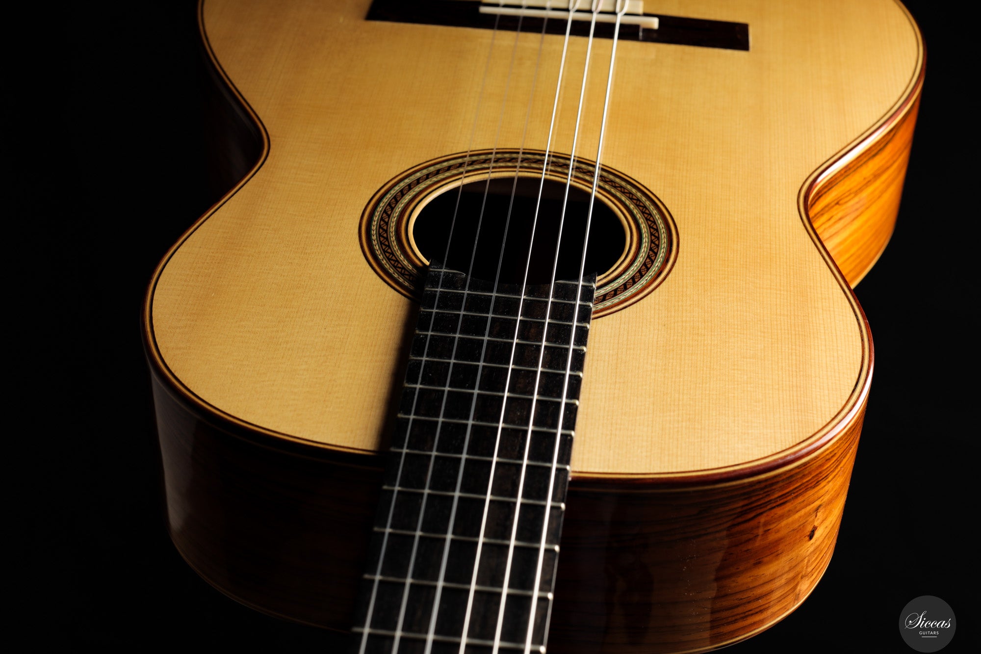 Diese Konzertgitarre von Gerhard Oldiges, "La Sesenta", aus dem Jahr 2015 orientiert sich an traditionellen Vorbildern großer Gitarrenbauer wie Antonio de Torres und Manuel Ramírez. Sie bewahrt die klangliche Klarheit, Wärme und intime Ansprache der historischen Modelle und bringt sie in einen modernen Kontext. Die Kombination aus Fichtendecke und brasilianischem Palisander bei geringem Gewicht ergibt ein Instrument mit lyrischer Tiefe und direkter Ansprache. Die auf Fis gestimmte Eigenresonanz bildet ein stabiles klangliches Fundament, während die klangliche Balance zwischen den Registern präzise kontrolliert ist. Diese Gitarre verbindet die Ausdrucksstärke und Tragfähigkeit moderner Konzertinstrumente mit einem traditionellen klanglichen Ideal – gebaut mit großem Respekt vor der Geschichte und zugleich für die Bühne von heute gedacht.