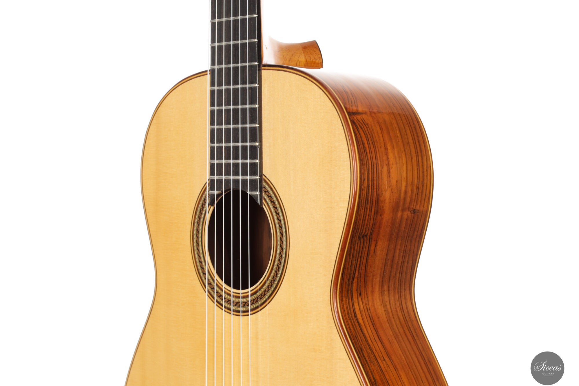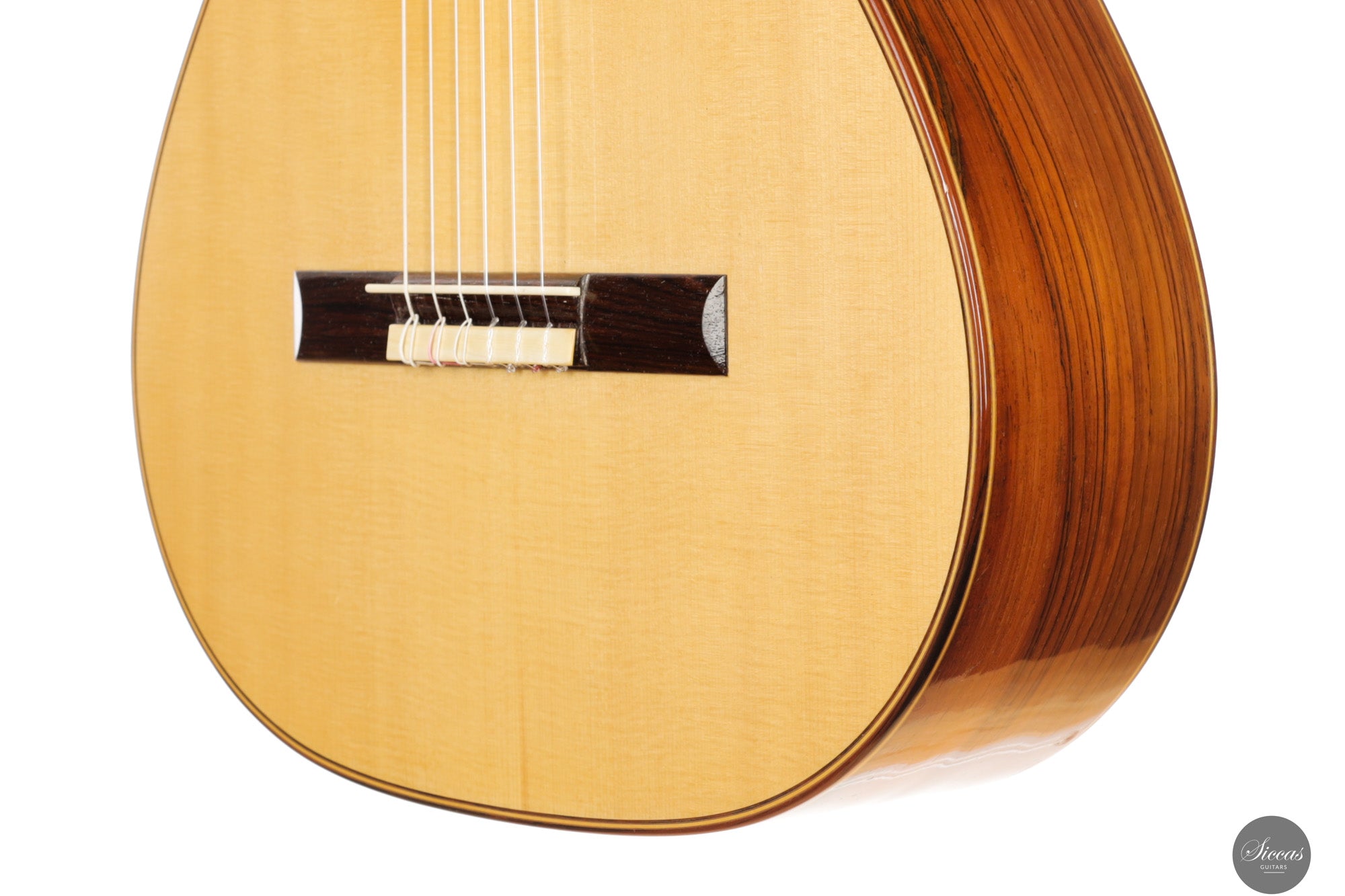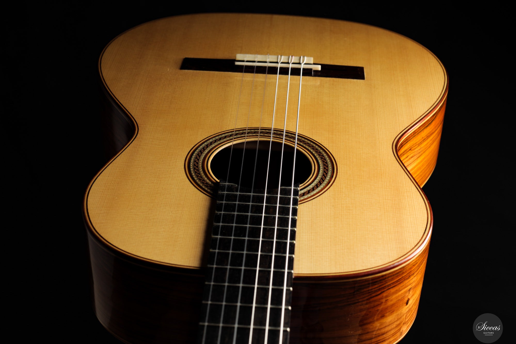 Diese Konzertgitarre von Gerhard Oldiges, "La Sesenta", aus dem Jahr 2015 orientiert sich an traditionellen Vorbildern großer Gitarrenbauer wie Antonio de Torres und Manuel Ramírez. Sie bewahrt die klangliche Klarheit, Wärme und intime Ansprache der historischen Modelle und bringt sie in einen modernen Kontext. Die Kombination aus Fichtendecke und brasilianischem Palisander bei geringem Gewicht ergibt ein Instrument mit lyrischer Tiefe und direkter Ansprache. Die auf Fis gestimmte Eigenresonanz bildet ein stabiles klangliches Fundament, während die klangliche Balance zwischen den Registern präzise kontrolliert ist. Diese Gitarre verbindet die Ausdrucksstärke und Tragfähigkeit moderner Konzertinstrumente mit einem traditionellen klanglichen Ideal – gebaut mit großem Respekt vor der Geschichte und zugleich für die Bühne von heute gedacht.
