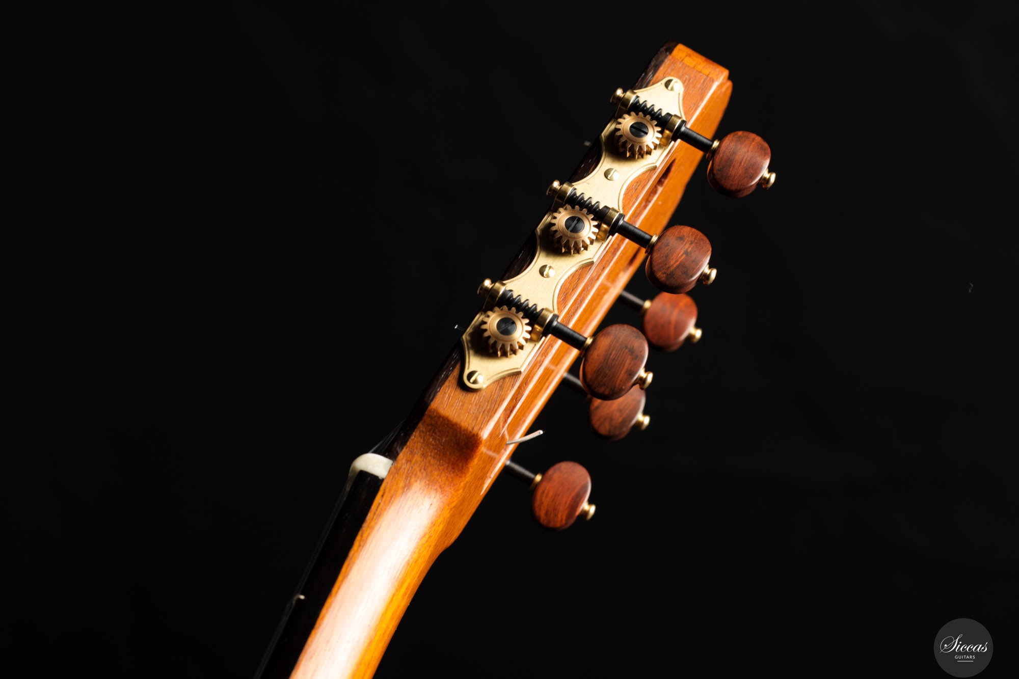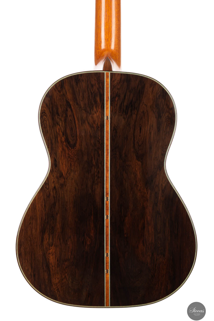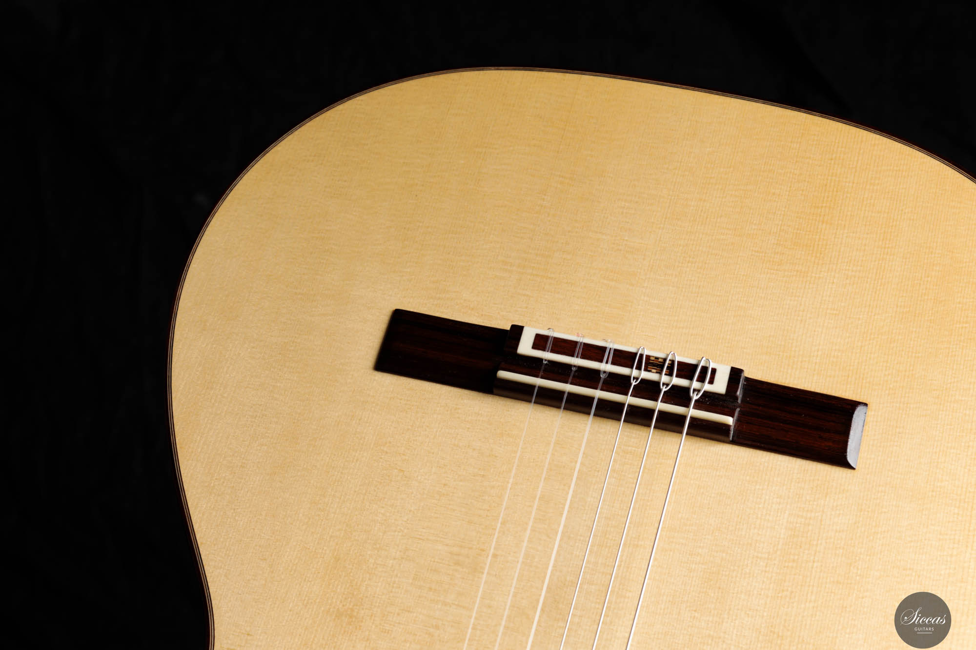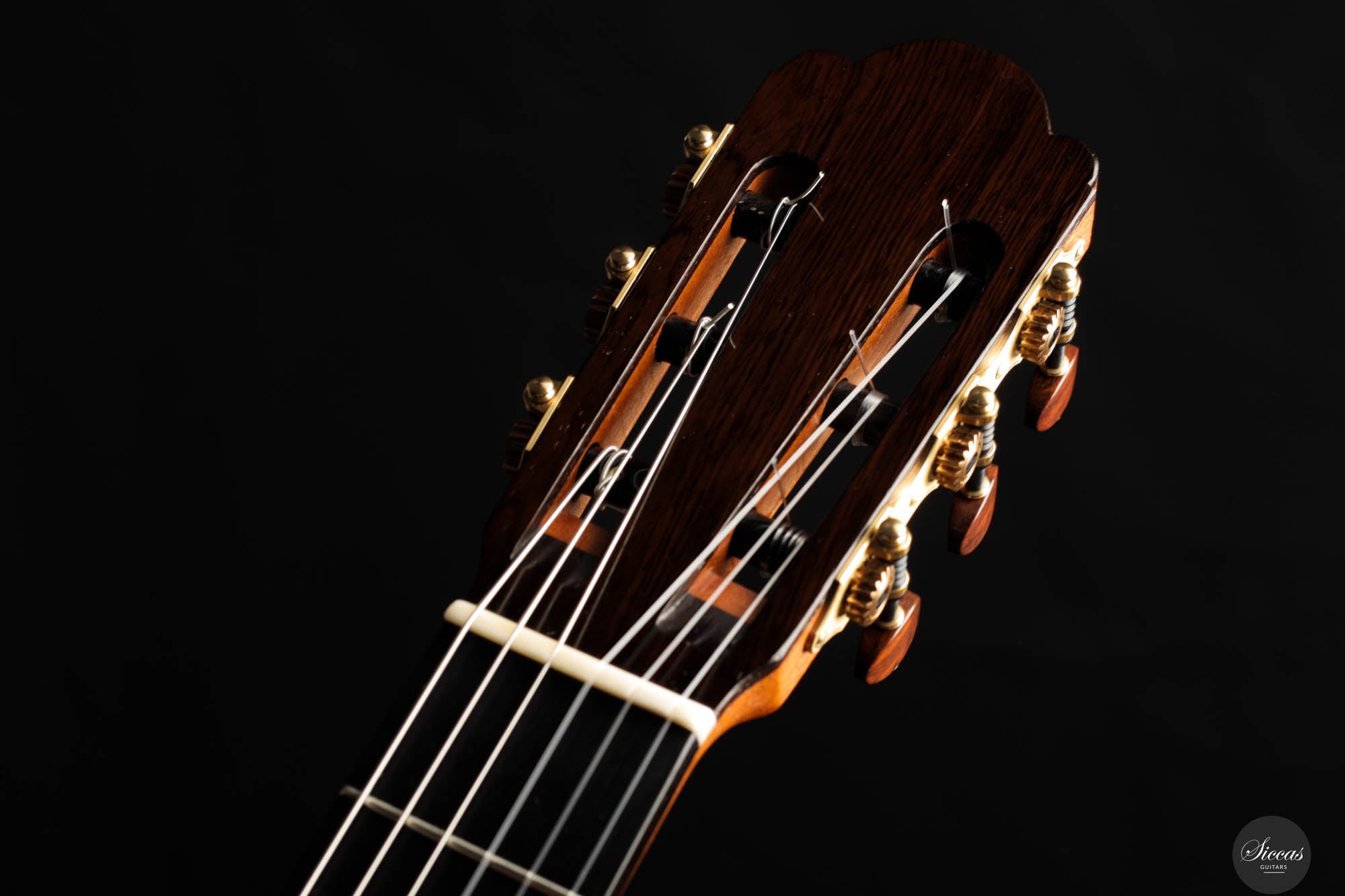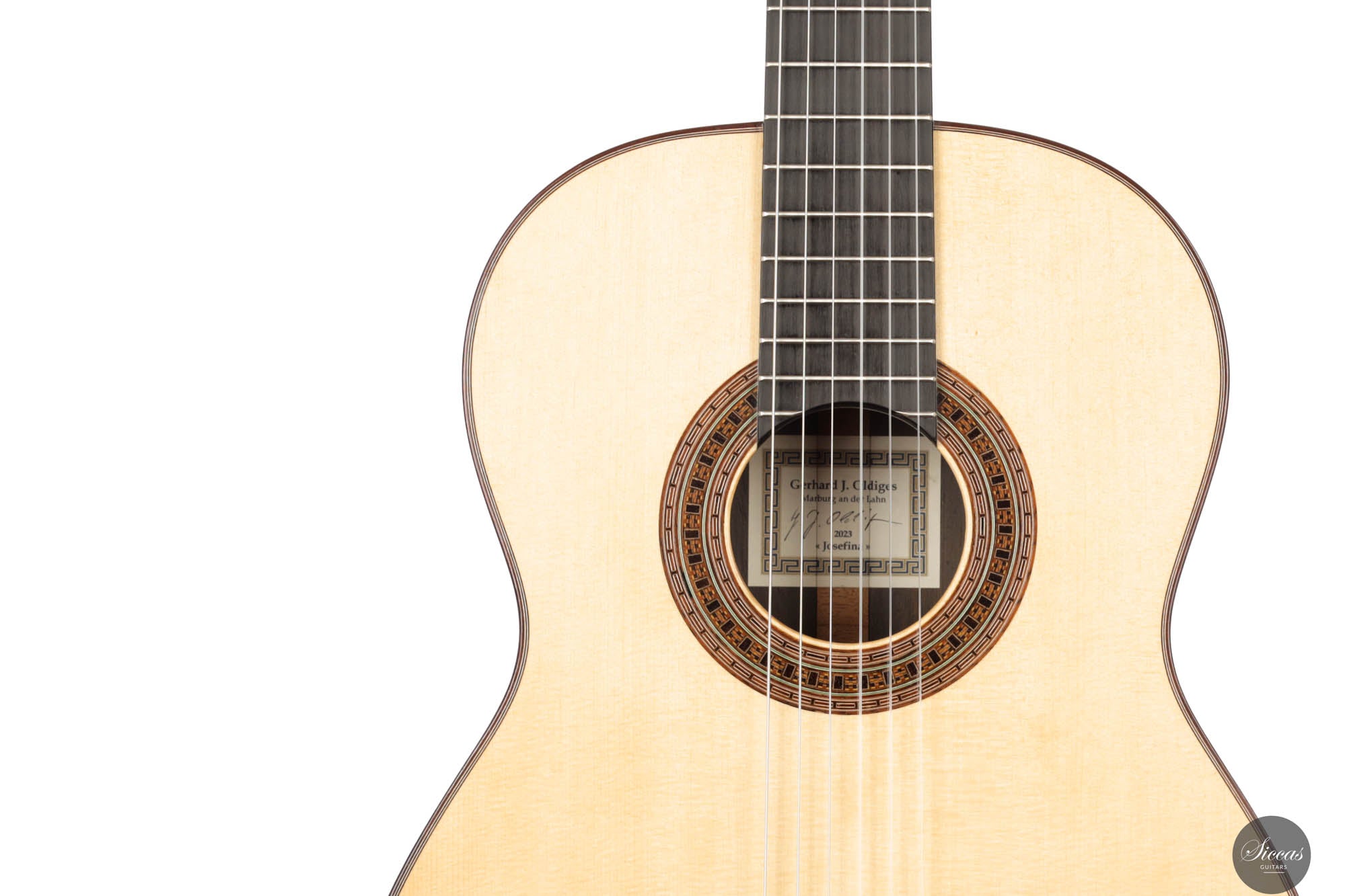 Die 2023 gefertigte Gitarre „Josefina“ ist ein brandneues Instrument, das Gerhards Werkstatt nie verlassen hat, was sie zu einer besonderen und unberührten Rarität macht. Für Boden und Zargen wählte Gerhard brasilianisches Palisander, das mit seiner dichten, dunklen Maserung und der heutigen Seltenheit nicht nur klanglich, sondern auch wertsteigernd beeindruckt. Diese Gitarre bietet eine perfekte Balance zwischen Klangfülle und Präzision, mit einer kraftvollen und klaren Stimme, die Zuhörer in ihren Bann zieht. Die leichte Bauweise, insbesondere die feine Decke, sorgt für eine hervorragende Ansprache und ermöglicht ein sanftes und angenehmes Spielgefühl. Der schlanke Hals erleichtert schwierige Griffweiten und Barré-Akkorde, was die Bespielbarkeit zusätzlich optimiert. Besonders die singende erste Saite ist ein unverzichtbares Merkmal für das klassische Gitarrenrepertoire, ergänzt durch eine außergewöhnliche klangliche Balance und Sustain, die dieses Instrument zu einer herausragenden Wahl für anspruchsvolle Musiker macht.