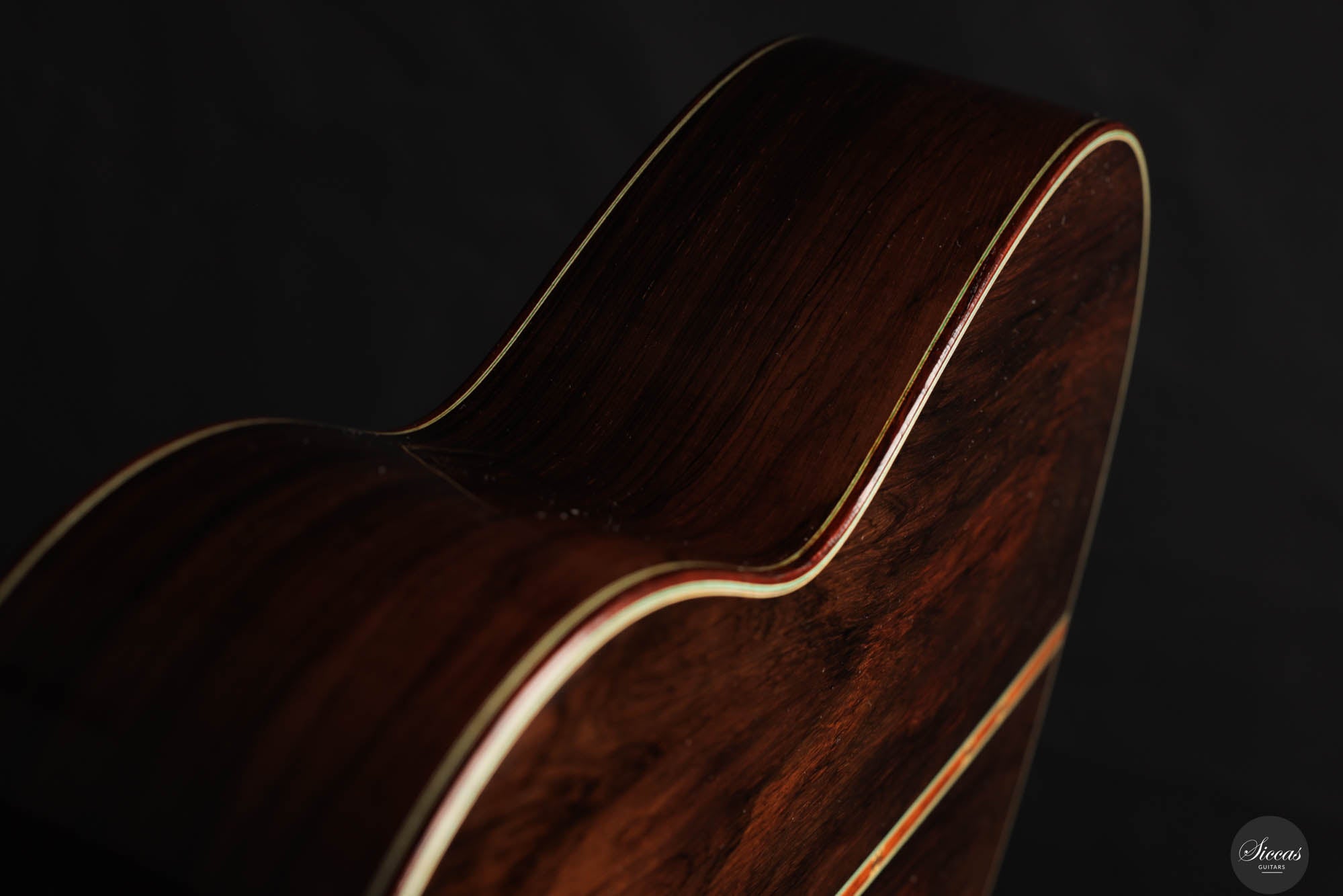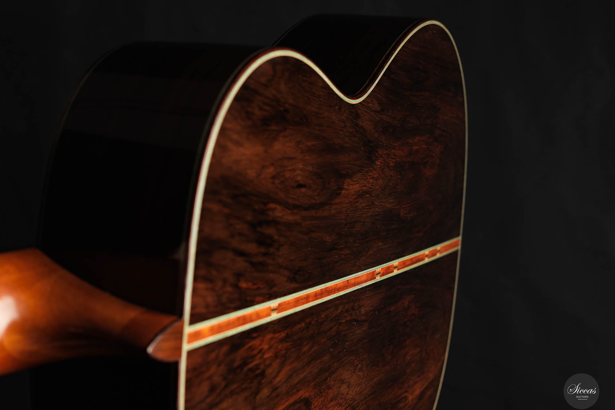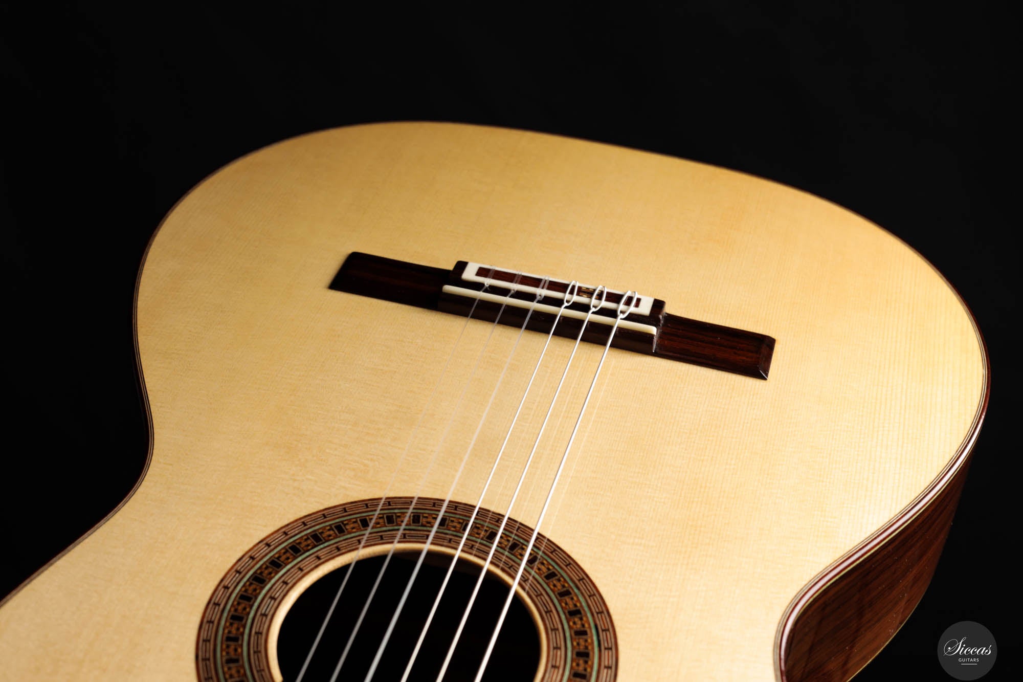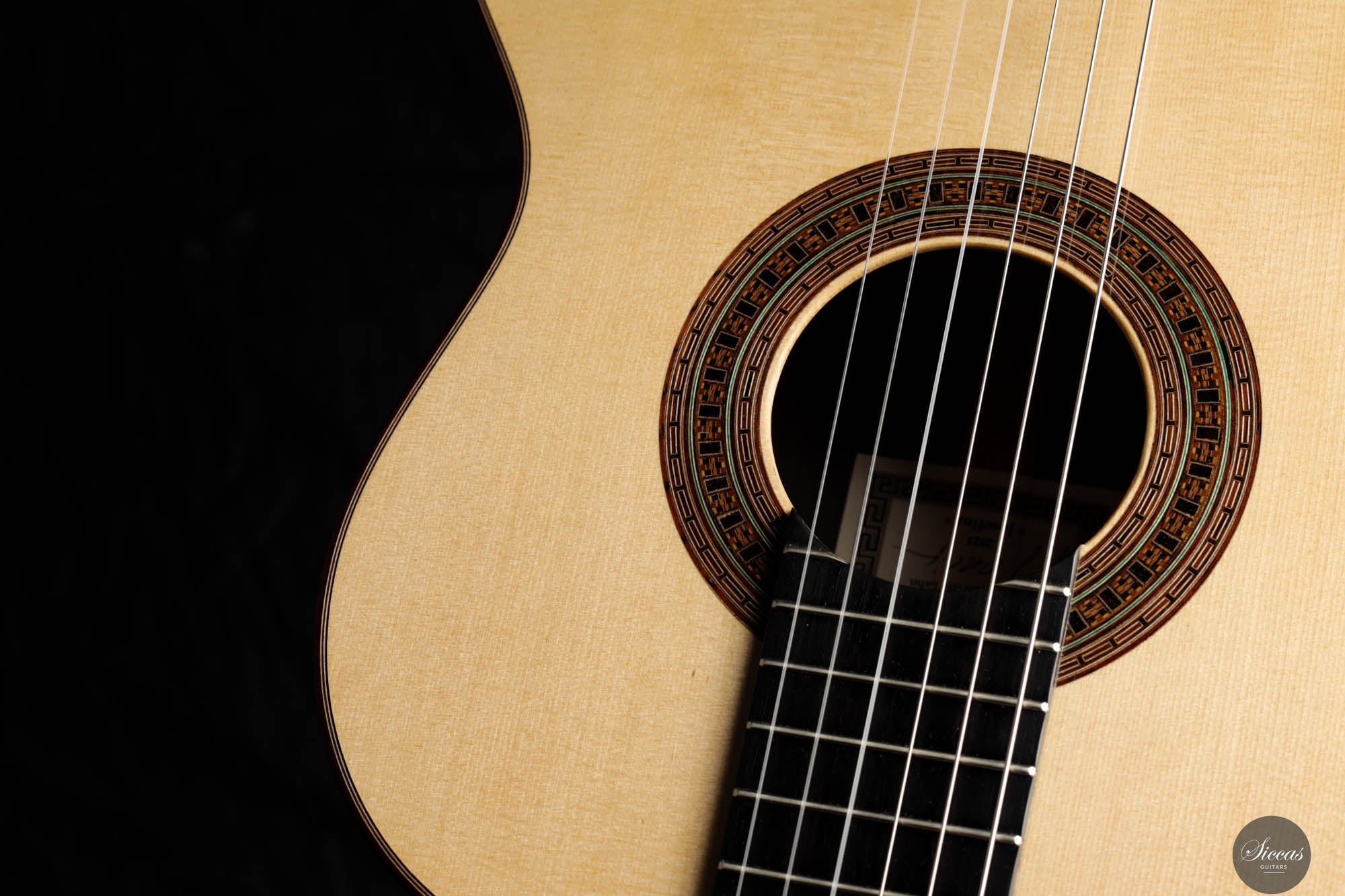 Die 2023 gefertigte Gitarre „Josefina“ ist ein brandneues Instrument, das Gerhards Werkstatt nie verlassen hat, was sie zu einer besonderen und unberührten Rarität macht. Für Boden und Zargen wählte Gerhard brasilianisches Palisander, das mit seiner dichten, dunklen Maserung und der heutigen Seltenheit nicht nur klanglich, sondern auch wertsteigernd beeindruckt. Diese Gitarre bietet eine perfekte Balance zwischen Klangfülle und Präzision, mit einer kraftvollen und klaren Stimme, die Zuhörer in ihren Bann zieht. Die leichte Bauweise, insbesondere die feine Decke, sorgt für eine hervorragende Ansprache und ermöglicht ein sanftes und angenehmes Spielgefühl. Der schlanke Hals erleichtert schwierige Griffweiten und Barré-Akkorde, was die Bespielbarkeit zusätzlich optimiert. Besonders die singende erste Saite ist ein unverzichtbares Merkmal für das klassische Gitarrenrepertoire, ergänzt durch eine außergewöhnliche klangliche Balance und Sustain, die dieses Instrument zu einer herausragenden Wahl für anspruchsvolle Musiker macht.