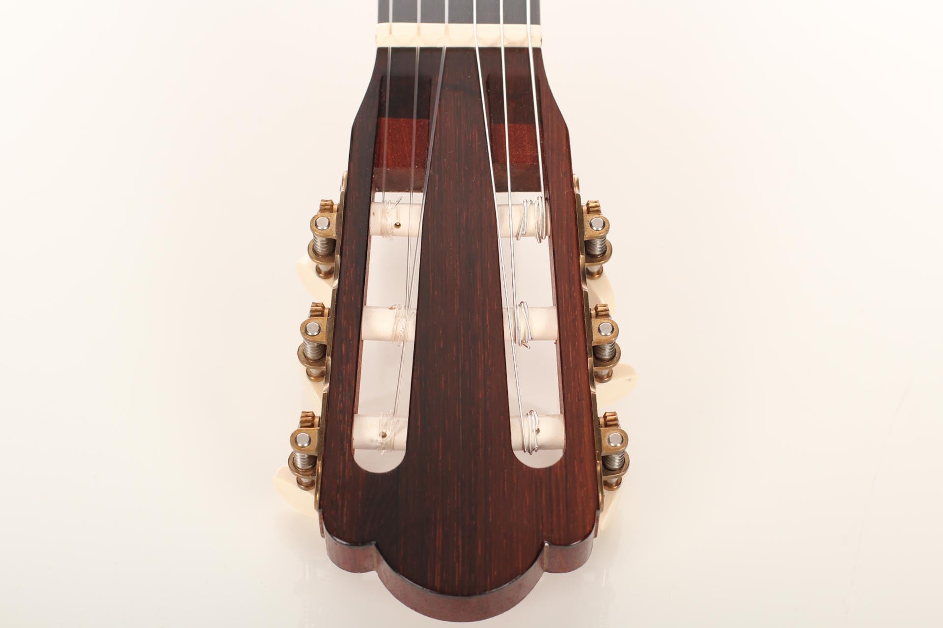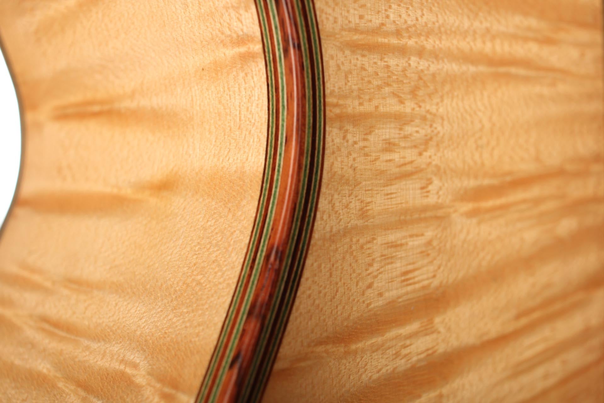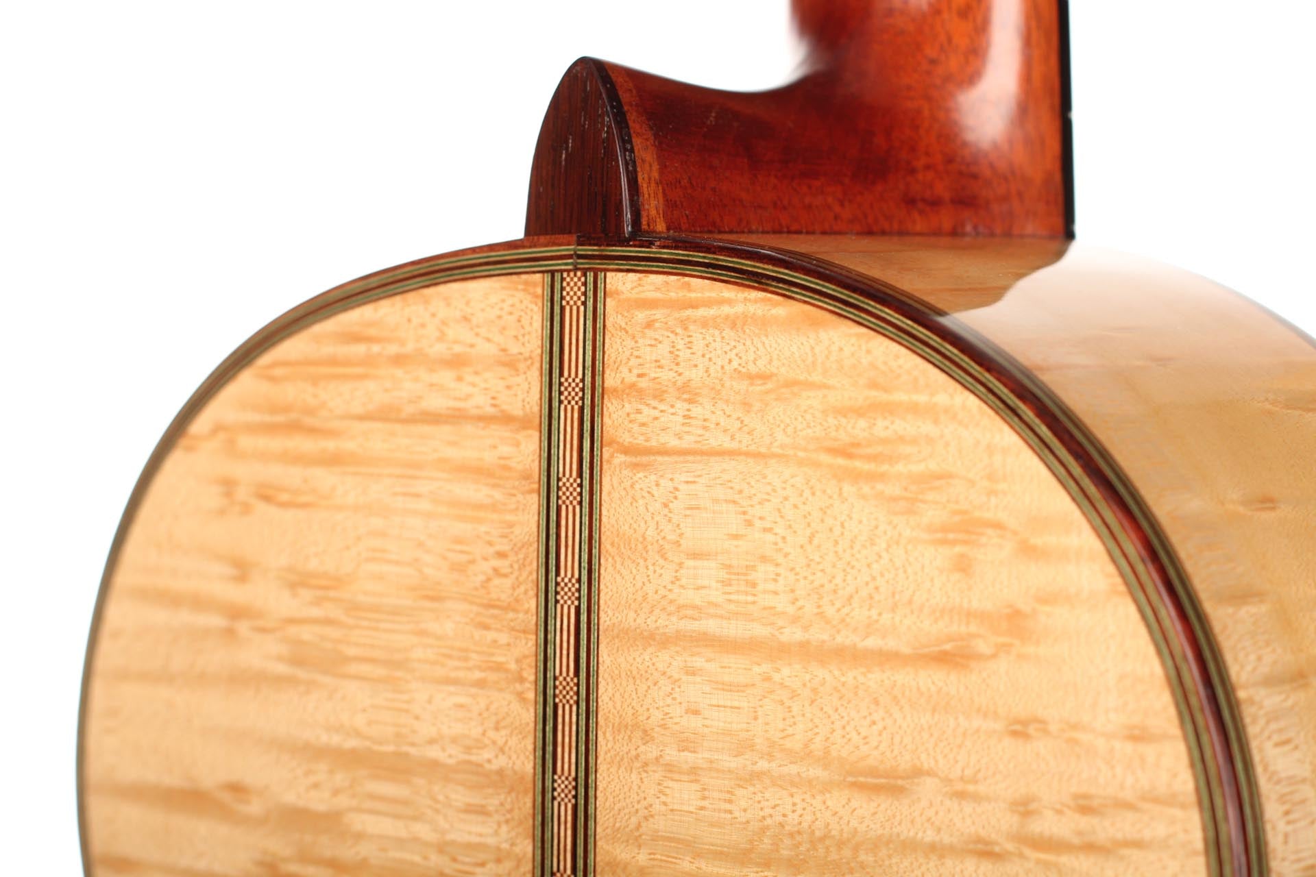 This Torres copy from 2003 combines a gorgeous bear claw top with ravishingly flamed maple back and sides. Against the background of these exquisite bright woods, the contrasty red and green mosaic in the rosette can unfold beautifully. The guitar has a marvelously mellow and lovely sound. Due to the Tornavoz the basses and mids have a warm singing touch, underlining the bright trebles pleasantly. The instrument is in very good condition. The tuners are made by Sloane. A hard-shell case is included.