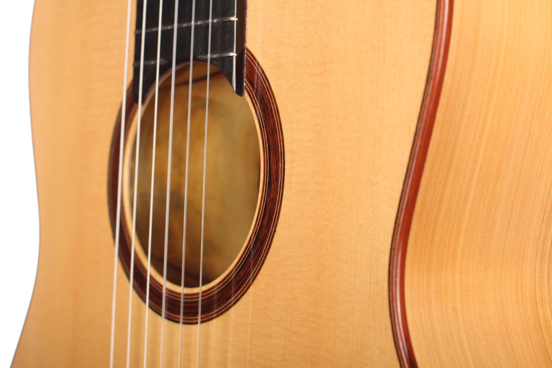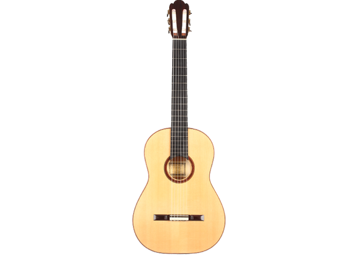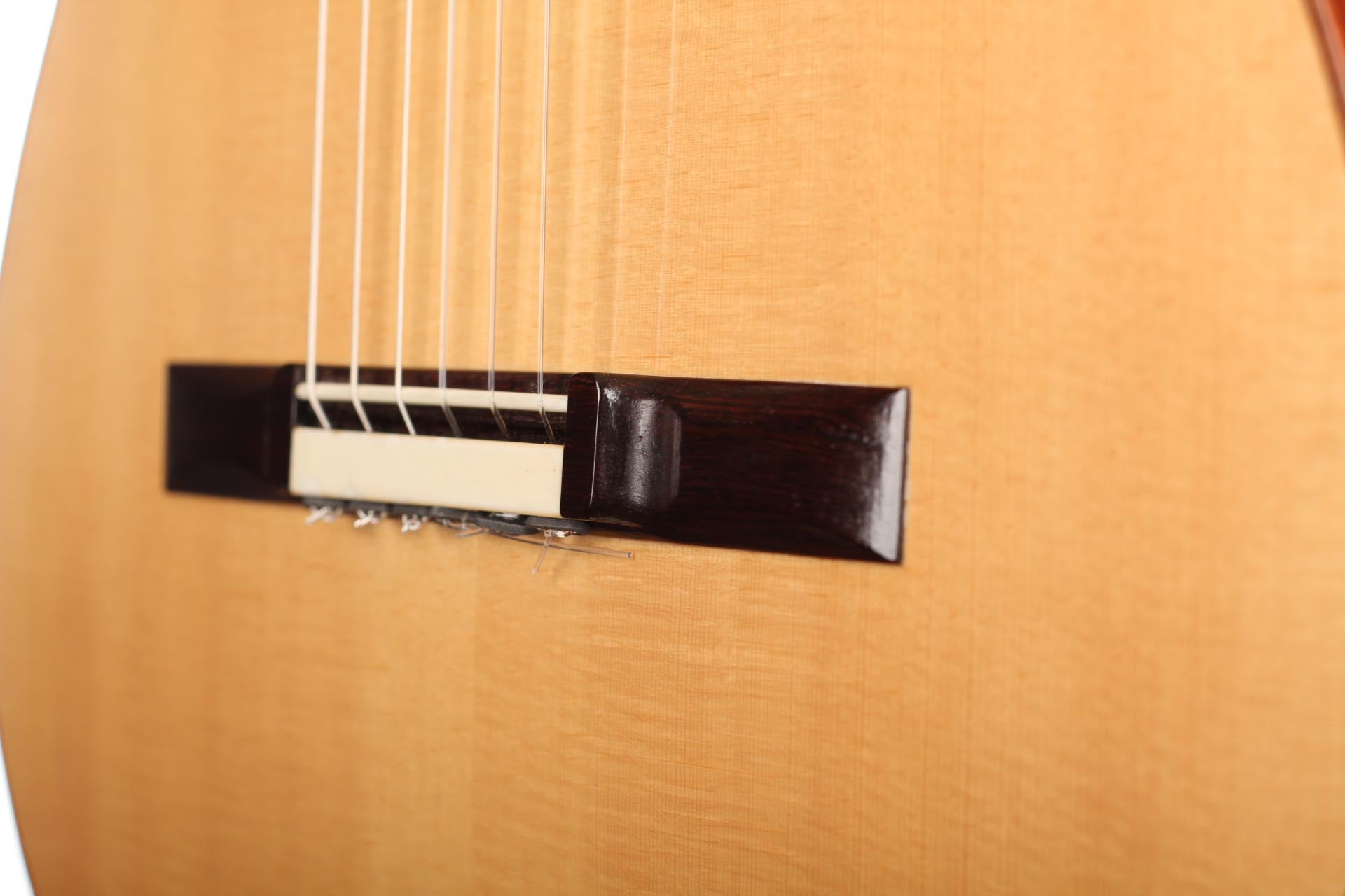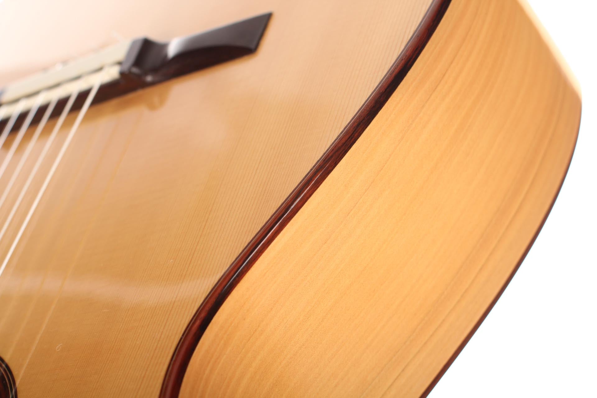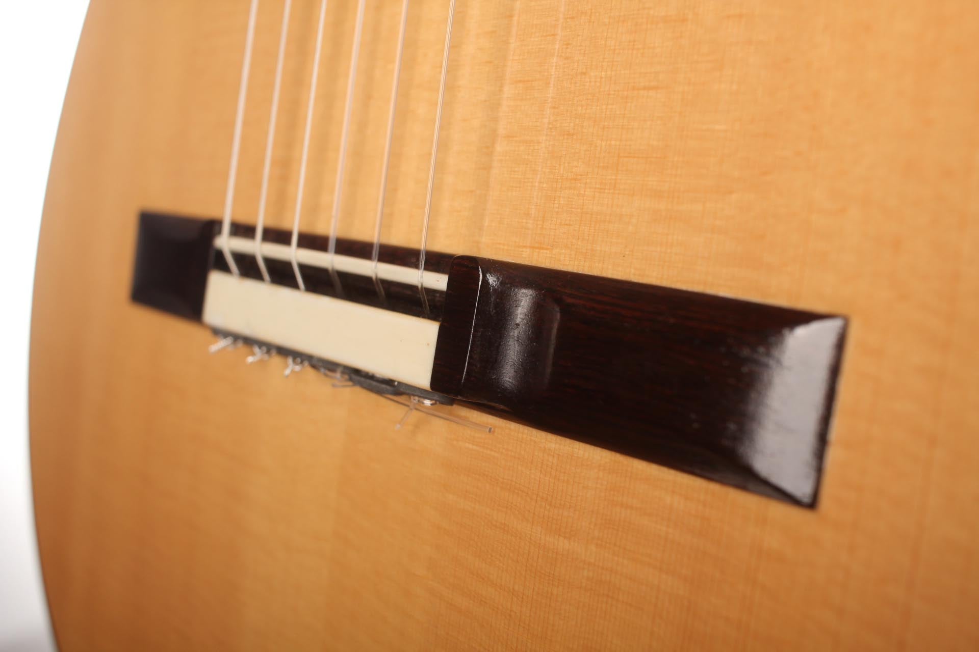 This Torres copy from 2011 combines a gorgeous spruce top with beautiful cypress back and sides. The guitar has a marvelously mellow and lovely sound. Due to the Tornavoz the basses and mids have a warm singing touch, underlining the bright trebles pleasantly. The instrument is in very good condition. The tuners are made by Rodgers. A Hiscox Pro II hardshell case is included.