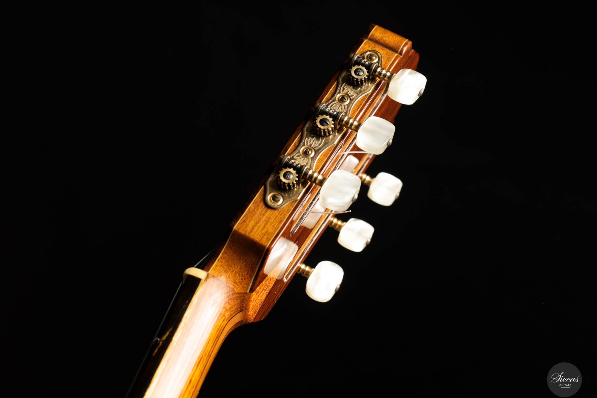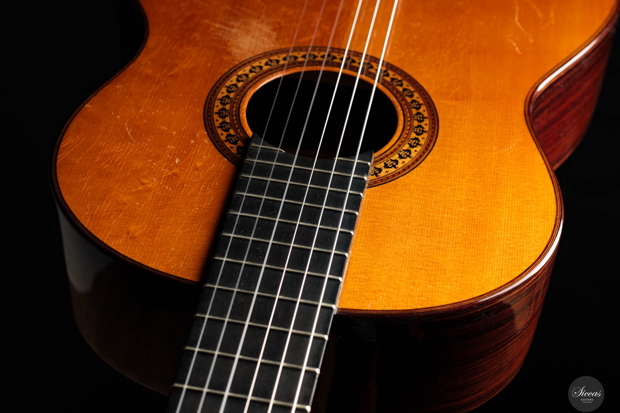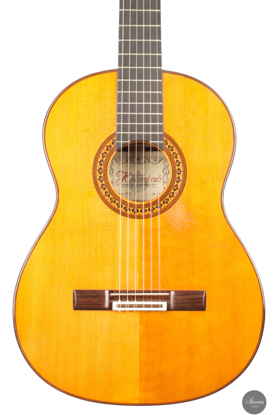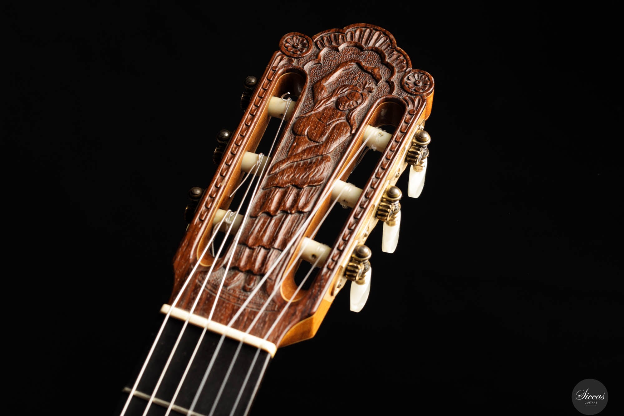This beautiful guitar carries an amazing story. The intricately carved headstock was added several years after the guitar was originally built, crafted by a local woodcarver to fulfill the wish of the late owner, who was a close friend of Hannabach. This unique detail adds a personal and historical touch to an already remarkable instrument.