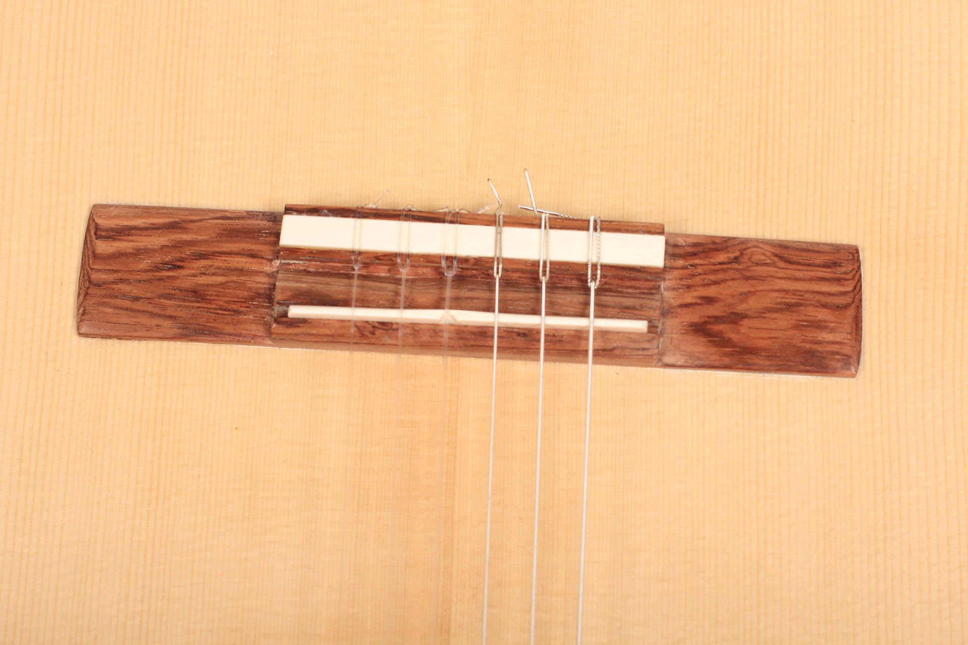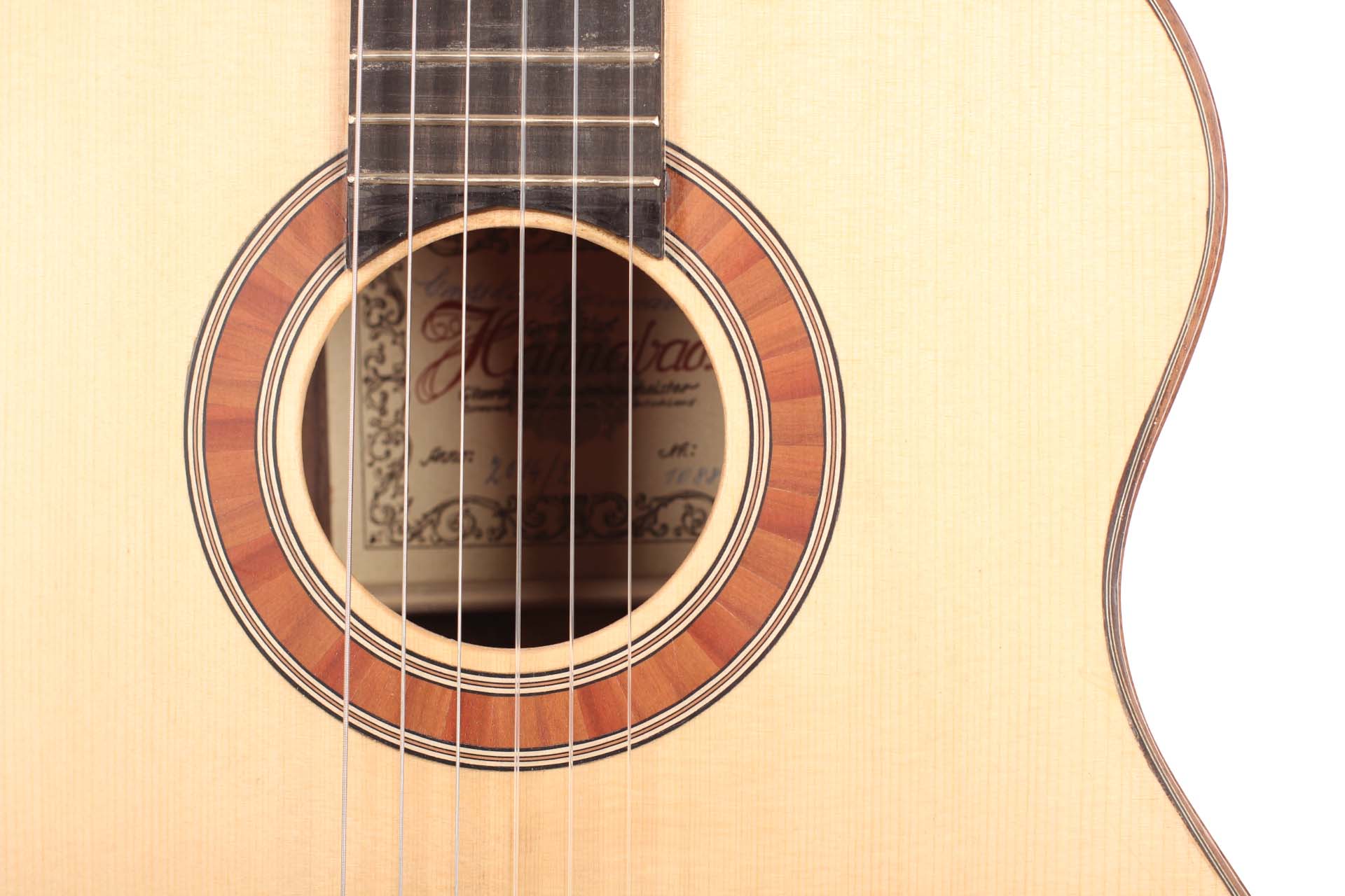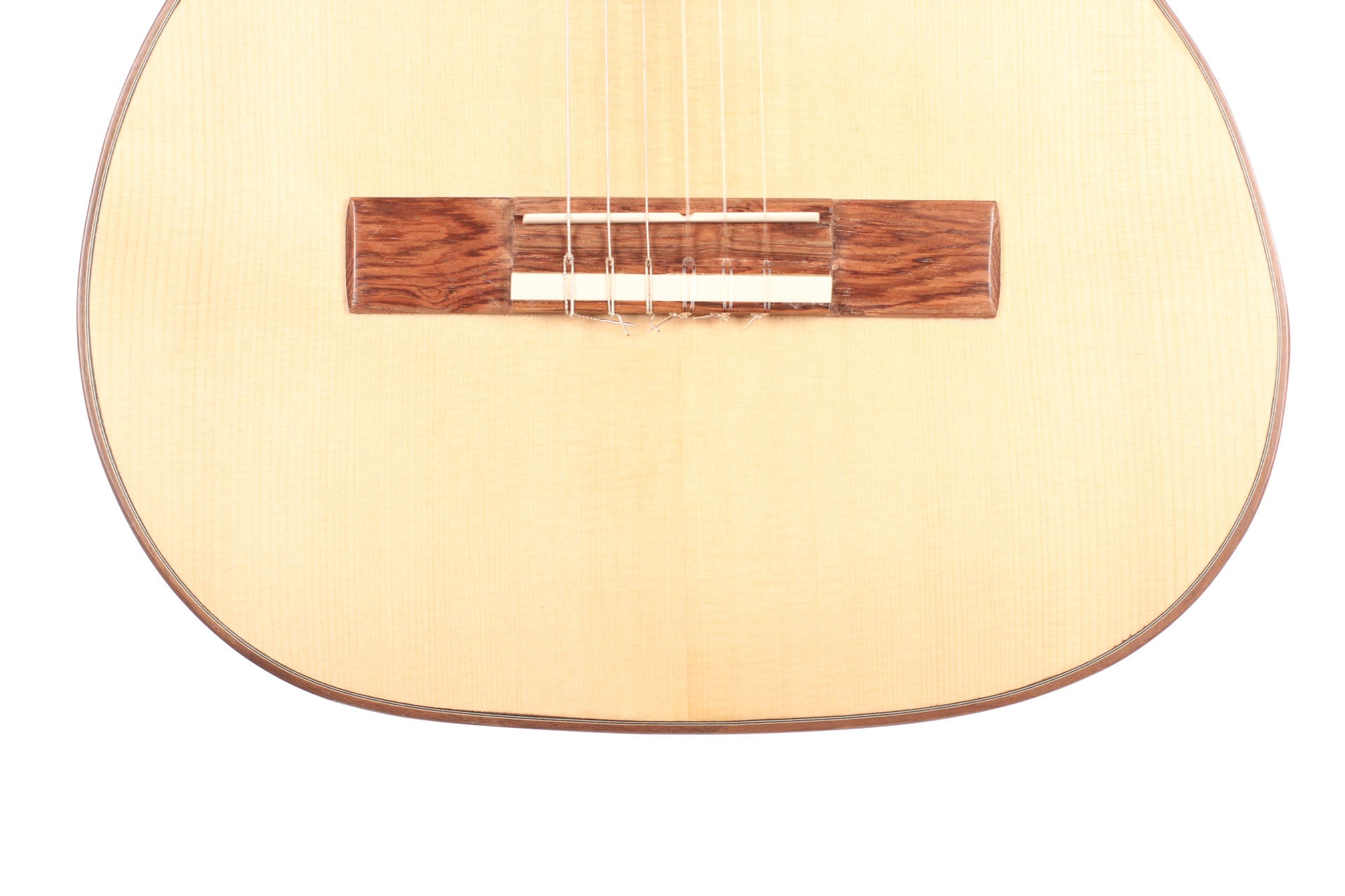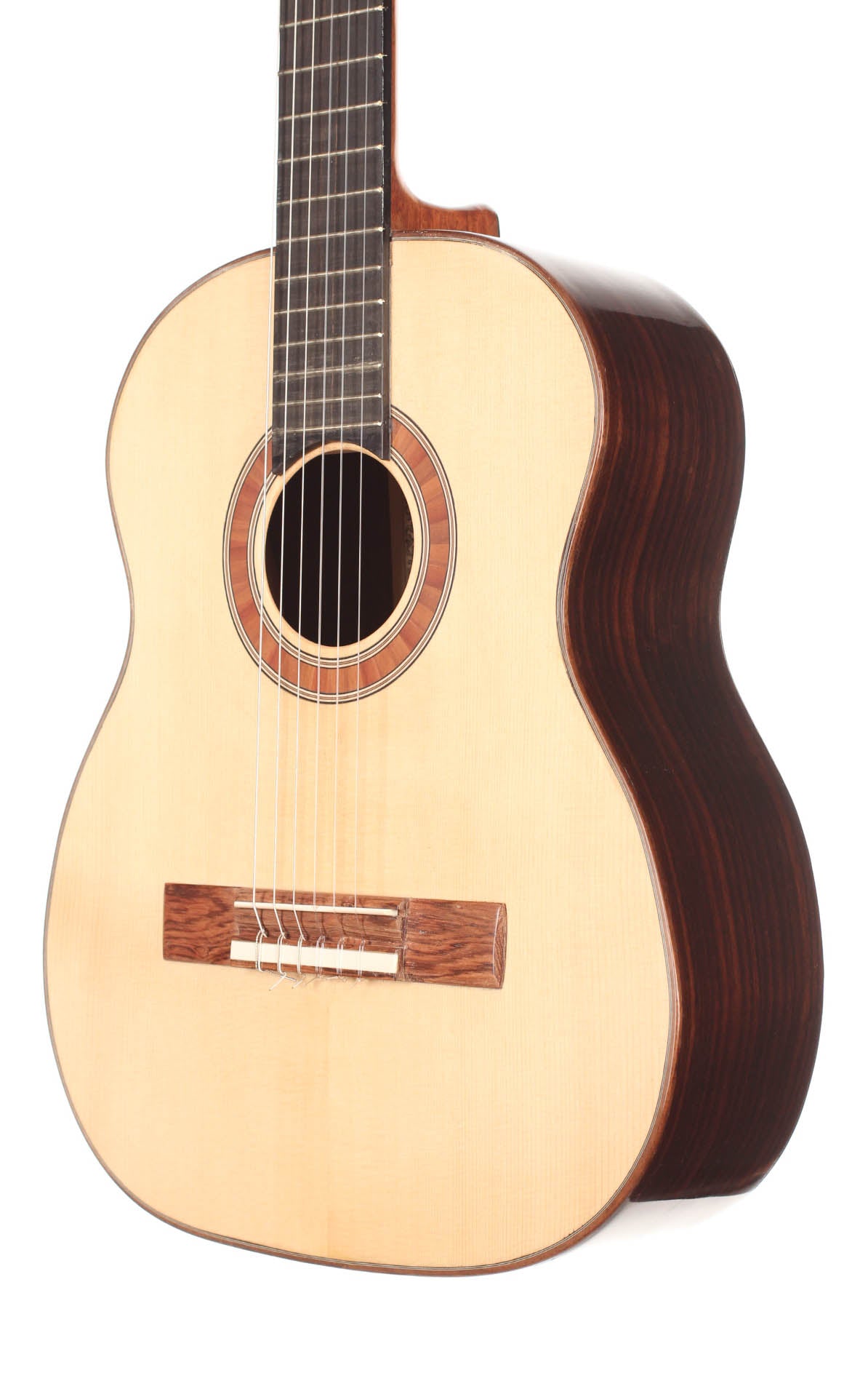 Wir präsentieren euch die letzte Gitarre, die der Meister vor seinem Tod gebaut hat. Es handelt sich hierbei um eine hübsche, kleine, energetische Terzgitarre mit kunstvoll geschnitzter Kopfplatte und einem direkten, klaren Klang. Die Decke ist aus Fichte, Boden und Zargen sind aus Indischem Palisander. Die Mechaniken sind von Rubner. Ein Hartschalenkoffer ist inklusive.