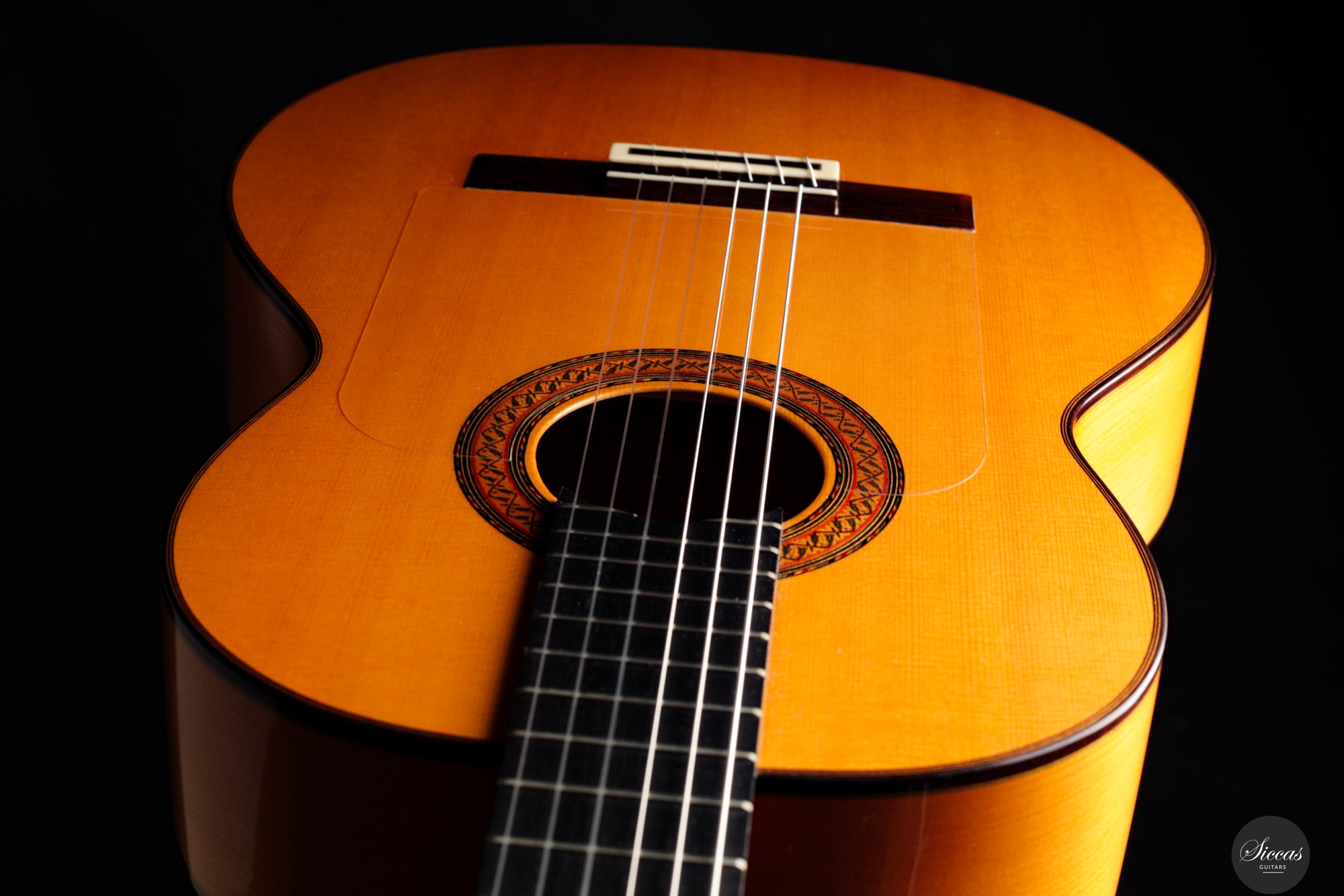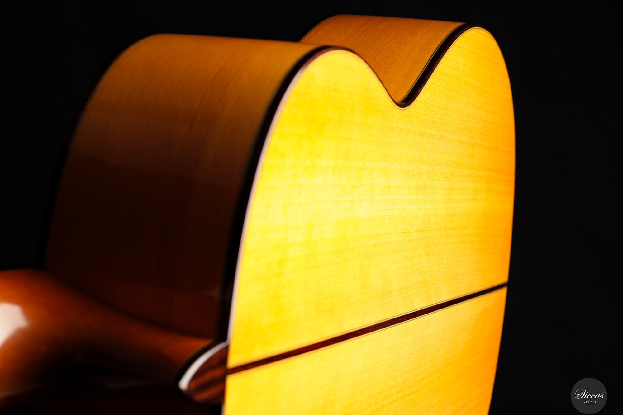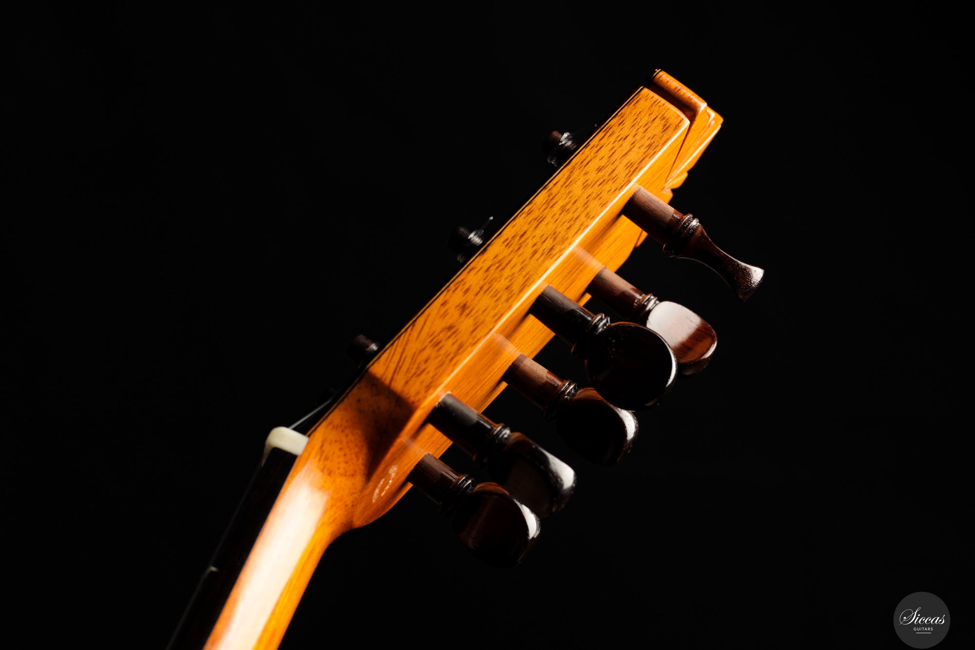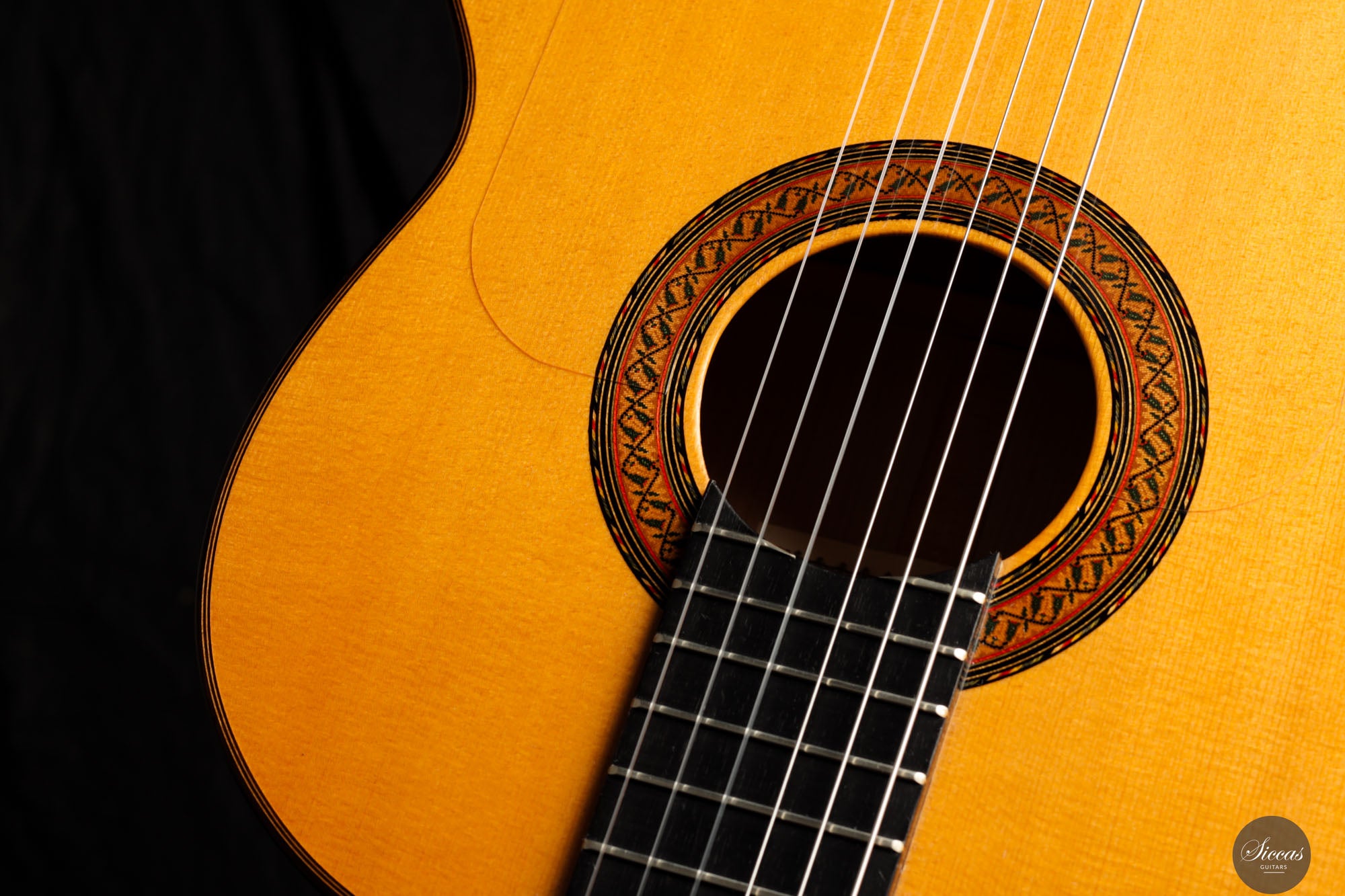 Flamenca Blanca von Gerundino Fernández Hijo aus dem Jahr 2021 mit Fichtendecke und Zypresse. Schnelle Ansprache, klare Höhen, trockenes Timbre und gesangliches Sustain. Traditionelle Wirbelmechaniken, Schellackpolitur.