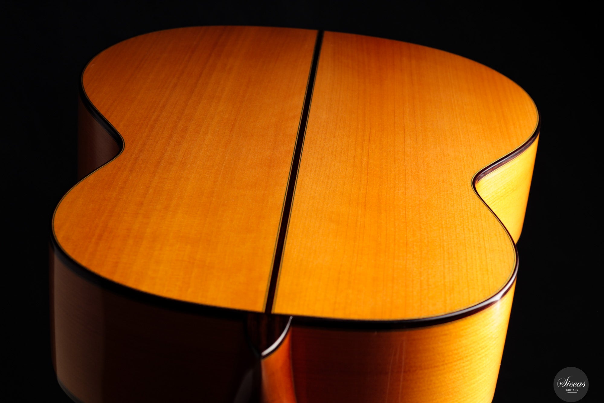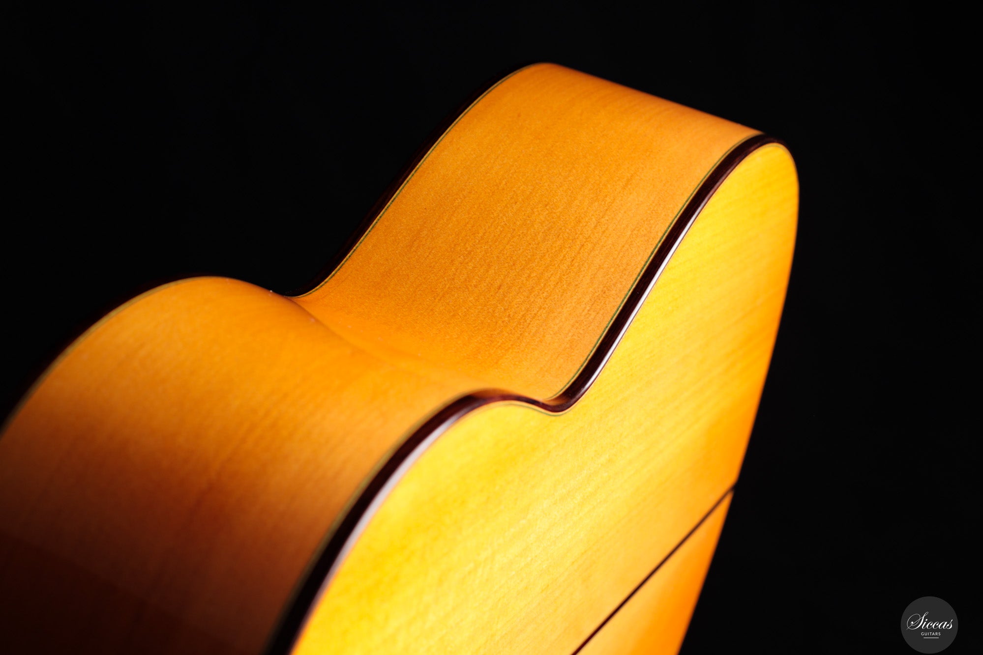 Diese 2021 gefertigte Flamenca Blanca von Gerundino Fernández Hijo besitzt eine Fichtendecke sowie Zargen und Boden aus Zypresse. Sie ist traditionell mit Wirbelmechaniken gebaut und vollständig mit Schellack poliert. Der Klang ist unverkennbar flamencohaft: hell, klar und wendig, mit schnellem Ansatz und trockener, perkussiver Ansprache. Auffällig ist das ungewöhnlich lange, gesangliche Sustain für eine Flamencogitarre, das ausdrucksstarke Phrasierung ermöglicht. Die Eigenresonanz liegt leicht erhöht bei etwa Gis/A und unterstützt die Reaktionsfreudigkeit und klangliche Offenheit des Instruments. Die Gitarre verbindet unmittelbare Projektion mit Eleganz und eignet sich sowohl für Solospiel als auch für traditionelle Begleitung.