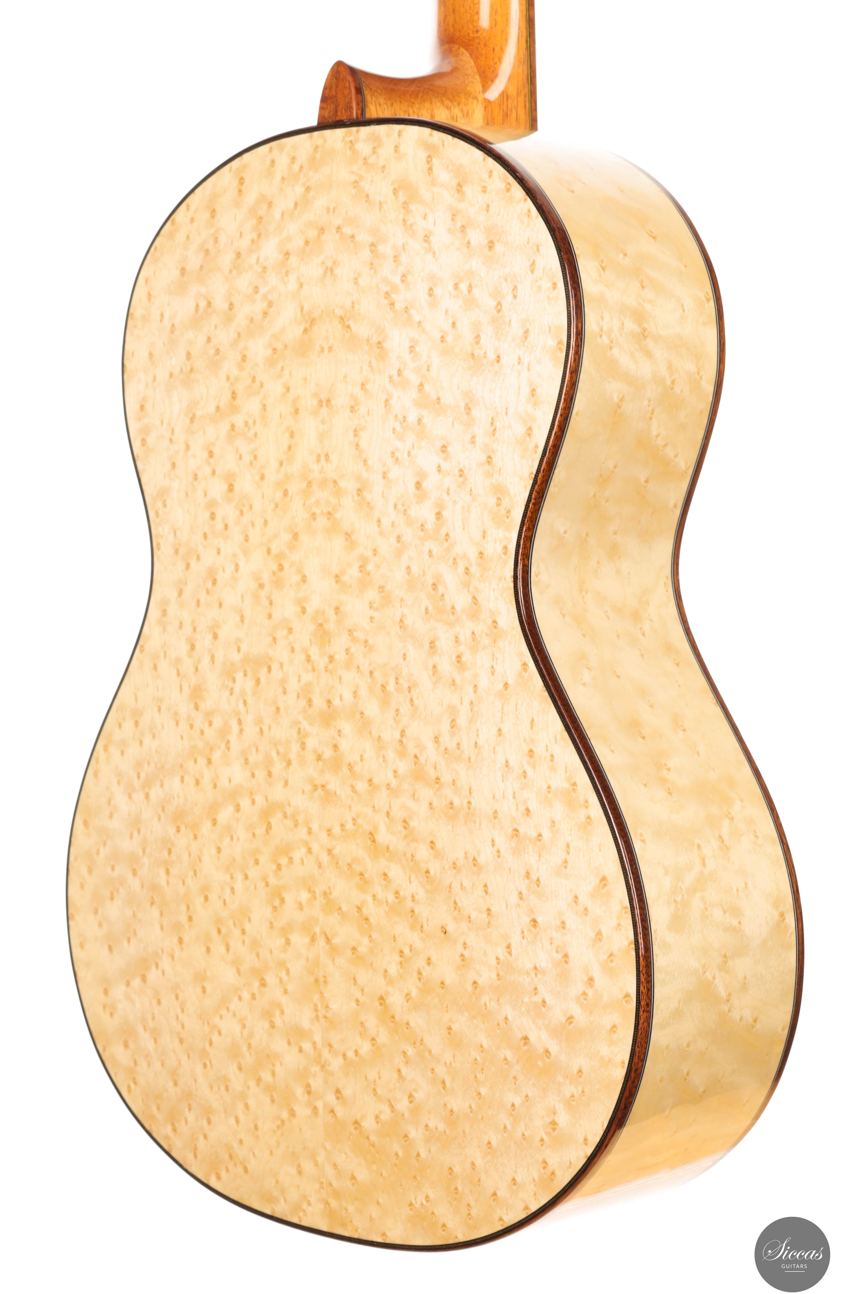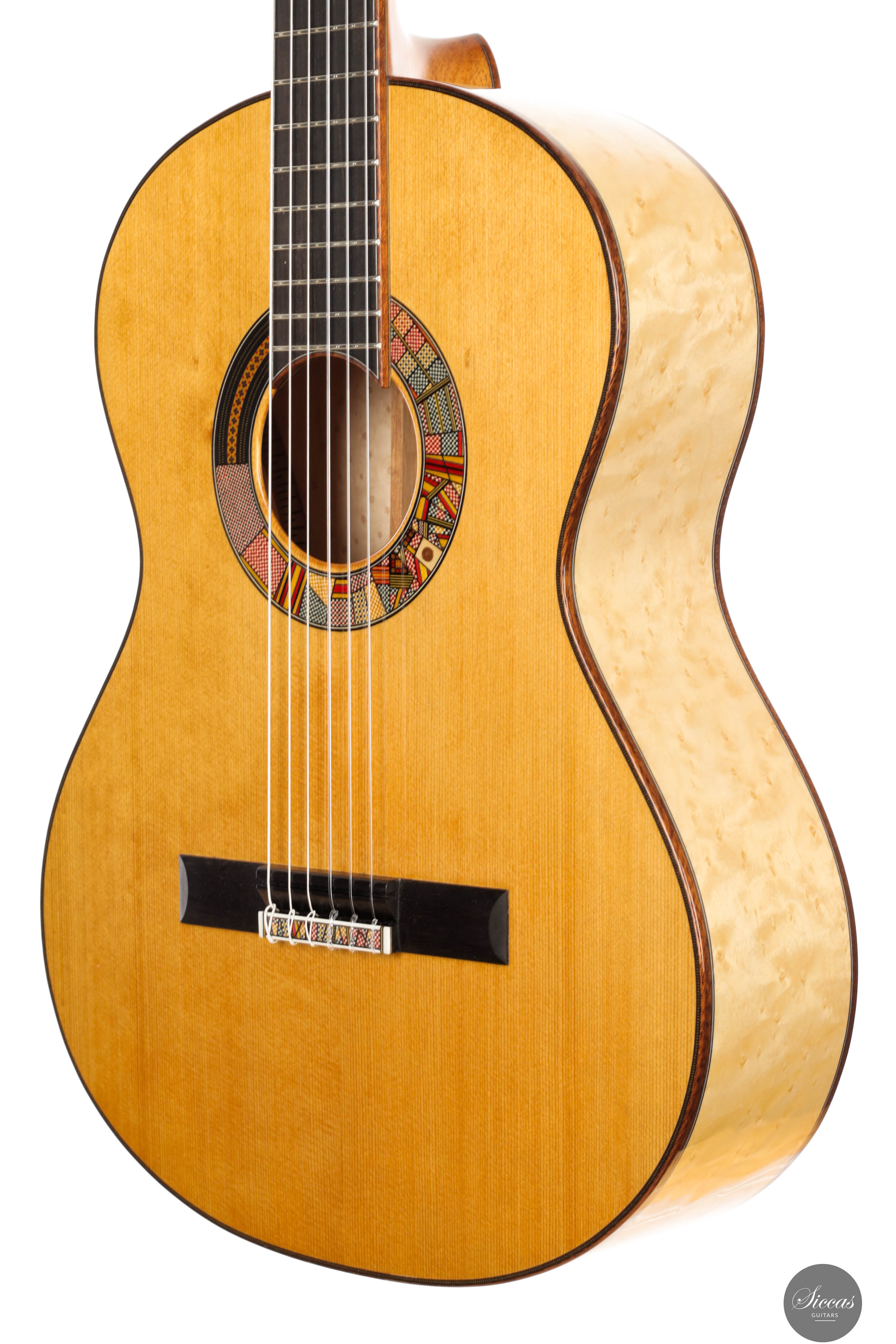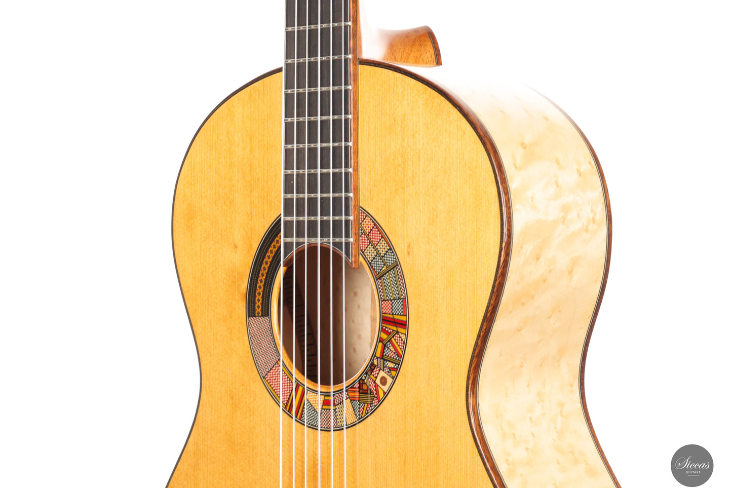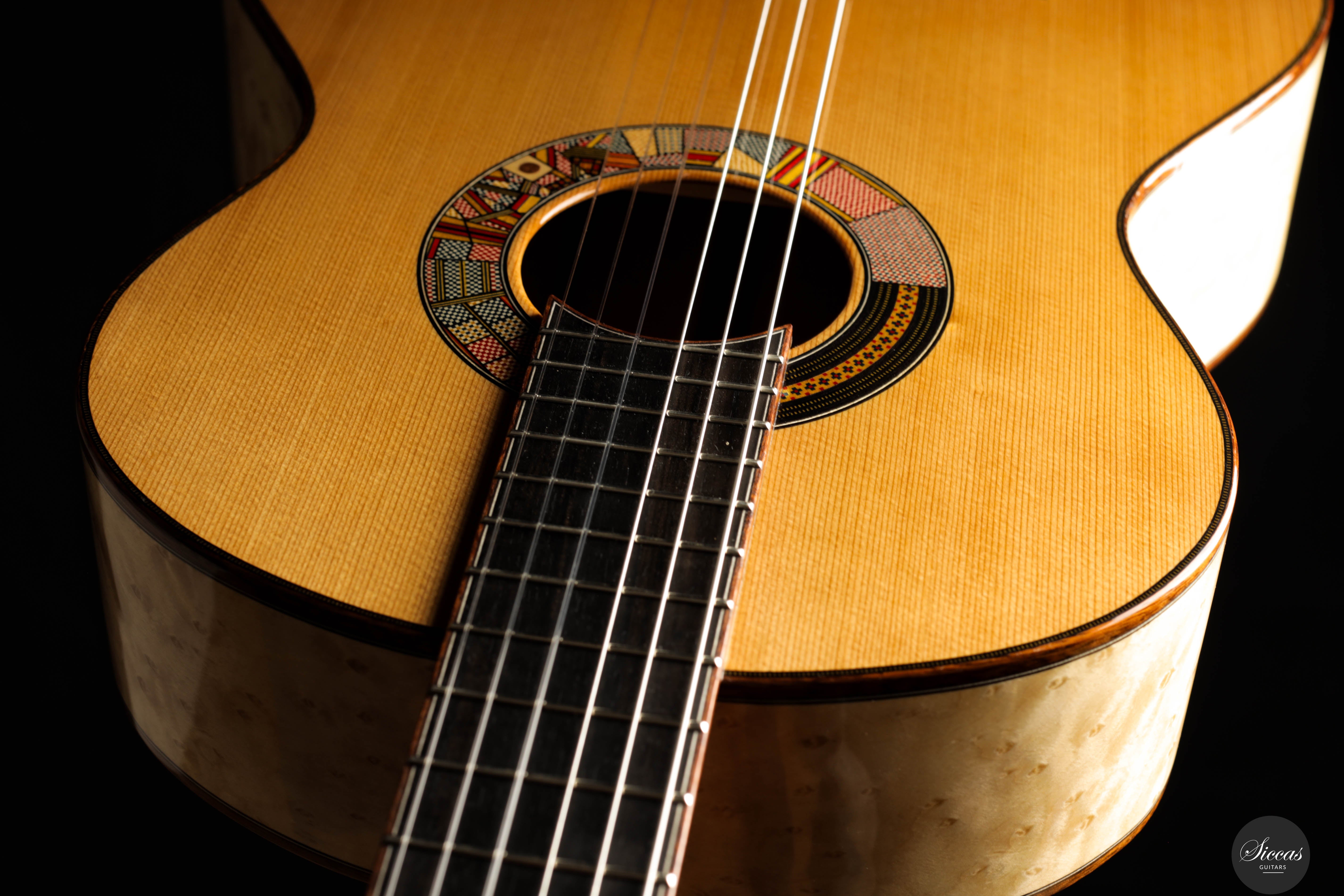 The “Venere Concerto” is a concert model entirely designed by Giacomo Guadagna. It features a traditional seven-fan bracing system and was developed to achieve a perfect tonal balance, where neither basses nor trebles dominate. This REG 2025 Limited Edition is equipped with a torrefied Italian spruce top and birdseye maple back and sides, creating a clear and resonant tone with excellent projection. Visually, the guitar stands out for its richly detailed aesthetic. The elaborate rosette is inspired by traditional Sicilian majolica (tin-glazed pottery) and features a mosaic-like composition, which is echoed in the tie block and fine purfling along the body and fretboard. The fretboard itself features a delicate purfling and binding, adding to the overall elegance of the instrument. The birdseye maple used for the back and sides serves as a final visual flourish — a vibrant, natural pattern that gives the instrument both character and individuality. With remarkable projection, tonal clarity, and a distinctly Mediterranean visual identity, this REG 2025 Limited Edition is a superb example of Giacomo Guadagna’s artistry.Regelmäßige Pflege verlängert die Lebensdauer des Instruments