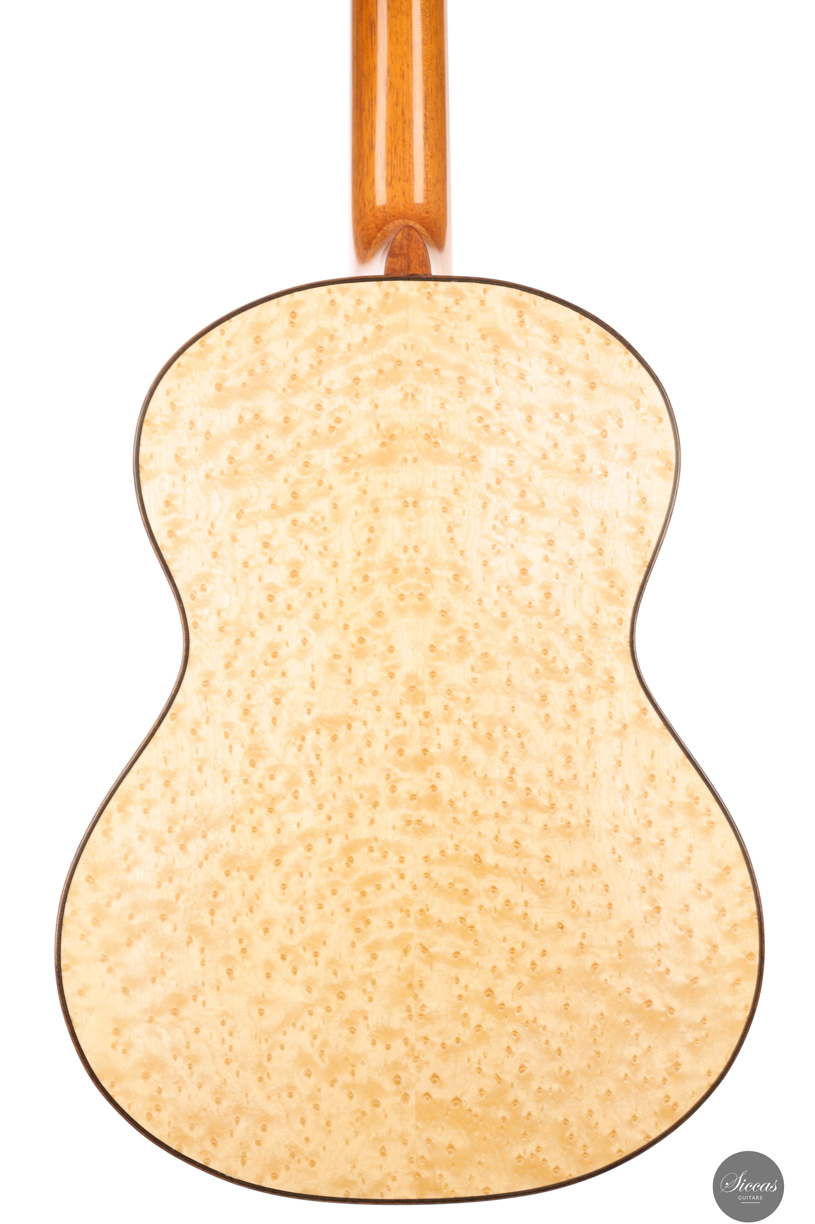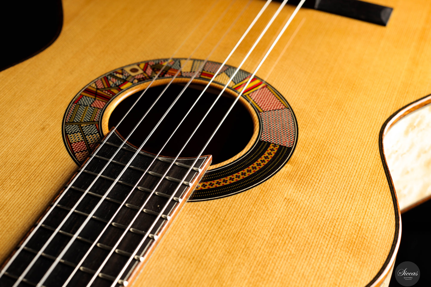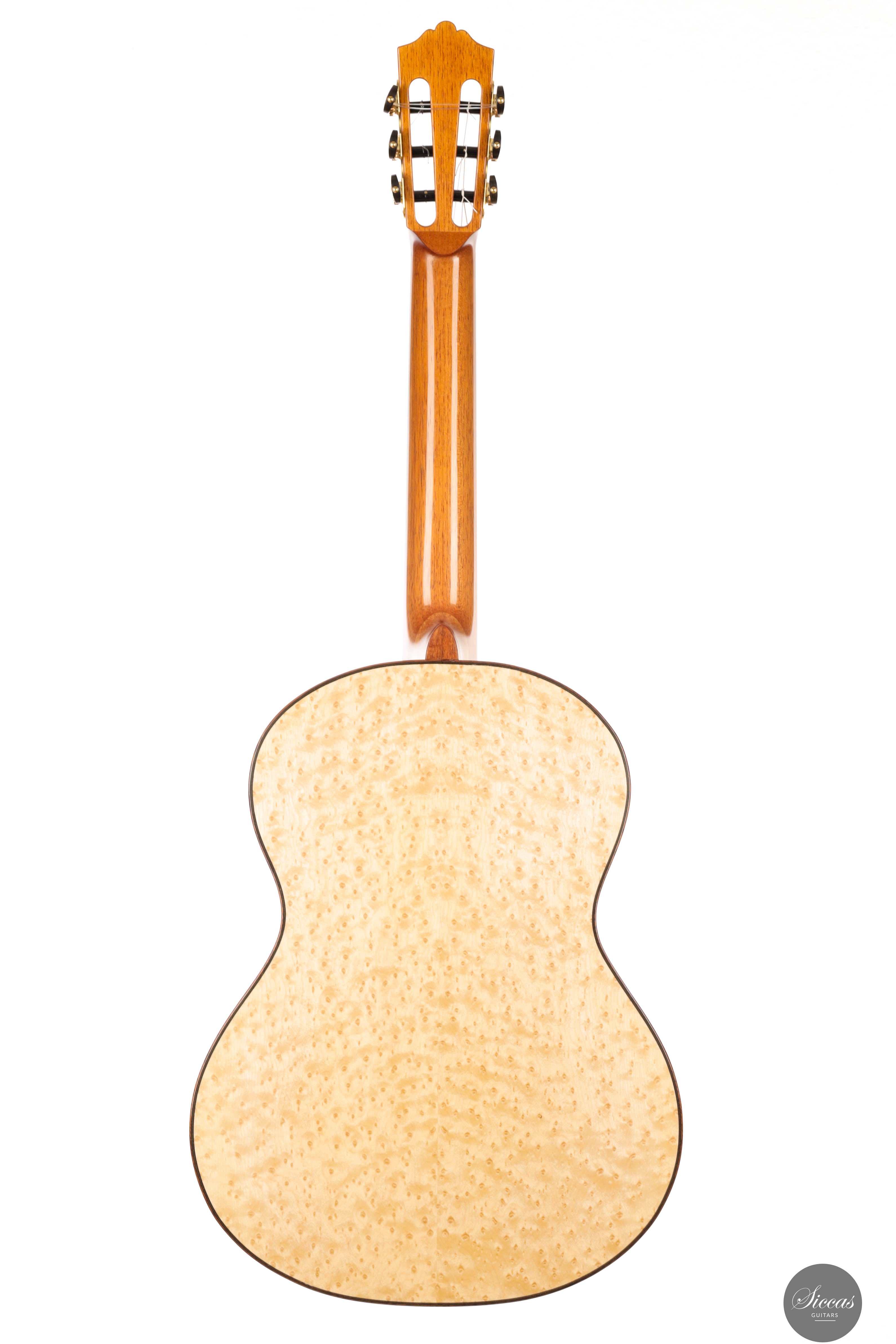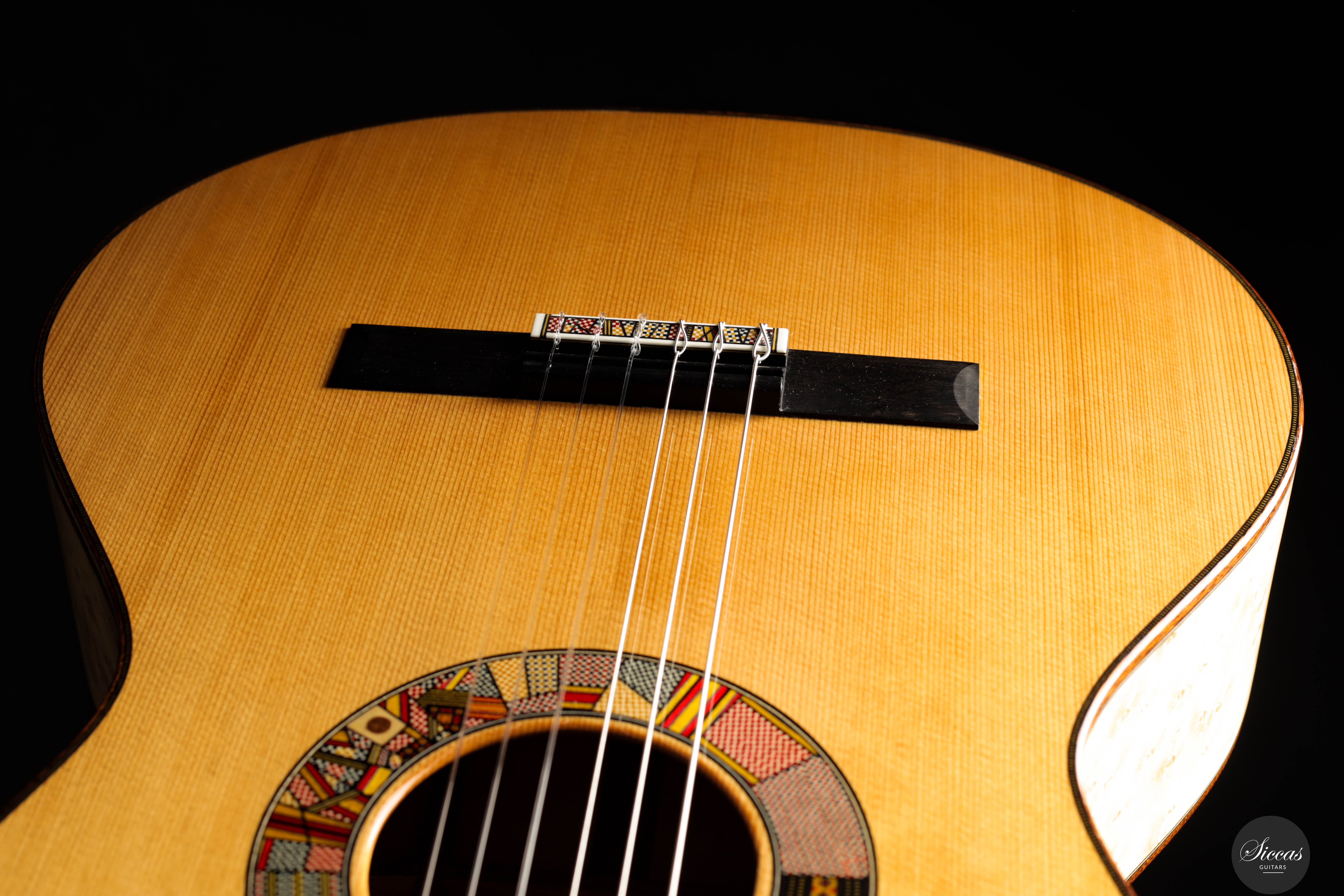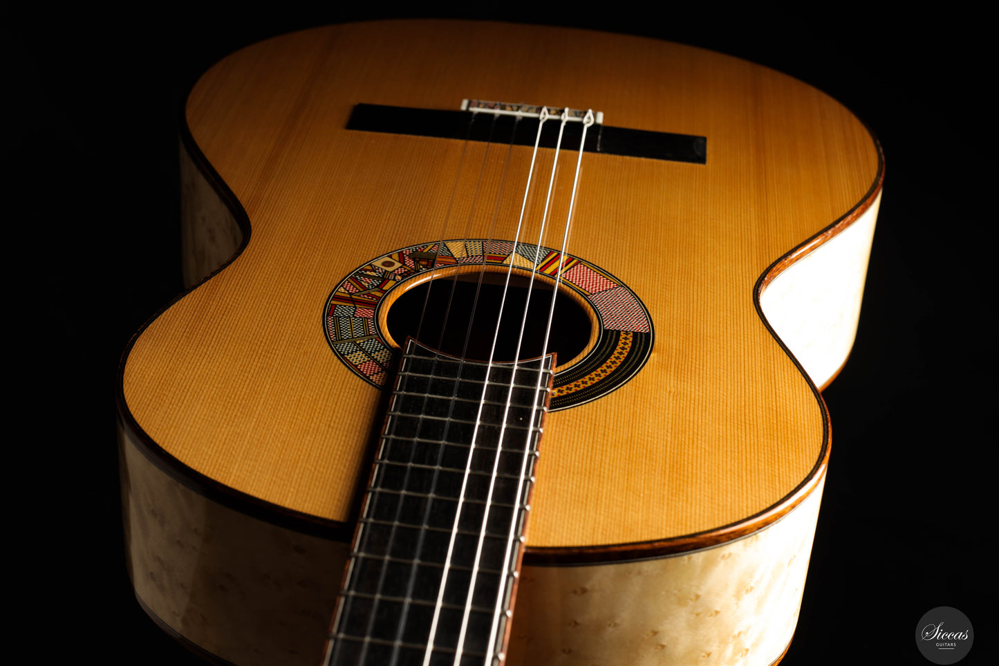 The “Venere Concerto” is a concert model entirely designed by Giacomo Guadagna. It features a traditional seven-fan bracing system and was developed to achieve a perfect tonal balance, where neither basses nor trebles dominate. This REG 2025 Limited Edition is equipped with a torrefied Italian spruce top and birdseye maple back and sides, creating a clear and resonant tone with excellent projection. Visually, the guitar stands out for its richly detailed aesthetic. The elaborate rosette is inspired by traditional Sicilian majolica (tin-glazed pottery) and features a mosaic-like composition, which is echoed in the tie block and fine purfling along the body and fretboard. The fretboard itself features a delicate purfling and binding, adding to the overall elegance of the instrument. The birdseye maple used for the back and sides serves as a final visual flourish — a vibrant, natural pattern that gives the instrument both character and individuality. With remarkable projection, tonal clarity, and a distinctly Mediterranean visual identity, this REG 2025 Limited Edition is a superb example of Giacomo Guadagna’s artistry.Regelmäßige Pflege verlängert die Lebensdauer des Instruments