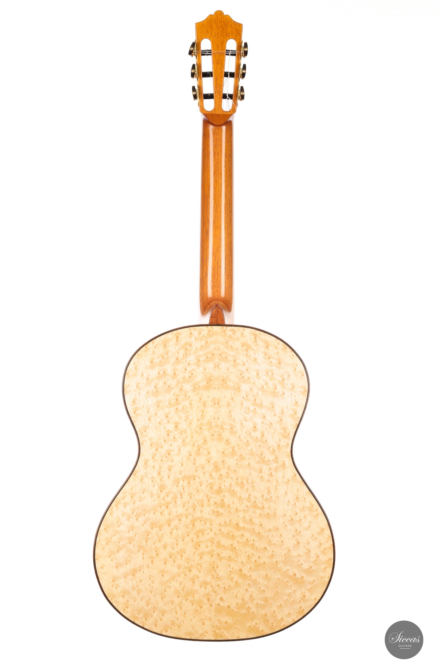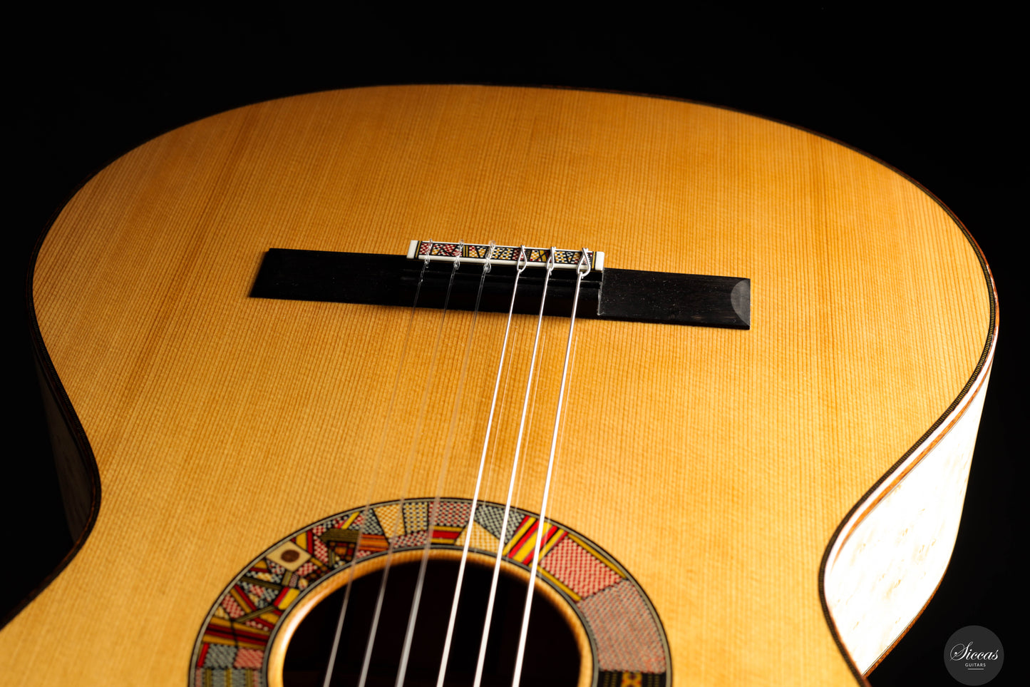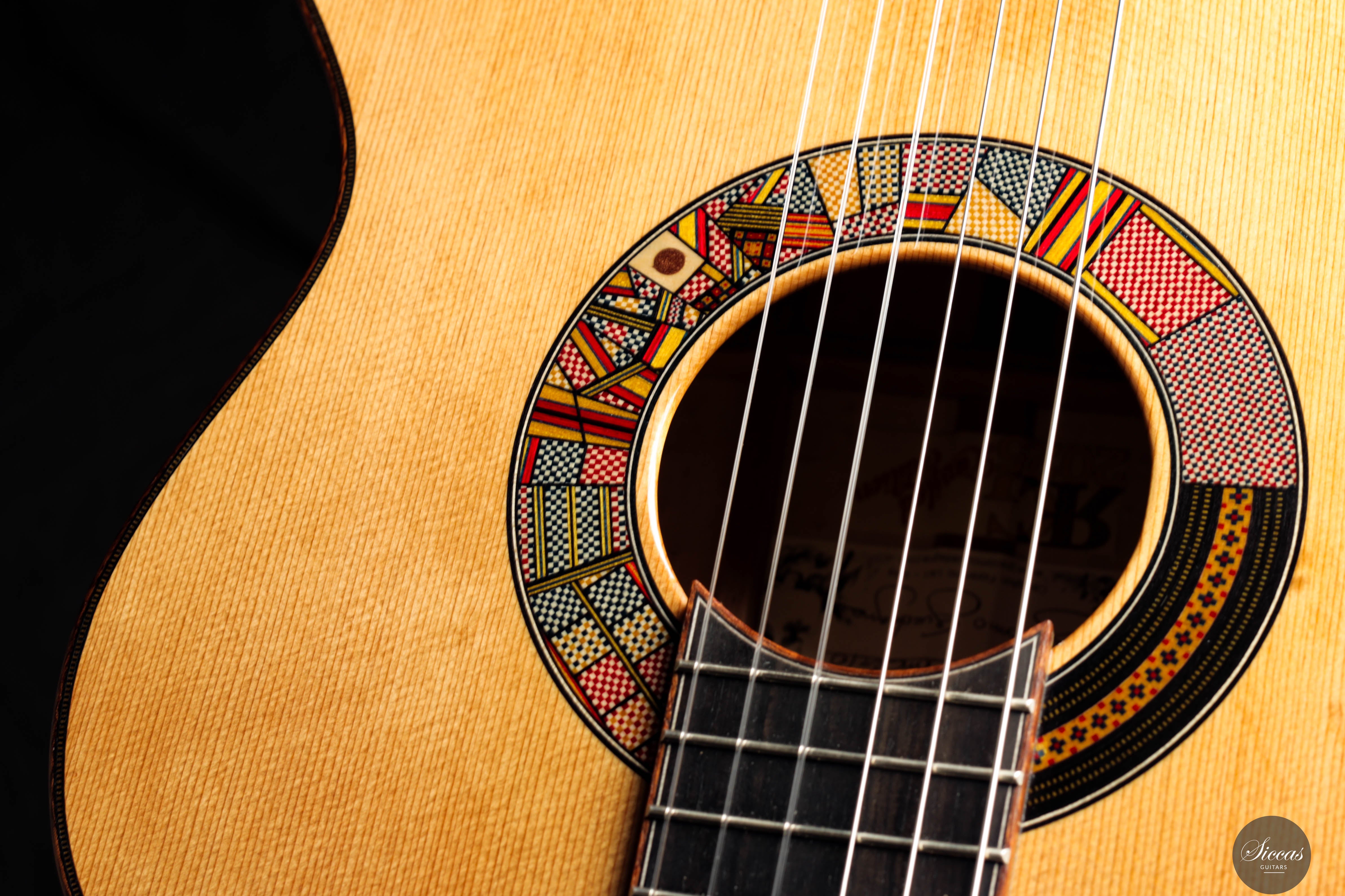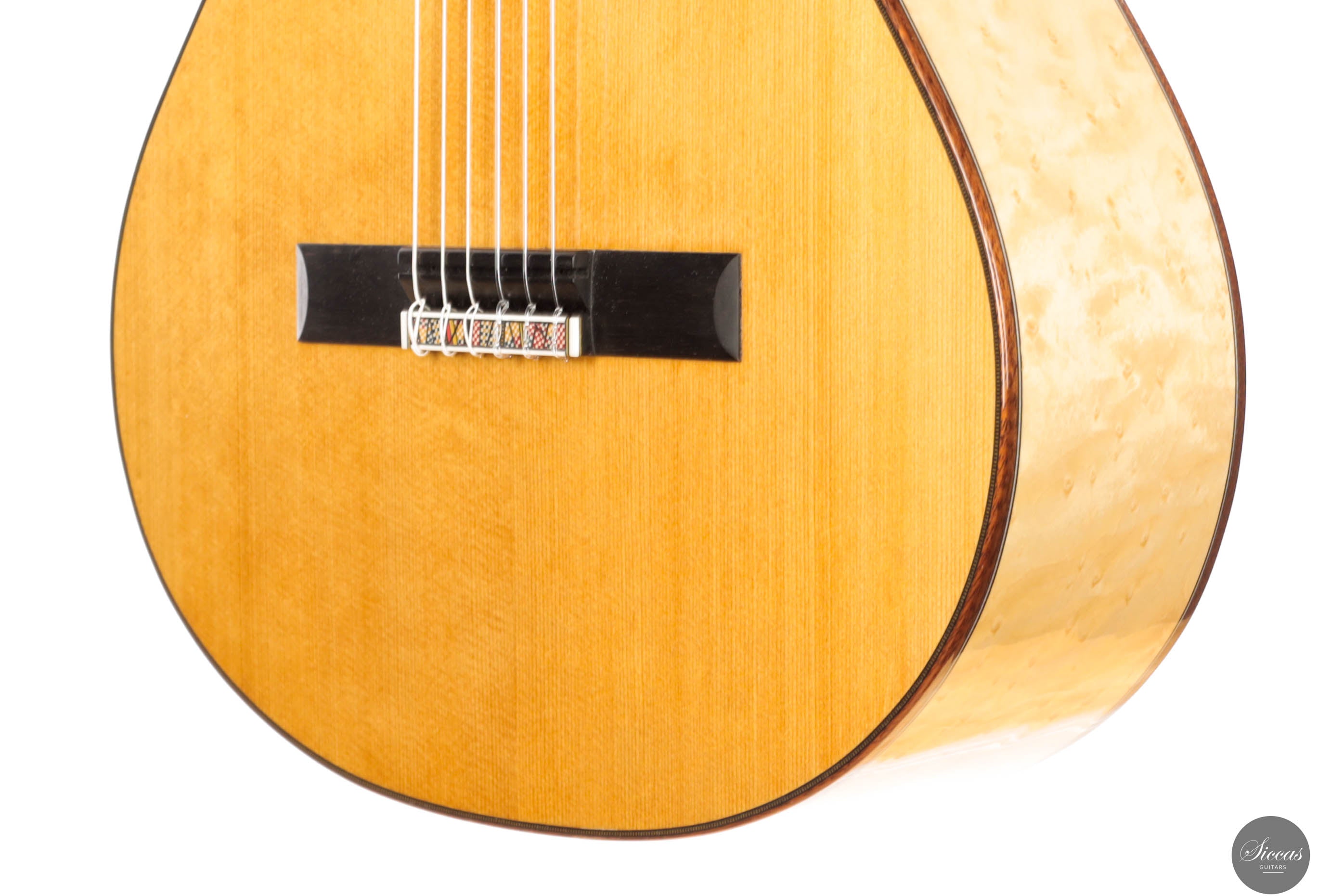 The “Venere Concerto” is a concert model entirely designed by Giacomo Guadagna. It features a traditional seven-fan bracing system and was developed to achieve a perfect tonal balance, where neither basses nor trebles dominate. This REG 2025 Limited Edition is equipped with a torrefied Italian spruce top and birdseye maple back and sides, creating a clear and resonant tone with excellent projection. Visually, the guitar stands out for its richly detailed aesthetic. The elaborate rosette is inspired by traditional Sicilian majolica (tin-glazed pottery) and features a mosaic-like composition, which is echoed in the tie block and fine purfling along the body and fretboard. The fretboard itself features a delicate purfling and binding, adding to the overall elegance of the instrument. The birdseye maple used for the back and sides serves as a final visual flourish — a vibrant, natural pattern that gives the instrument both character and individuality. With remarkable projection, tonal clarity, and a distinctly Mediterranean visual identity, this REG 2025 Limited Edition is a superb example of Giacomo Guadagna’s artistry.Regelmäßige Pflege verlängert die Lebensdauer des Instruments
