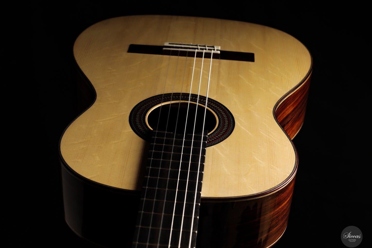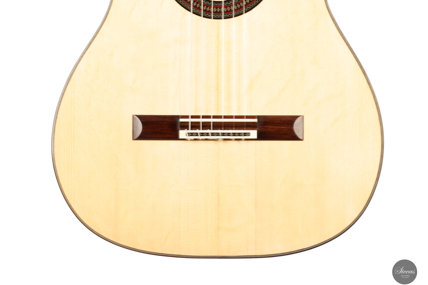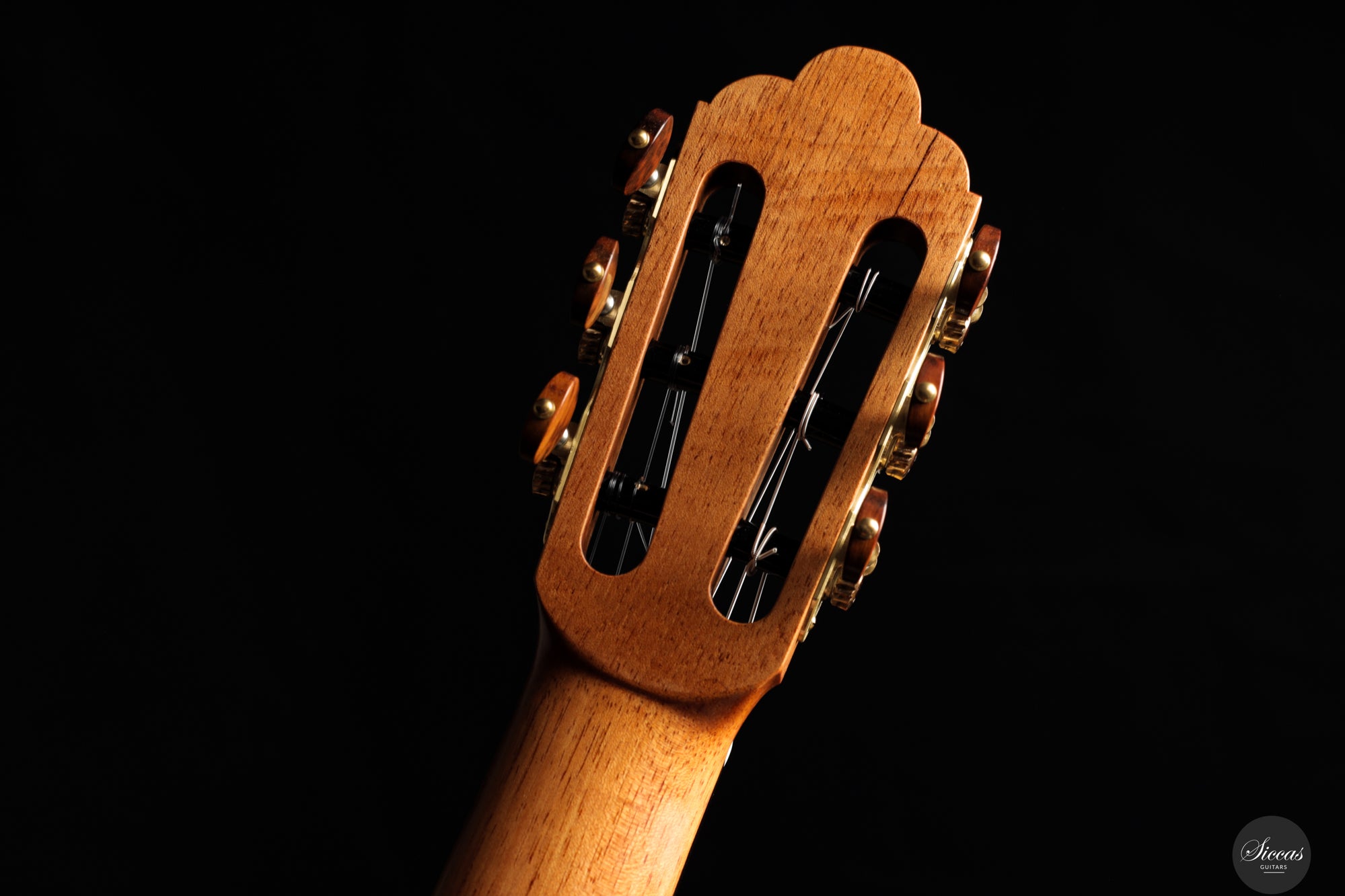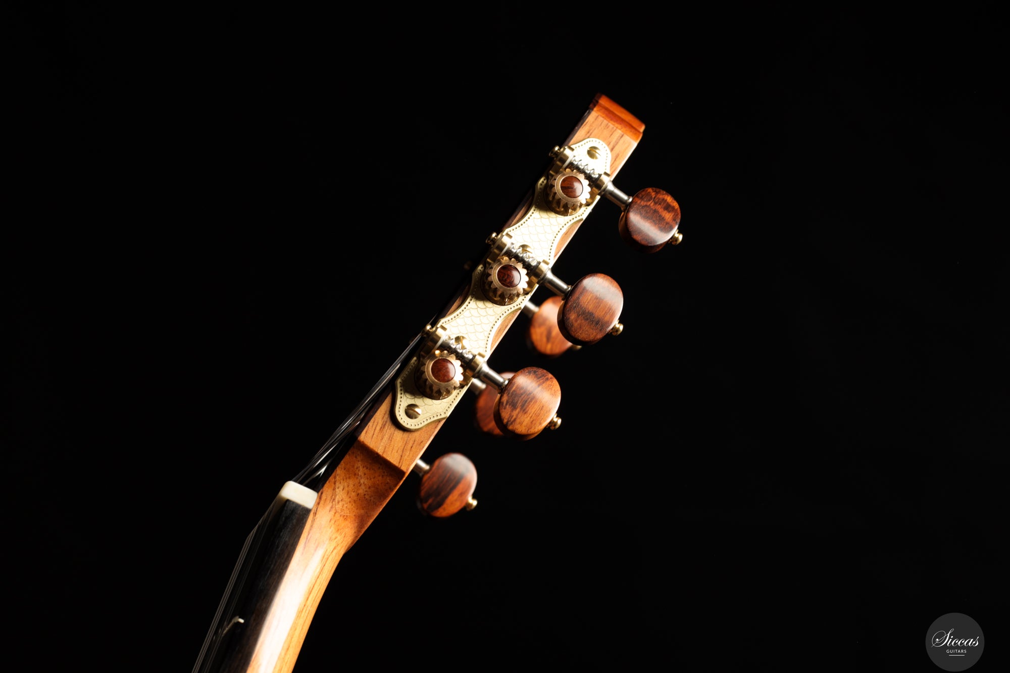 Dieses 2025 entstandene Instrument trägt den Namen „Alcione“ und gehört zu Nannonis zeitgenössischer Modellreihe. Der Name verweist auf die griechische Mythologie, genauer auf die Geschichte der Plejaden, sieben Schwestern, die in Sterne verwandelt wurden, um Seeleuten den Weg zu weisen. Diese poetische Anspielung verbindet Musik, Licht und Orientierung zu einem Sinnbild für Nannonis künstlerisches Schaffen. Die Gitarre ist vollständig aus Holz gefertigt und folgt einem von Nannoni seit Jahren entwickelten und verfeinerten Lattice-Konzept. Das Bracing besteht aus fünf traditionellen Leisten, ergänzt durch vier sehr dünne, um 180 Grad gedrehte Leisten, die unterhalb verlaufen. Diese Konstruktion verleiht dem Instrument eine große klangliche Effizienz, Resonanz und Stabilität. Die Fichtendecke wird durch Boden und Zargen aus Cocobolo ergänzt, was dem Klangbild Helligkeit und Tiefe verleiht. Mit einer Eigenresonanz zwischen Fis und G und einem Gewicht von nur 1360 Gramm reagiert die Gitarre äußerst direkt und dennoch mit einem warmen, gesanglichen Charakter. Die Schellackpolitur hebt die natürliche Schönheit der Tonhölzer hervor, während Hals und Griffbrett Stabilität und Spielkomfort gewährleisten. Ein besonderes Detail sind die Alessi-Mechaniken mit feiner „Fischschuppen“-Gravur, die dem Instrument eine künstlerische Note verleihen. Mit ihrer sorgfältig entwickelten Konstruktion, dem einzigartigen Bracing-Konzept und ihrer zeitgenössischen Eleganz vereint die Nannoni Alcione moderne Spielbarkeit mit traditioneller Klangschönheit.