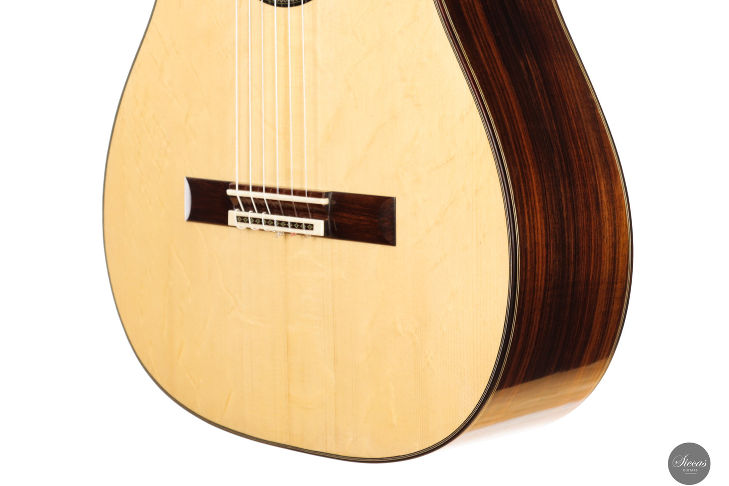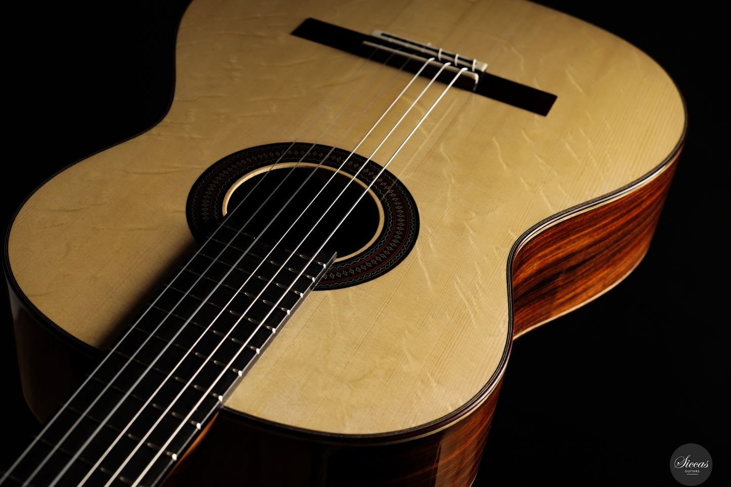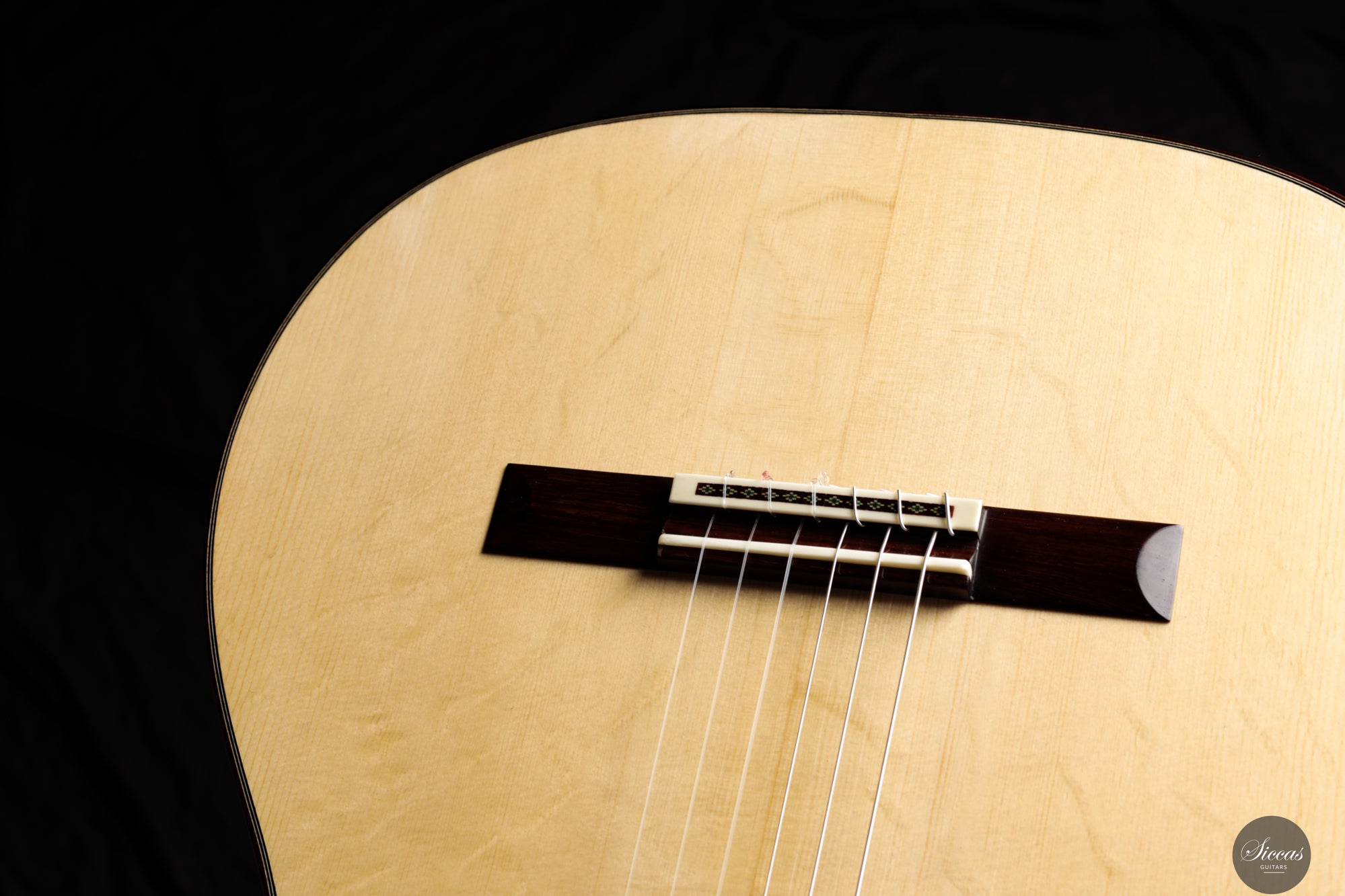 Dieses 2025 entstandene Instrument trägt den Namen „Alcione“ und gehört zu Nannonis zeitgenössischer Modellreihe. Der Name verweist auf die griechische Mythologie, genauer auf die Geschichte der Plejaden, sieben Schwestern, die in Sterne verwandelt wurden, um Seeleuten den Weg zu weisen. Diese poetische Anspielung verbindet Musik, Licht und Orientierung zu einem Sinnbild für Nannonis künstlerisches Schaffen. Die Gitarre ist vollständig aus Holz gefertigt und folgt einem von Nannoni seit Jahren entwickelten und verfeinerten Lattice-Konzept. Das Bracing besteht aus fünf traditionellen Leisten, ergänzt durch vier sehr dünne, um 180 Grad gedrehte Leisten, die unterhalb verlaufen. Diese Konstruktion verleiht dem Instrument eine große klangliche Effizienz, Resonanz und Stabilität. Die Fichtendecke wird durch Boden und Zargen aus Cocobolo ergänzt, was dem Klangbild Helligkeit und Tiefe verleiht. Mit einer Eigenresonanz zwischen Fis und G und einem Gewicht von nur 1360 Gramm reagiert die Gitarre äußerst direkt und dennoch mit einem warmen, gesanglichen Charakter. Die Schellackpolitur hebt die natürliche Schönheit der Tonhölzer hervor, während Hals und Griffbrett Stabilität und Spielkomfort gewährleisten. Ein besonderes Detail sind die Alessi-Mechaniken mit feiner „Fischschuppen“-Gravur, die dem Instrument eine künstlerische Note verleihen. Mit ihrer sorgfältig entwickelten Konstruktion, dem einzigartigen Bracing-Konzept und ihrer zeitgenössischen Eleganz vereint die Nannoni Alcione moderne Spielbarkeit mit traditioneller Klangschönheit.