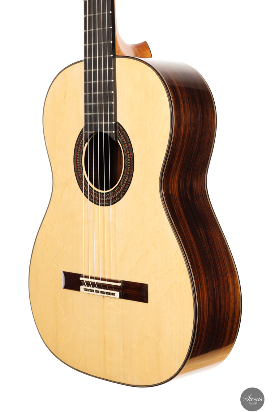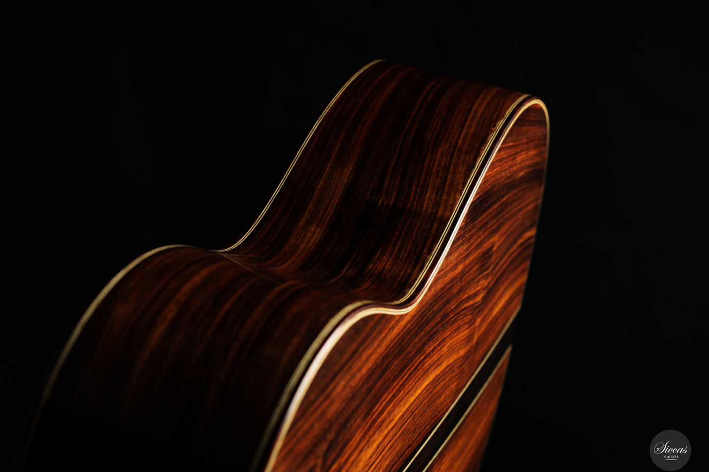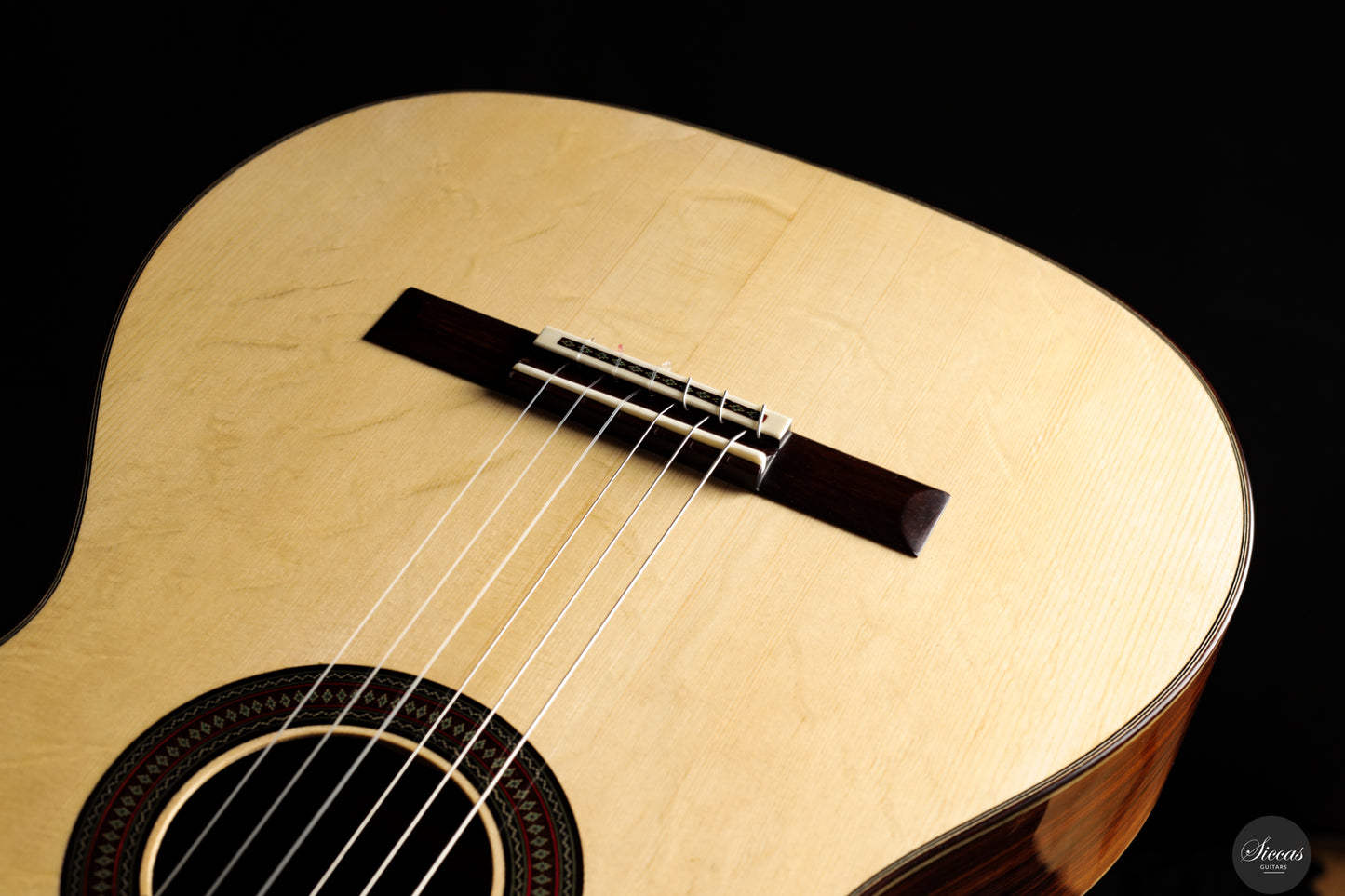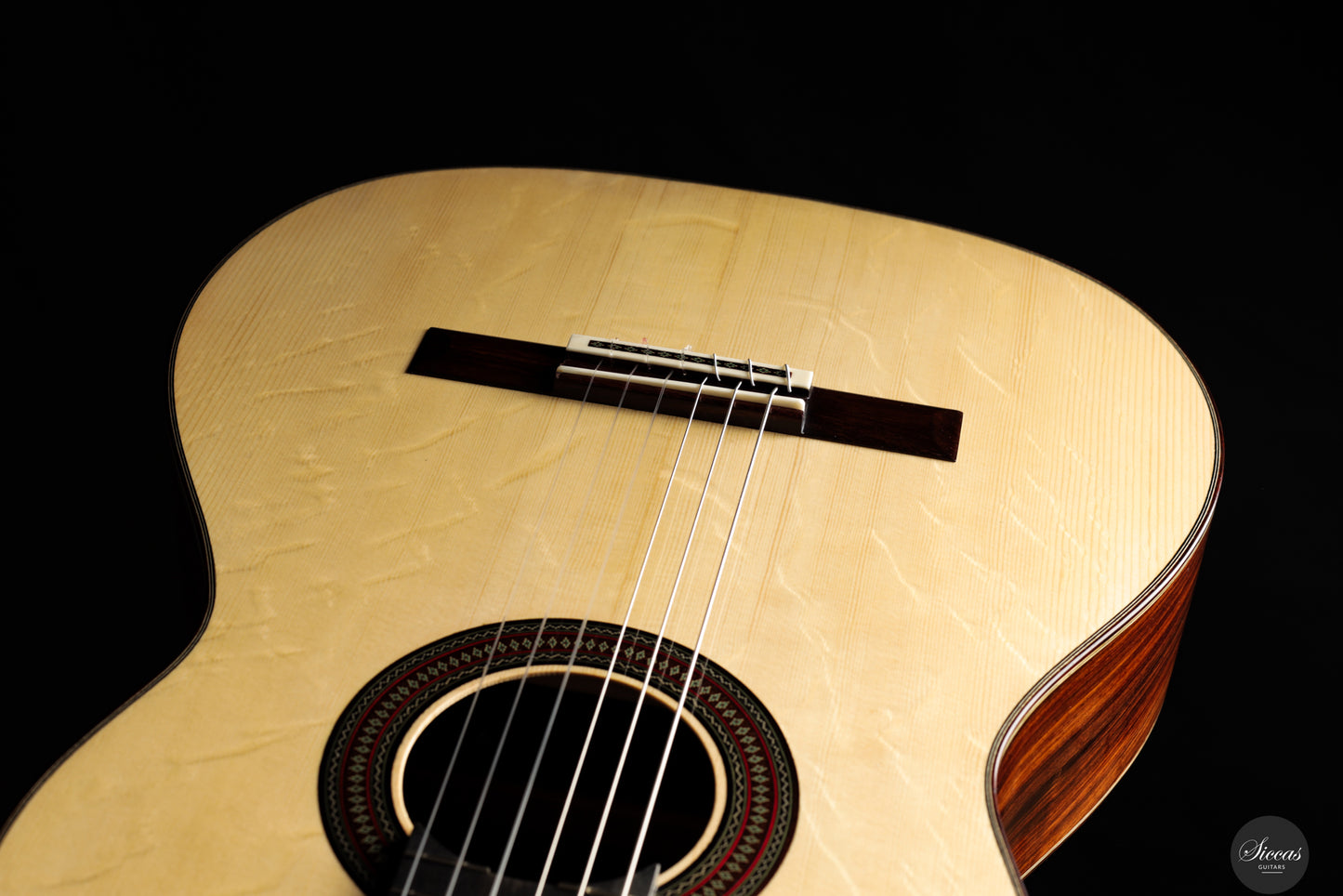 Dieses 2025 entstandene Instrument trägt den Namen „Alcione“ und gehört zu Nannonis zeitgenössischer Modellreihe. Der Name verweist auf die griechische Mythologie, genauer auf die Geschichte der Plejaden, sieben Schwestern, die in Sterne verwandelt wurden, um Seeleuten den Weg zu weisen. Diese poetische Anspielung verbindet Musik, Licht und Orientierung zu einem Sinnbild für Nannonis künstlerisches Schaffen. Die Gitarre ist vollständig aus Holz gefertigt und folgt einem von Nannoni seit Jahren entwickelten und verfeinerten Lattice-Konzept. Das Bracing besteht aus fünf traditionellen Leisten, ergänzt durch vier sehr dünne, um 180 Grad gedrehte Leisten, die unterhalb verlaufen. Diese Konstruktion verleiht dem Instrument eine große klangliche Effizienz, Resonanz und Stabilität. Die Fichtendecke wird durch Boden und Zargen aus Cocobolo ergänzt, was dem Klangbild Helligkeit und Tiefe verleiht. Mit einer Eigenresonanz zwischen Fis und G und einem Gewicht von nur 1360 Gramm reagiert die Gitarre äußerst direkt und dennoch mit einem warmen, gesanglichen Charakter. Die Schellackpolitur hebt die natürliche Schönheit der Tonhölzer hervor, während Hals und Griffbrett Stabilität und Spielkomfort gewährleisten. Ein besonderes Detail sind die Alessi-Mechaniken mit feiner „Fischschuppen“-Gravur, die dem Instrument eine künstlerische Note verleihen. Mit ihrer sorgfältig entwickelten Konstruktion, dem einzigartigen Bracing-Konzept und ihrer zeitgenössischen Eleganz vereint die Nannoni Alcione moderne Spielbarkeit mit traditioneller Klangschönheit.