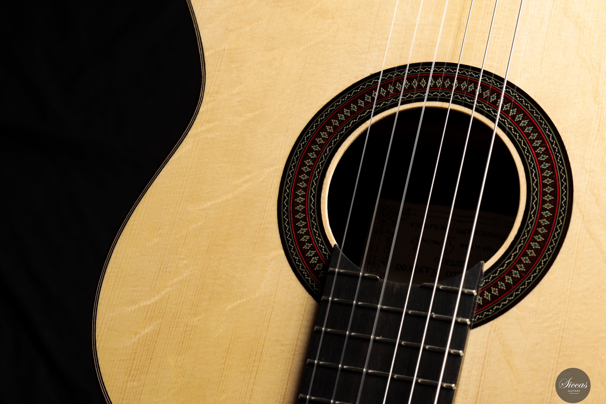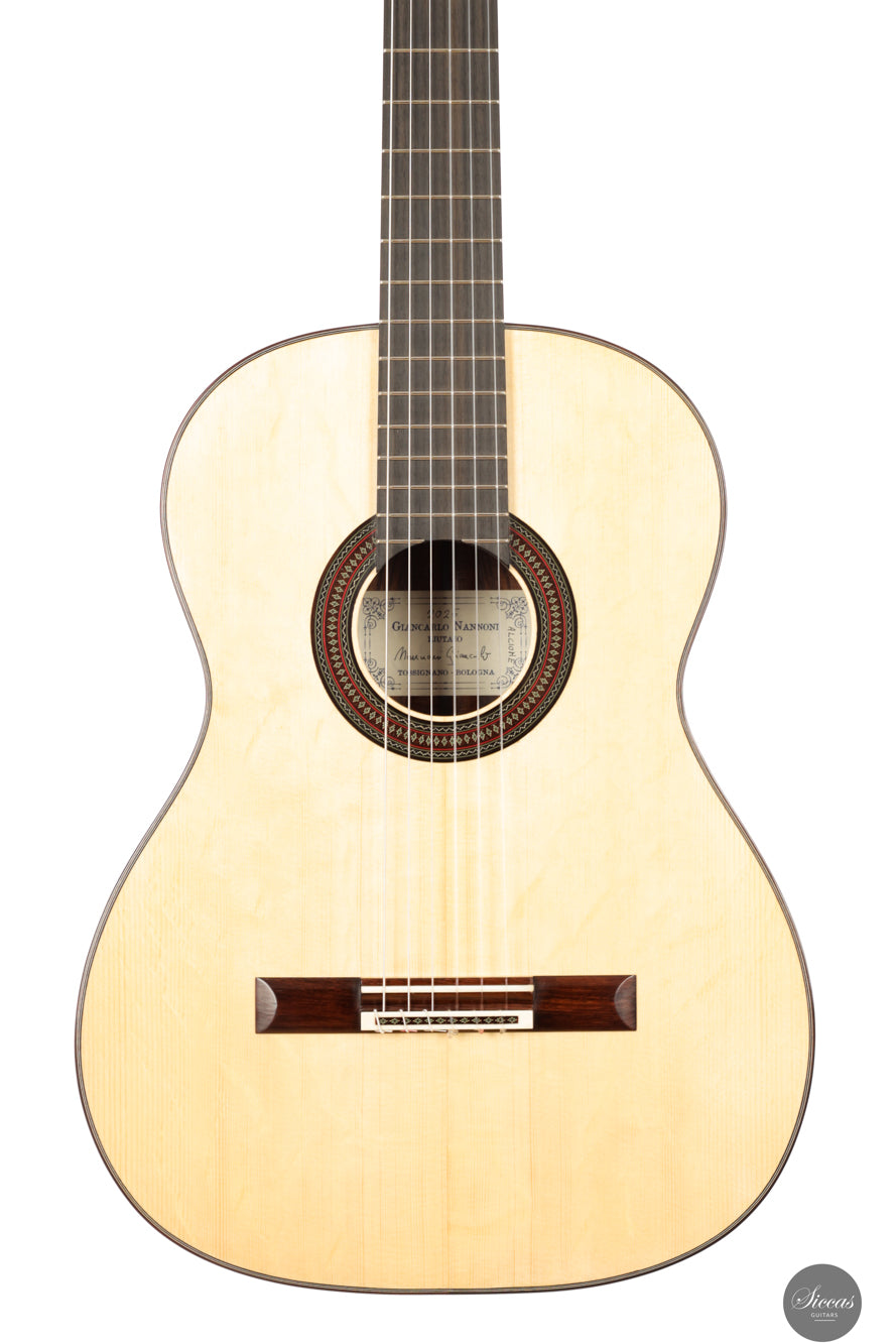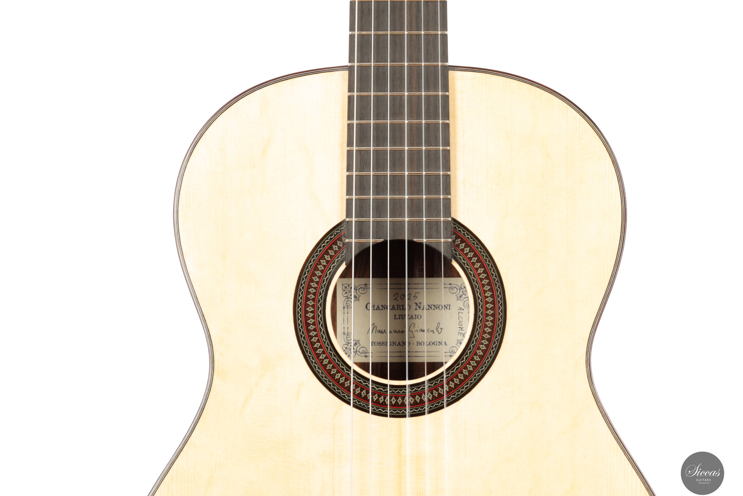 Seit 1994 widmet sich Giancarlo Nannoni mit unermüdlicher Leidenschaft dem Gitarrenbau und verbindet dabei die technischen Kenntnisse aus seinem Studium mit seiner Liebe zur Musik. Bereits in seiner Jugend spielte er Gitarre und andere Instrumente auf Amateurbasis und bewegte sich dabei durch verschiedene musikalische Genres. Während seines Violinstudiums lernte er den Geigenbauer Contavalli in Imola kennen und war fasziniert von den Materialien, den Werkzeugen und den Gerüchen, die die kleine Werkstatt erfüllten. Rückblickend bezeichnet Nannoni diese Begegnungen als den Moment, in dem in ihm der Wunsch erwachte, selbst Instrumente zu bauen. Später näherte er sich der Gitarrenbaukunst autodidaktisch, indem er sich intensiv mit Physik und Akustik im Bereich des klassischen Gitarrenbaus beschäftigte, Museen und Sammlungen besuchte und über Jahre hinweg die Instrumente der großen Meister vergangener Epochen studierte. Dieser forschende Zugang wurde zur Grundlage seiner eigenen Bauphilosophie. Schon in den ersten Jahren seiner Tätigkeit wurde Nannoni zu wichtigen Ausstellungen in zahlreichen italienischen Städten eingeladen, wo er zudem Vorträge über Gitarrenbau an öffentlichen und privaten Einrichtungen hielt. Sein Wissen erweiterte sich kontinuierlich durch den Austausch mit Musikern, deren Ratschläge und Inspirationen seinen Weg prägten. Heute werden seine Gitarren in Italien und im Ausland von Hochschuldozenten und jungen Konzertgitarristen gespielt, darunter Preisträger bedeutender internationaler Wettbewerbe.