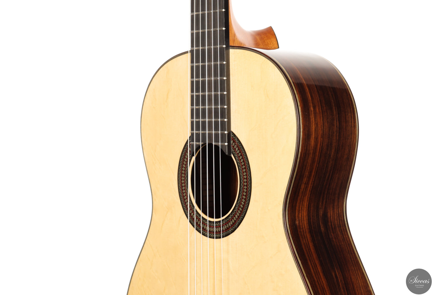 Die Giancarlo Nannoni „Alcione“ von 2025 ist ein zeitgenössisches Konzertmodell, das poetische Symbolik mit moderner Gitarrenbaukunst verbindet. Ihre Fichtendecke in Kombination mit Boden und Zargen aus Cocobolo sorgt für ein Klangbild von außergewöhnlicher Tiefe und Brillanz. Das von Nannoni entwickelte Lattice-Konzept mit fünf traditionellen und vier gedrehten, filigranen Leisten verleiht dem Instrument hohe Effizienz, Stabilität und Resonanz. Mit nur 1360 Gramm Gewicht und einer Eigenresonanz zwischen Fis und G spricht die Gitarre äußerst direkt an und kombiniert Klarheit mit einem warmen, gesanglichen Toncharakter. Die edle Schellackpolitur bringt die Schönheit der Hölzer zur Geltung, während Alessi-Mechaniken mit feiner Fischschuppen-Gravur das stilvolle Erscheinungsbild abrunden. Die „Alcione“ ist ein Instrument, das moderne Spielbarkeit und klangliche Vielschichtigkeit auf höchstem Niveau vereint.